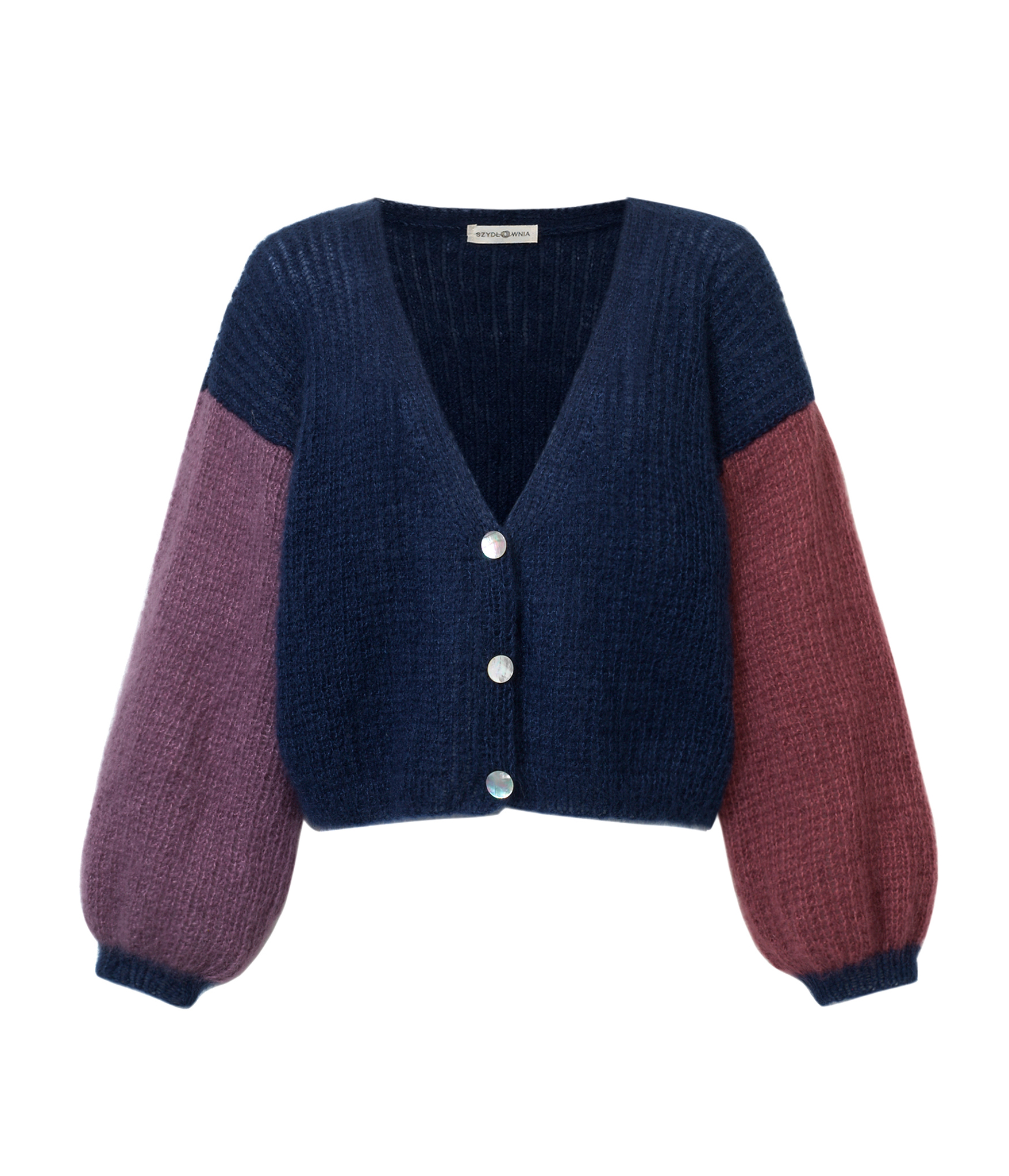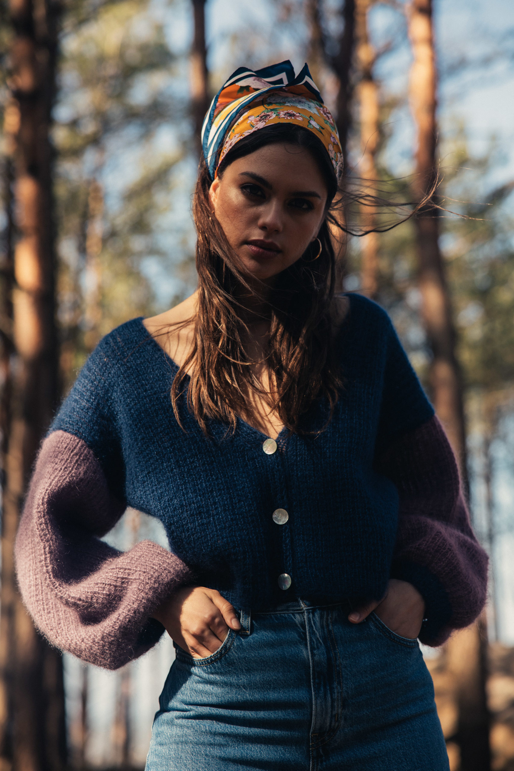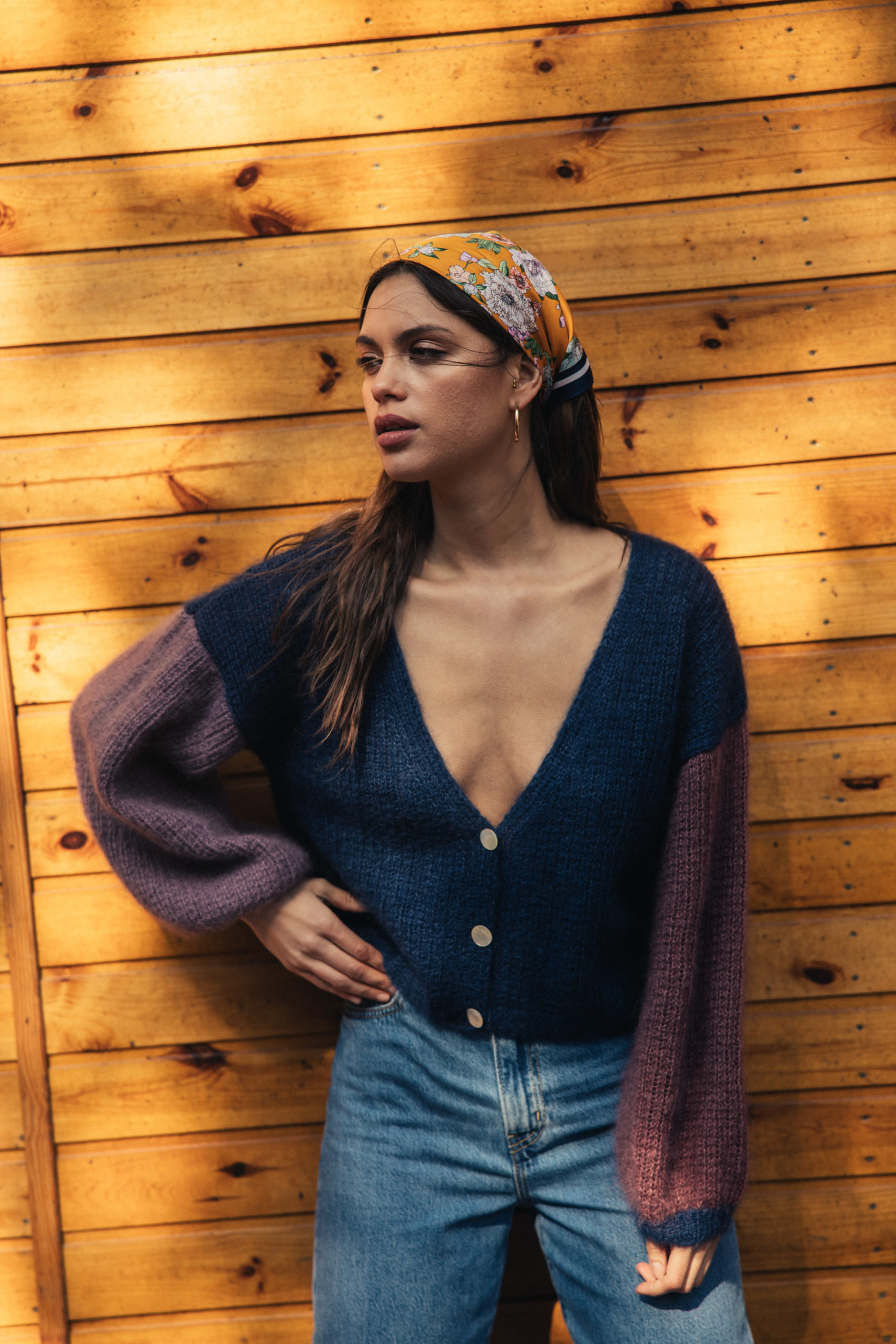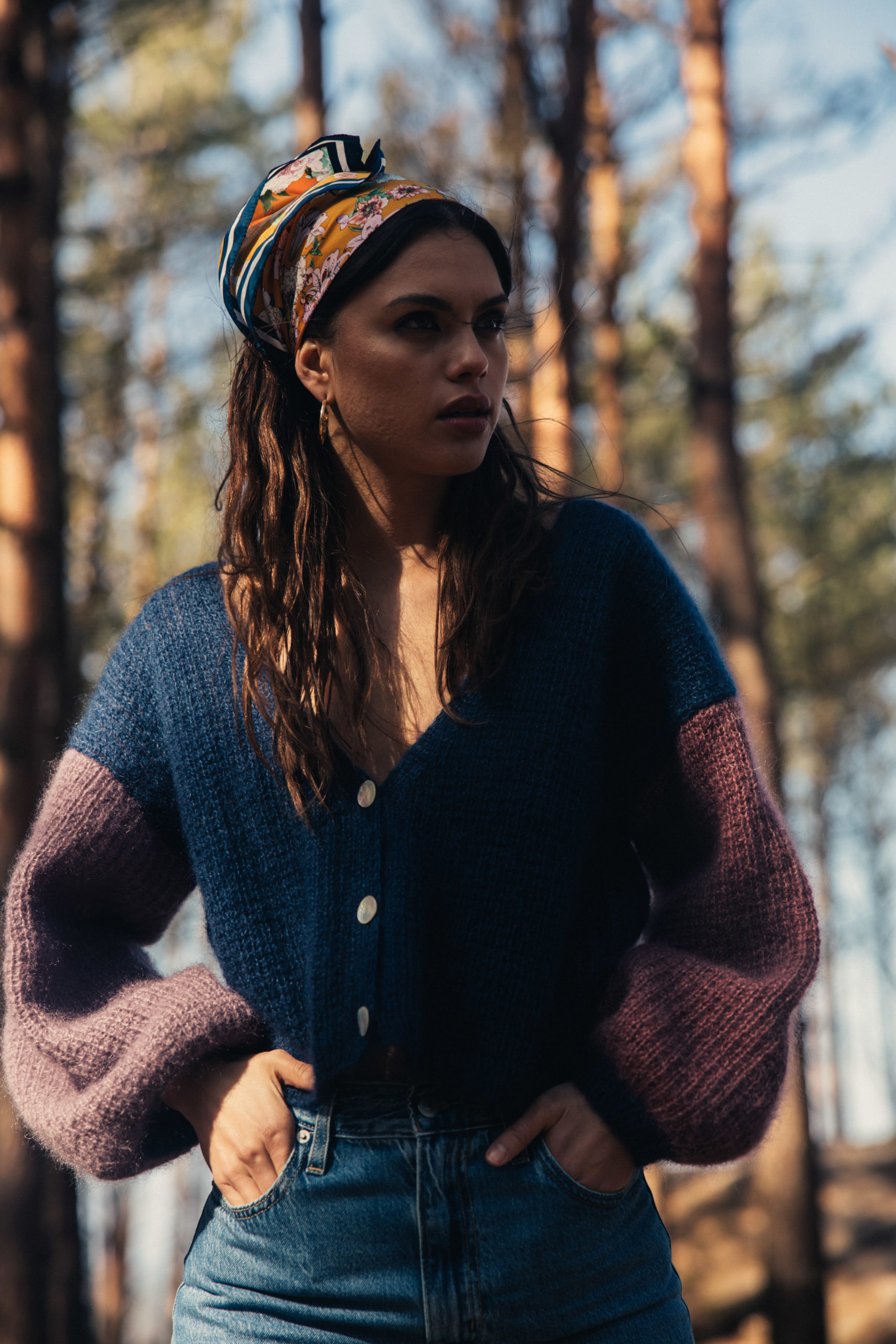 Kolorowy kardigan z głęboki dekoltem w serek, zapinany na trzy guziki. Lubimy latem nieco zaszaleć, dlatego postawiliśmy na kolory. Ten kardigan został wydziergany ręcznie z niezwykle delikatnej włóczki z alpaki, z dodatkiem jedwabiu. Idealny do noszenia na gołą skórę.