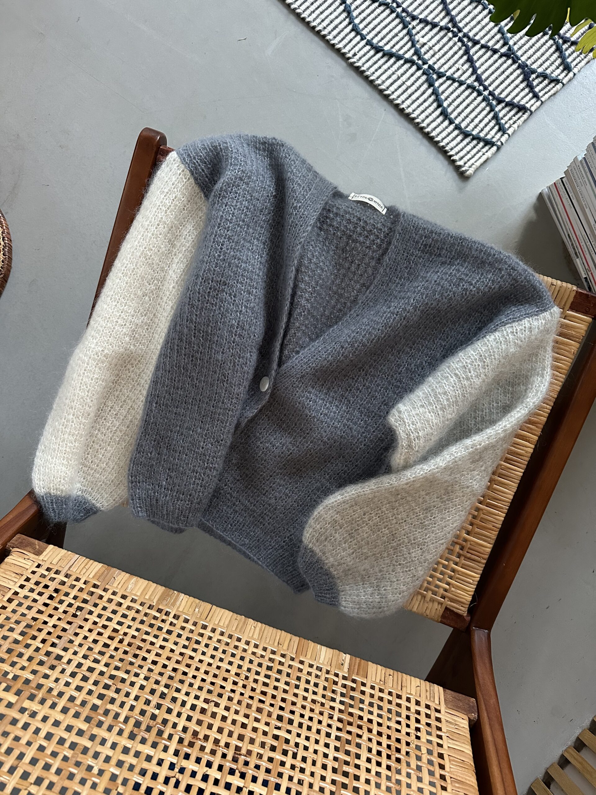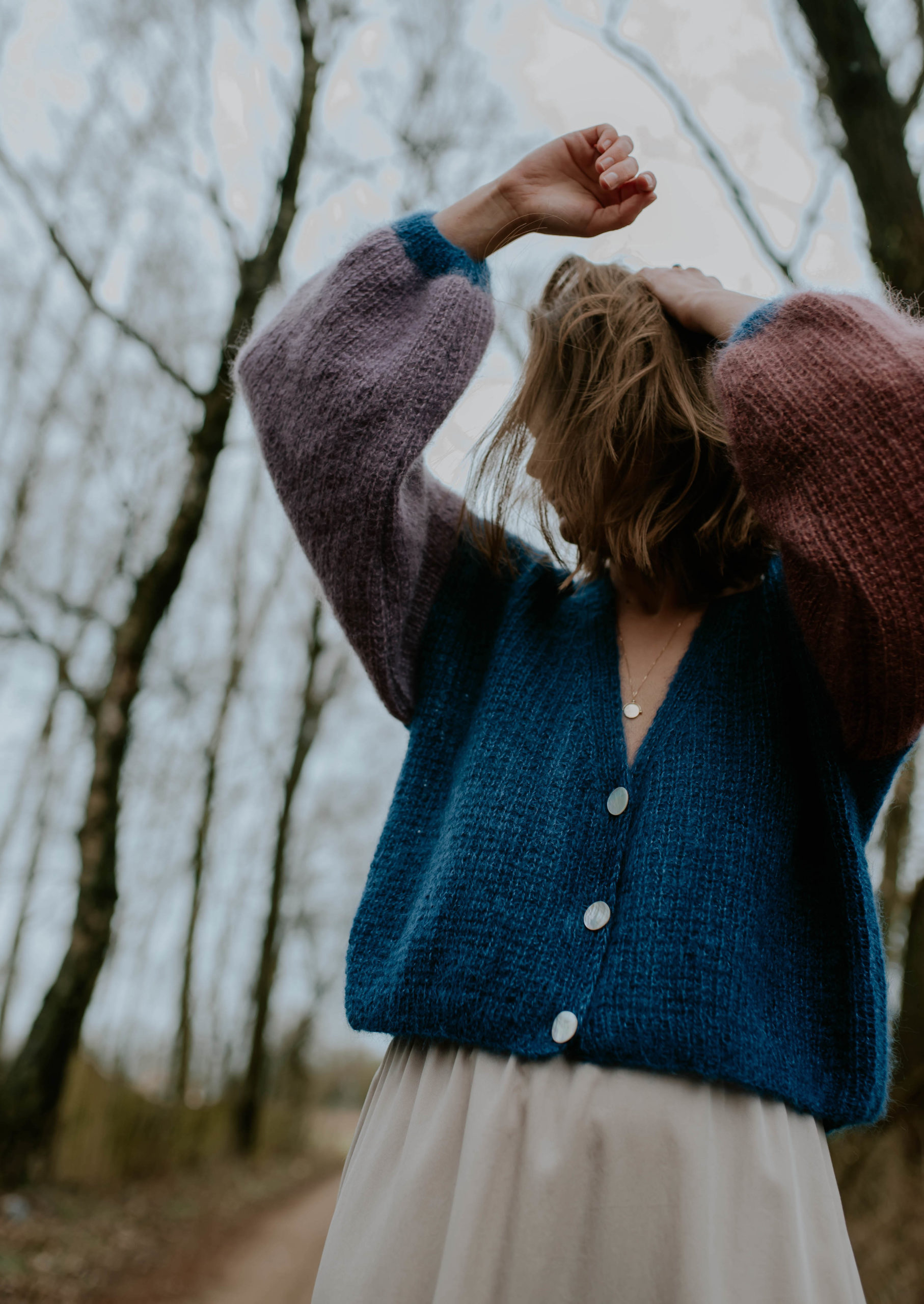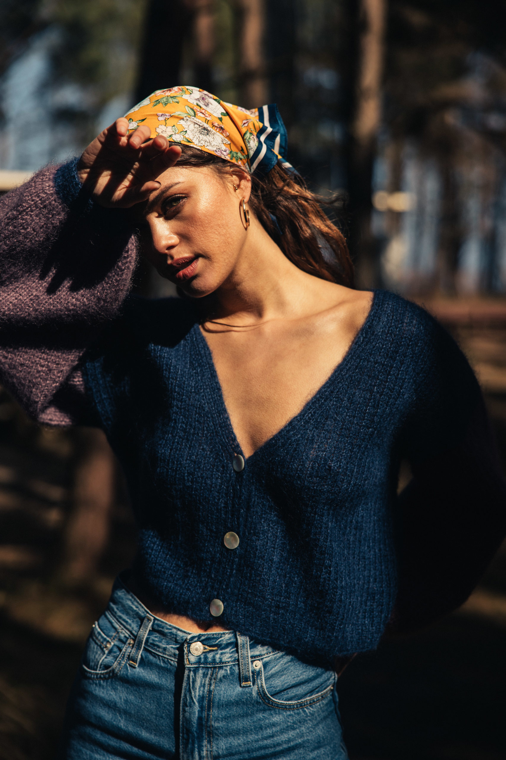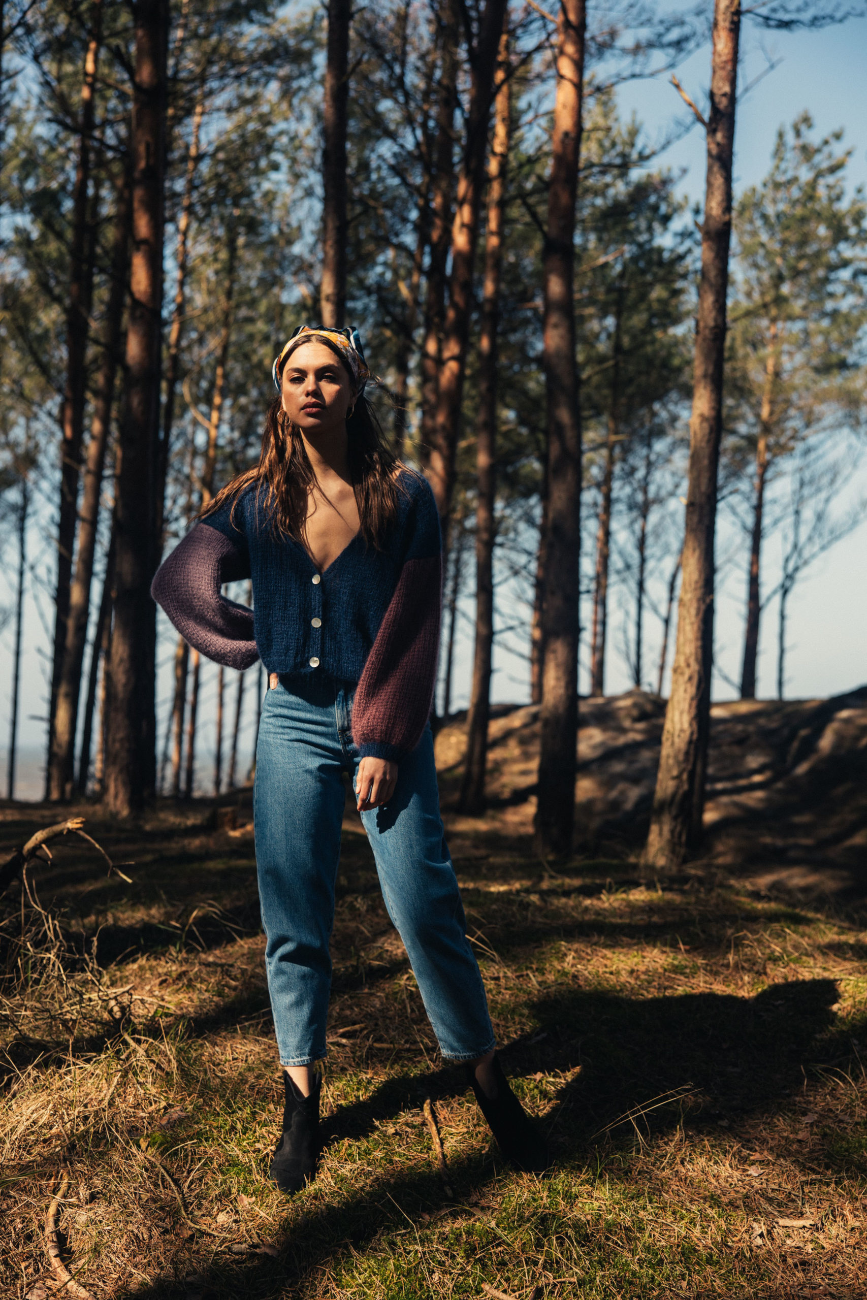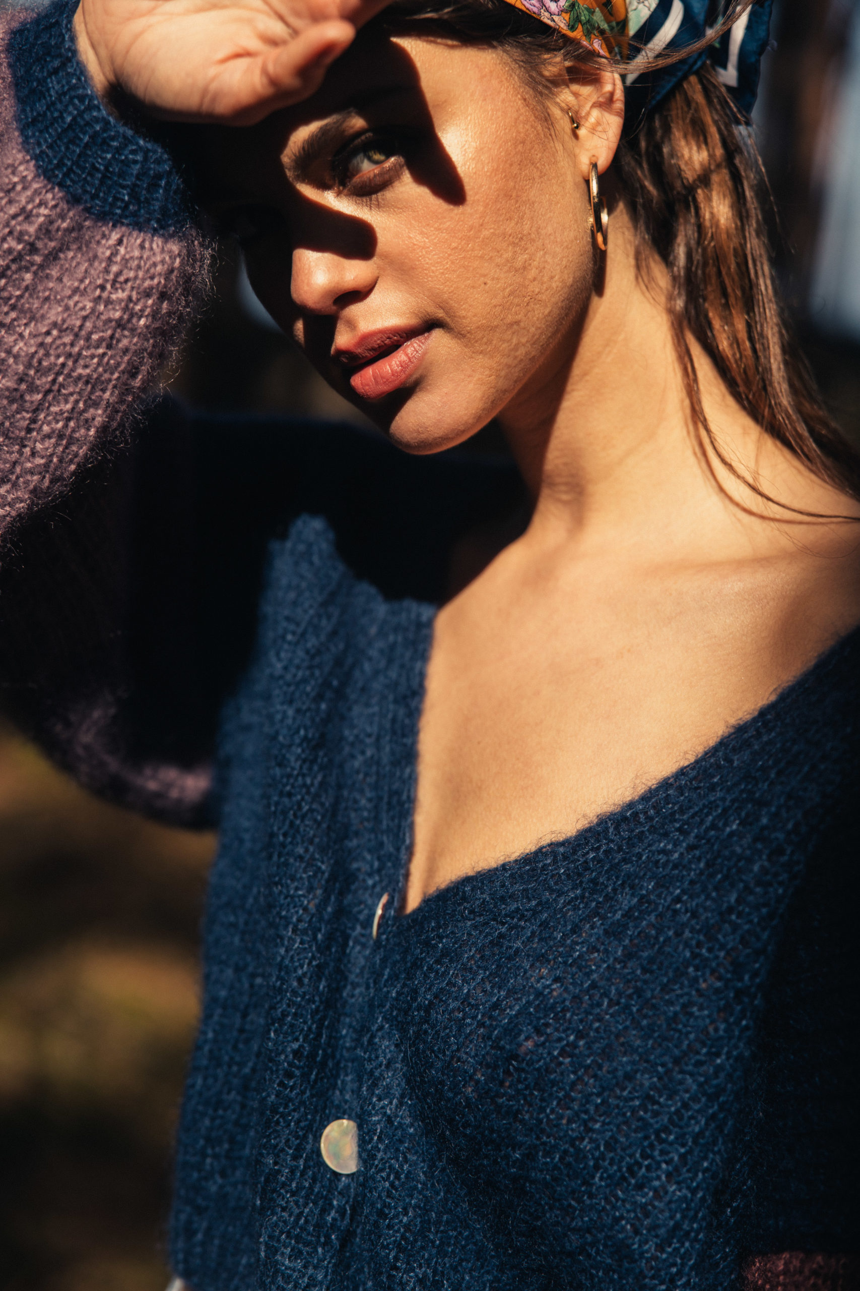 Kolorowy kardigan z głęboki dekoltem w serek, zapinany na trzy guziki. Lubimy latem nieco zaszaleć, dlatego postawiliśmy na kolory. Ten kardigan został wydziergany ręcznie z niezwykle delikatnej włóczki z alpaki, z dodatkiem jedwabiu. Idealny do noszenia na gołą skórę.
