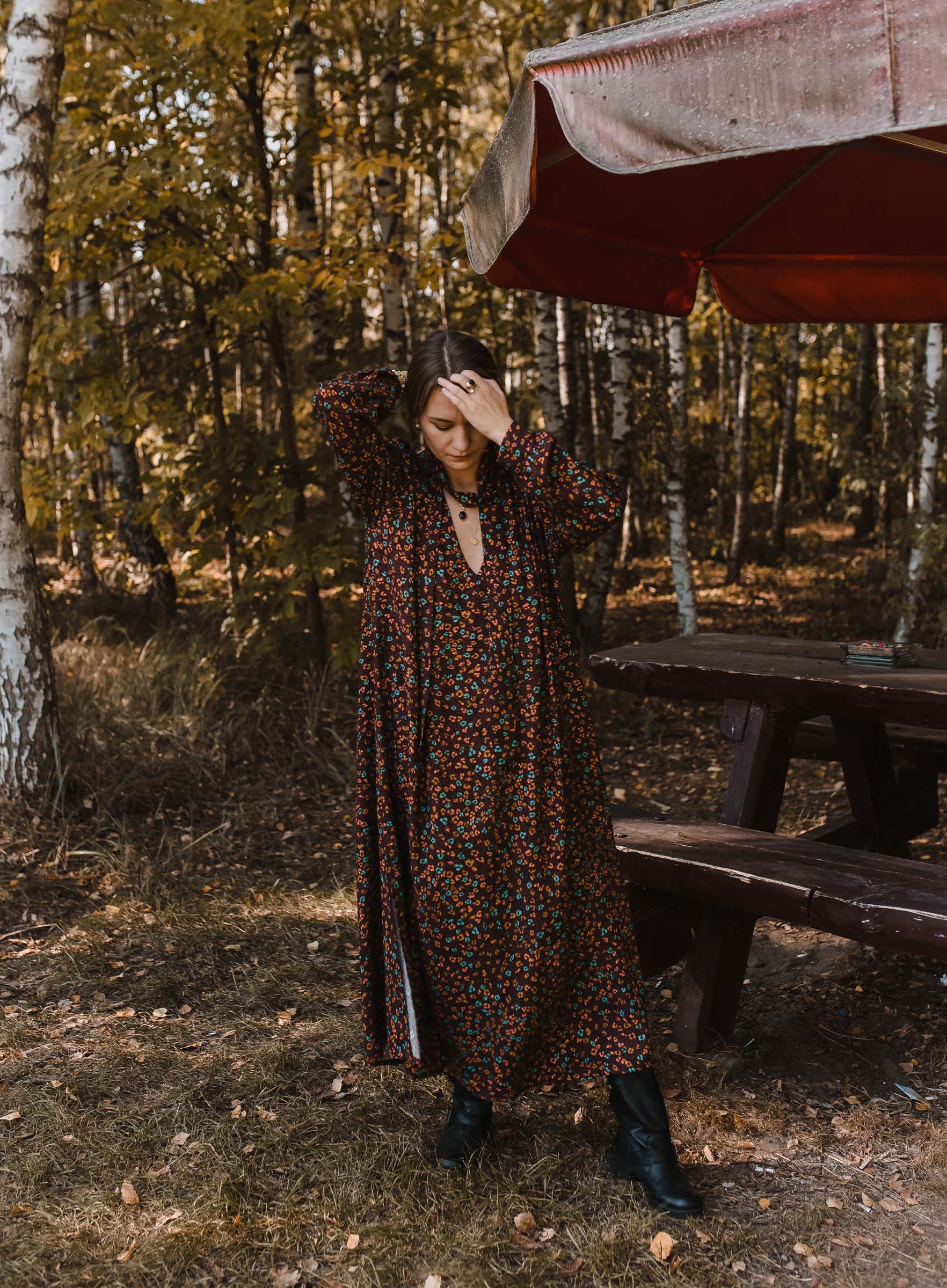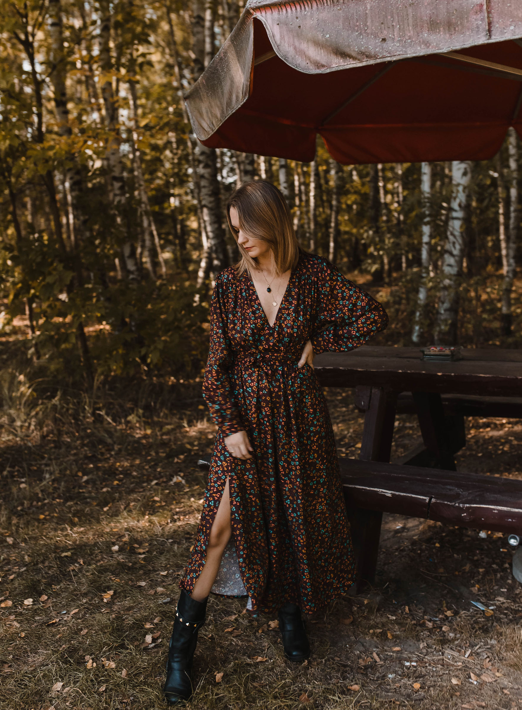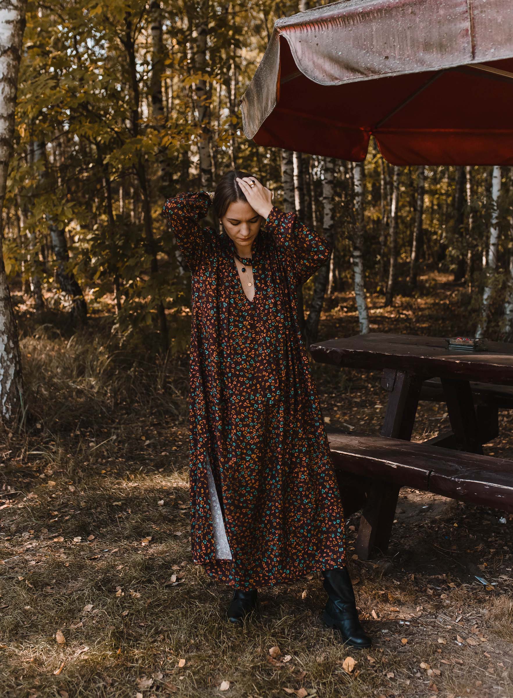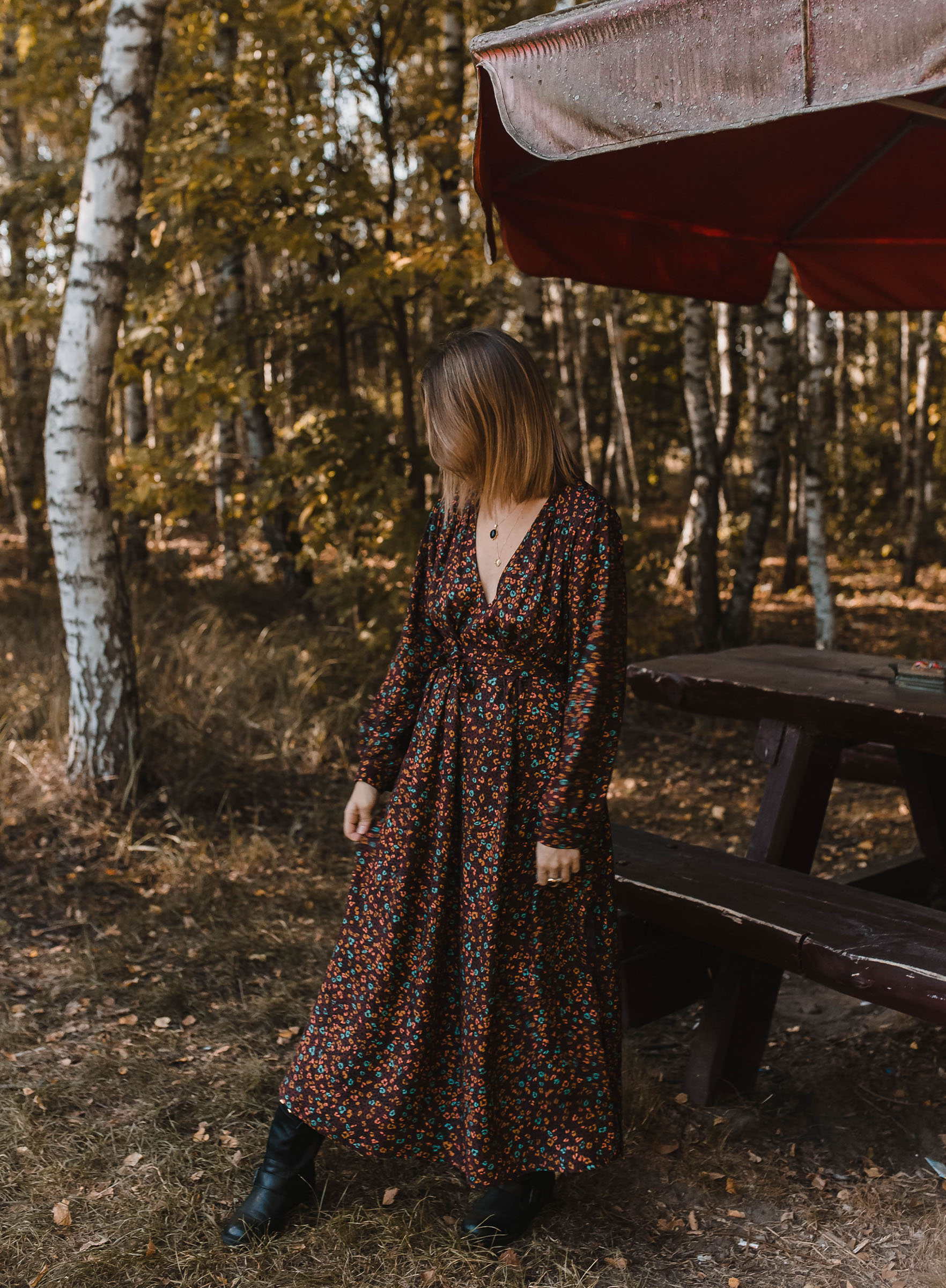 Sukienka w stylu boho uszyta z tkaniny w koci print. Możesz nosić ją na dwa sposoby: z dołączonym paskiem, lub bez niego. W wersji z paskiem stworzysz bardziej elegancki look, w wersji bez – bardziej boho. Wygląda super z kowbojkami. Trochę szczegółów: rozcięcia po bokach, dekolt w serek wykończony lamówką, rękawy zakończone mankietami, marszczenia z tyłu i z przodu.