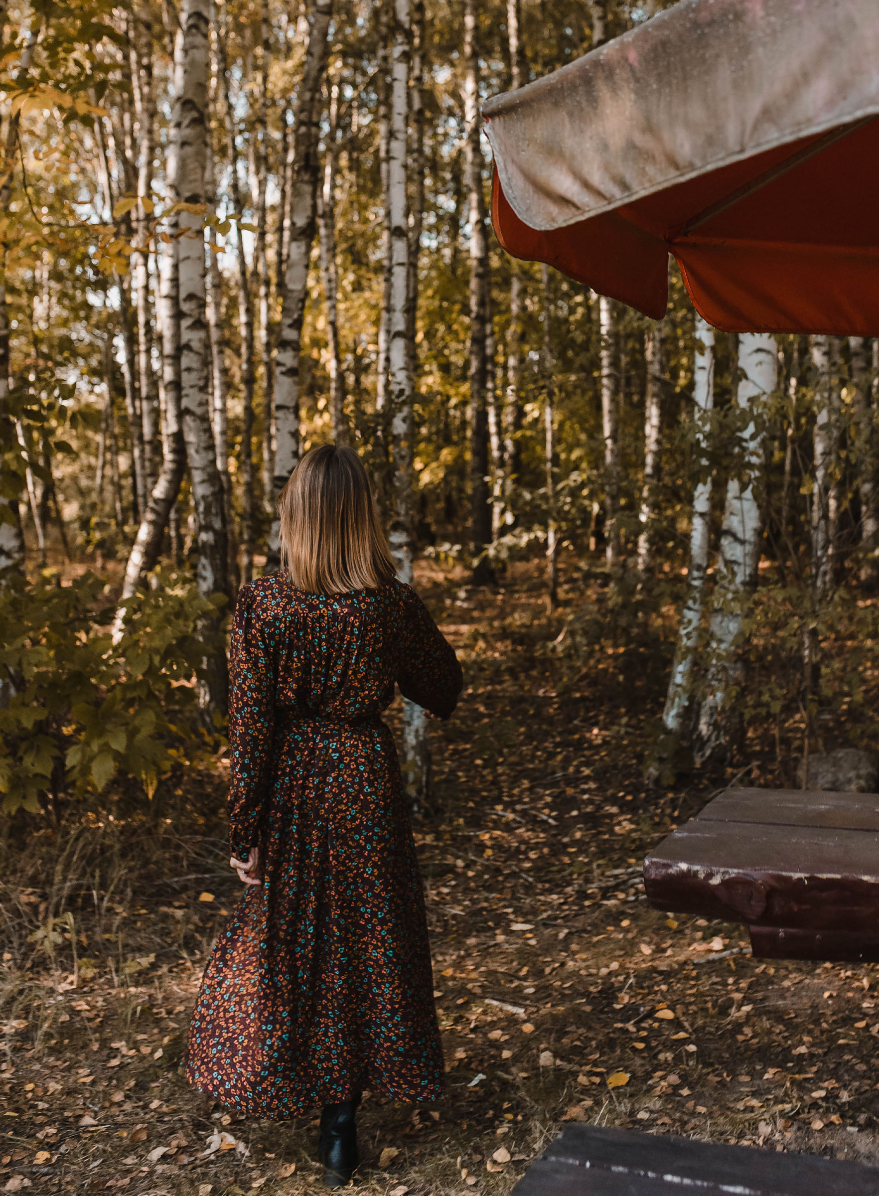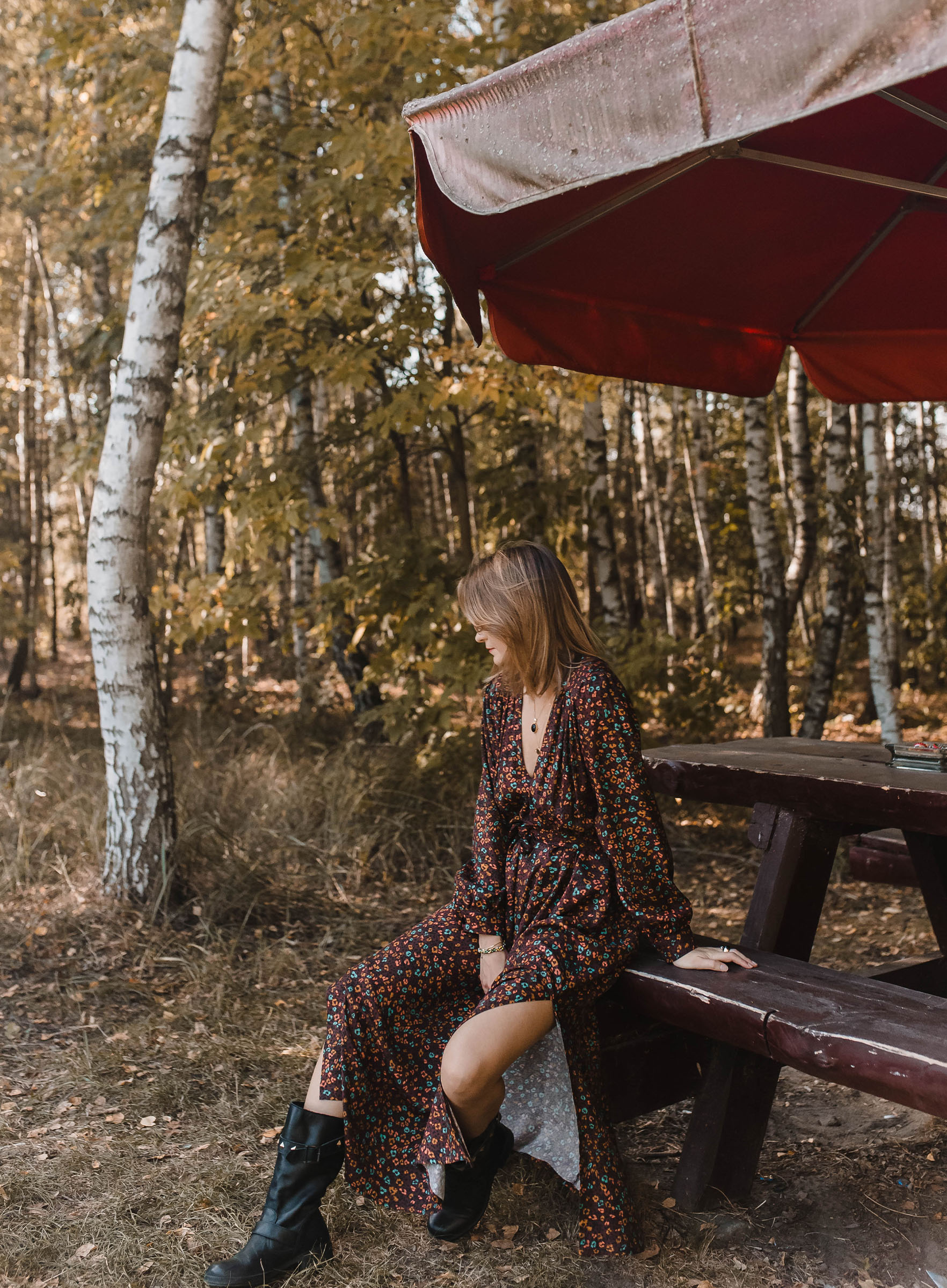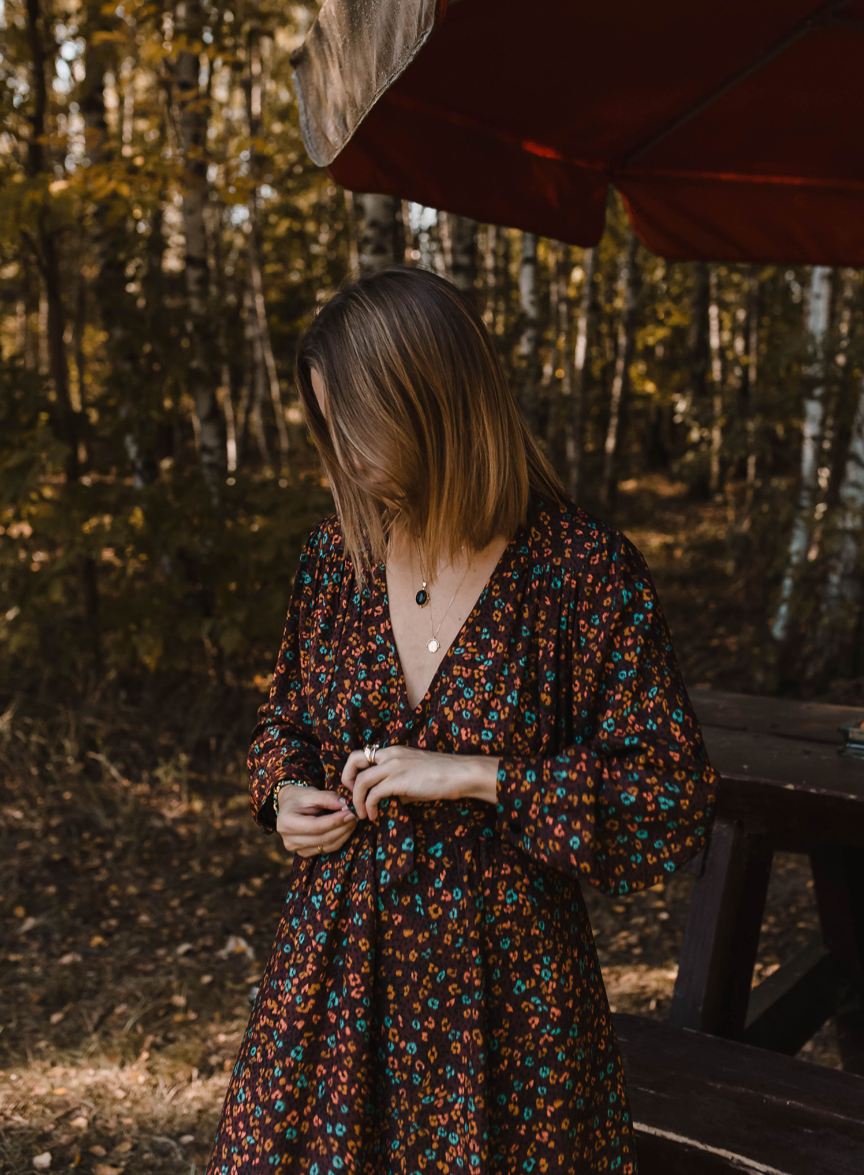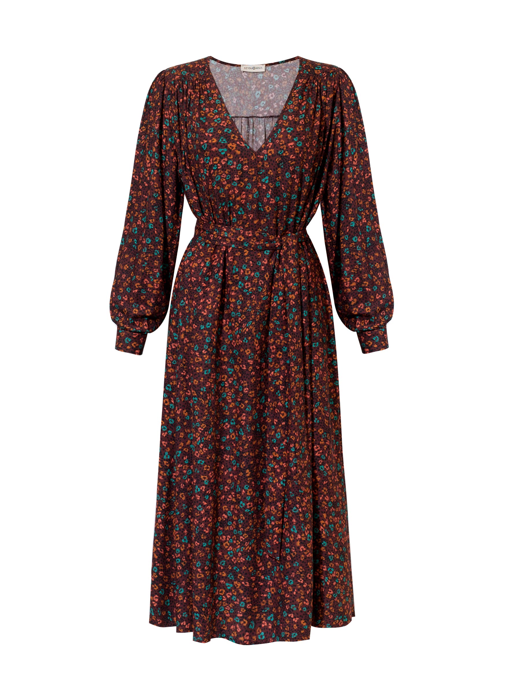 Sukienka w stylu boho uszyta z tkaniny w koci print. Możesz nosić ją na dwa sposoby: z dołączonym paskiem, lub bez niego. W wersji z paskiem stworzysz bardziej elegancki look, w wersji bez – bardziej boho. Wygląda super z kowbojkami. Trochę szczegółów: rozcięcia po bokach, dekolt w serek wykończony lamówką, rękawy zakończone mankietami, marszczenia z tyłu i z przodu.