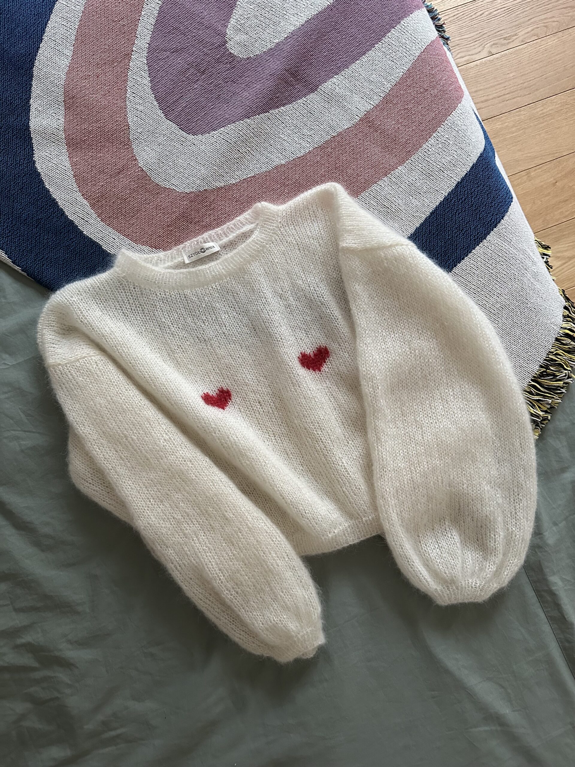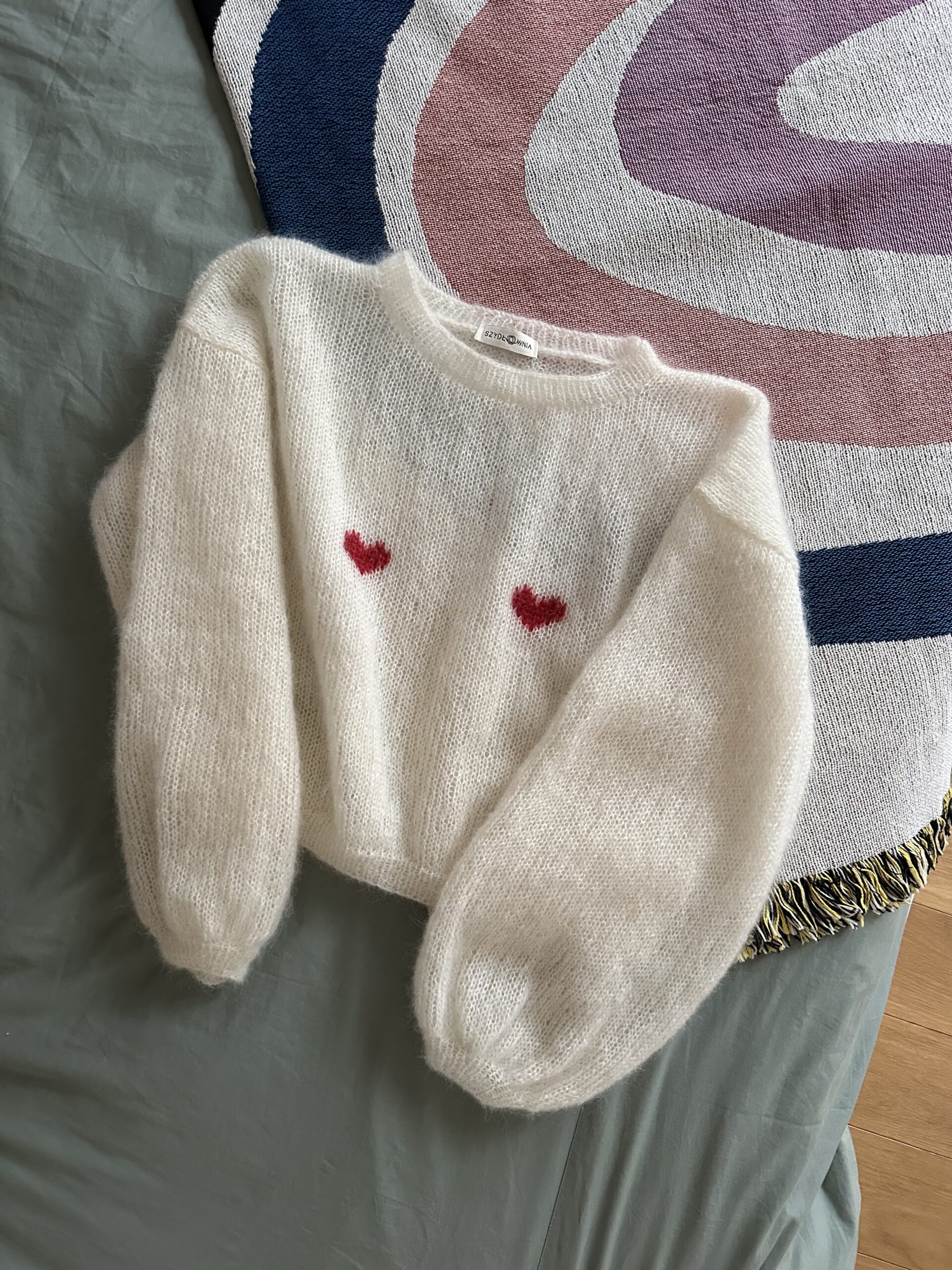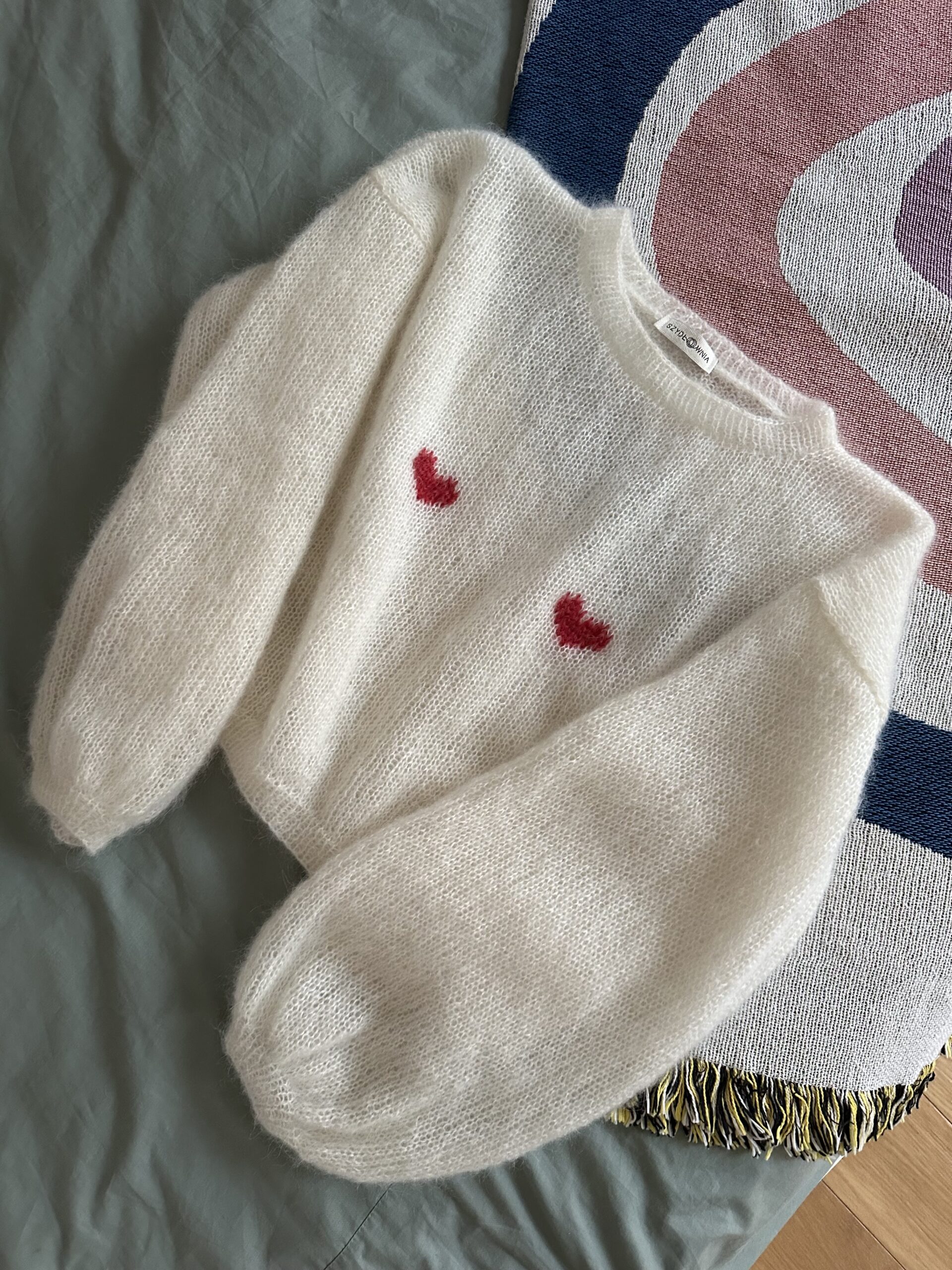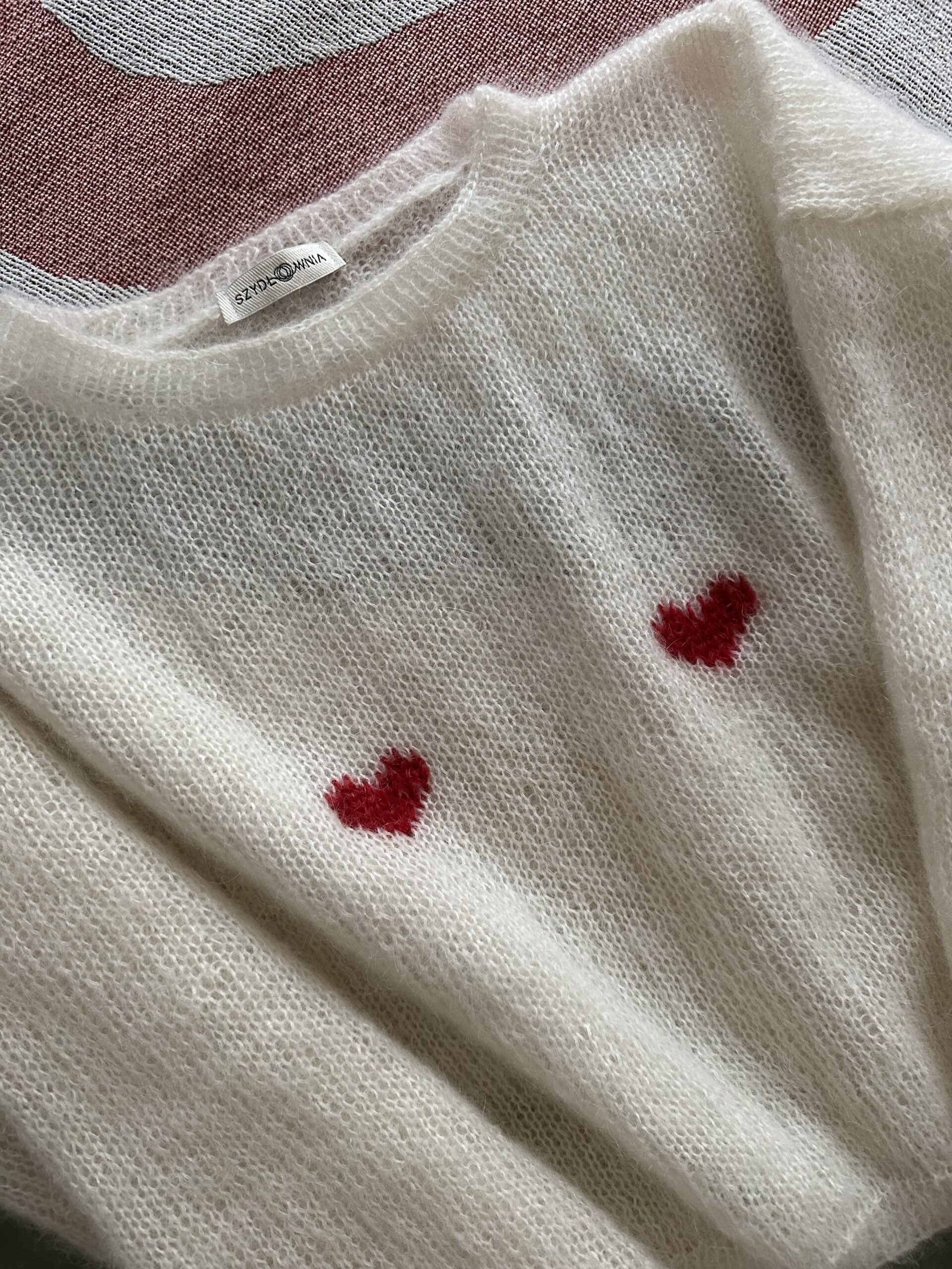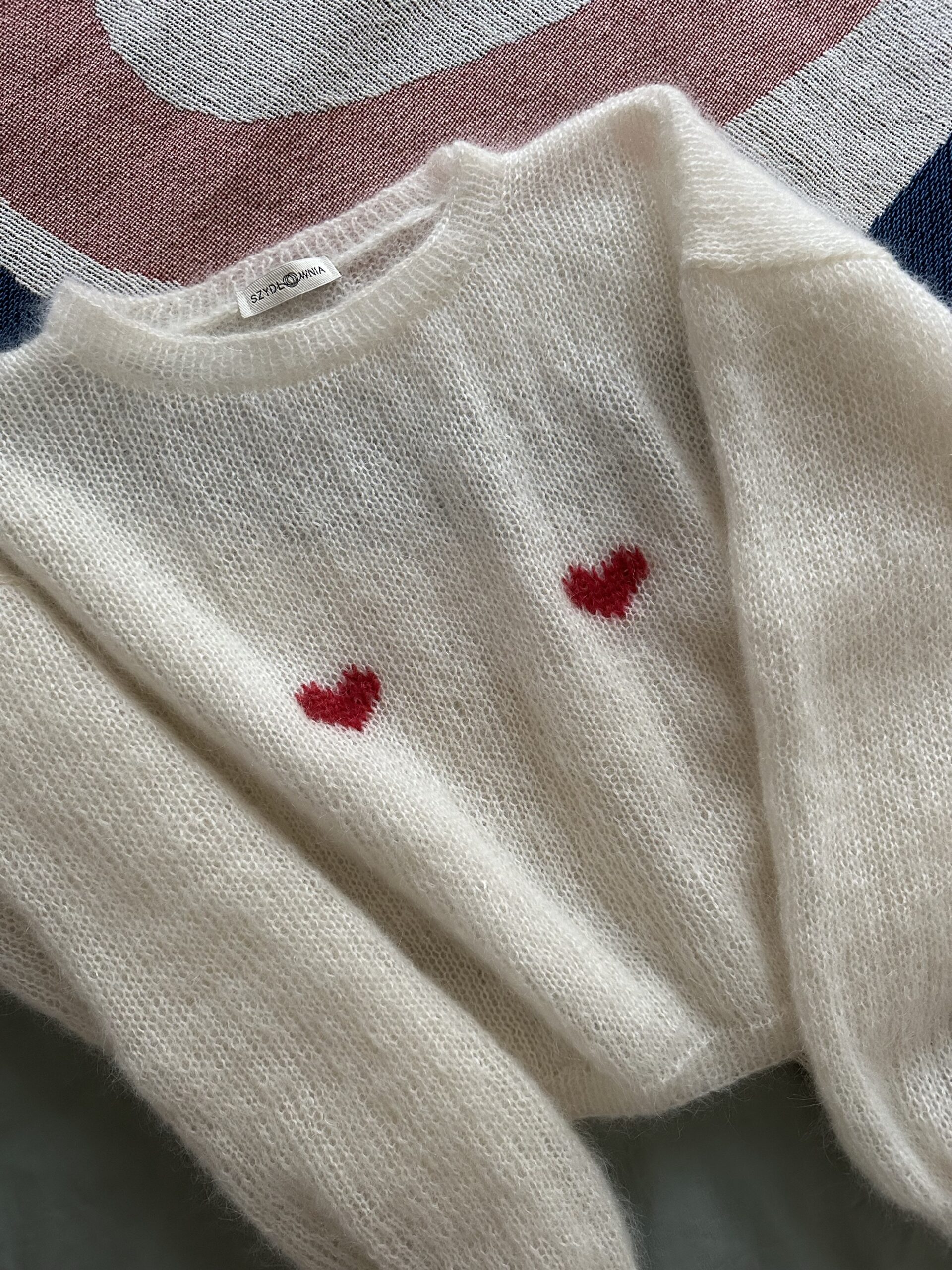 Lekki sweter wydziergany ręcznie z włóczki z alpaki i jedwabiu. Na biuście zdobiony haftowanymi serduszkami.