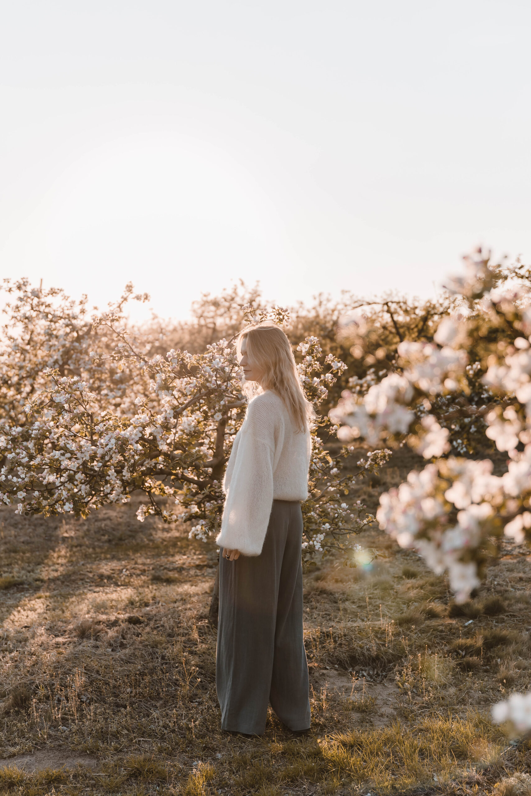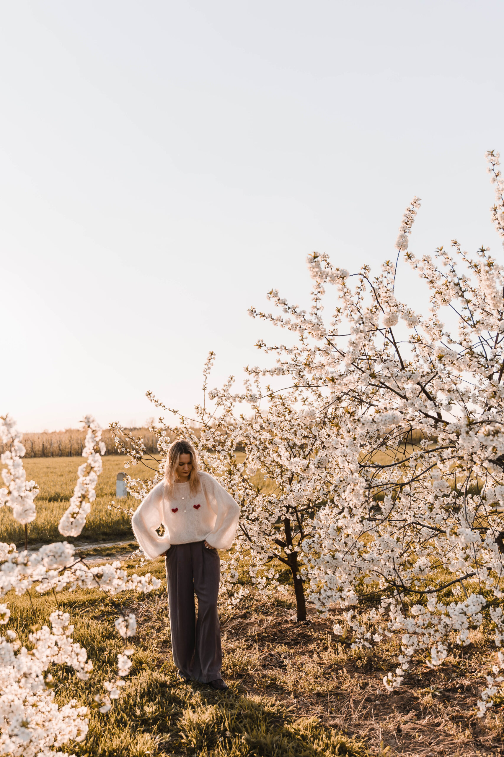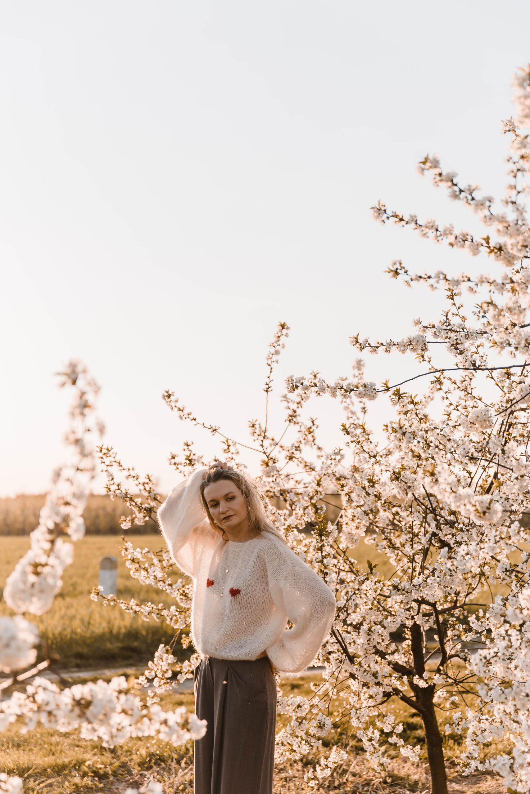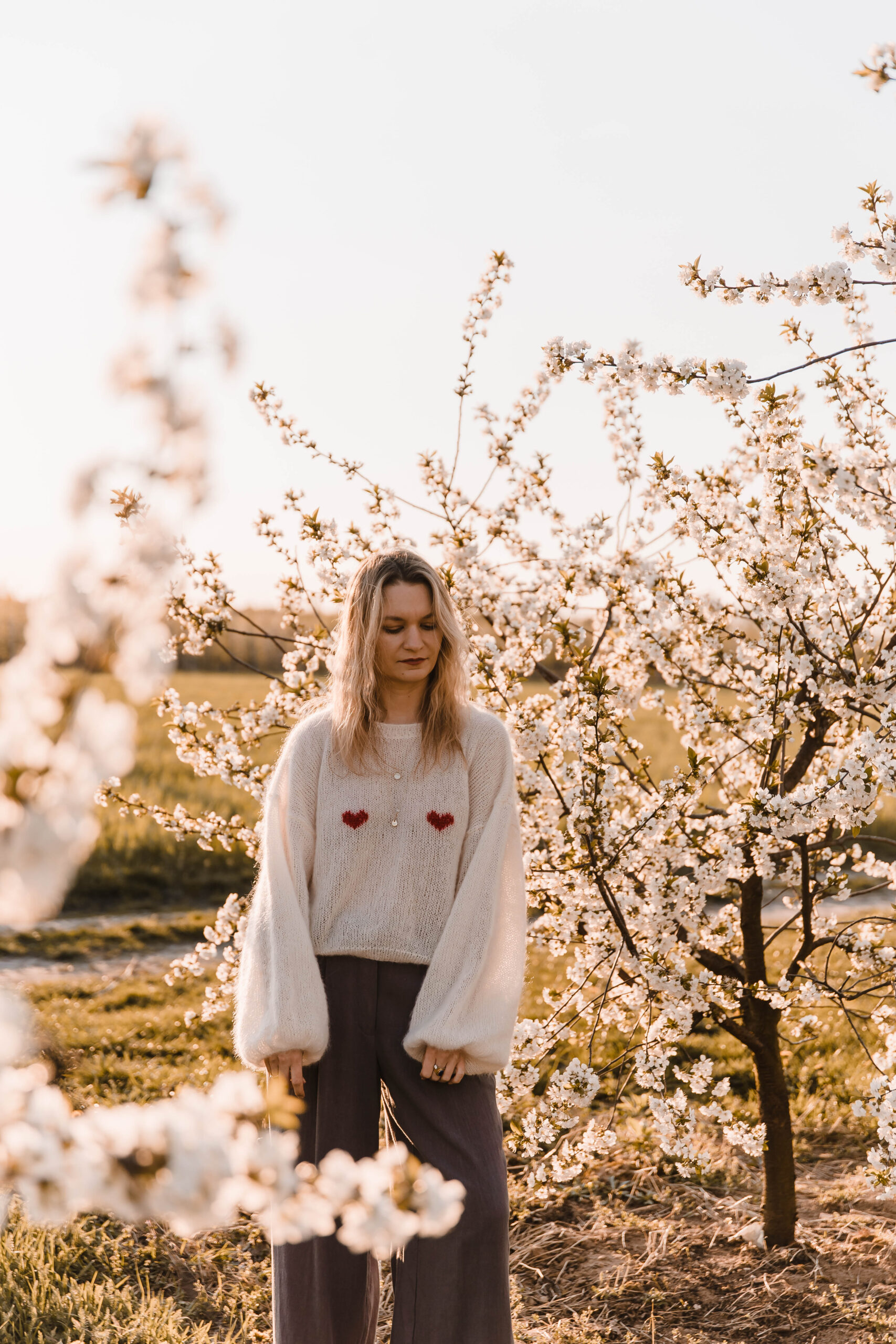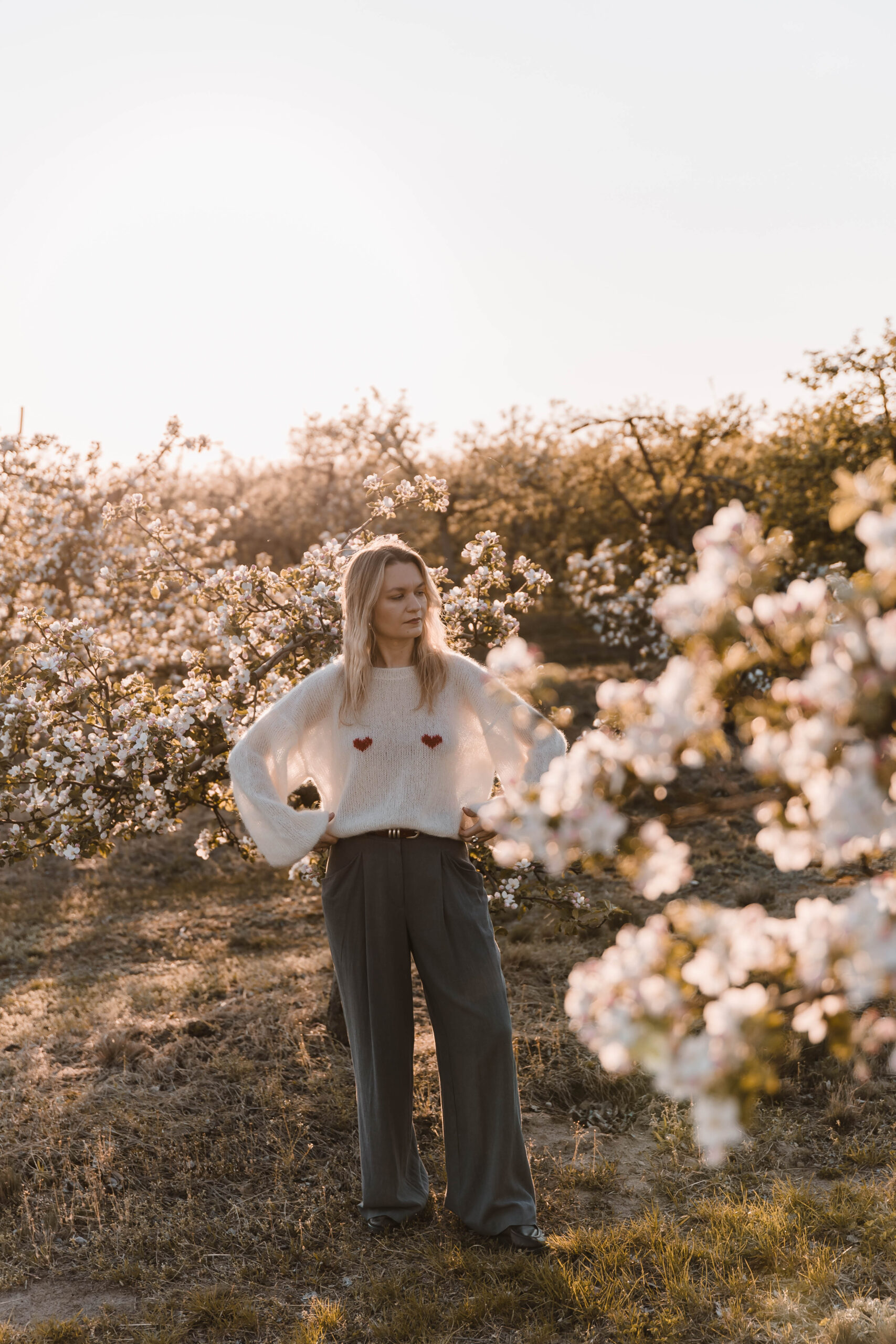 Lekki sweter wydziergany ręcznie z włóczki z alpaki i jedwabiu. Na biuście zdobiony haftowanymi serduszkami.