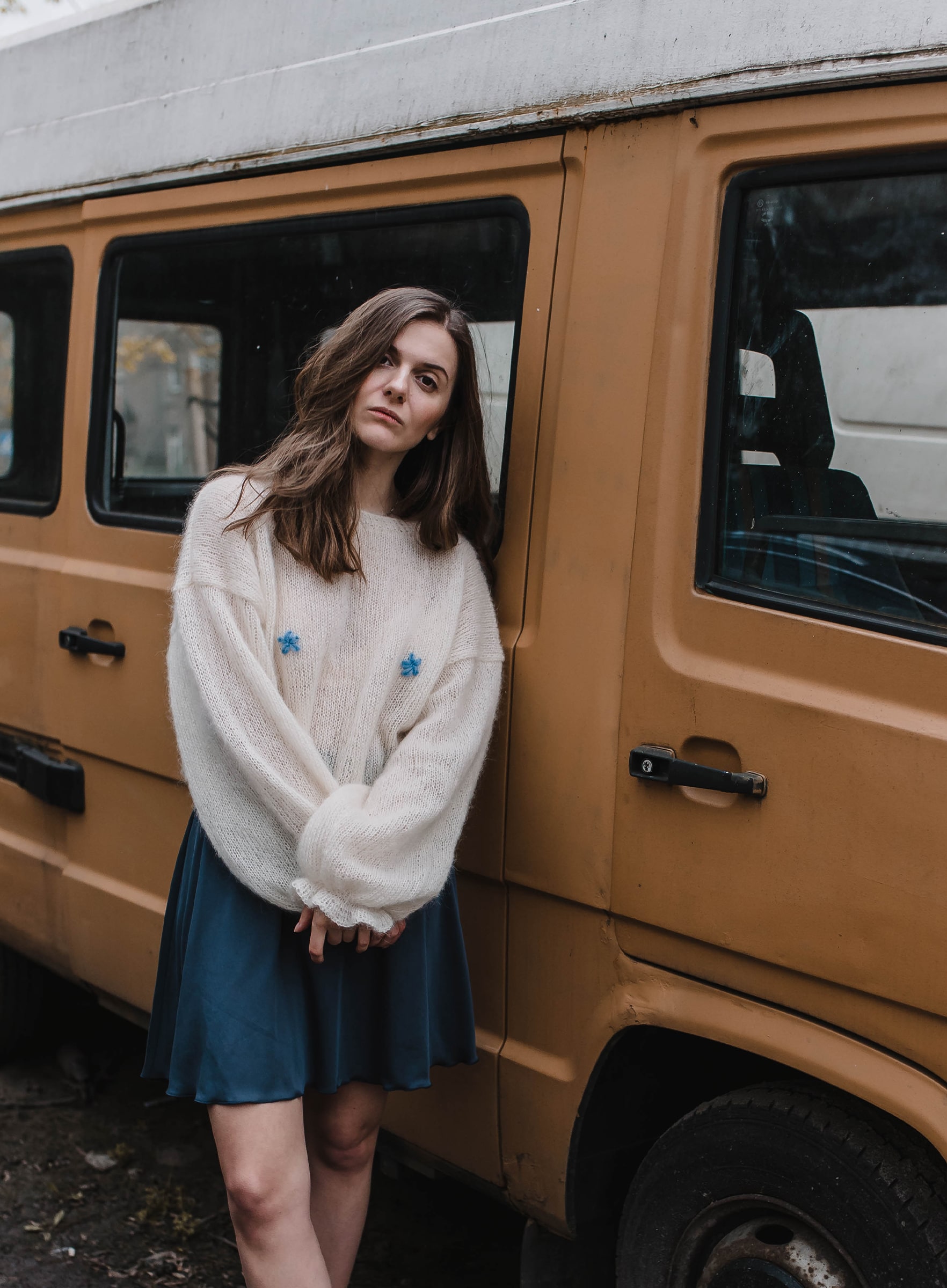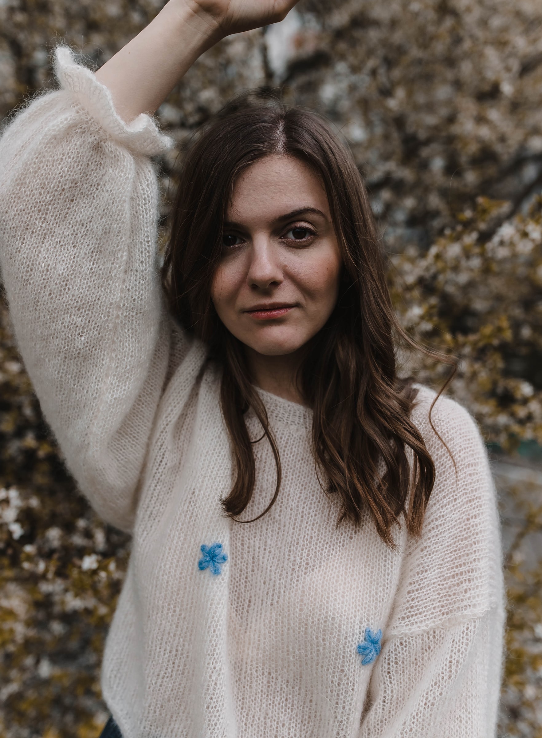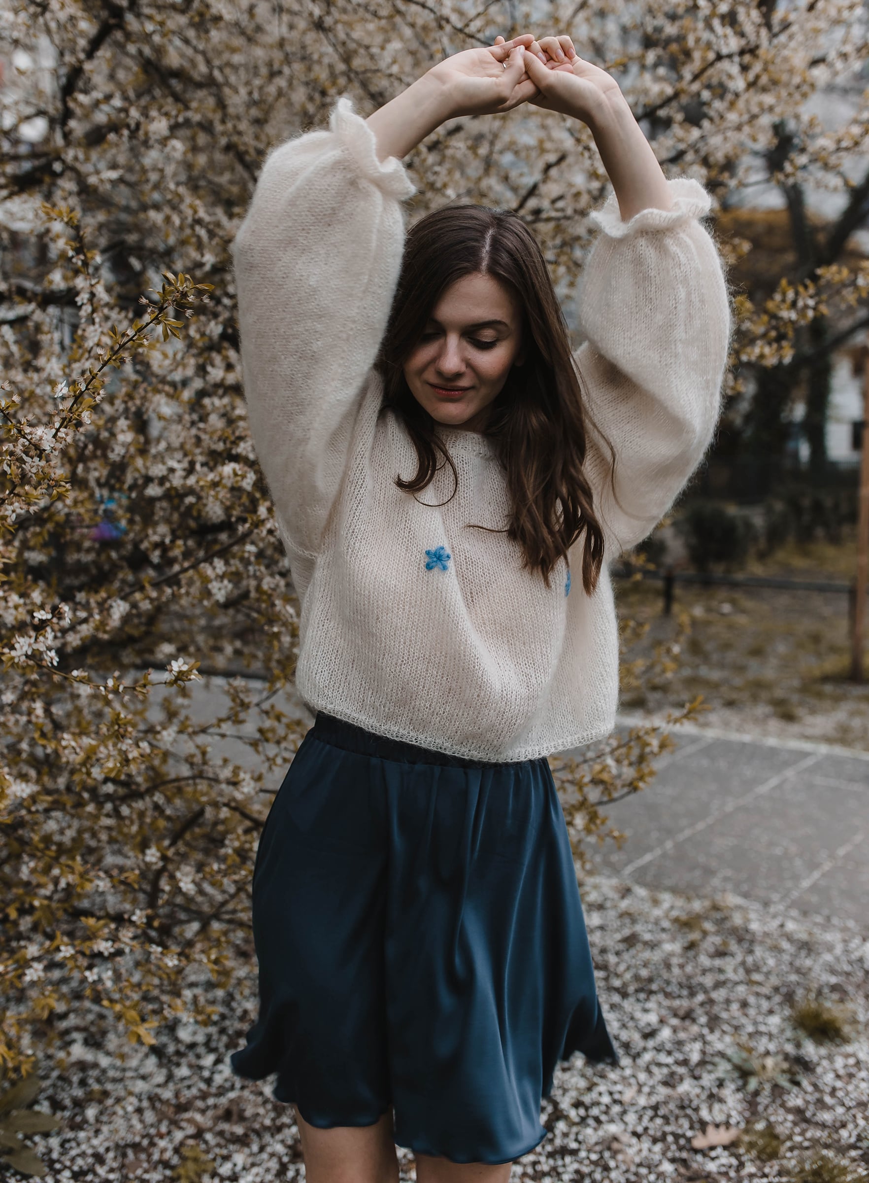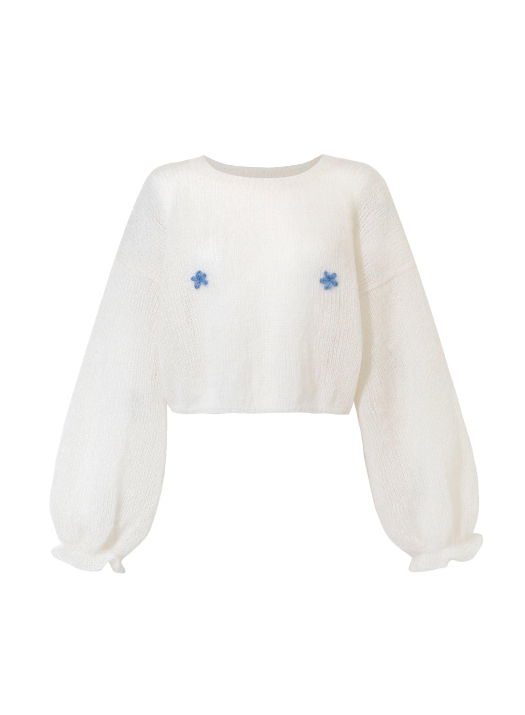 Lekki sweter wydziergany ręcznie z włóczki z alpaki i jedwabiu. Na biuście zdobiony haftowanymi kwiatkami. Rękawy zakończone dziewczęca falbanką.