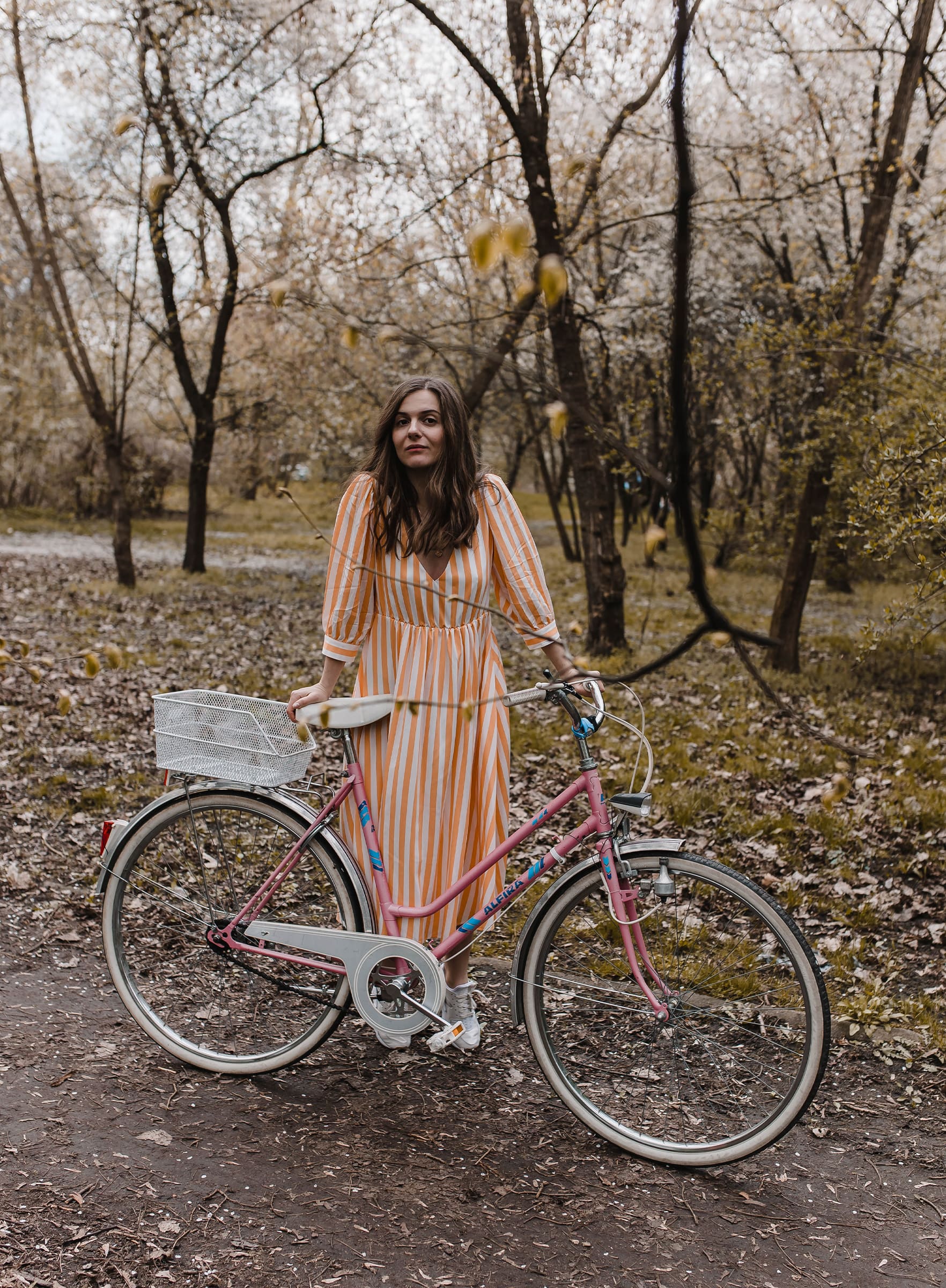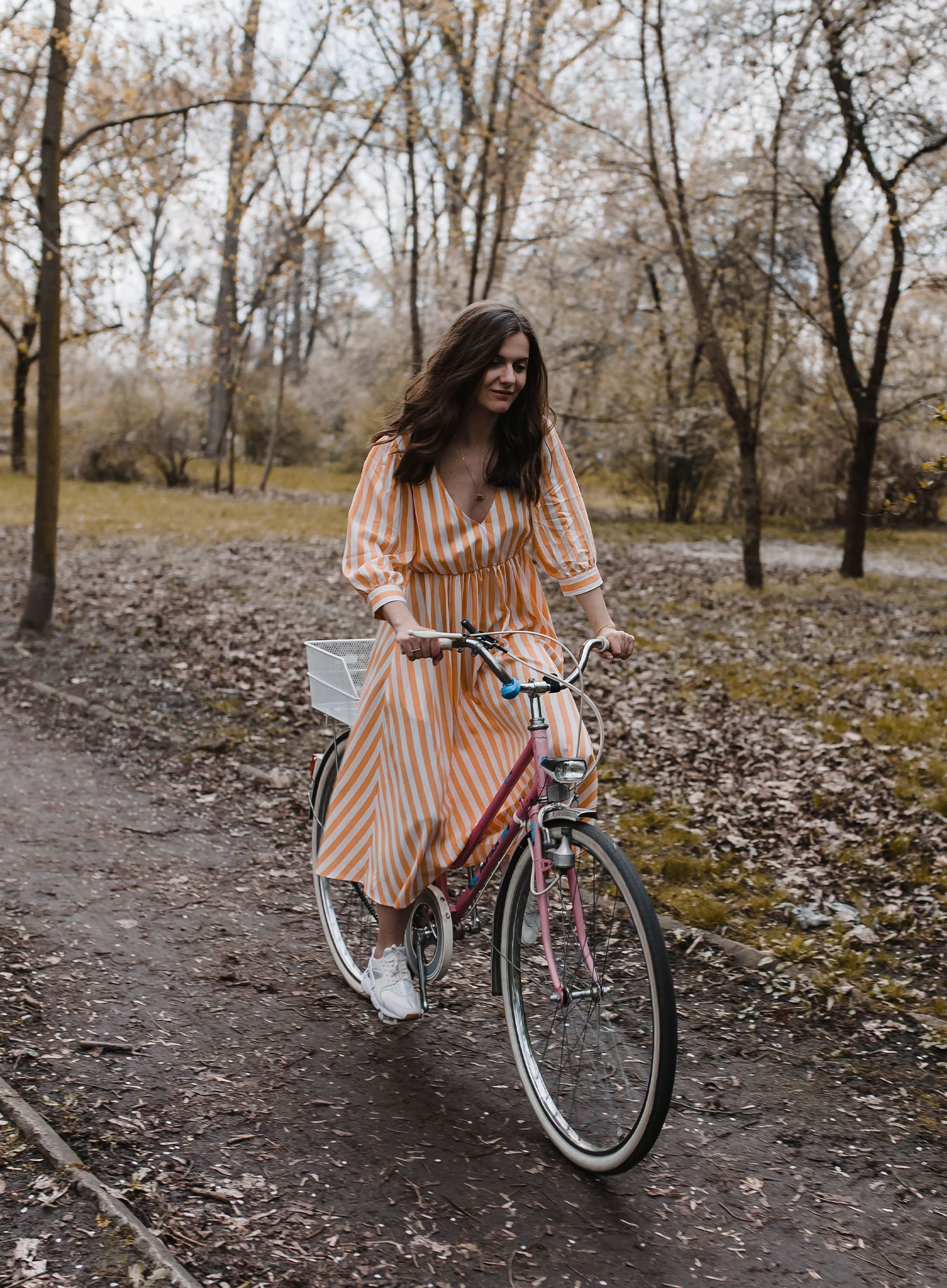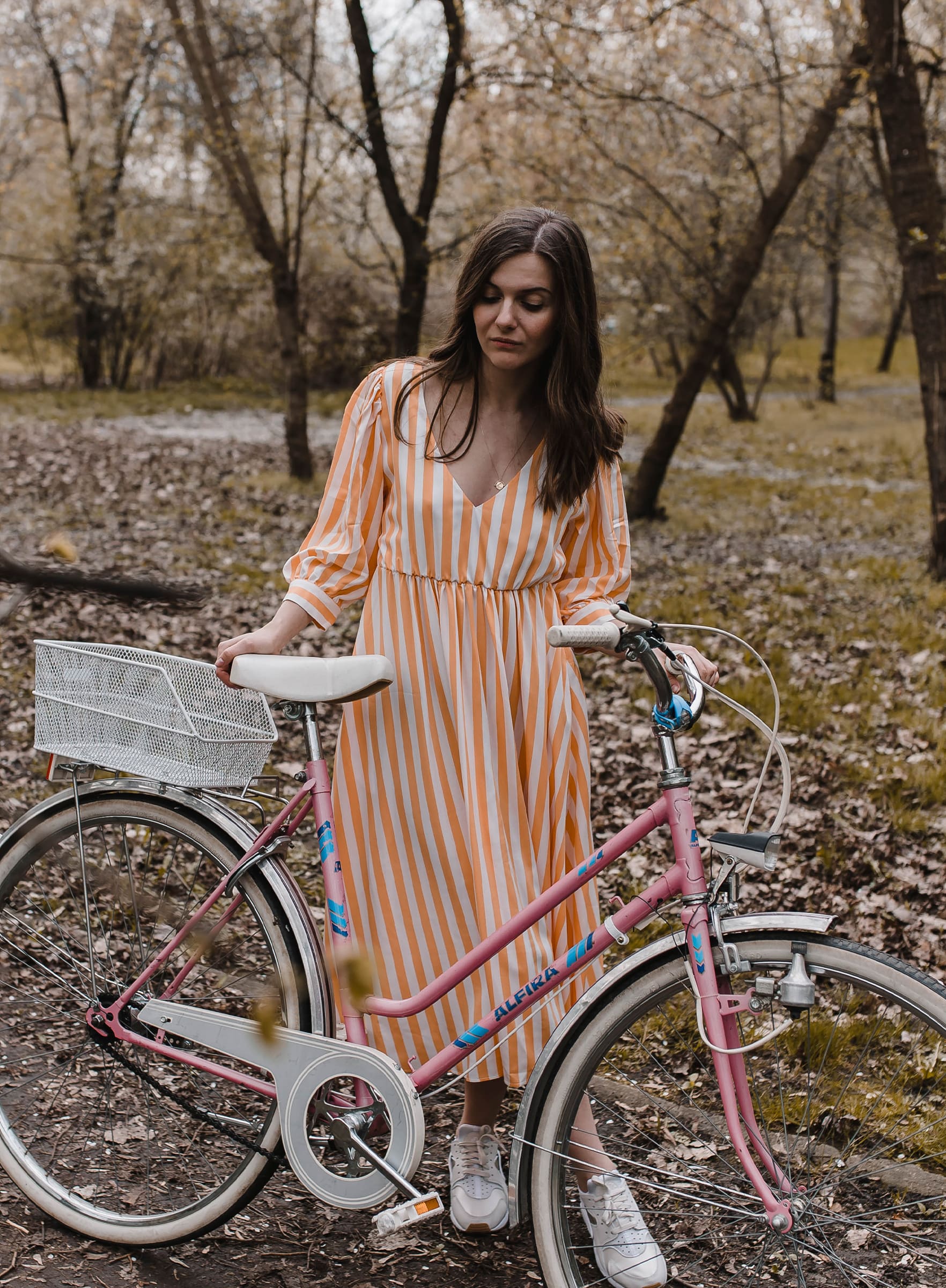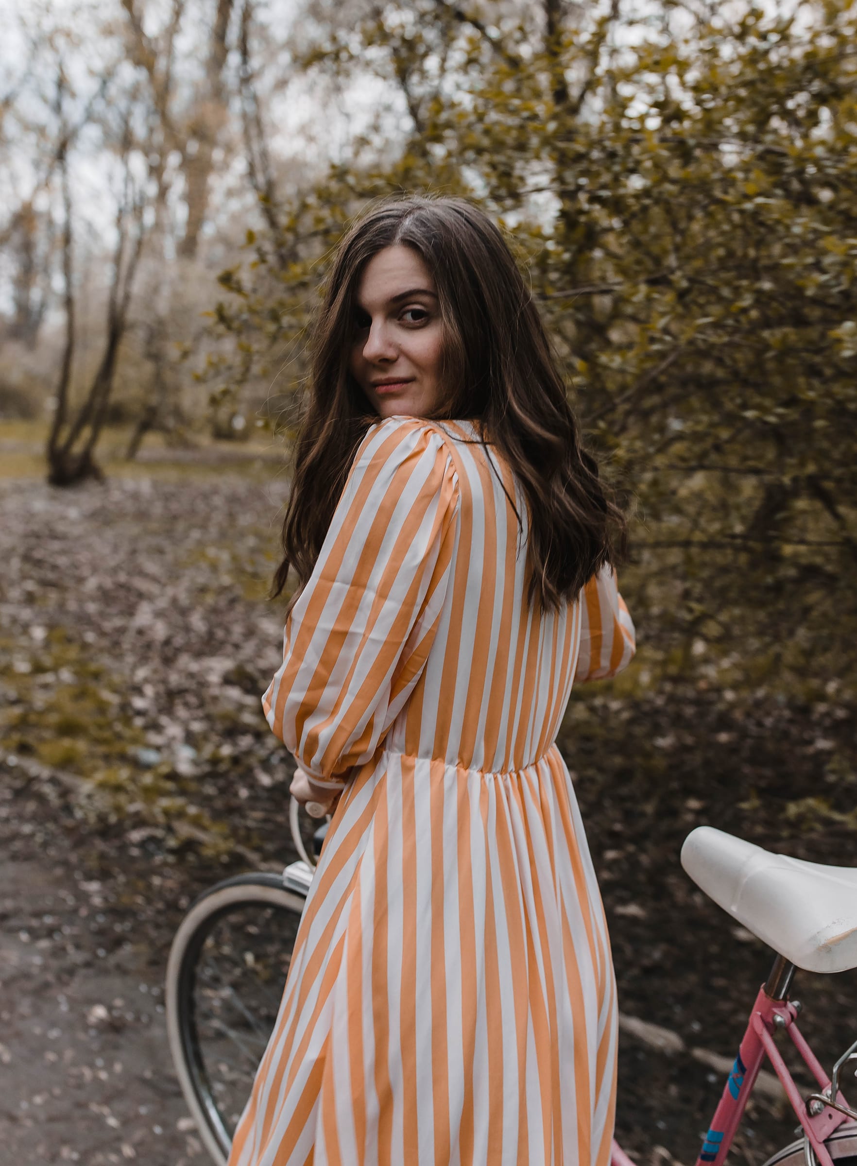 Poste rozwiązania często okazują się najlepsze. Długo rozważaliśmy jaka sukienka powinna powstać z tej tkaniny. Finalnie postawiliśmy na prostą formę, która podkreśli figurę i uwydatni pasiasty wzór. Brzoskwiniowe paski, gumka w pasie i balonowy rękawek delikatnie za łokieć. Do sandałków na obcasie na wieczór, do klasycznych birkenów na dzień.