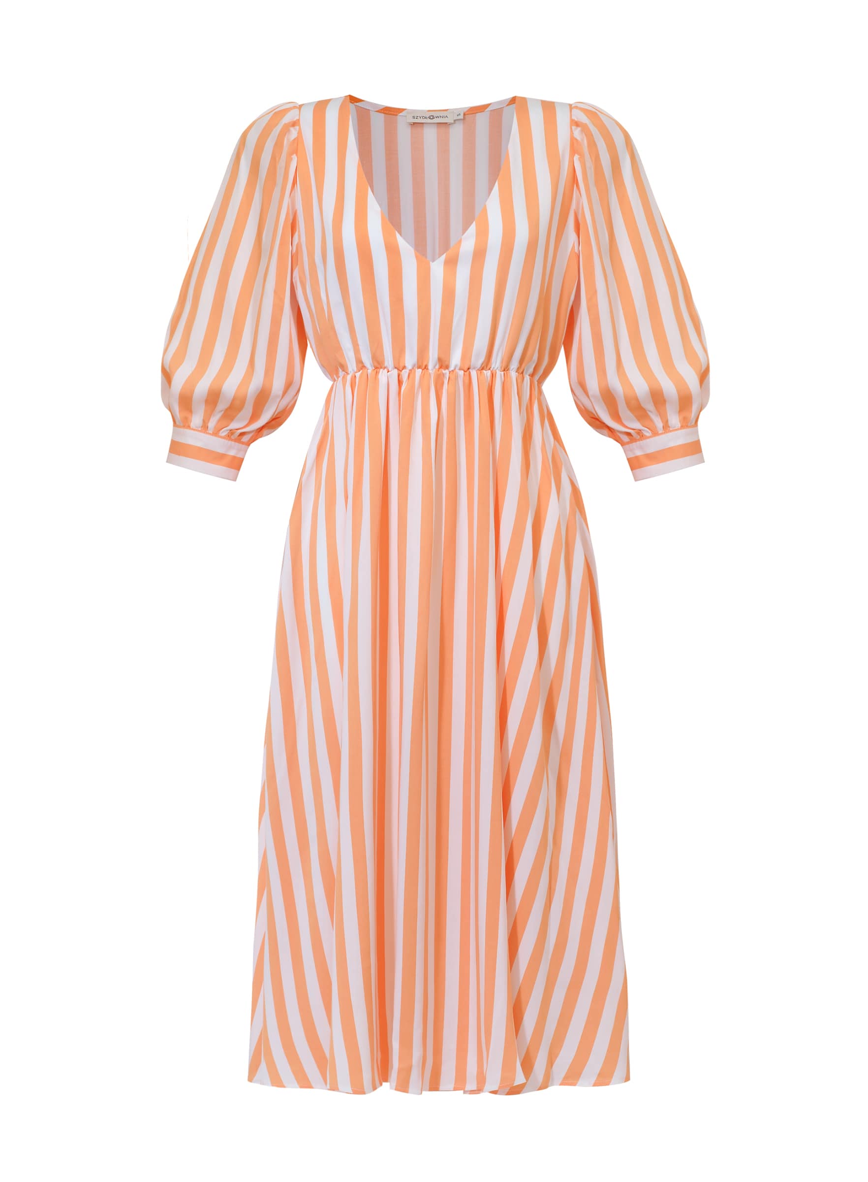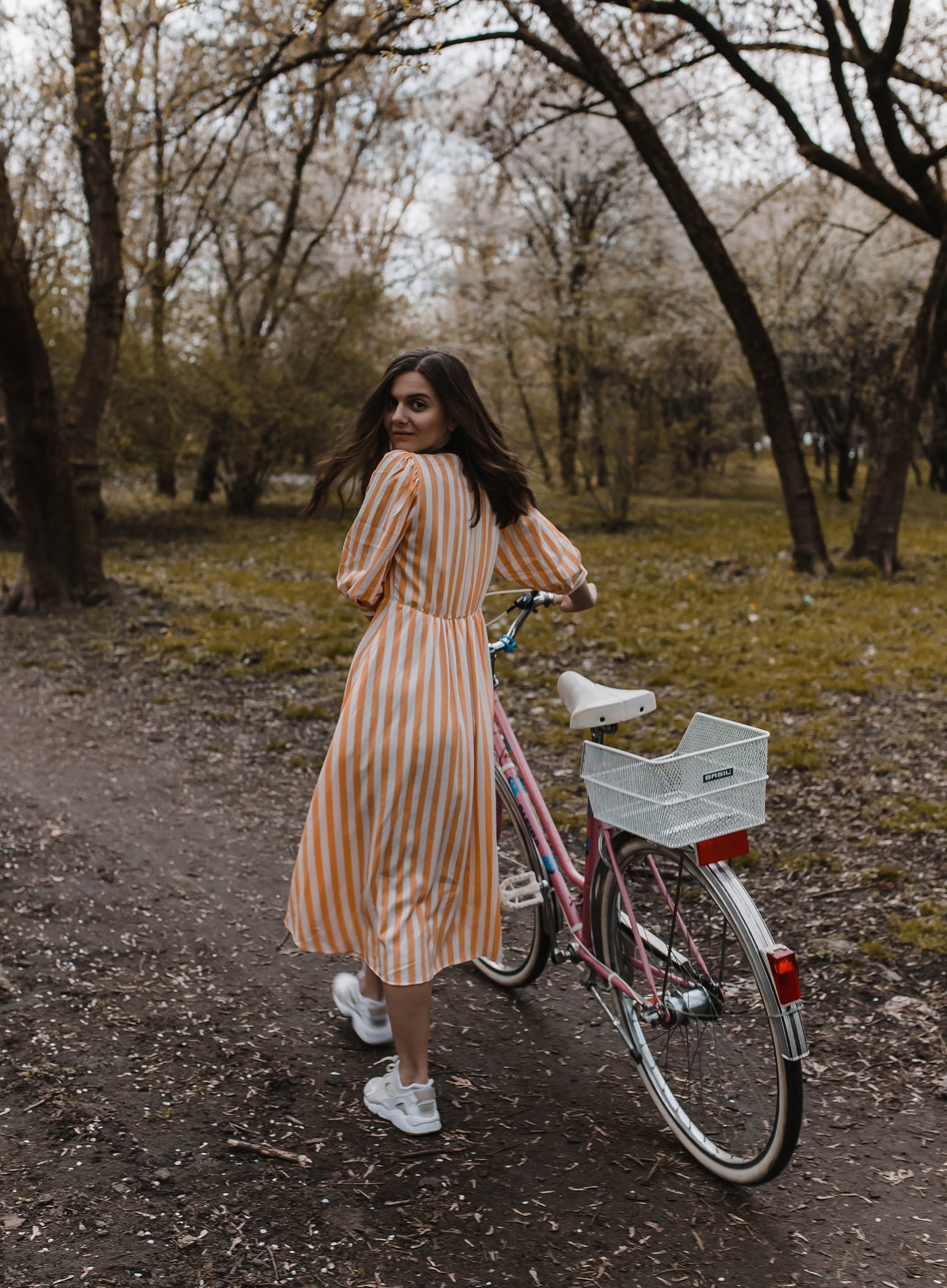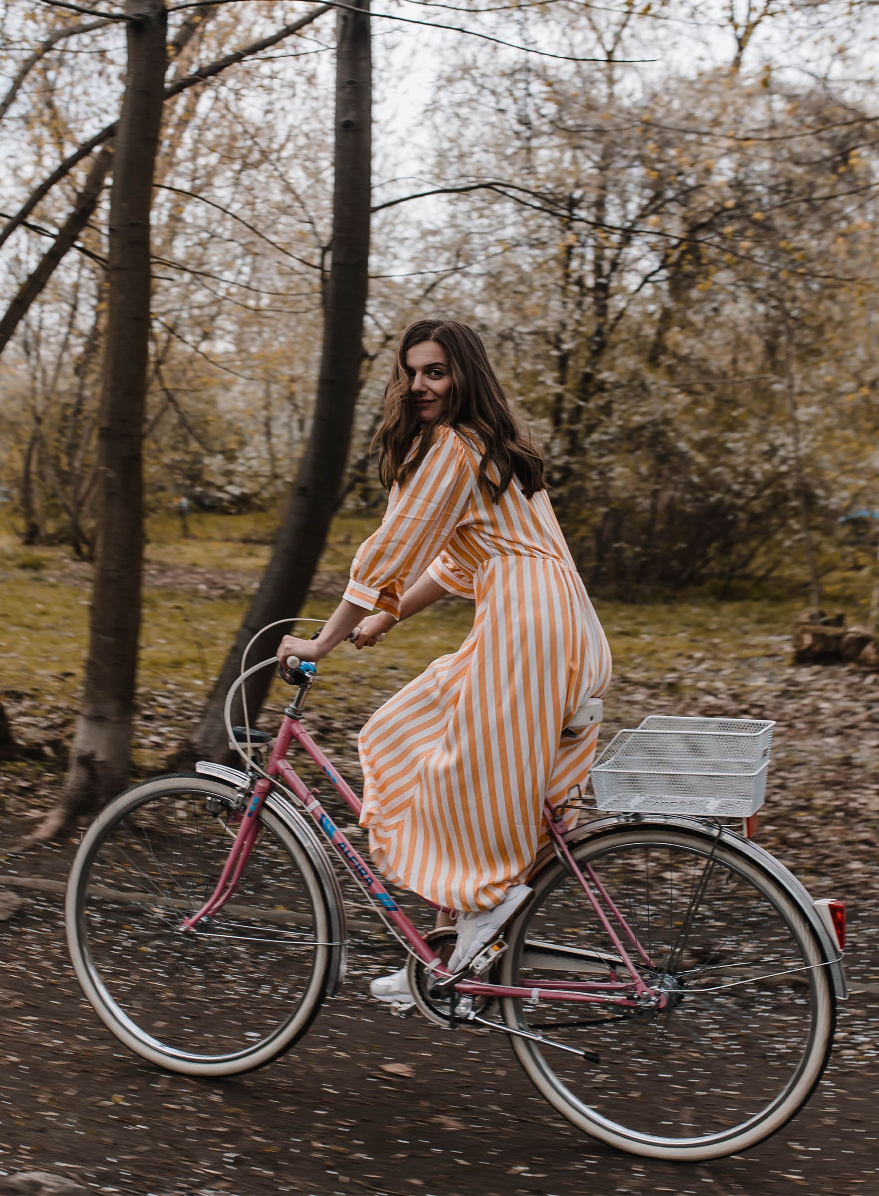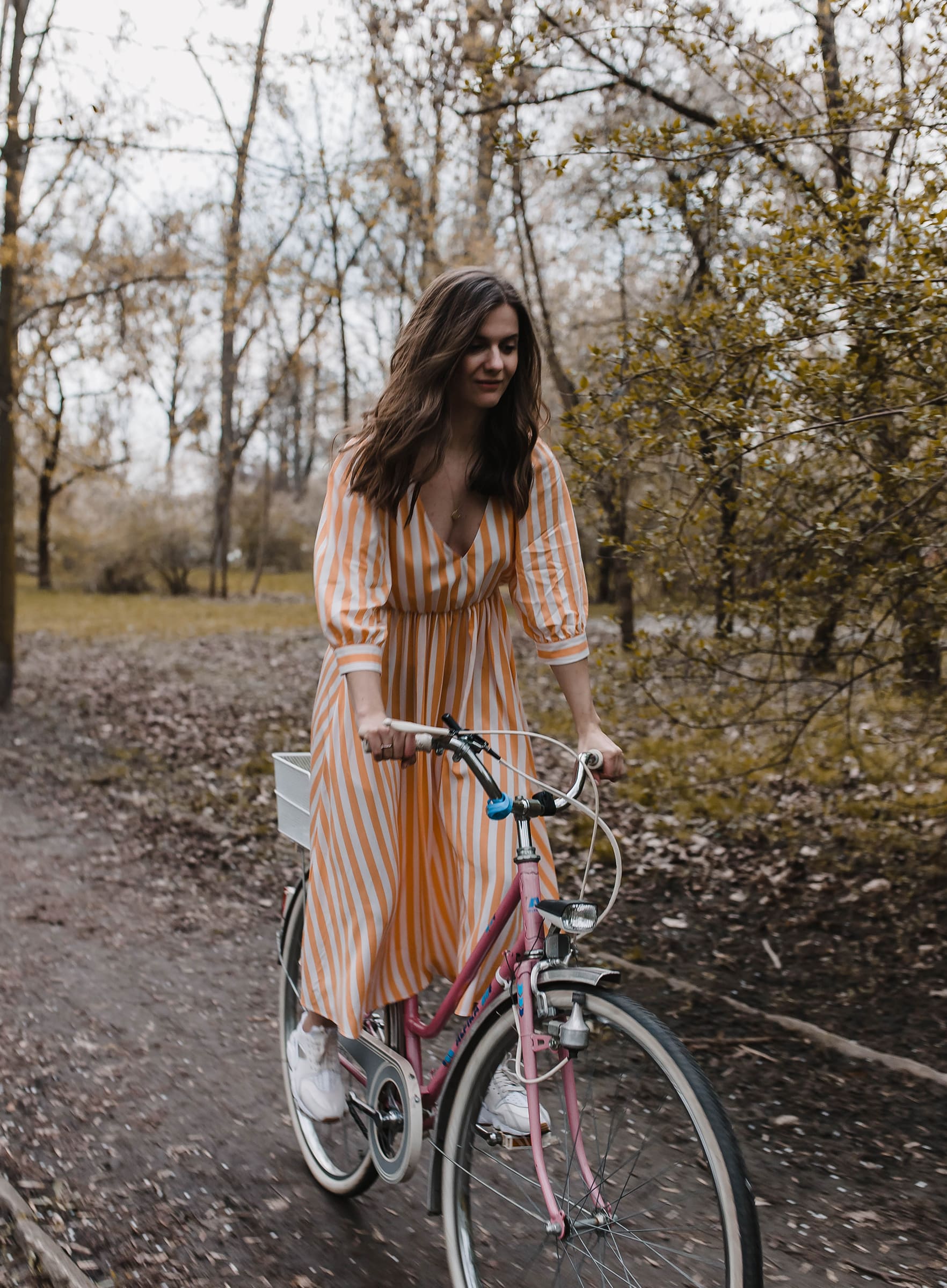 Poste rozwiązania często okazują się najlepsze. Długo rozważaliśmy jaka sukienka powinna powstać z tej tkaniny. Finalnie postawiliśmy na prostą formę, która podkreśli figurę i uwydatni pasiasty wzór. Brzoskwiniowe paski, gumka w pasie i balonowy rękawek delikatnie za łokieć. Do sandałków na obcasie na wieczór, do klasycznych birkenów na dzień.
