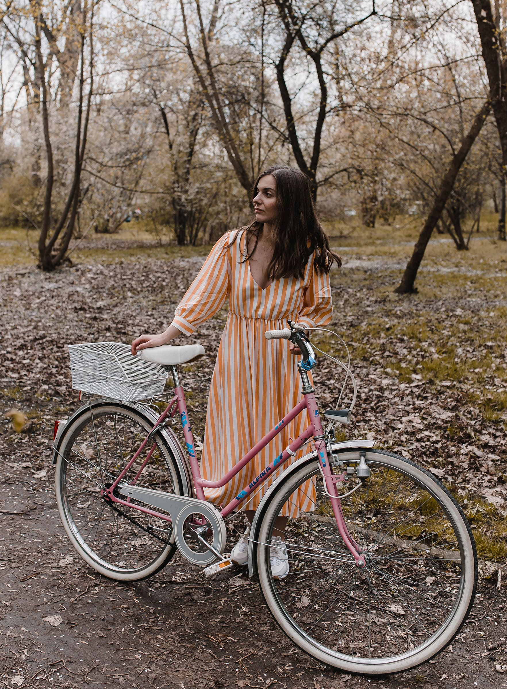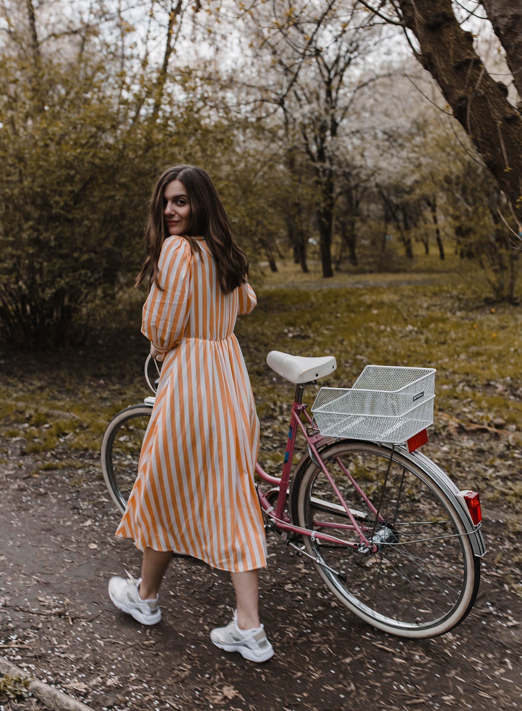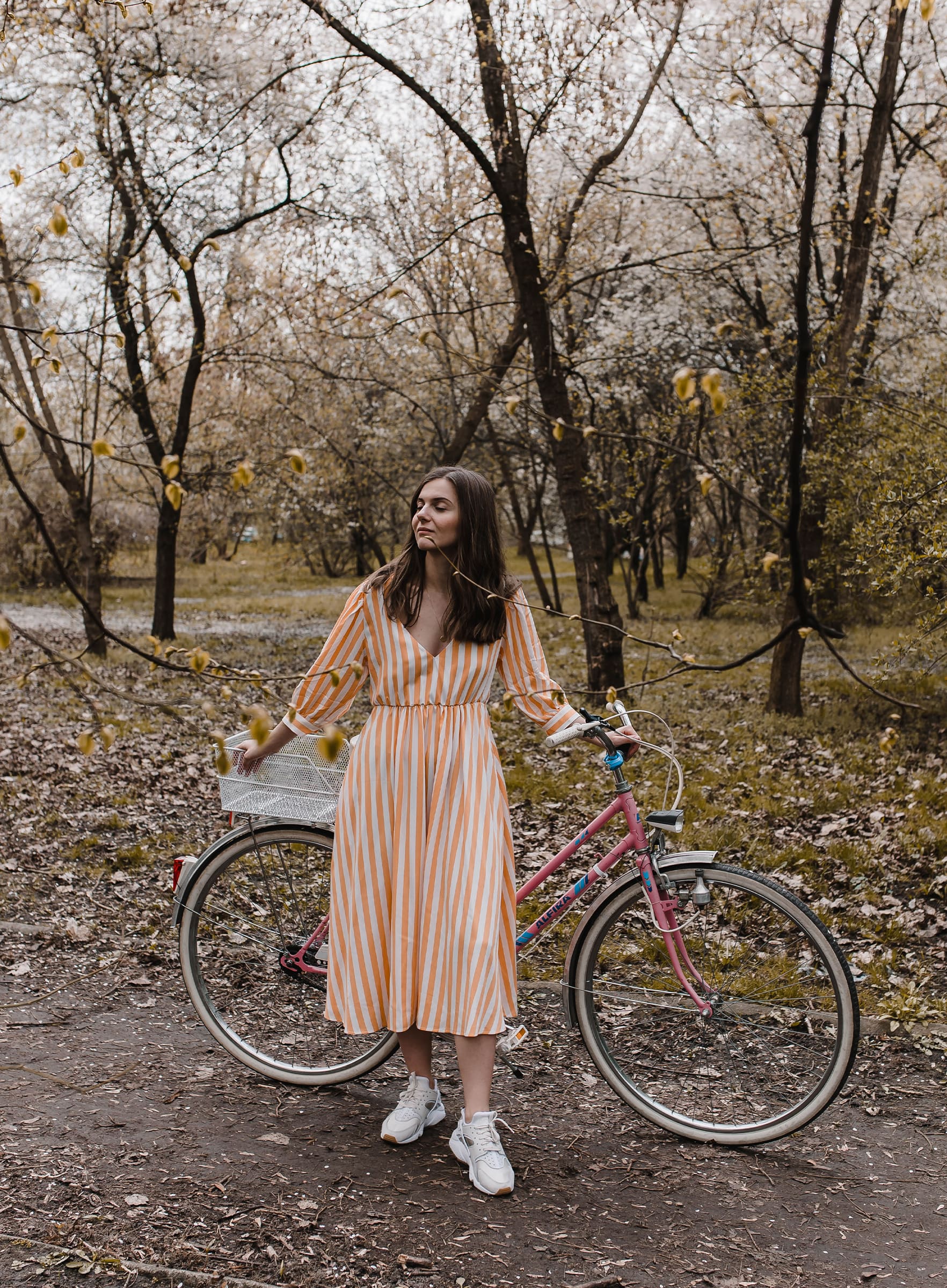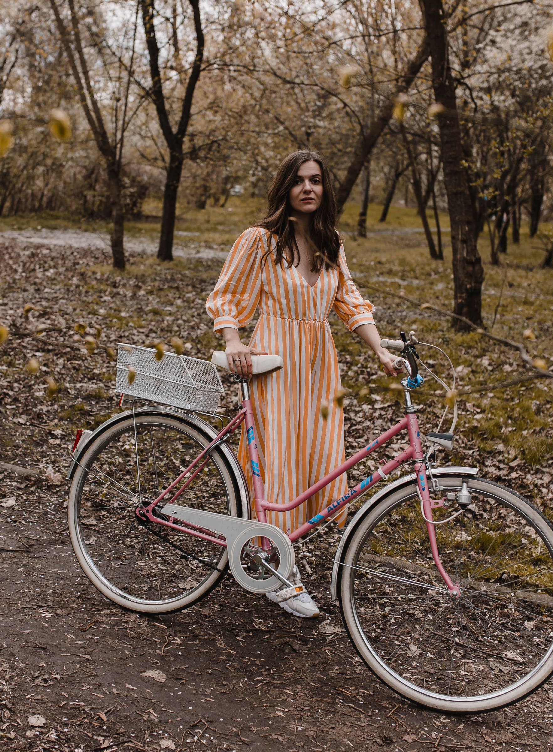 Poste rozwiązania często okazują się najlepsze. Długo rozważaliśmy jaka sukienka powinna powstać z tej tkaniny. Finalnie postawiliśmy na prostą formę, która podkreśli figurę i uwydatni pasiasty wzór. Brzoskwiniowe paski, gumka w pasie i balonowy rękawek delikatnie za łokieć. Do sandałków na obcasie na wieczór, do klasycznych birkenów na dzień.