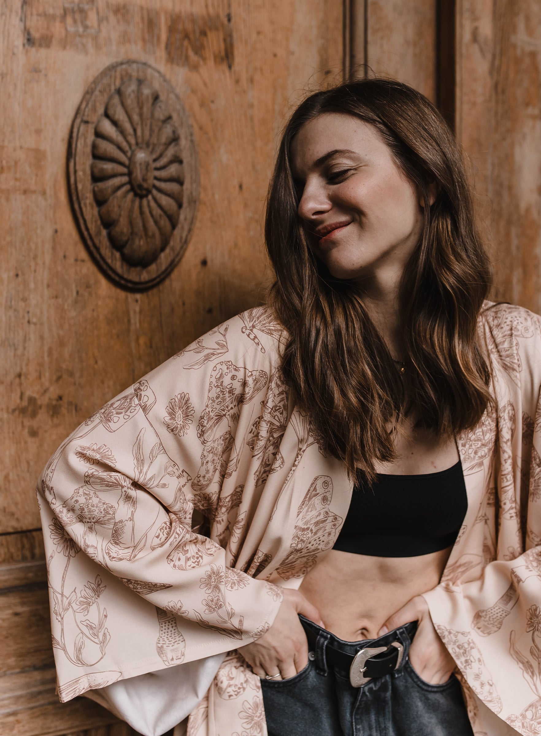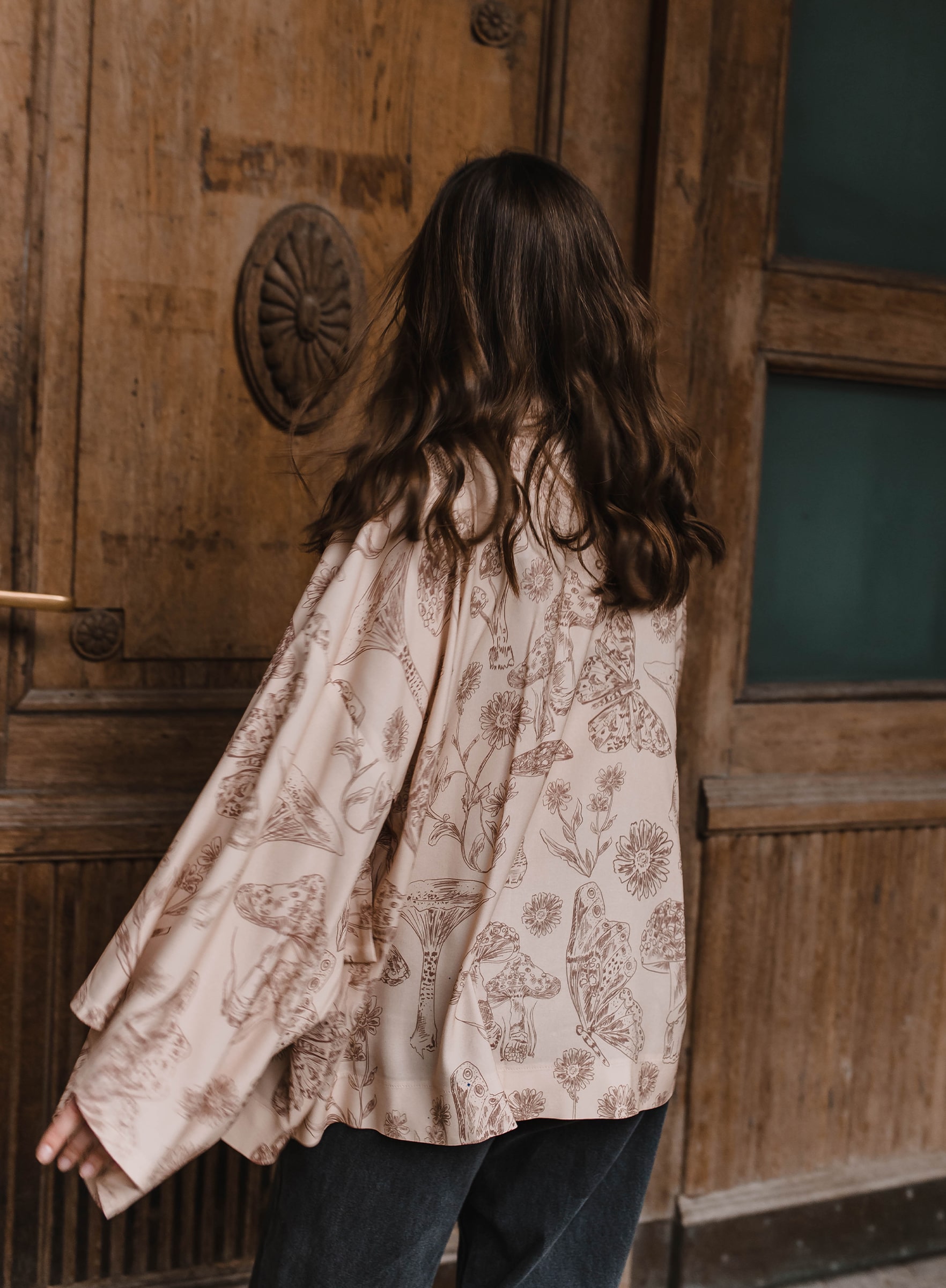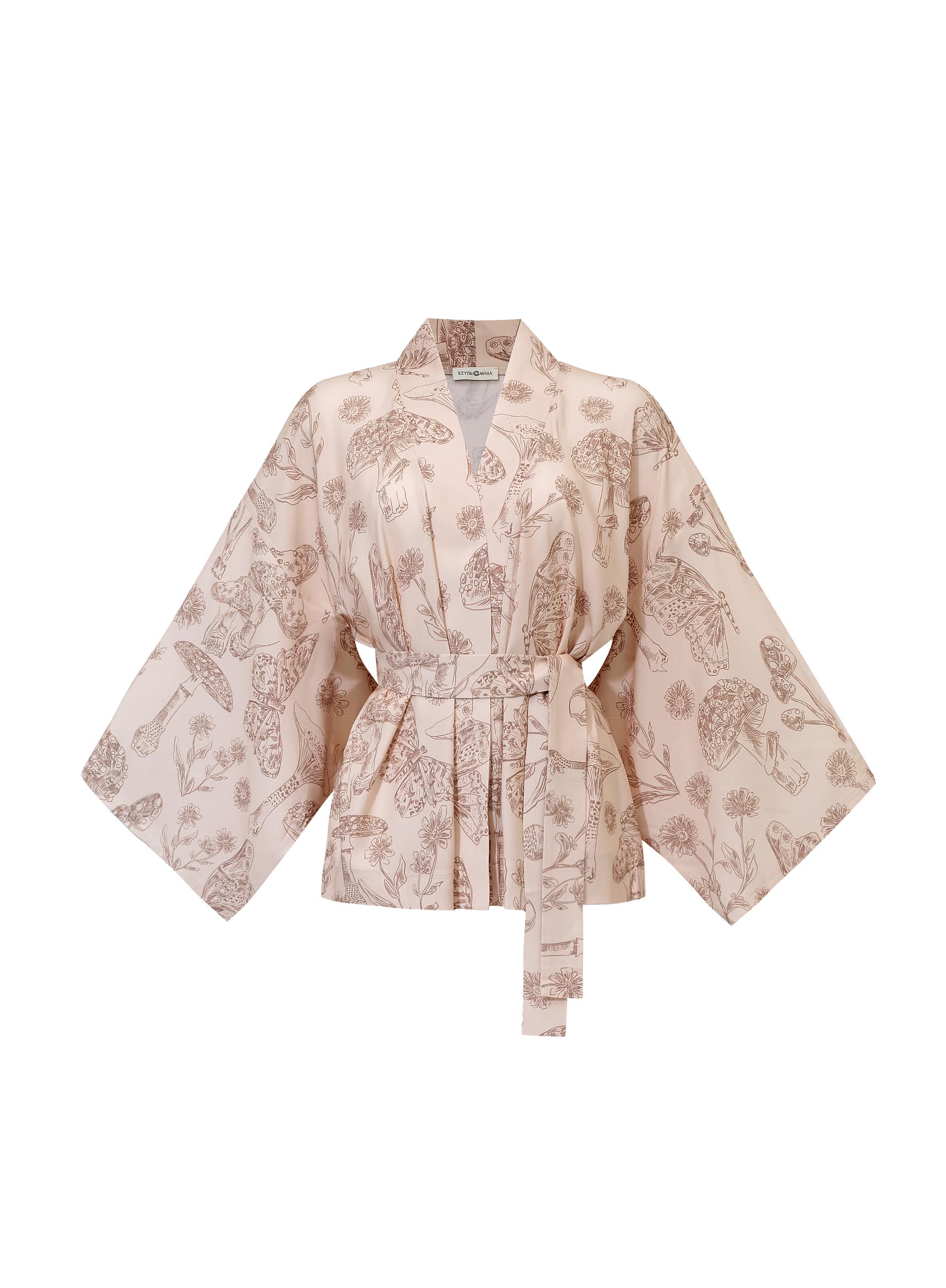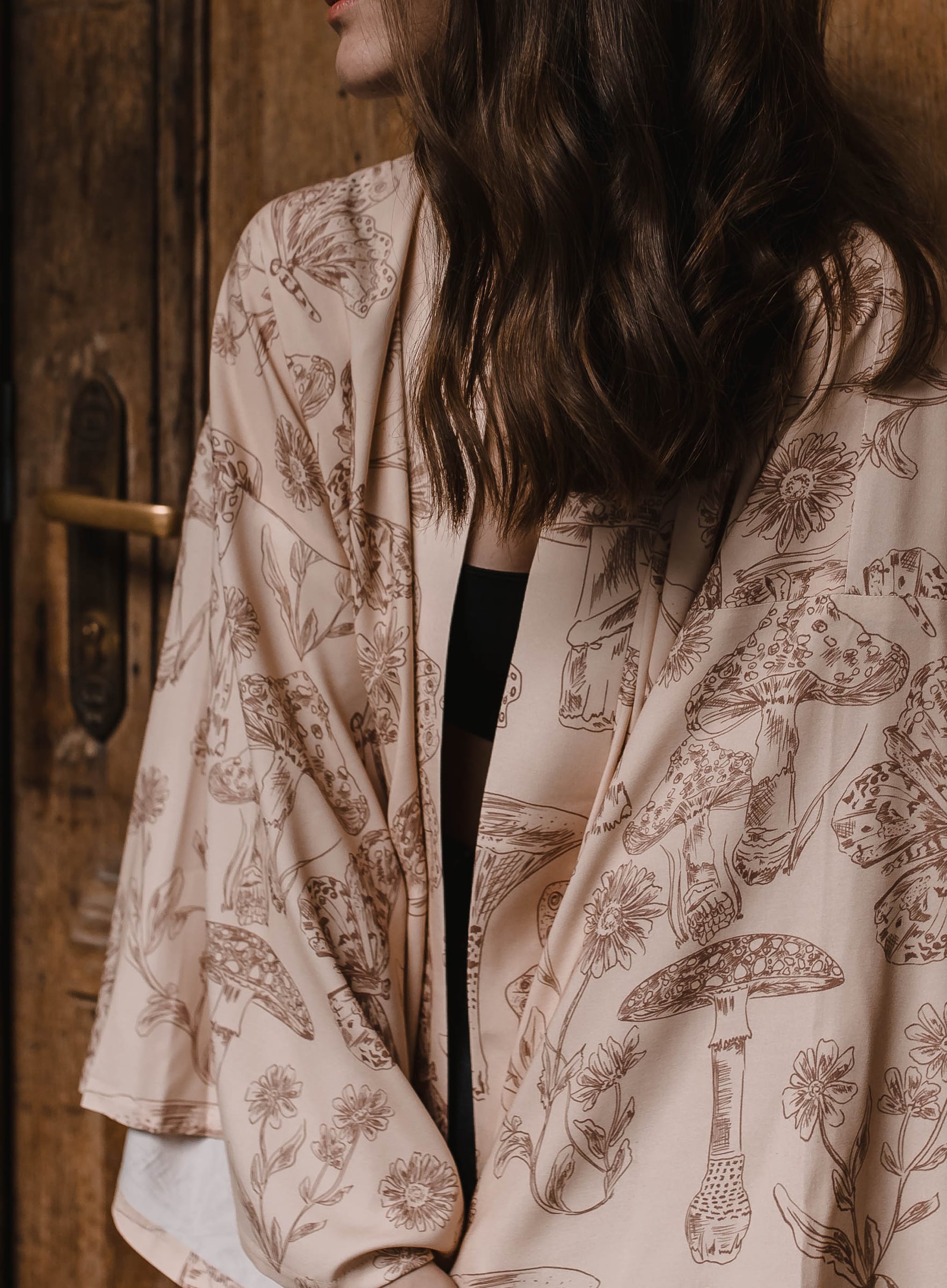 Krótsza wersja grzybkowego kimona, do noszenia jako bluzka (z paskiem) albo narzutka (bez paska). Uszyliśmy je z beżowej tkaniny w grzybki. Fajnie wygląda z grantowymi jeansami (i bez jeansów też). Koniecznie spakuj na wakacje.