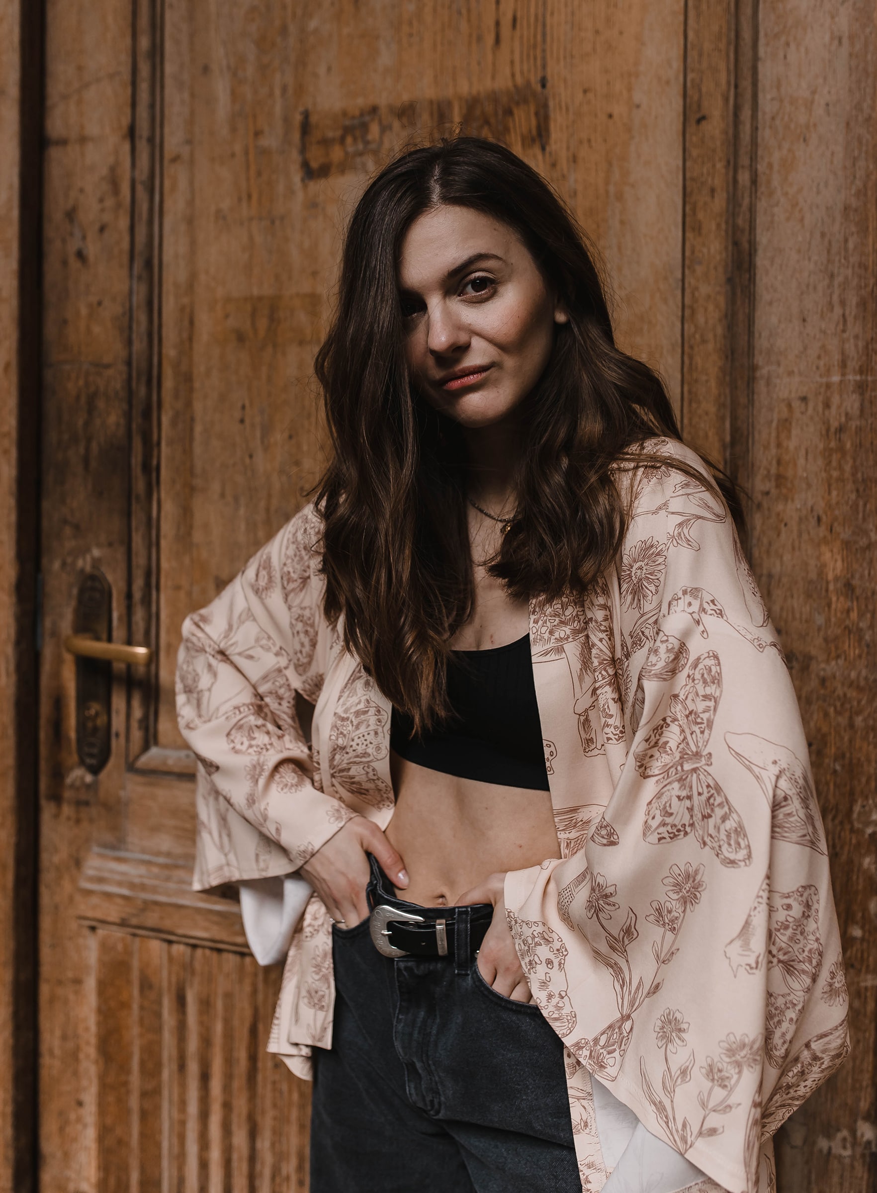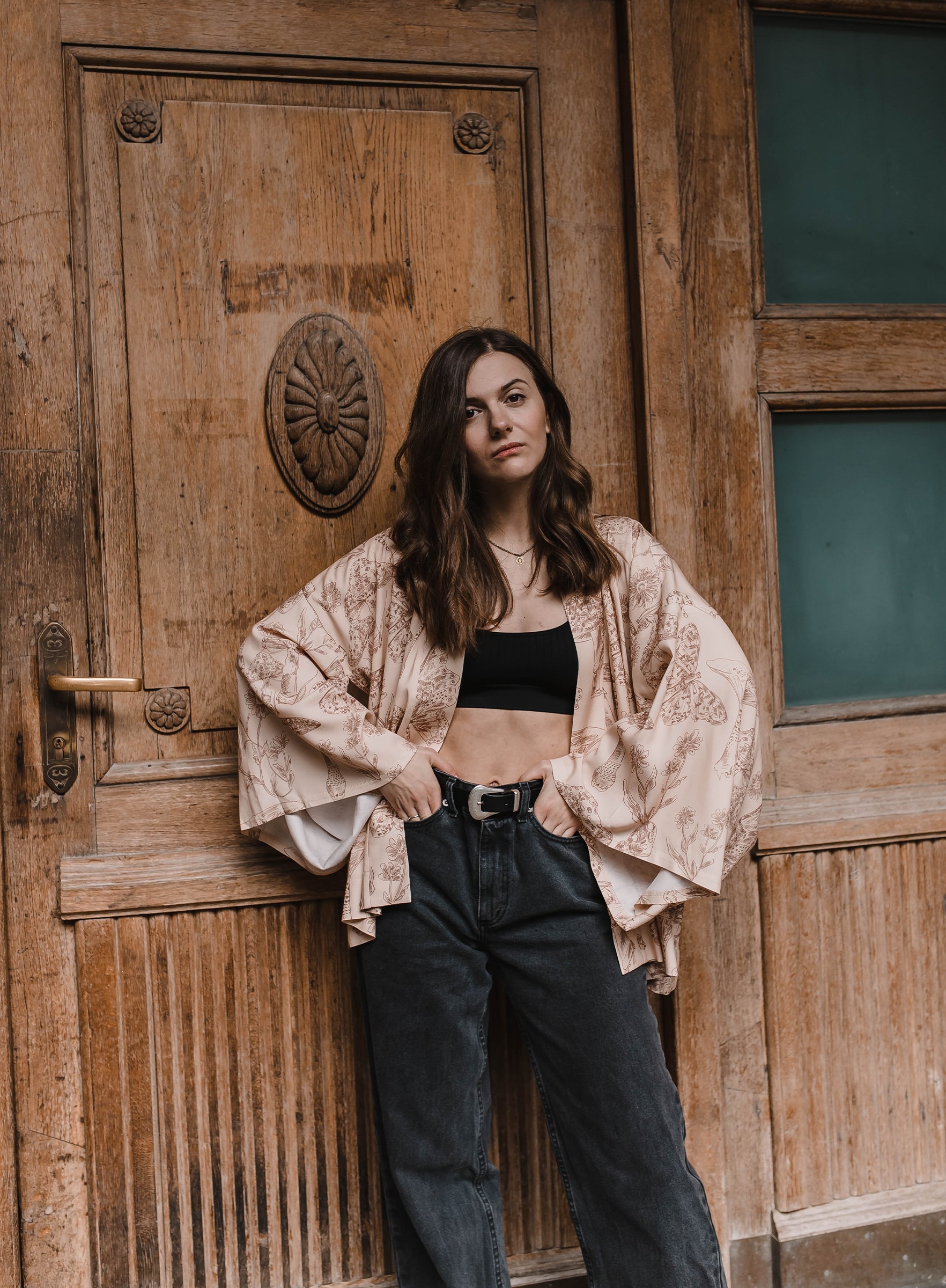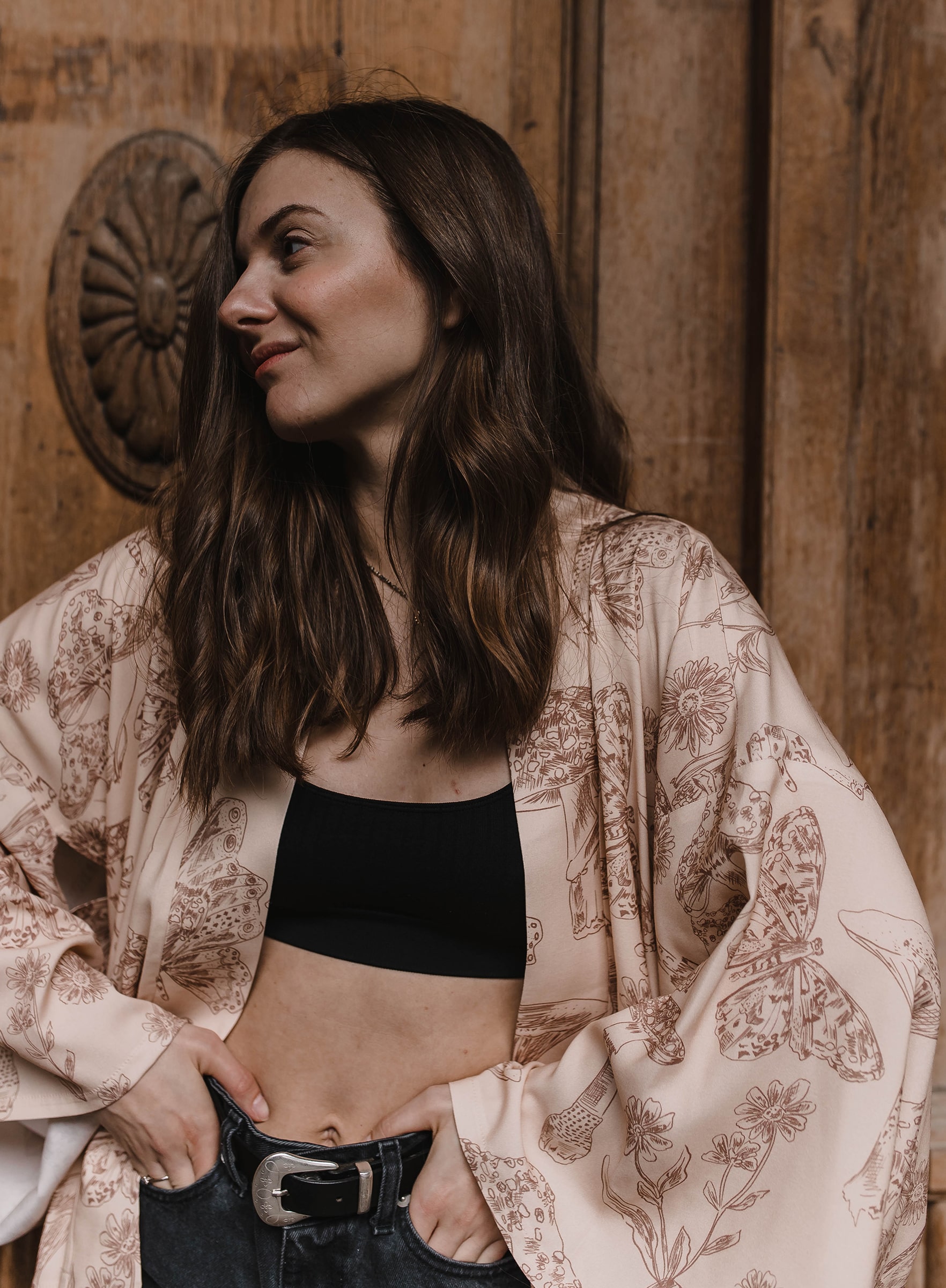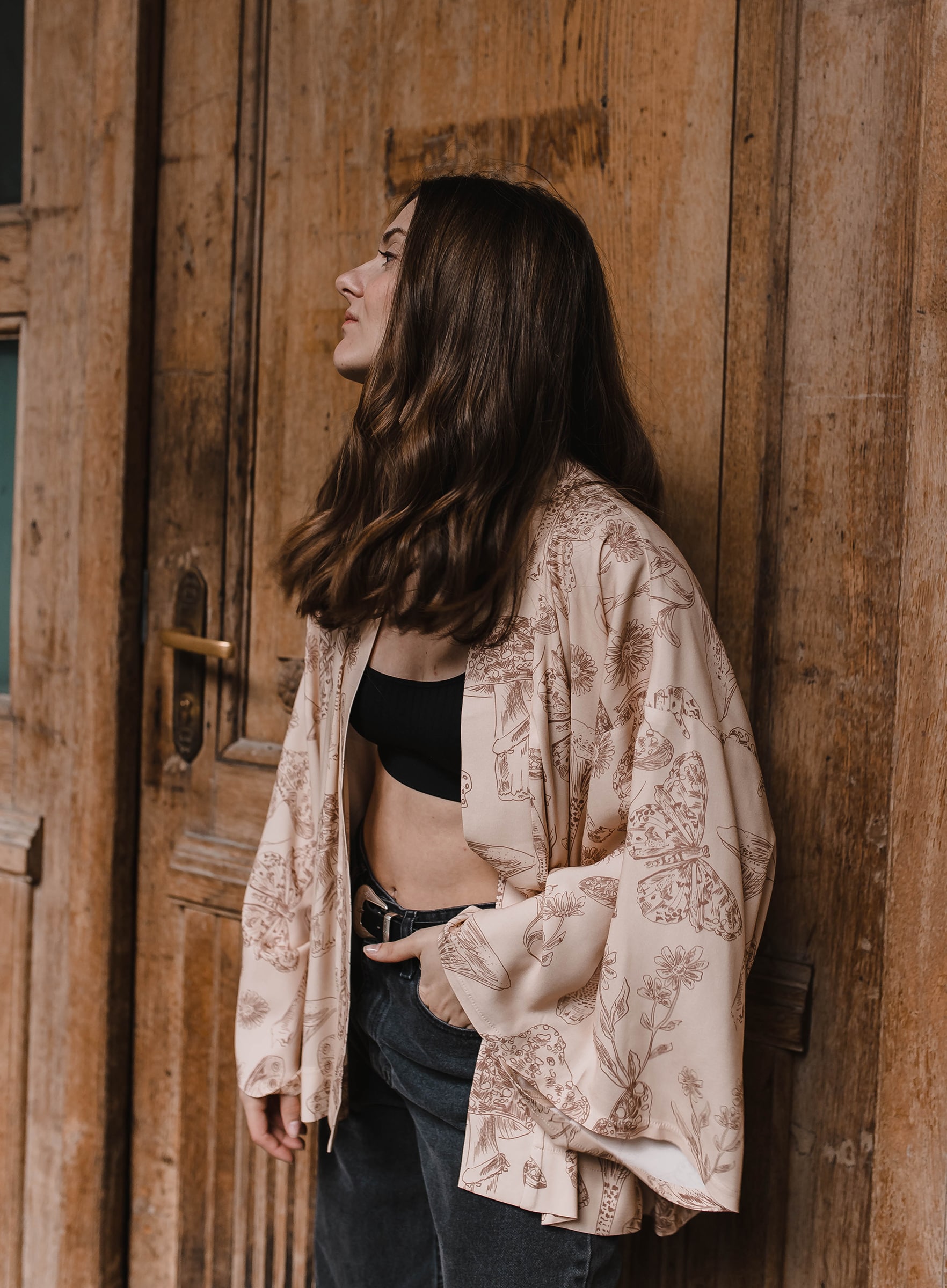 Krótsza wersja grzybkowego kimona, do noszenia jako bluzka (z paskiem) albo narzutka (bez paska). Uszyliśmy je z beżowej tkaniny w grzybki. Fajnie wygląda z grantowymi jeansami (i bez jeansów też). Koniecznie spakuj na wakacje.
