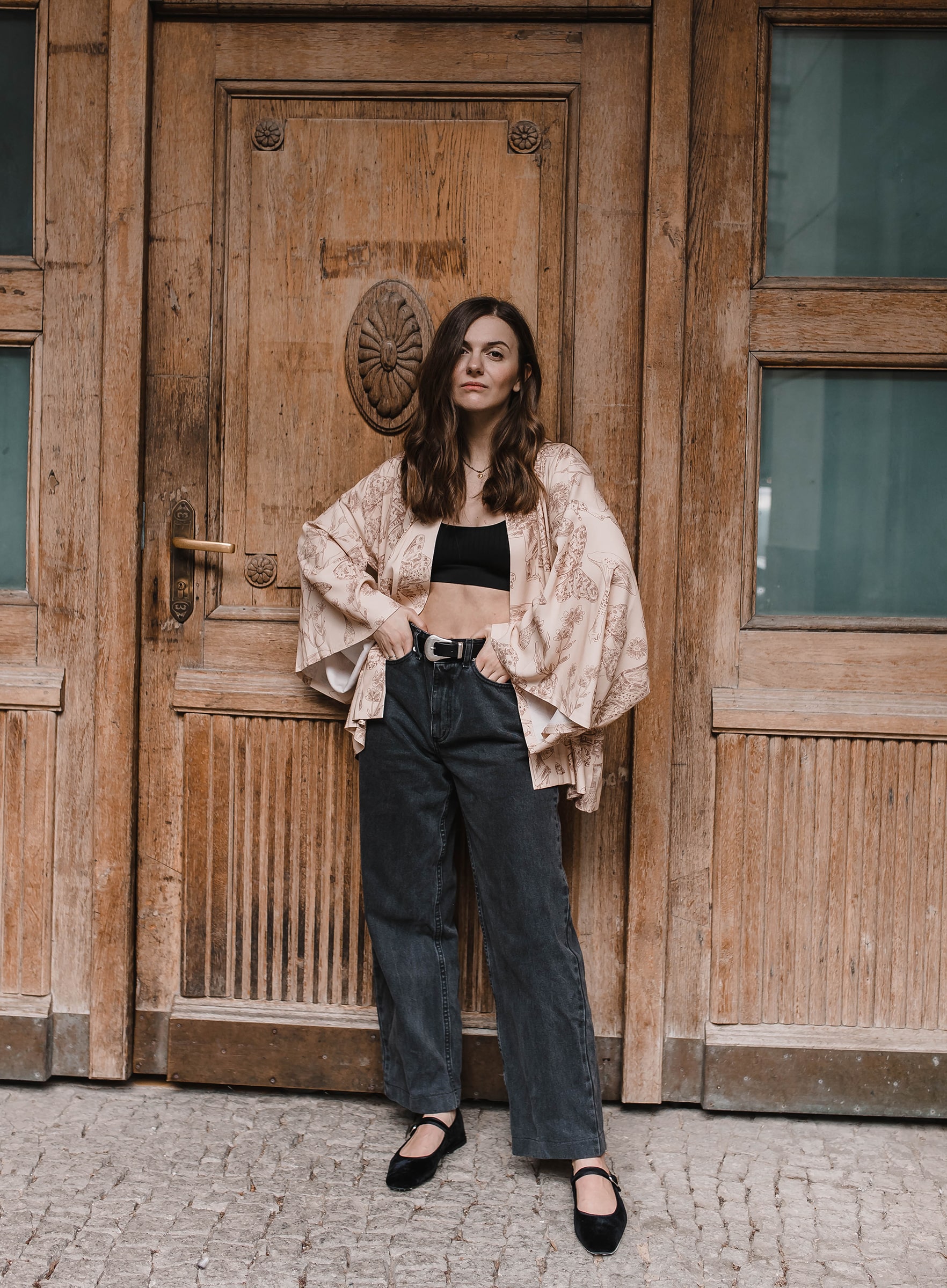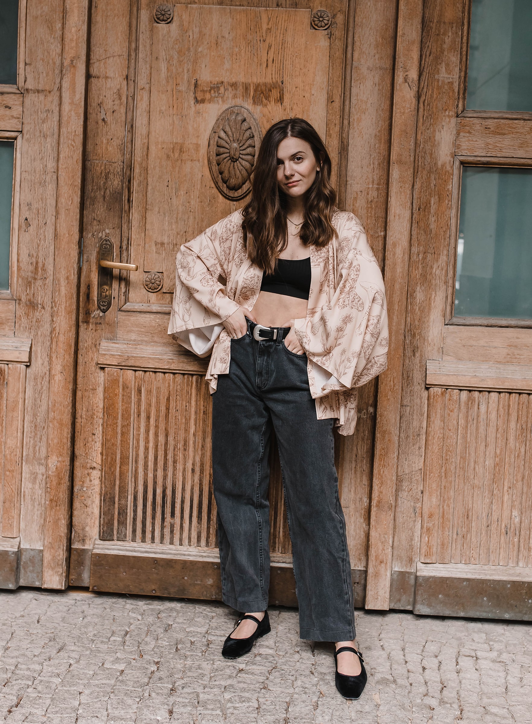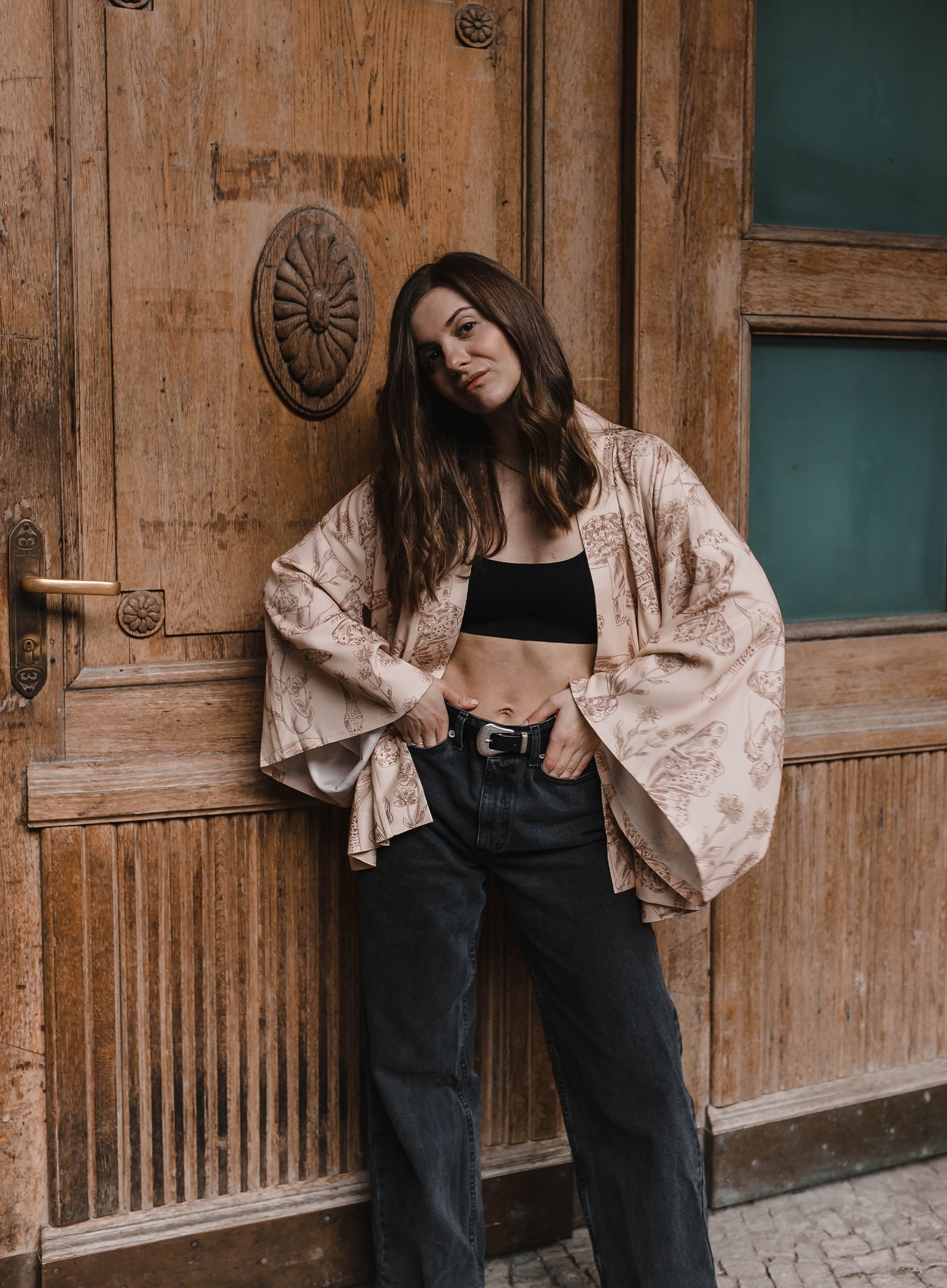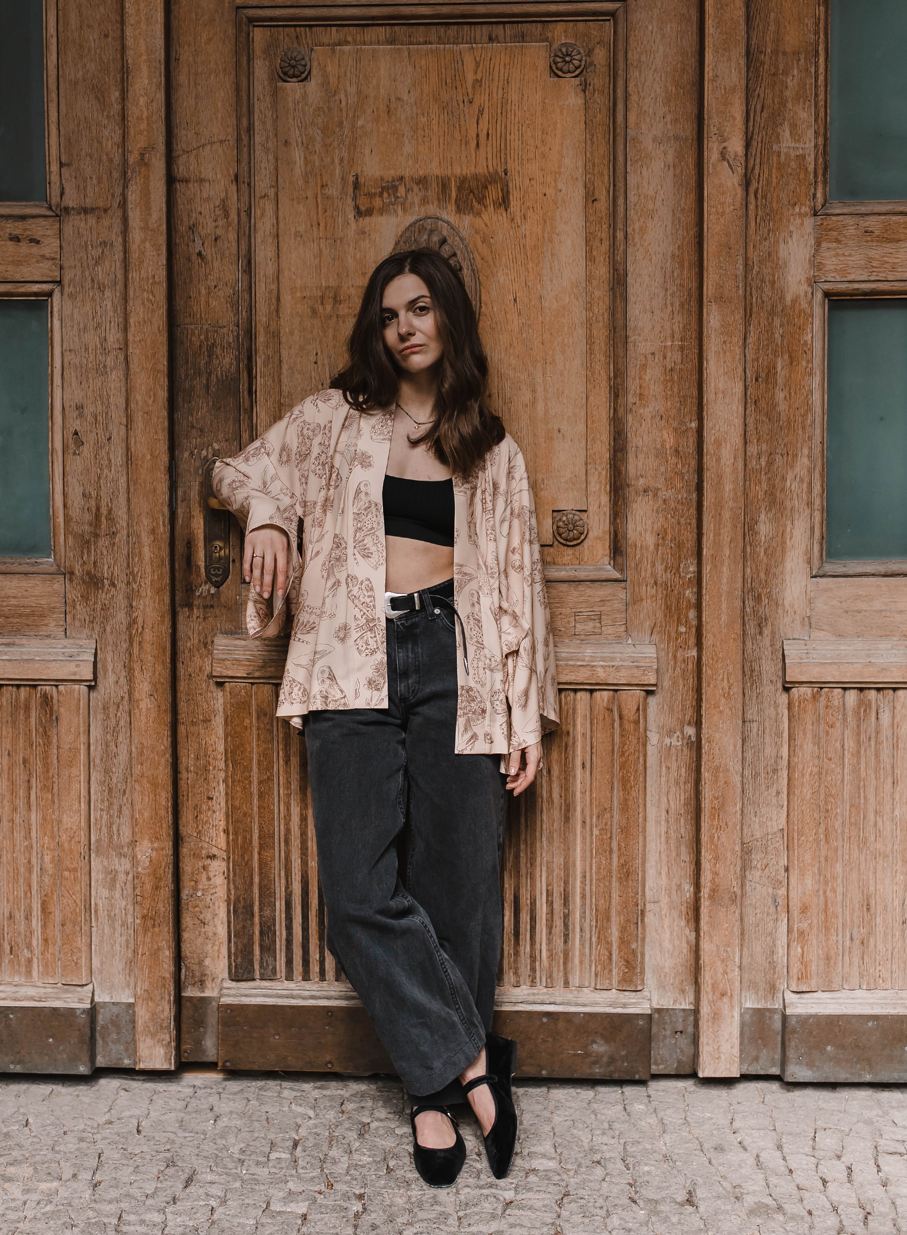 Krótsza wersja grzybkowego kimona, do noszenia jako bluzka (z paskiem) albo narzutka (bez paska). Uszyliśmy je z beżowej tkaniny w grzybki. Fajnie wygląda z grantowymi jeansami (i bez jeansów też). Koniecznie spakuj na wakacje.