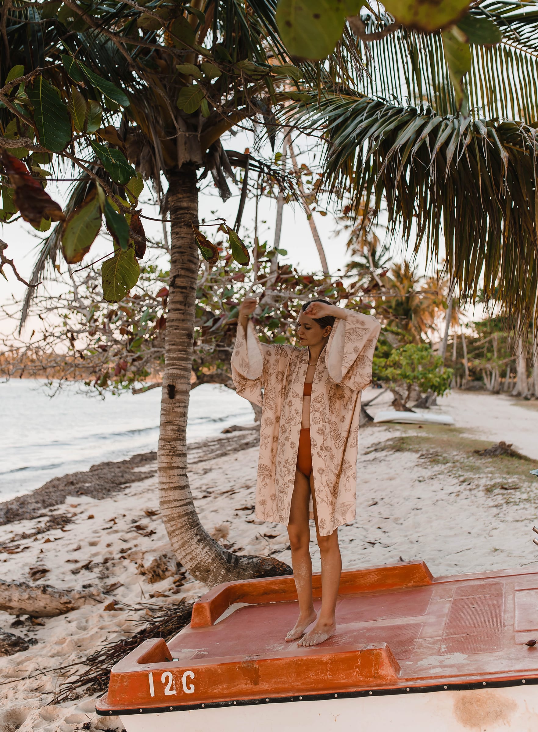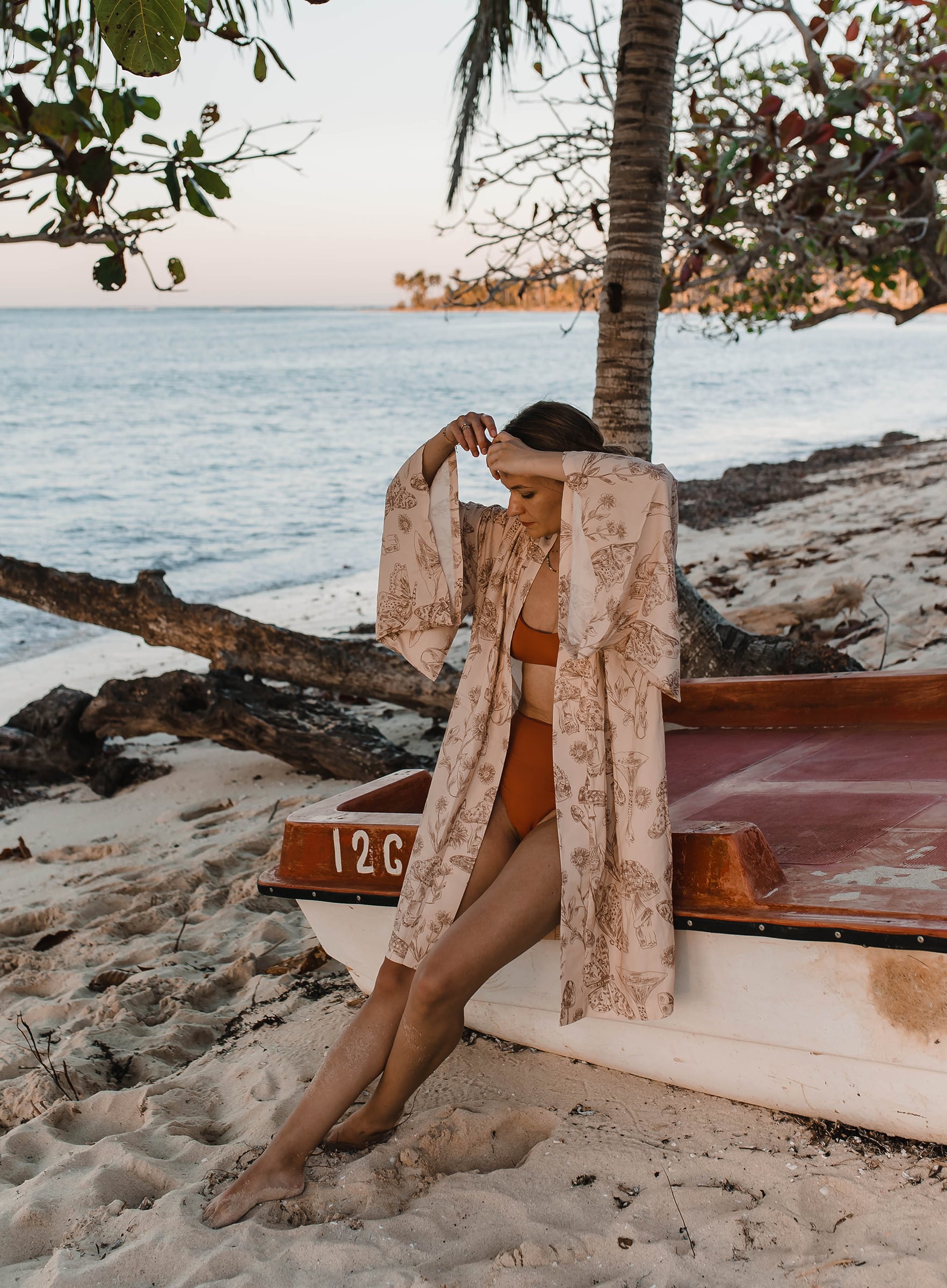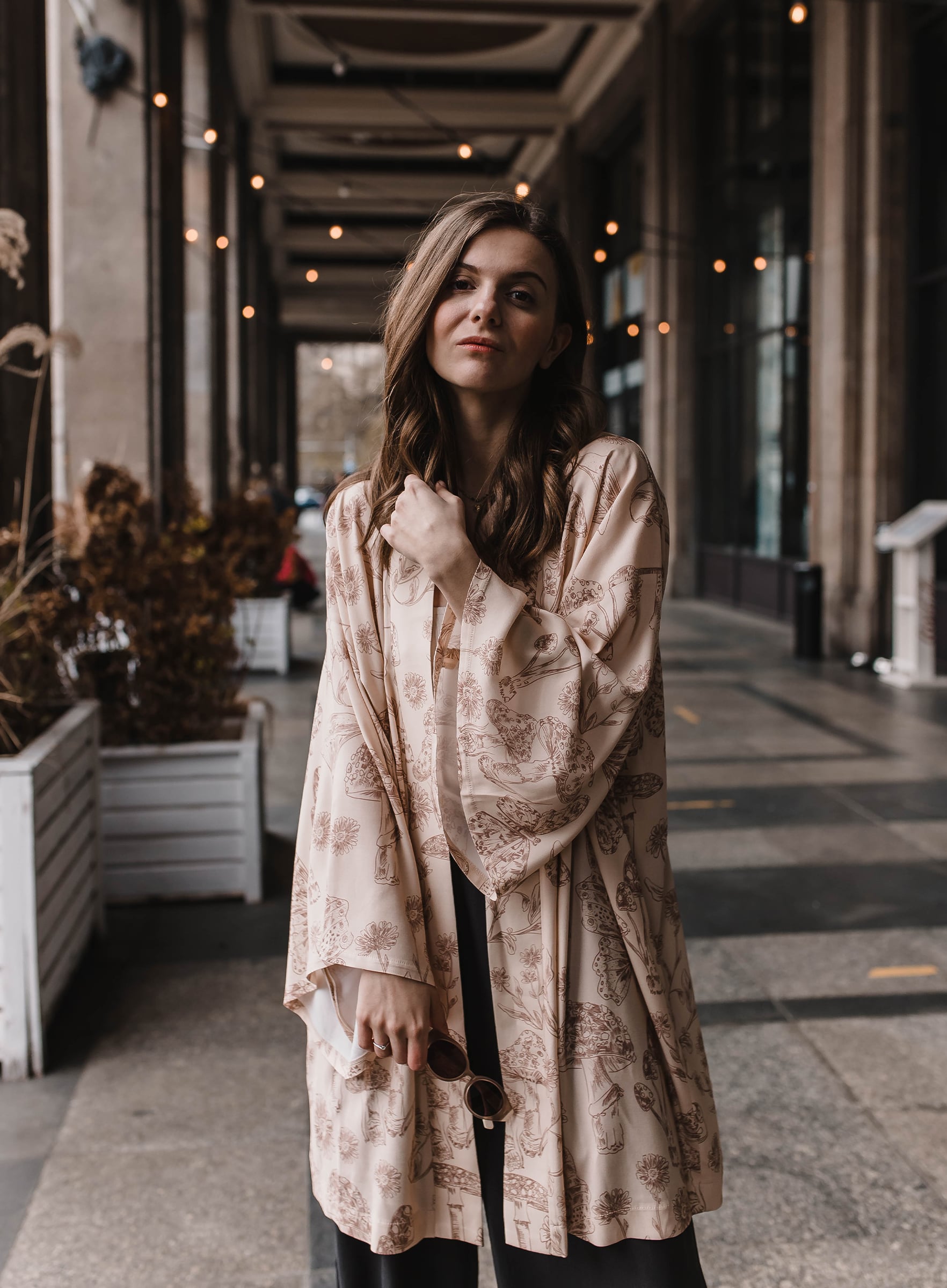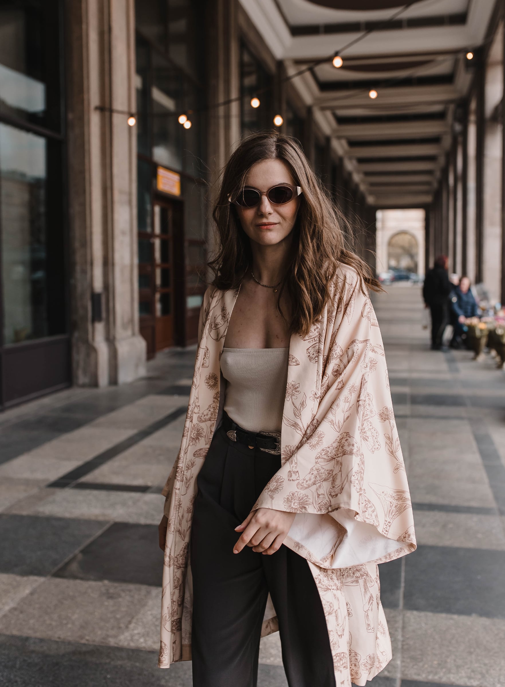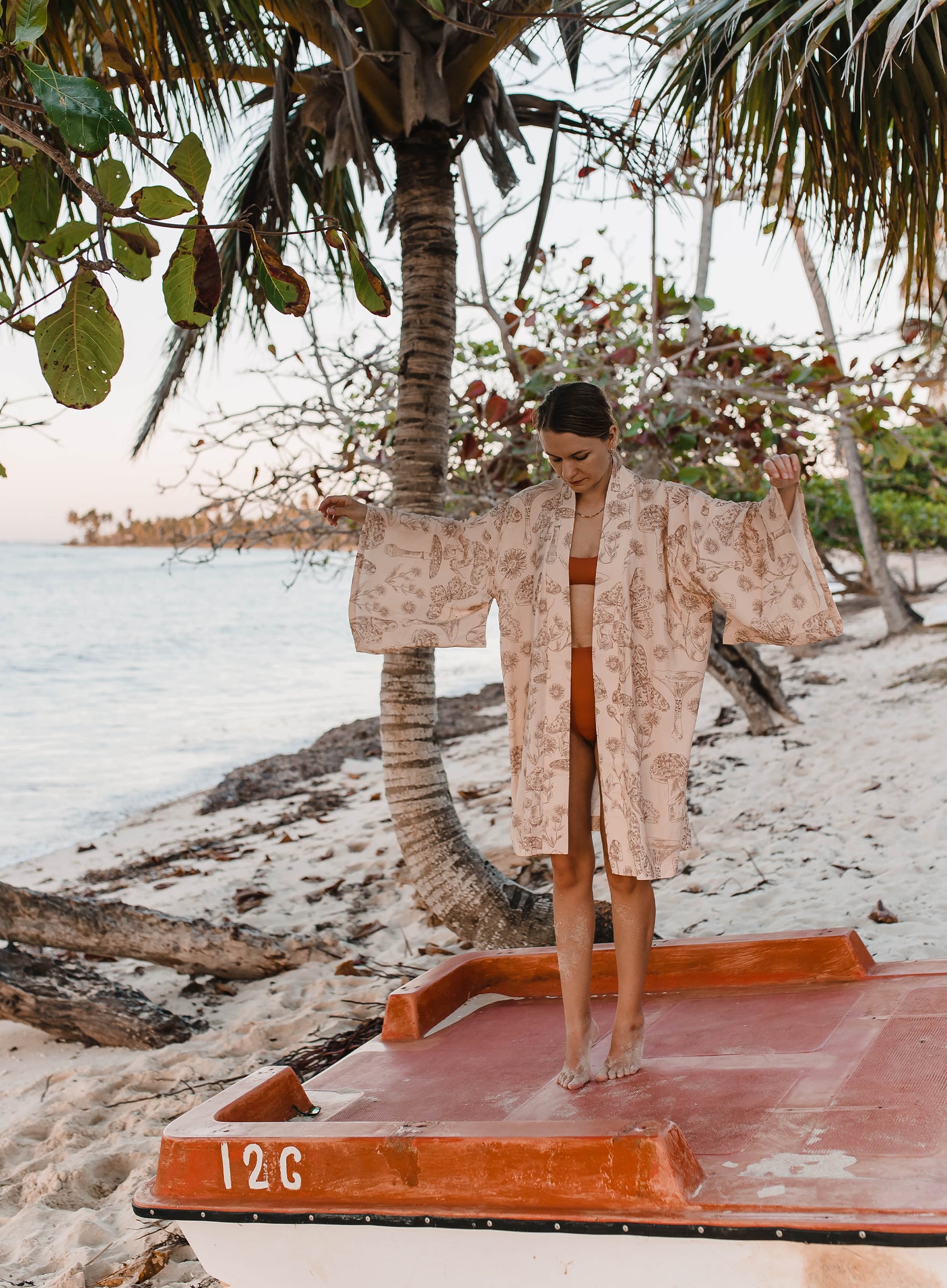 Kimono czy sukienka? Wybierz sama. Nasze nowe kimono uszyliśmy z beżowej tkaniny w grzybki. Trzy ruchy paskiem i kimono zamienia się w sukienkę. Fajnie wygląda z grantowymi jeansami (i bez jeansów też). Koniecznie spakuj na wakacje.