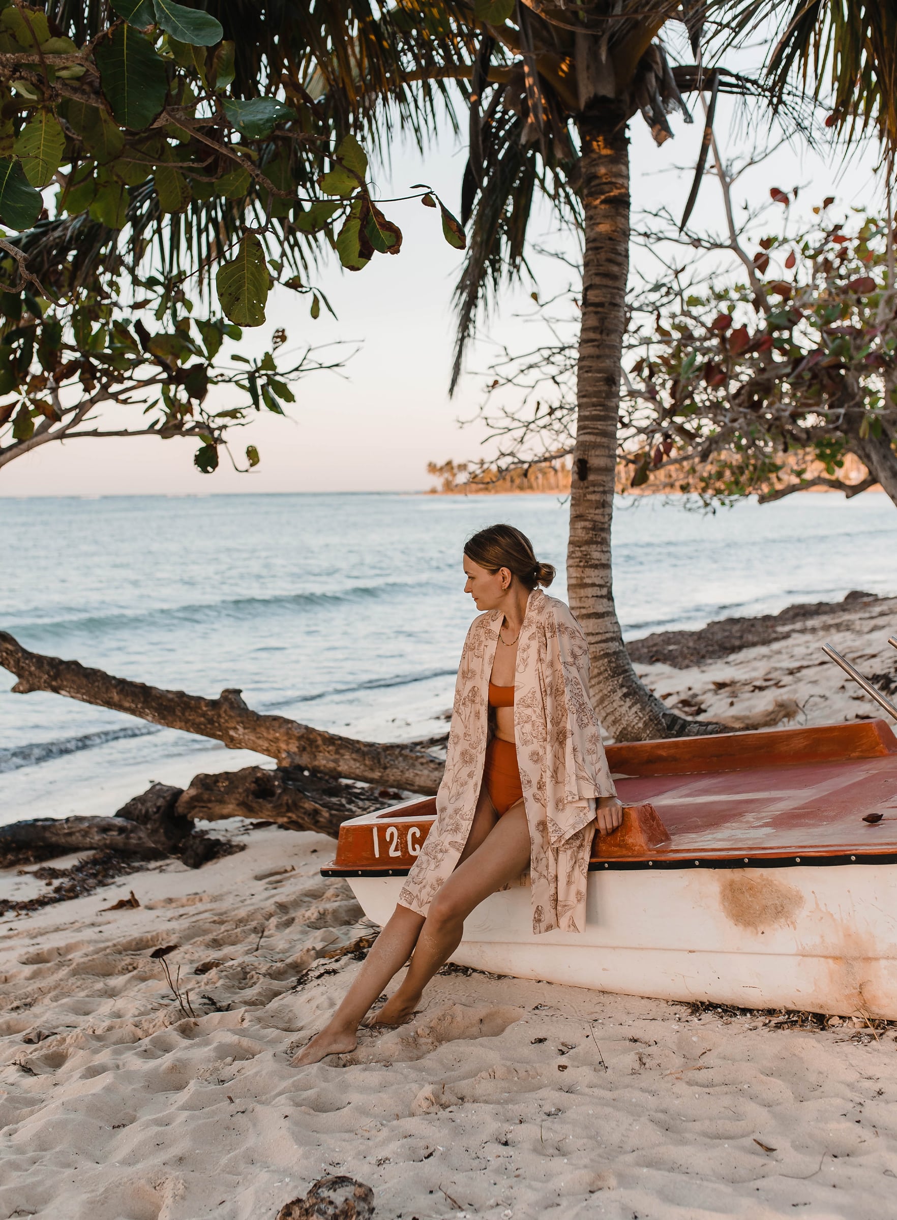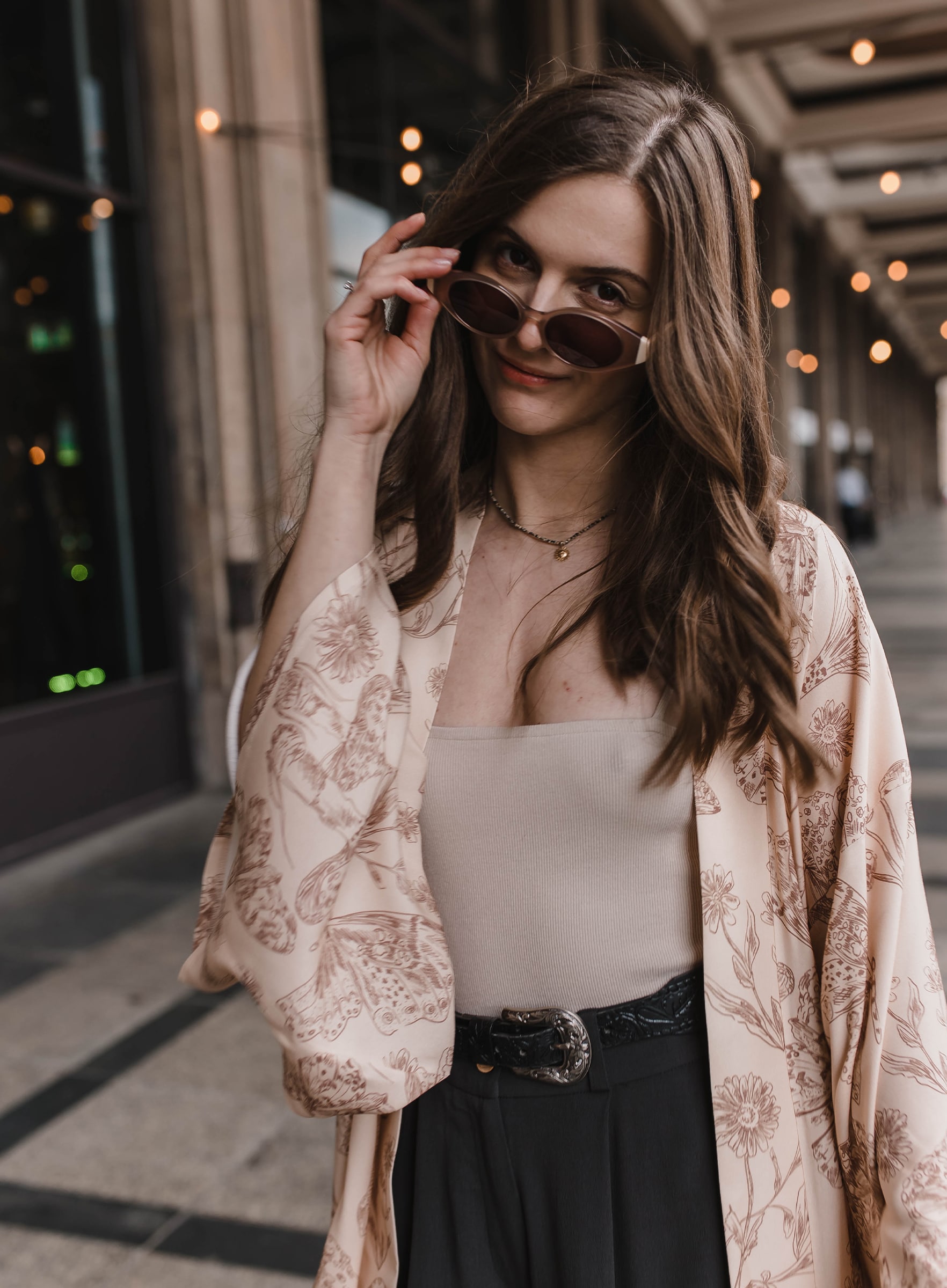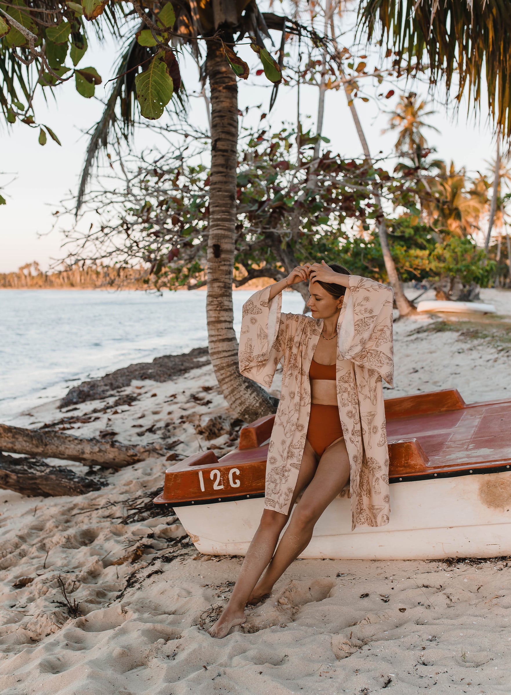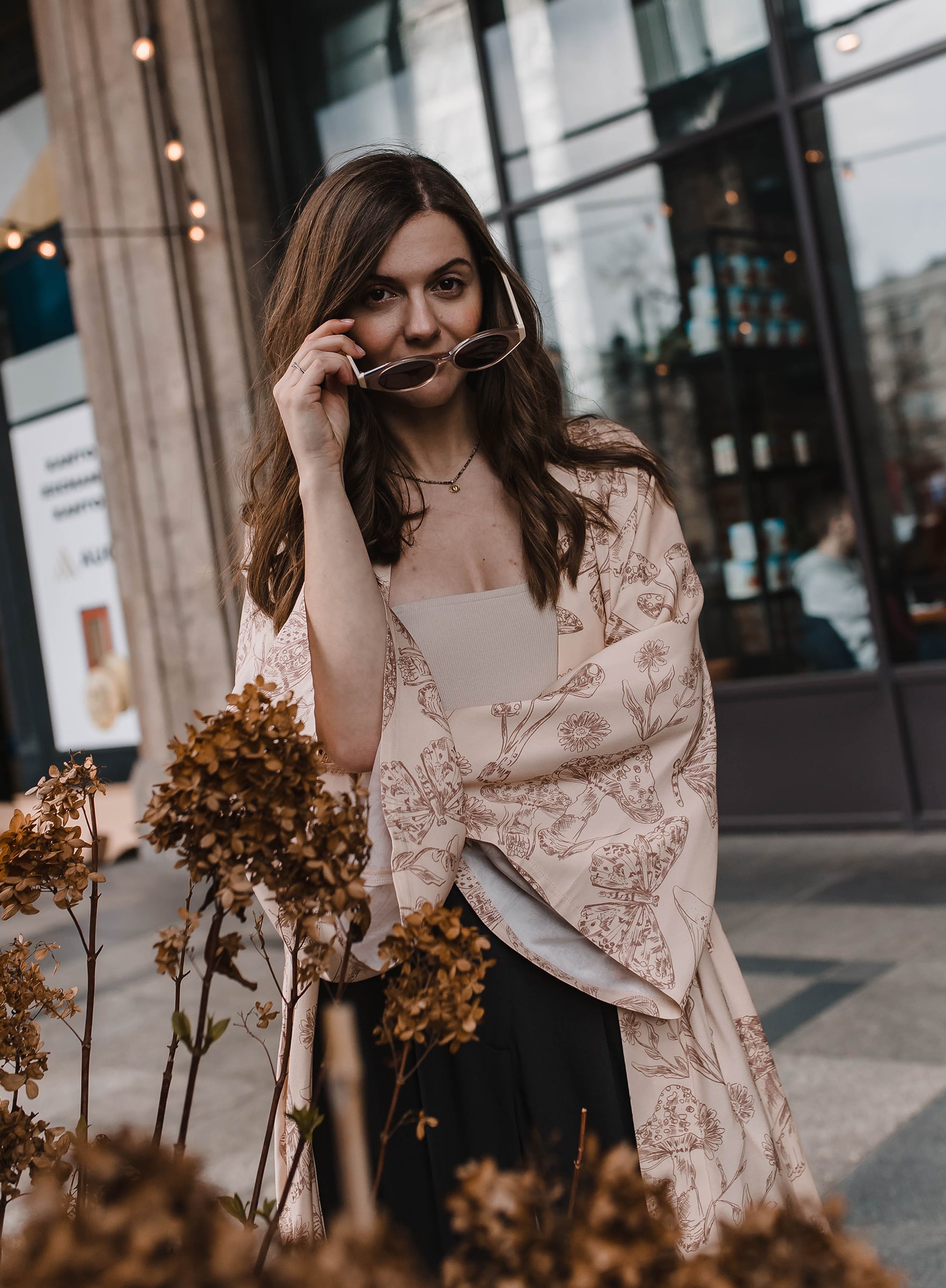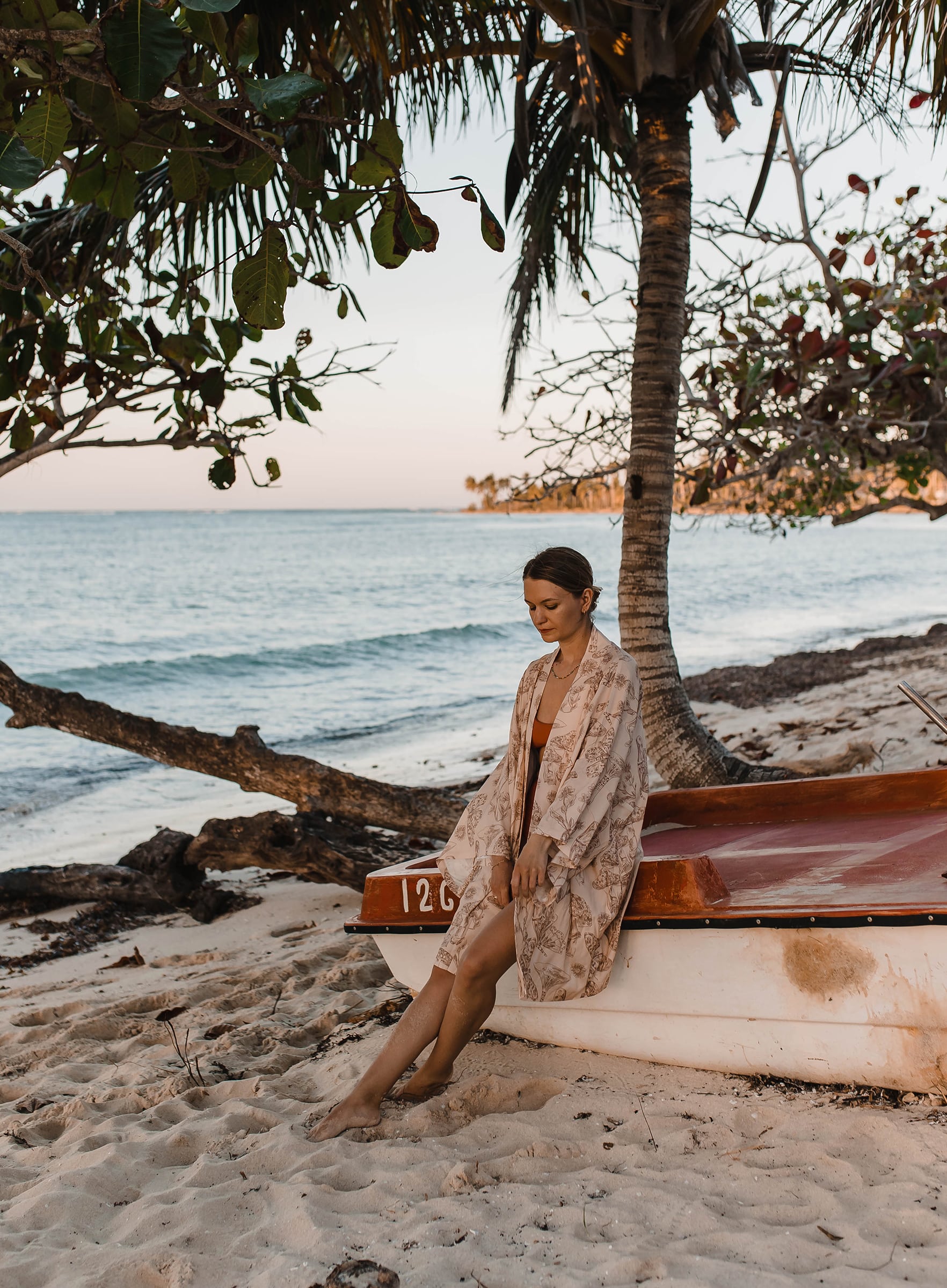 Kimono czy sukienka? Wybierz sama. Nasze nowe kimono uszyliśmy z beżowej tkaniny w grzybki. Trzy ruchy paskiem i kimono zamienia się w sukienkę. Fajnie wygląda z grantowymi jeansami (i bez jeansów też). Koniecznie spakuj na wakacje.