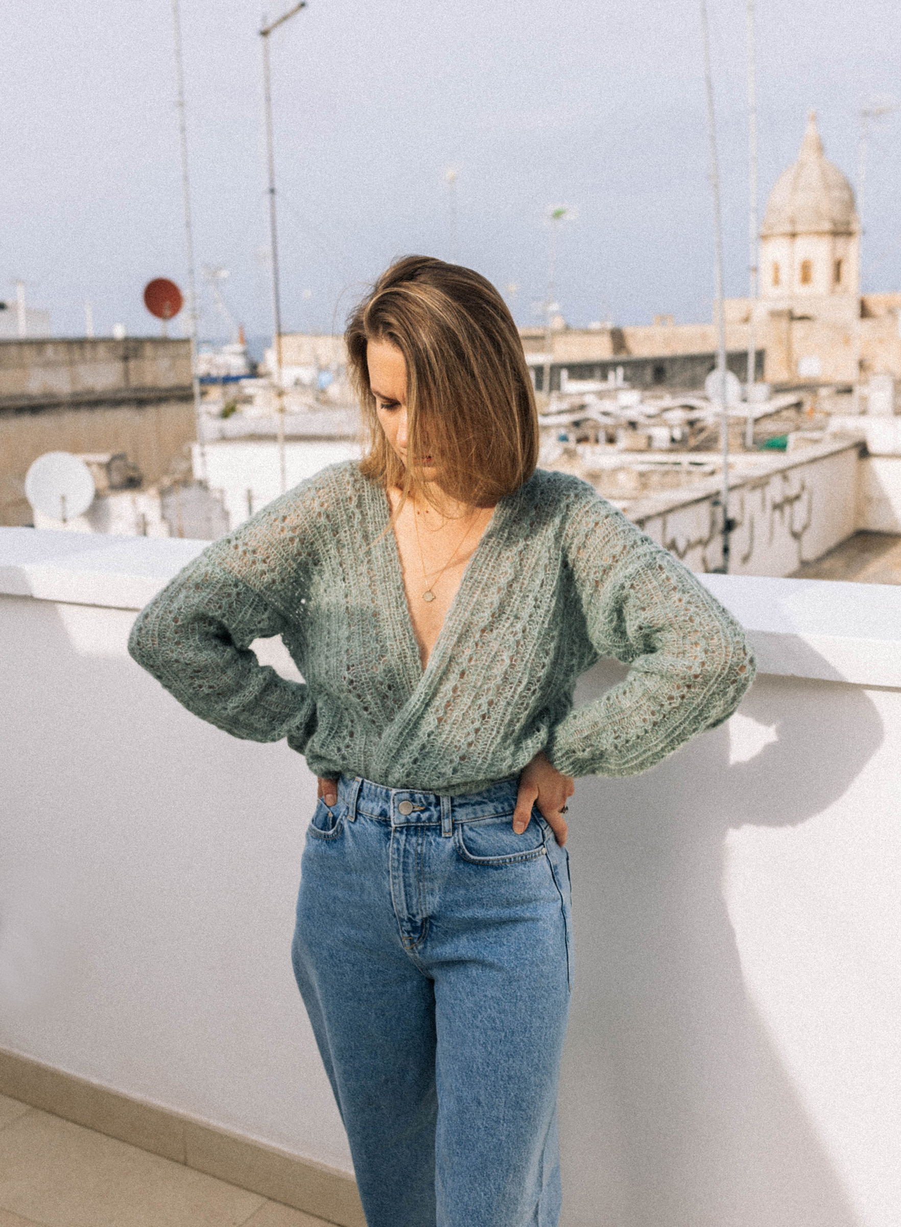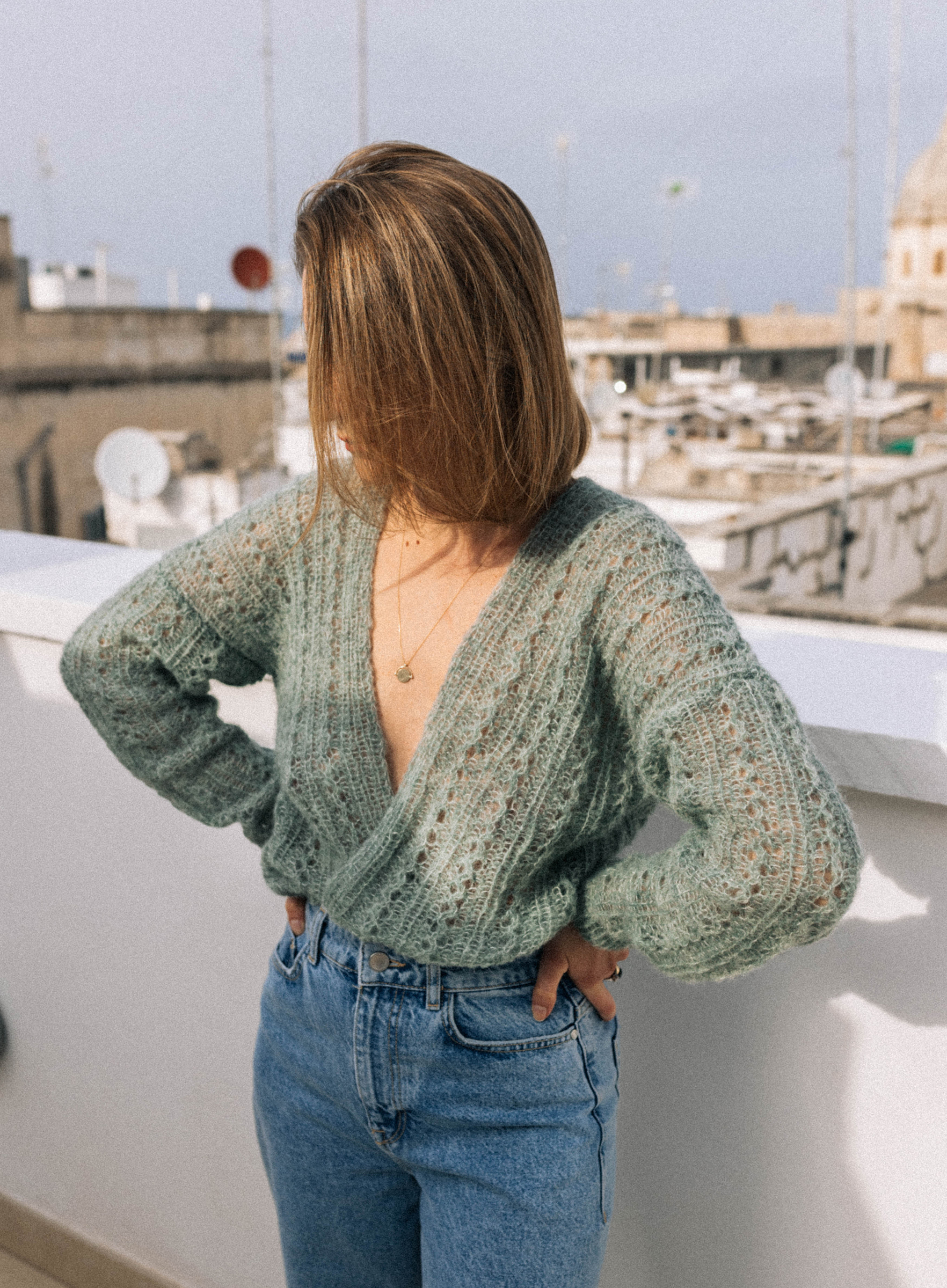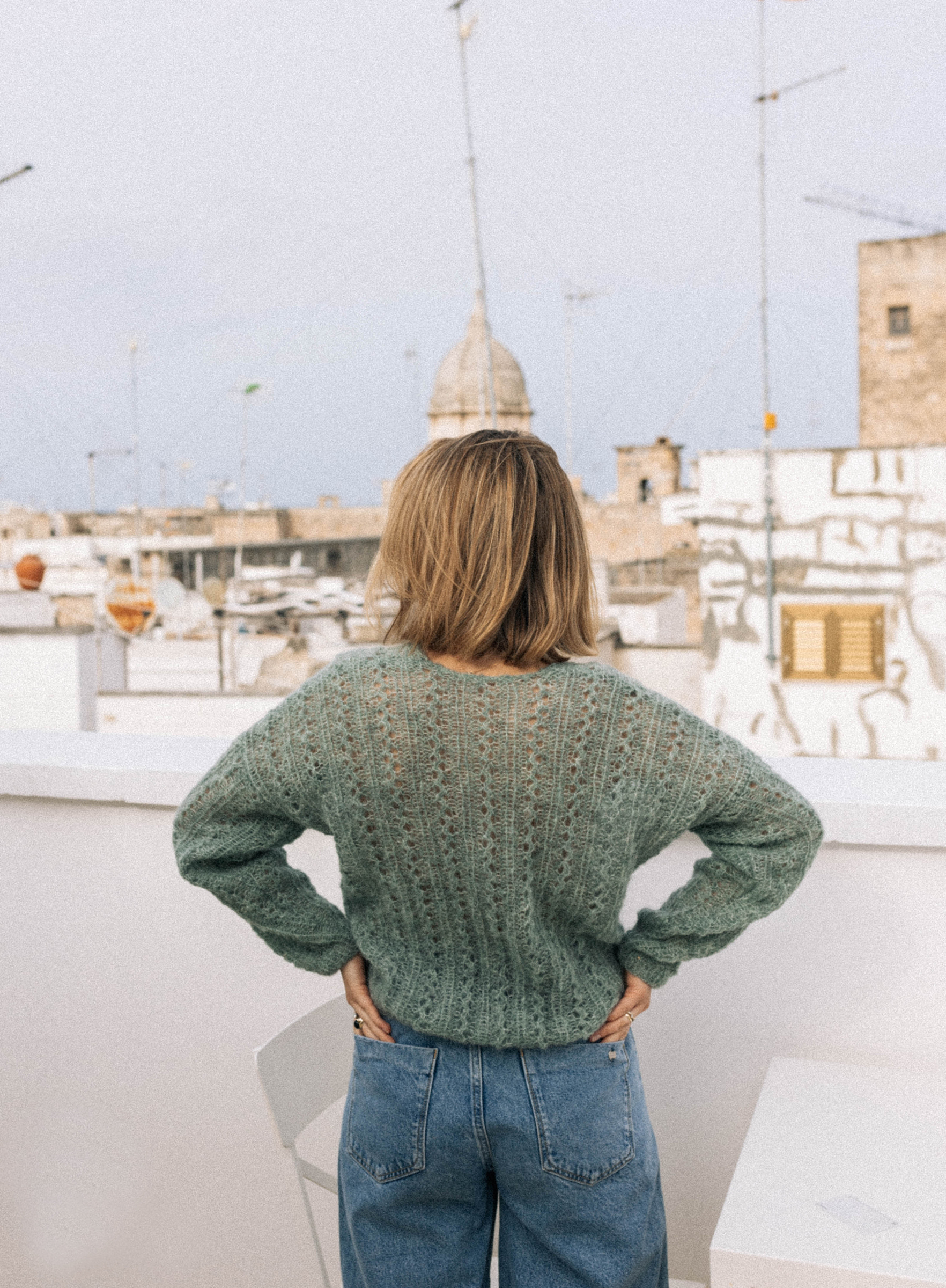 Ażurowy kardigan bez zapięcia, wykonany ręcznie z włóczki z alpaki i jedwabiu. Wydziergany ściegiem fantazyjnym i wykończony ściągaczem.