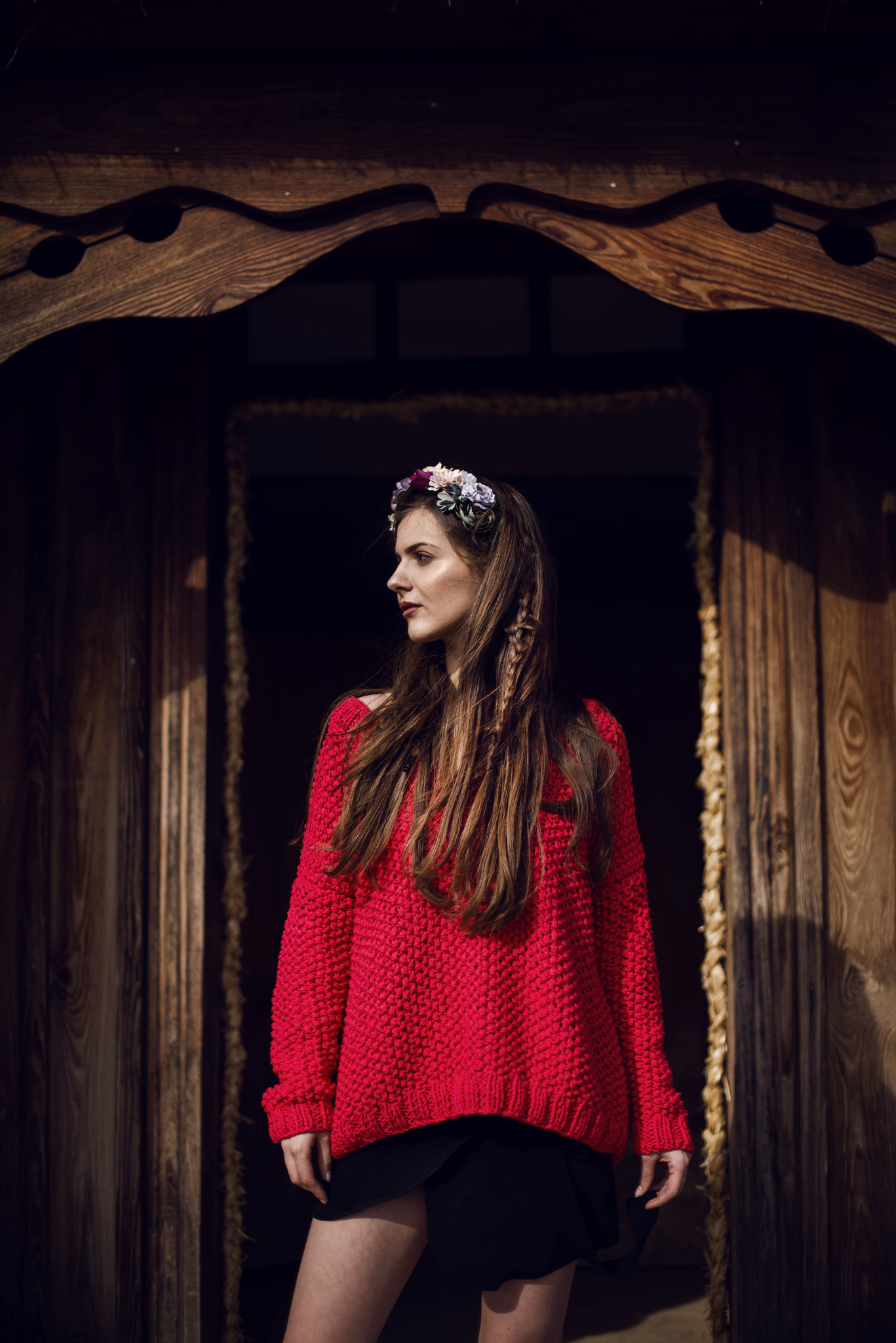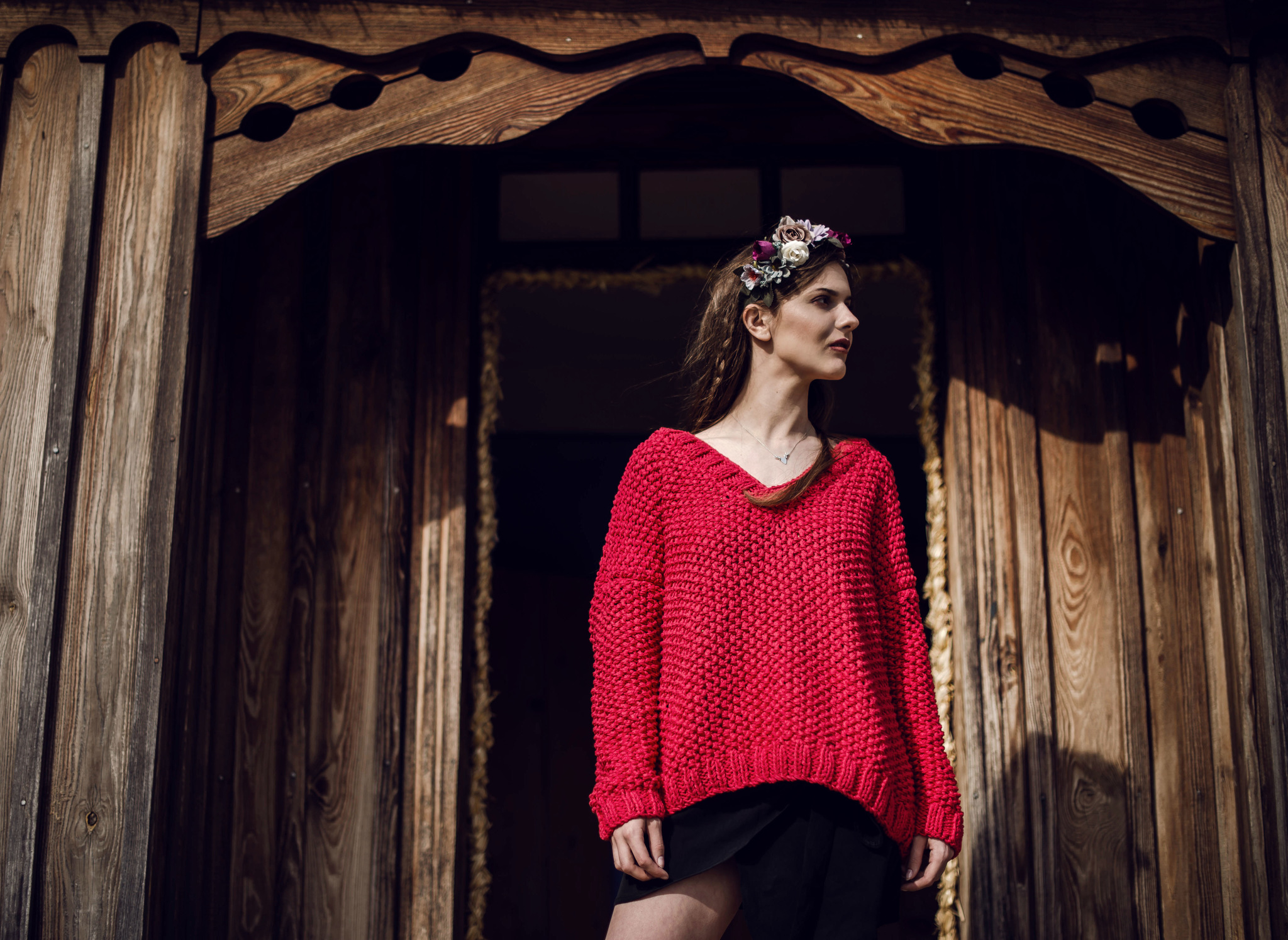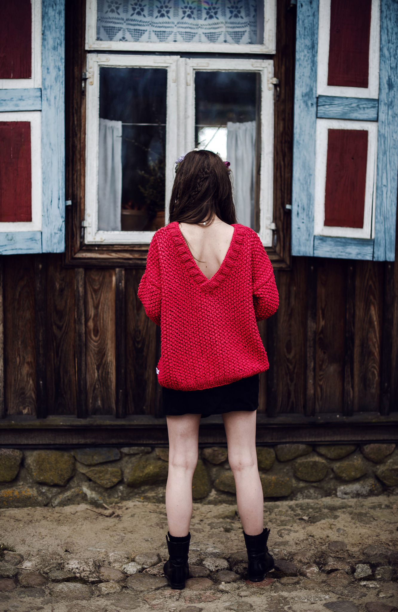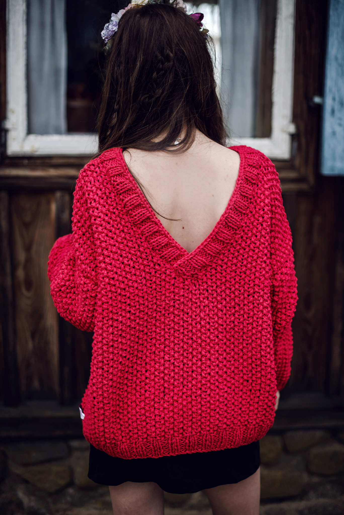 Sweter z długimi rękawami w nasyconym, czerwonym kolorze, wydziergany ściegiem ryżowy i zakończony ściągaczem. Głęboki dekolt w serek z tyłu. Na zamówienie dostępny jest w innych kolorach.