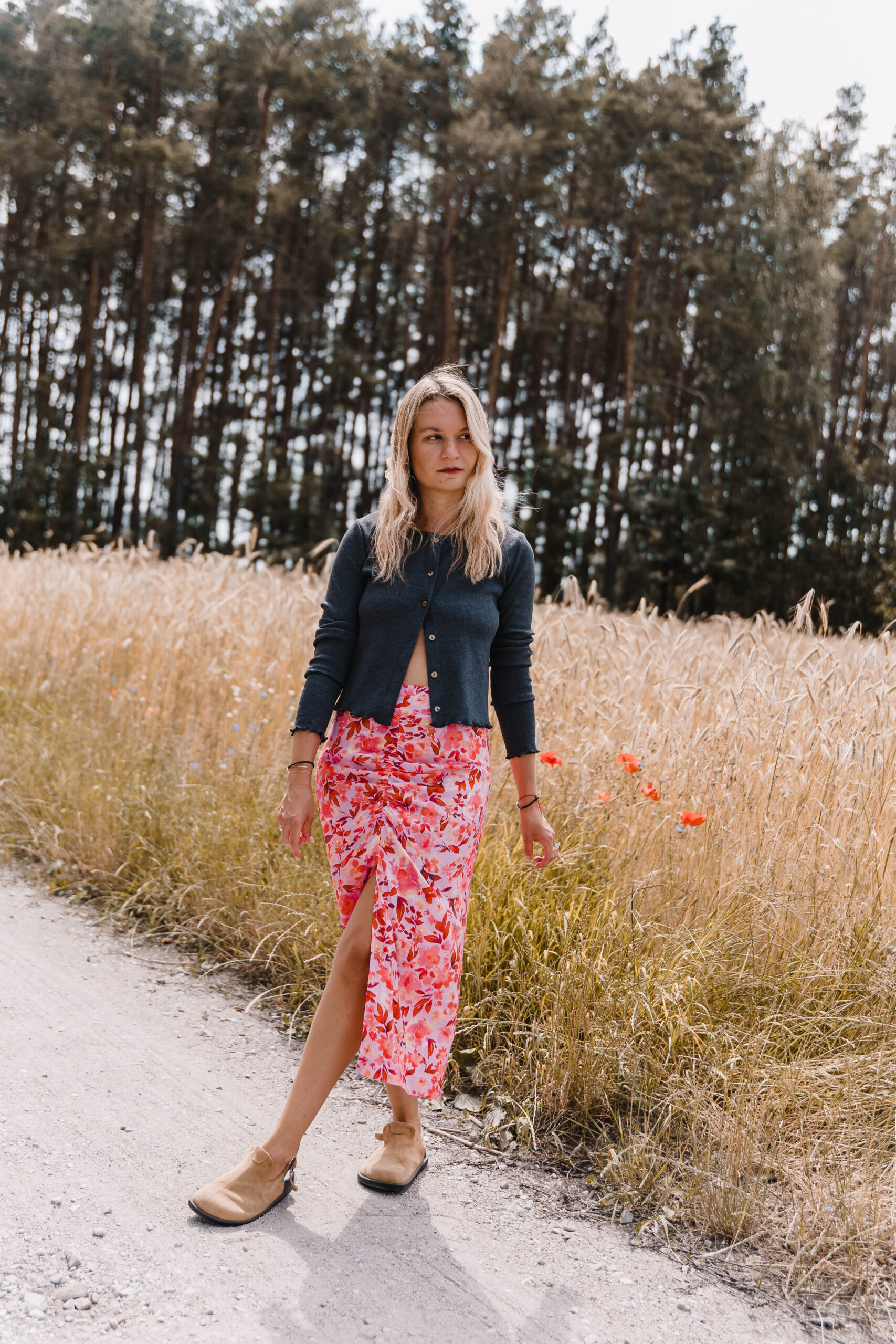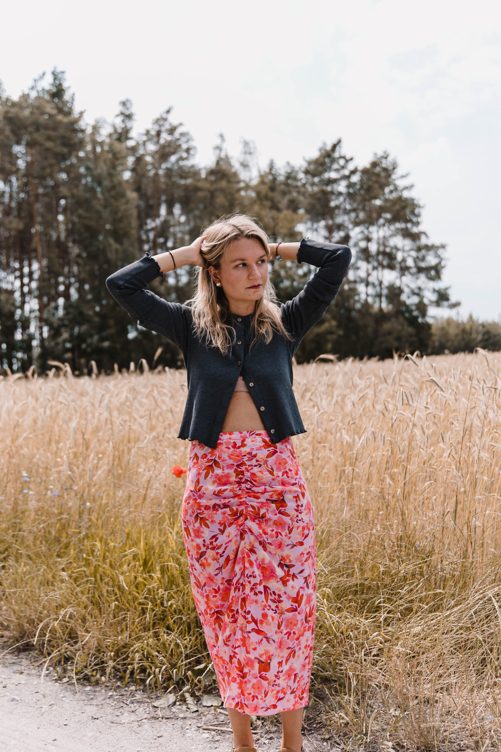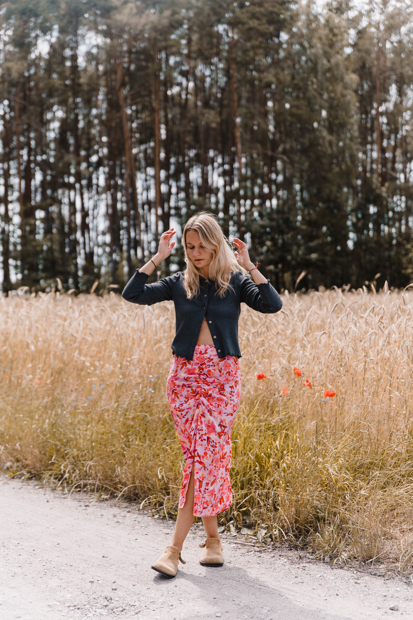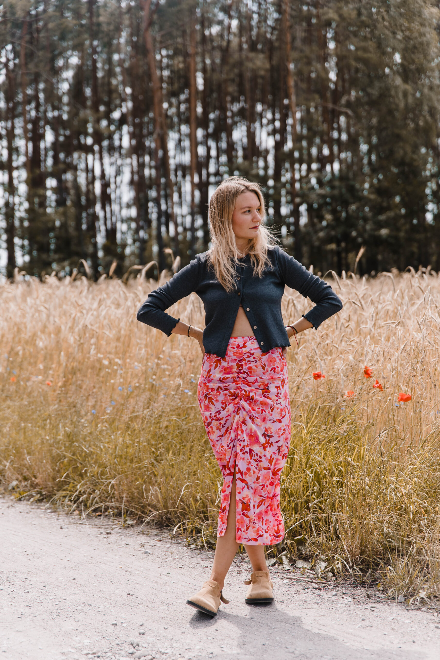 „Rosa Twist” to spódnica z charakterem – trochę romantyczna, trochę zadziorna, zdecydowanie niebanalna. Uszyta z tkaniny w energetyczny kwiatowy print, przyciąga spojrzenia i poprawia humor szybciej niż espresso. Dopasowana w talii, zapinana na zamek – trzyma fason jak należy, ale nie odbiera swobody. Przód zdobi efektowne marszczenie i zmysłowe rozcięcie, które subtelnie odsłania nogę – tak, żeby było wygodnie, ale i z lekkim „twistem”. To spódnica idealna na lato, kiedy masz ochotę wyglądać lekko, ale nie nijako. Załóż ją na spacer po mieście, randkę w ogrodzie albo wszędzie tam, gdzie przyda się odrobina kwiatowej pewności siebie.