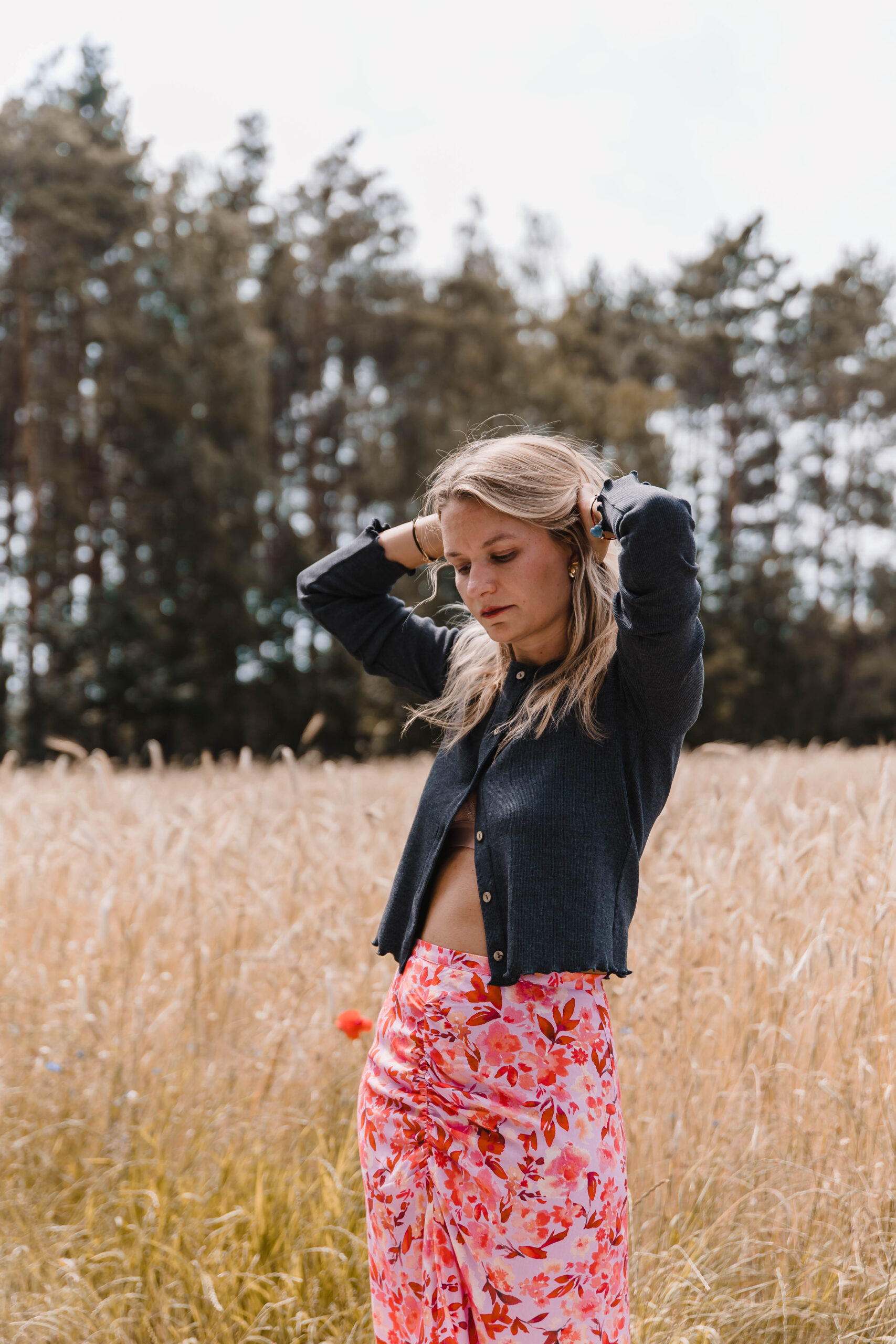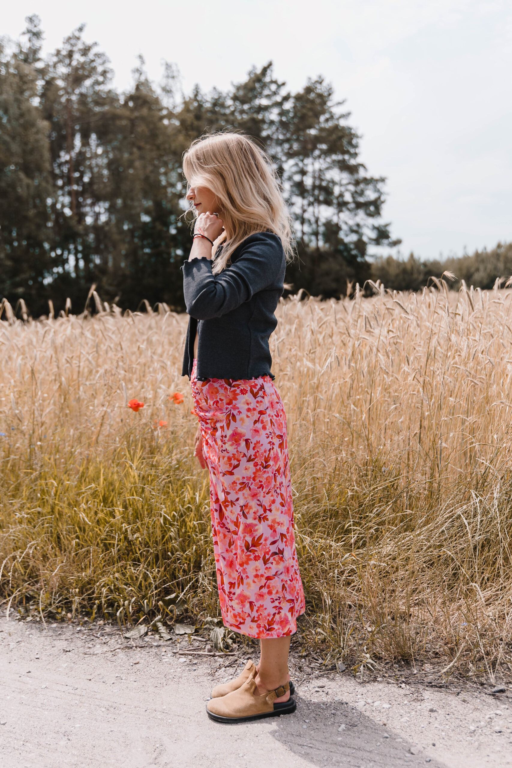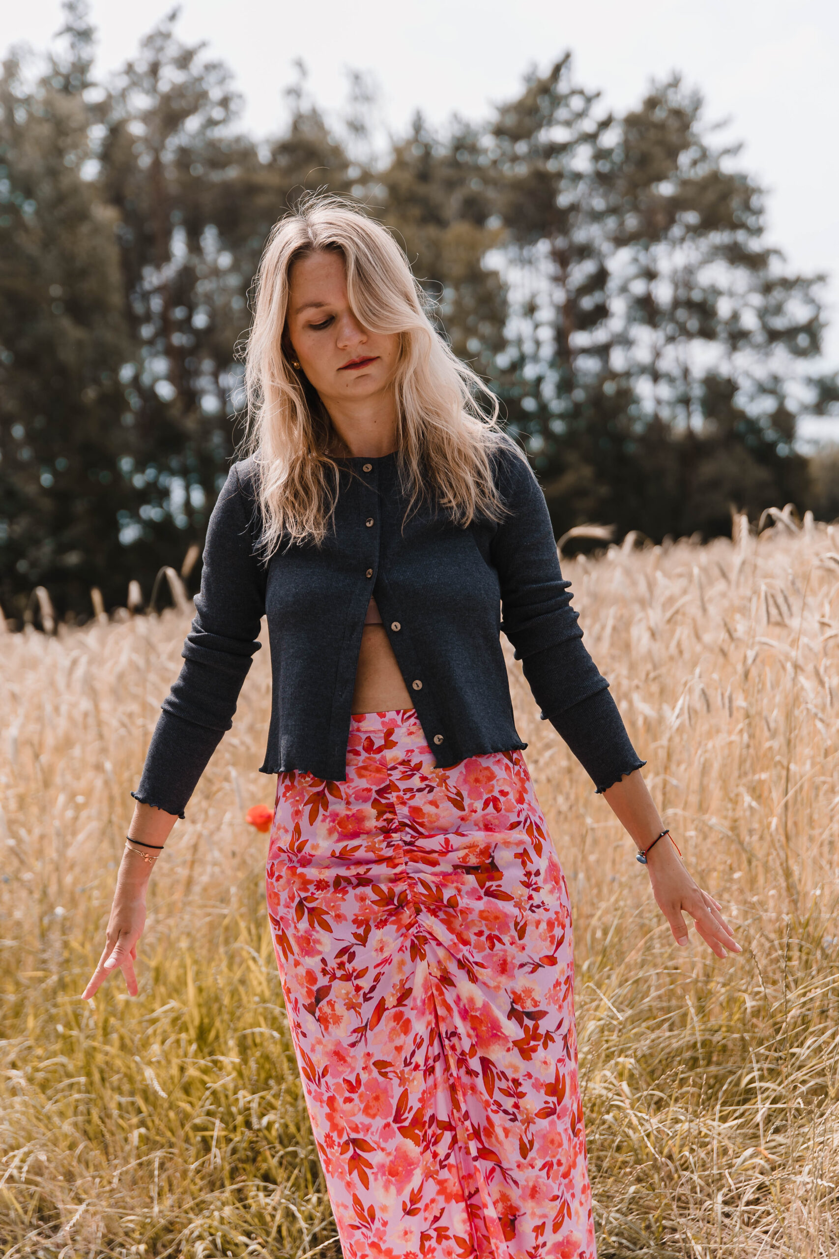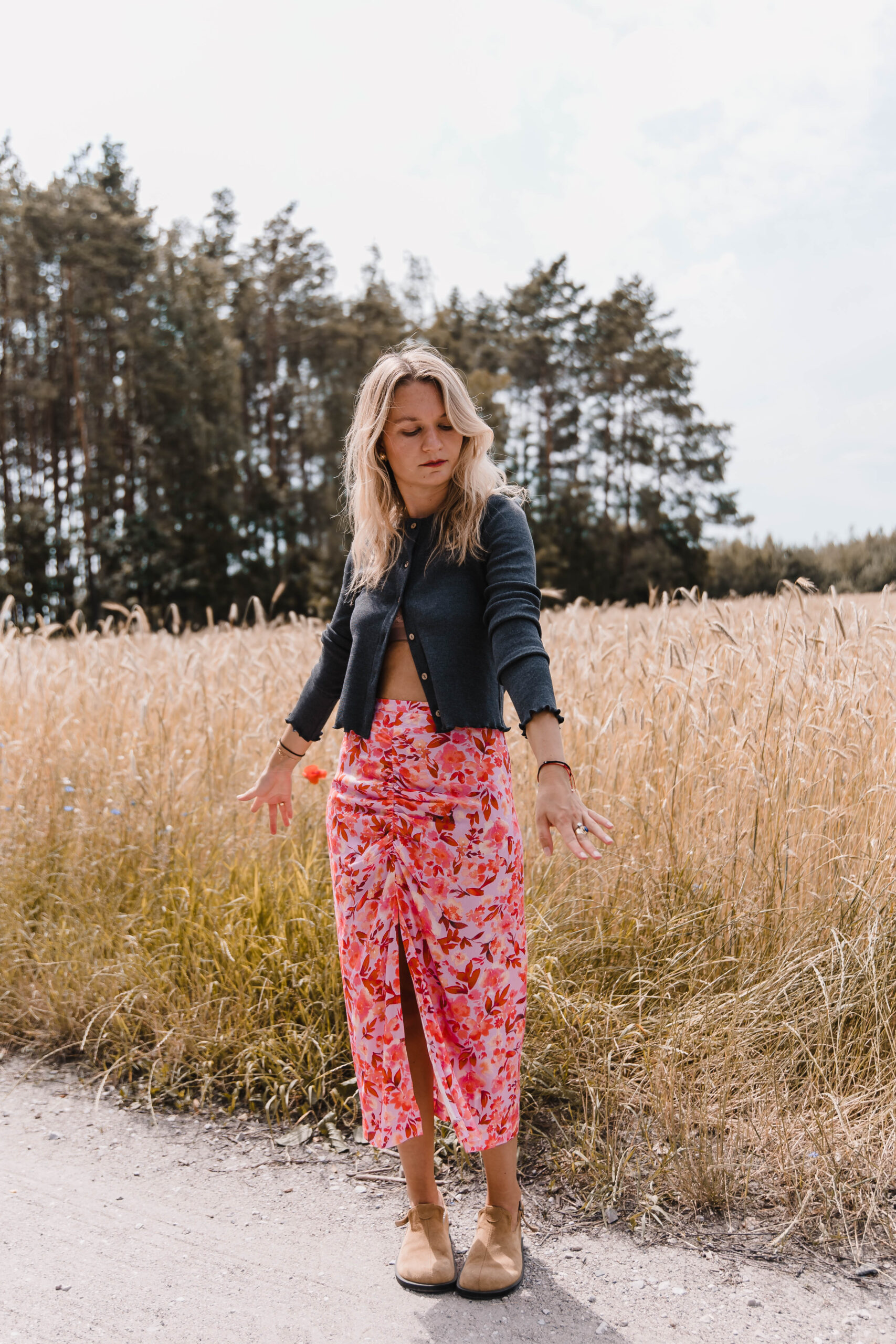 „Rosa Twist” to spódnica z charakterem – trochę romantyczna, trochę zadziorna, zdecydowanie niebanalna. Uszyta z tkaniny w energetyczny kwiatowy print, przyciąga spojrzenia i poprawia humor szybciej niż espresso. Dopasowana w talii, zapinana na zamek – trzyma fason jak należy, ale nie odbiera swobody. Przód zdobi efektowne marszczenie i zmysłowe rozcięcie, które subtelnie odsłania nogę – tak, żeby było wygodnie, ale i z lekkim „twistem”. To spódnica idealna na lato, kiedy masz ochotę wyglądać lekko, ale nie nijako. Załóż ją na spacer po mieście, randkę w ogrodzie albo wszędzie tam, gdzie przyda się odrobina kwiatowej pewności siebie.