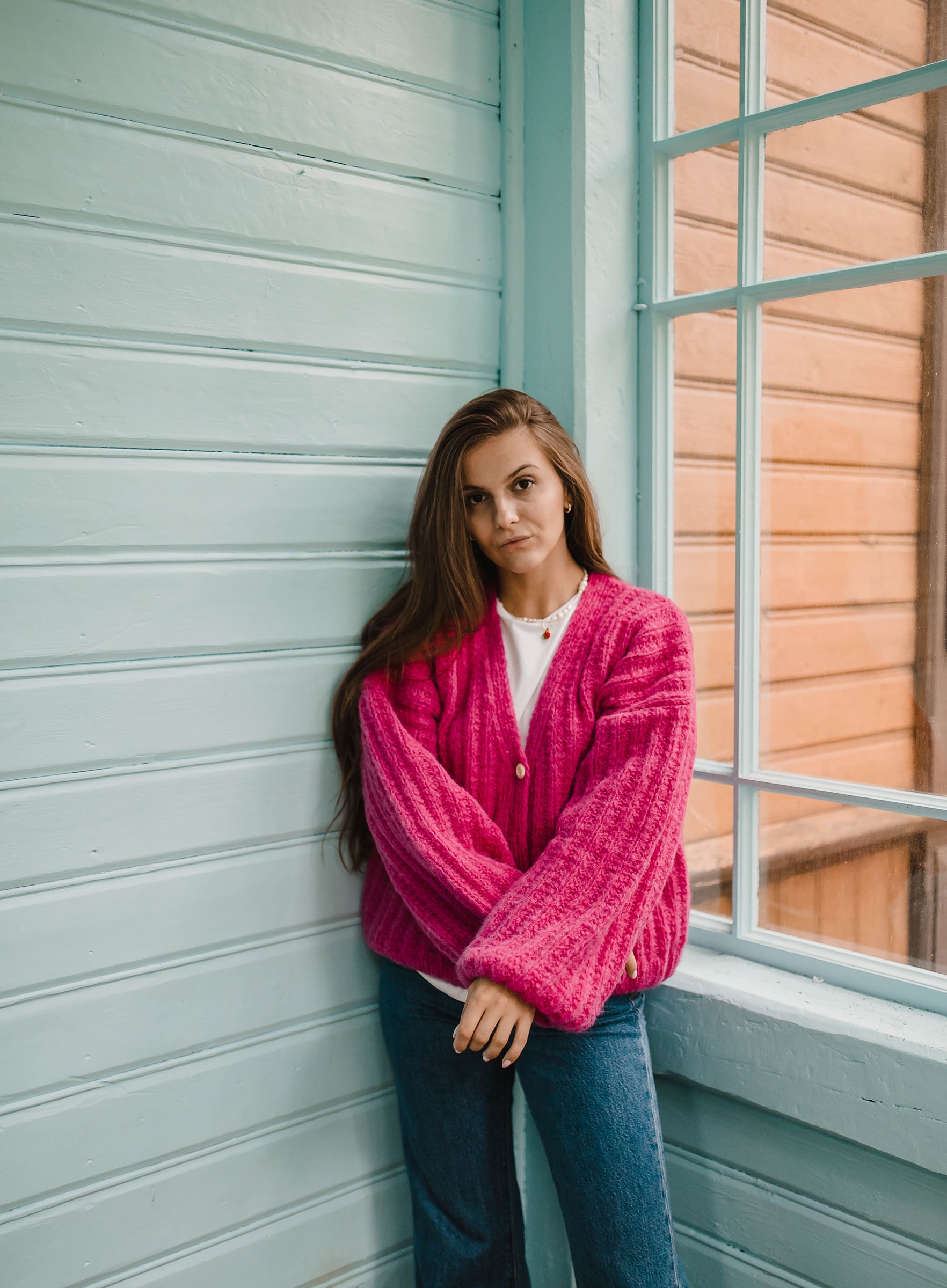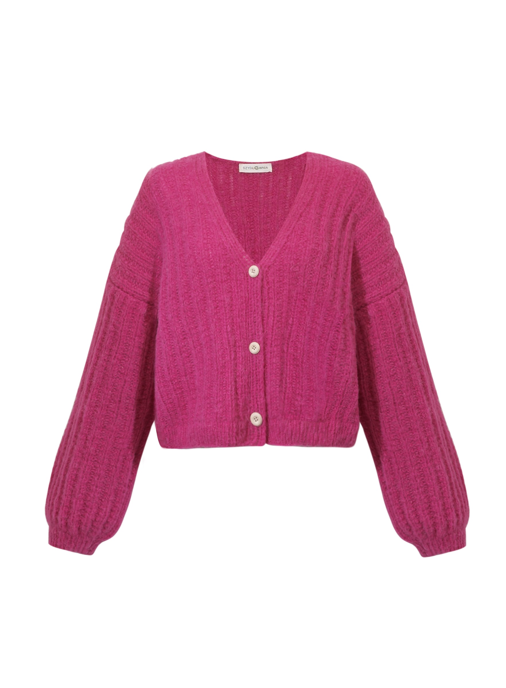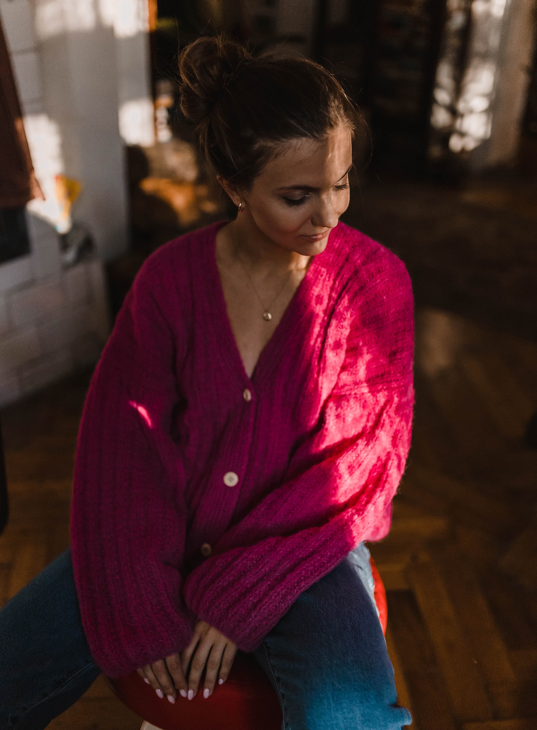 Ciepły kardigan na guziki wydziergany ręcznie z włóczki o intensywnym, fuksjowym kolorze. Bardzo pozytywny. Do noszenia na t-shirt lub na gołą skórę. Nie gryzie.