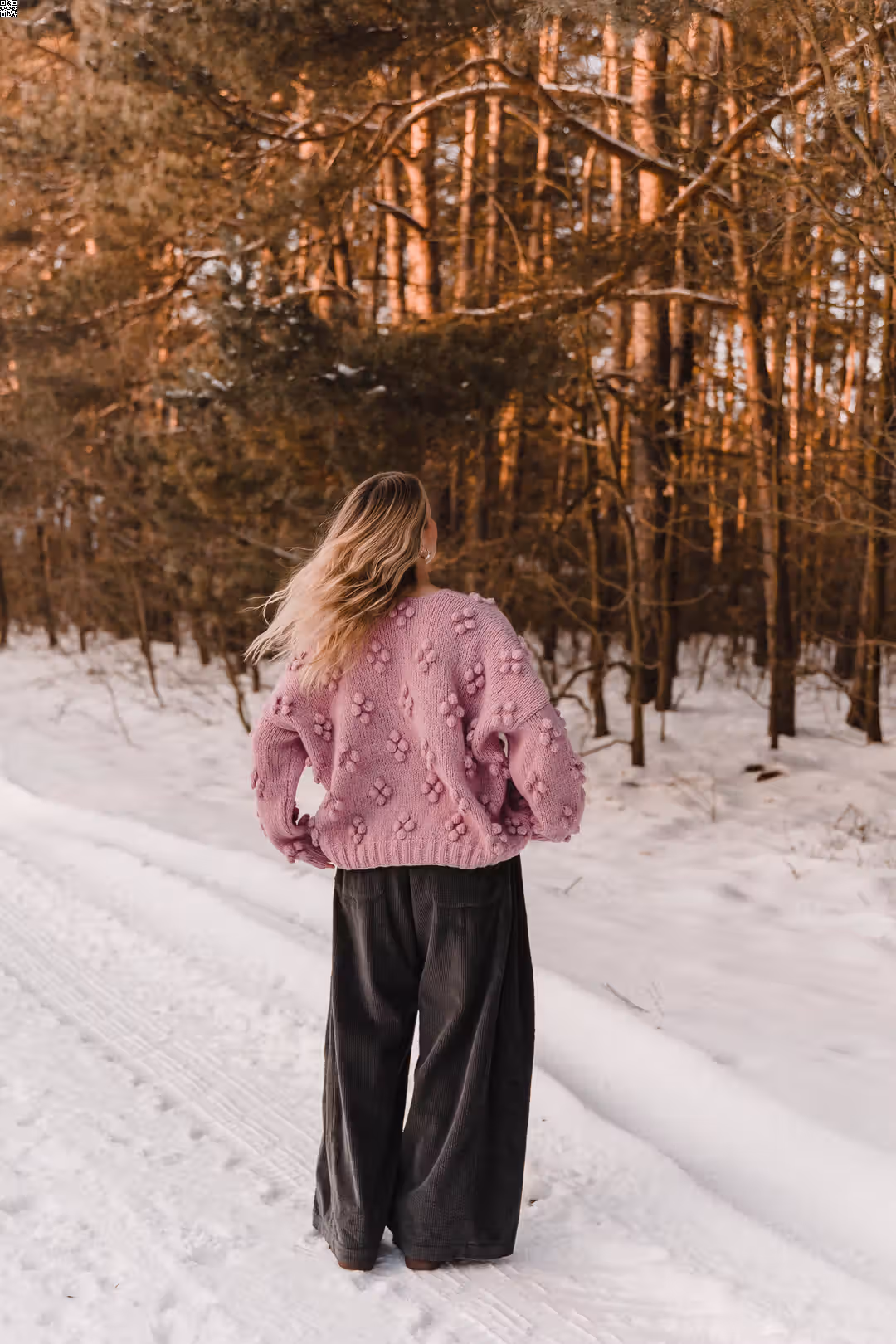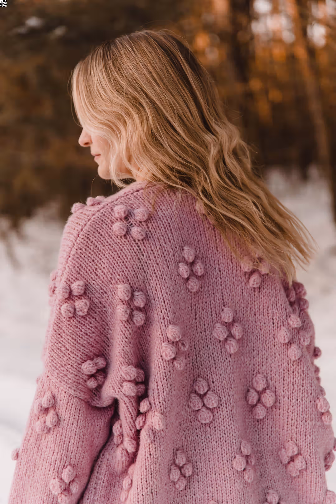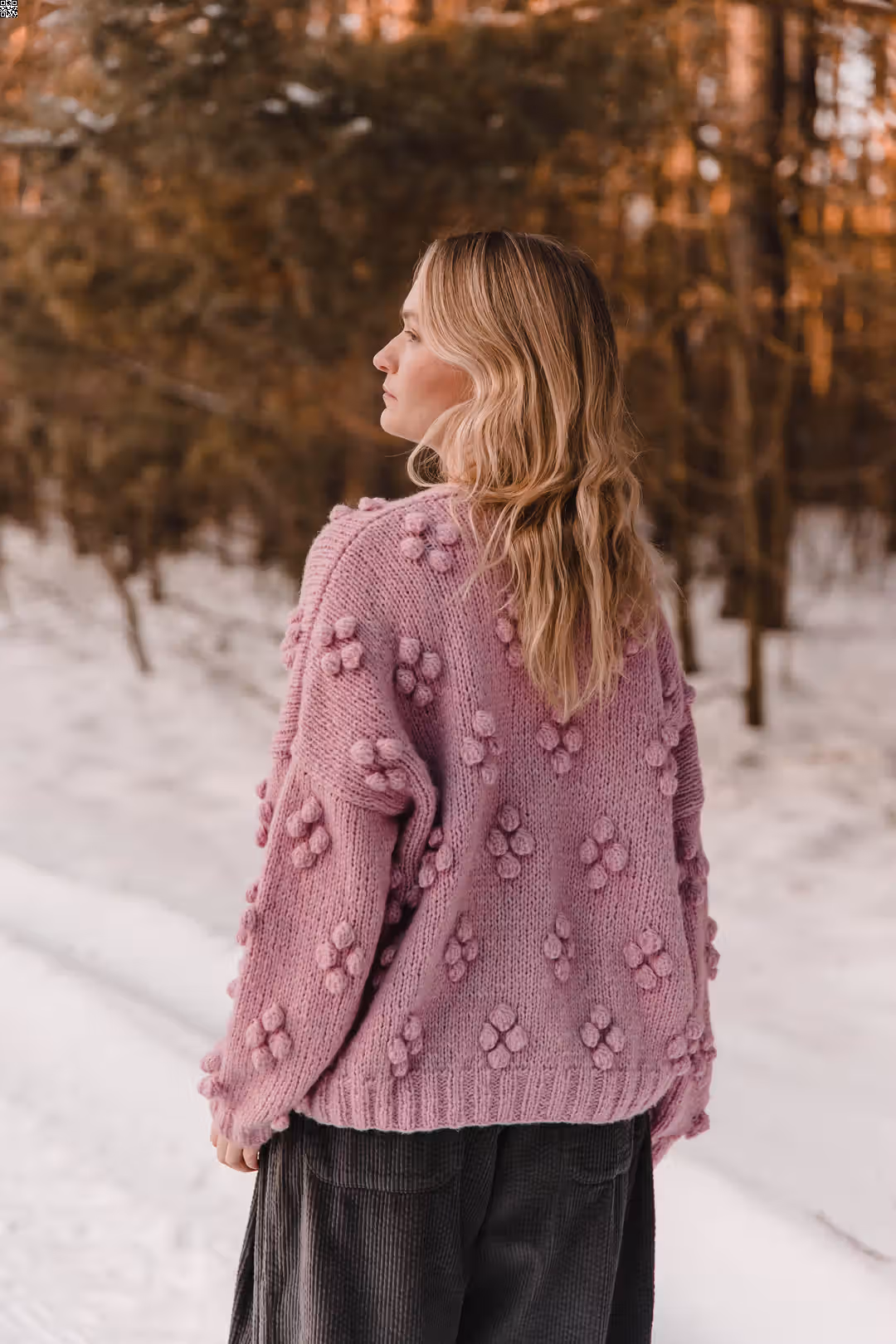 Rosewood to sweter, do którego się wraca. Miękki, otulający, z wyraźną fakturą, która sprawia, że od razu chce się go dotknąć. Ma luźną formę i rękodzielniczy charakter — drobne wypukłe detale nadają mu głębi i sprawiają, że nawet prosta stylizacja robi się ciekawsza. Jest ciepły, ale nie ciężki. Widoczny, ale nienarzucający się. To ten rodzaj swetra, który nosi się długo — na spacery, na wyjazdy, na dni, kiedy potrzebujesz czegoś miękkiego i „swojego”.