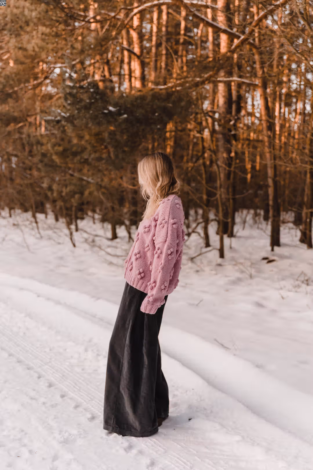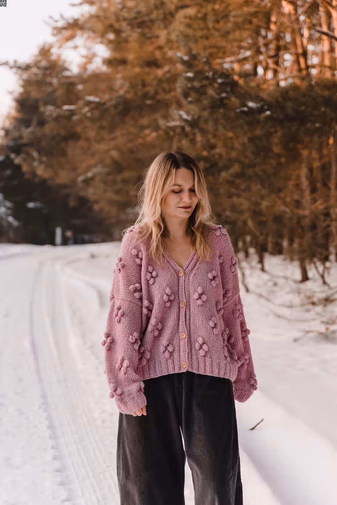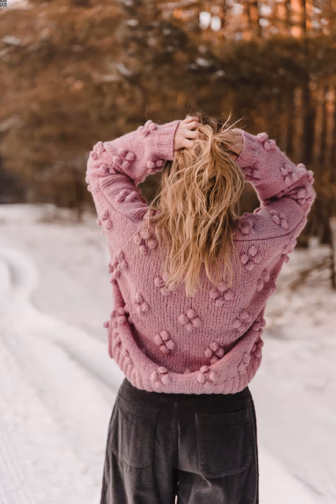 Rosewood to sweter, do którego się wraca. Miękki, otulający, z wyraźną fakturą, która sprawia, że od razu chce się go dotknąć. Ma luźną formę i rękodzielniczy charakter — drobne wypukłe detale nadają mu głębi i sprawiają, że nawet prosta stylizacja robi się ciekawsza. Jest ciepły, ale nie ciężki. Widoczny, ale nienarzucający się. To ten rodzaj swetra, który nosi się długo — na spacery, na wyjazdy, na dni, kiedy potrzebujesz czegoś miękkiego i „swojego”.
