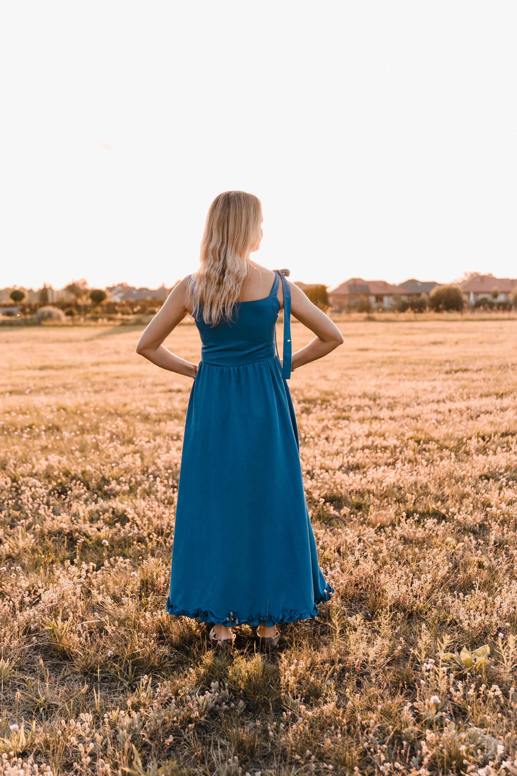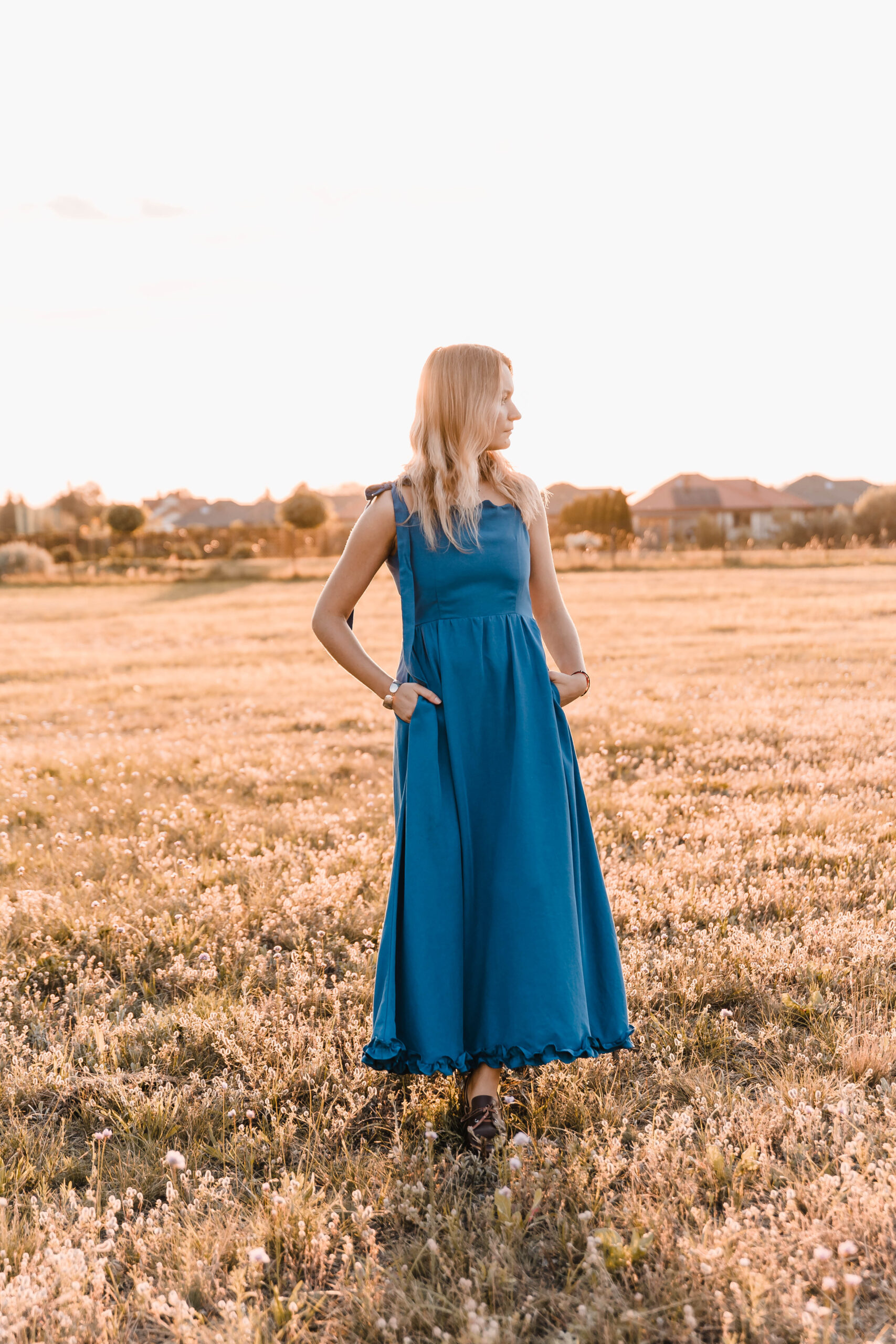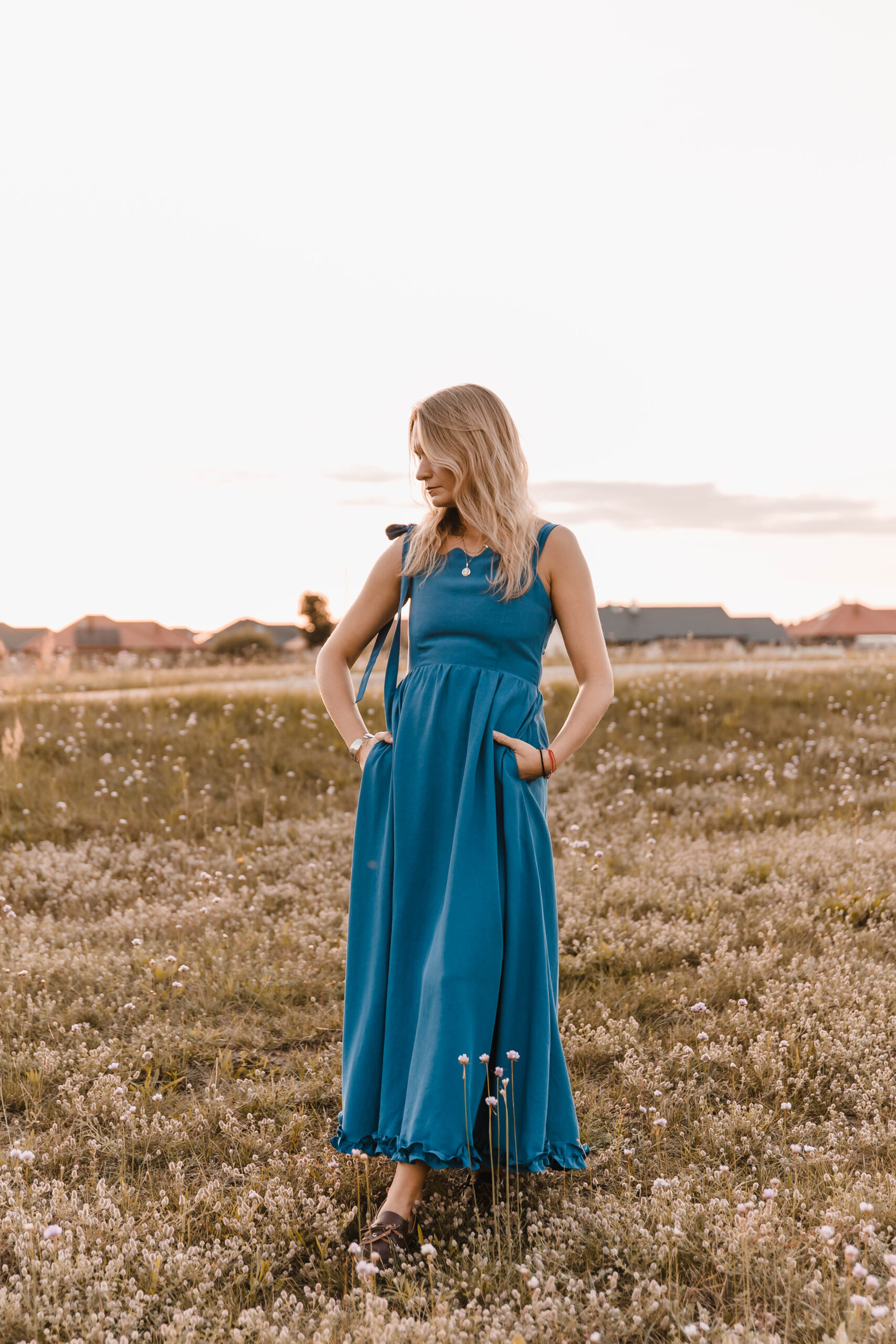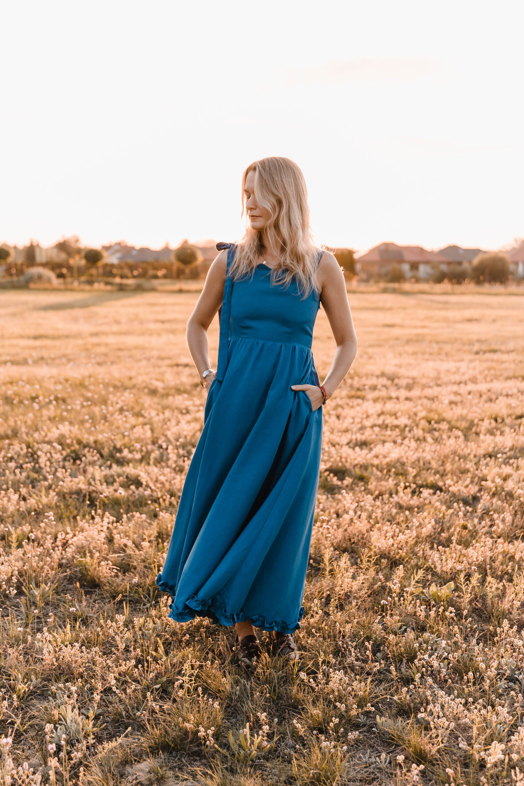 Sukienka, która żyje w rytmie lata. Miękko otula sylwetkę, a falbanka u dołu wiruje przy każdym kroku. Dekolt zdobi delikatna fala, nadając jej romantyczny ton. Jedno ramiączko z ozdobnym wiązaniem dodaje dziewczęcego uroku, drugie – klasyczne – trzyma fason. A w ukrytych kieszeniach zmieścisz wszystko, co chcesz mieć pod ręką. Idealna na nadmorskie spacery, garden party czy spontaniczne letnie wieczory, kiedy liczy się swoboda, wygoda i efekt „wow”.
