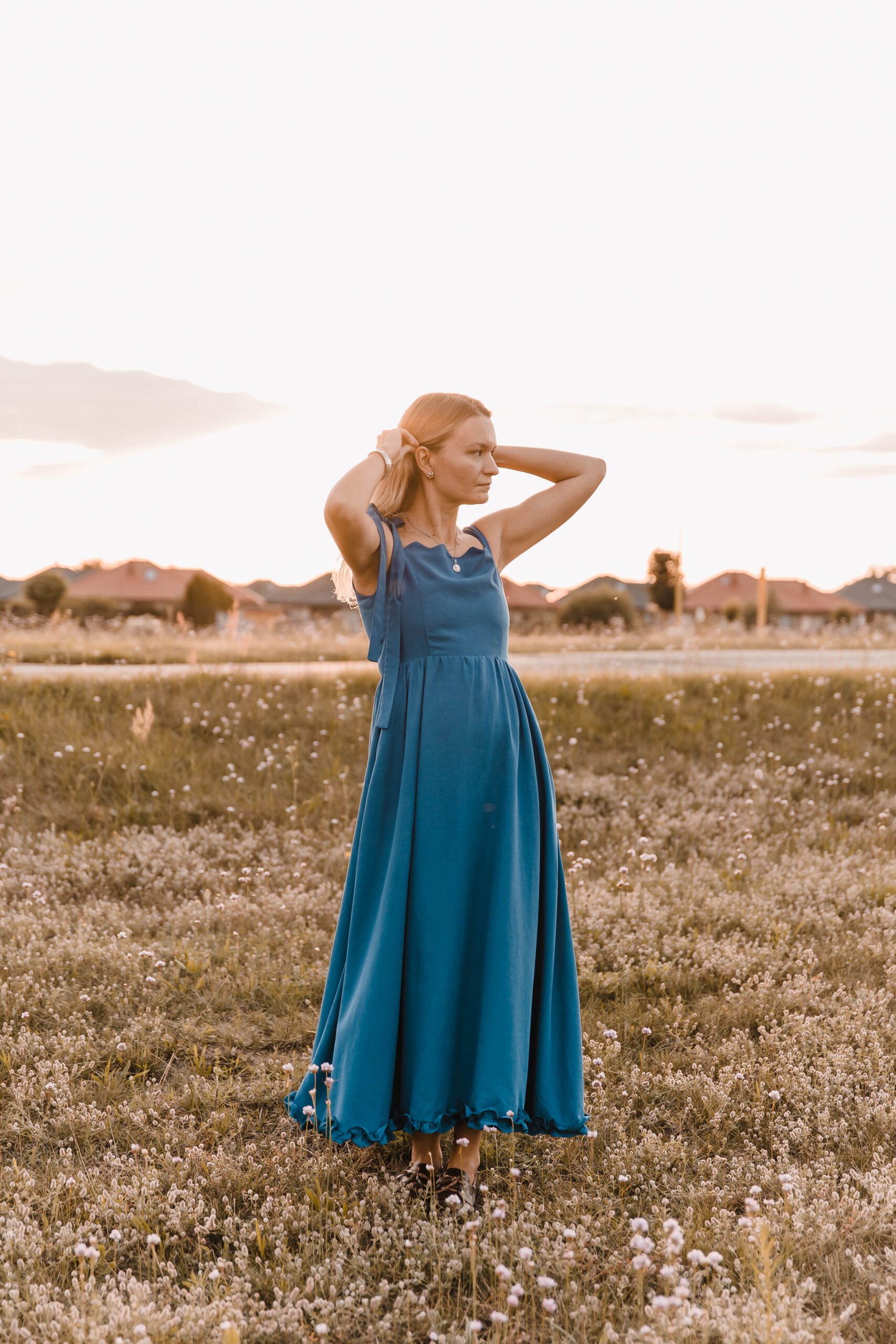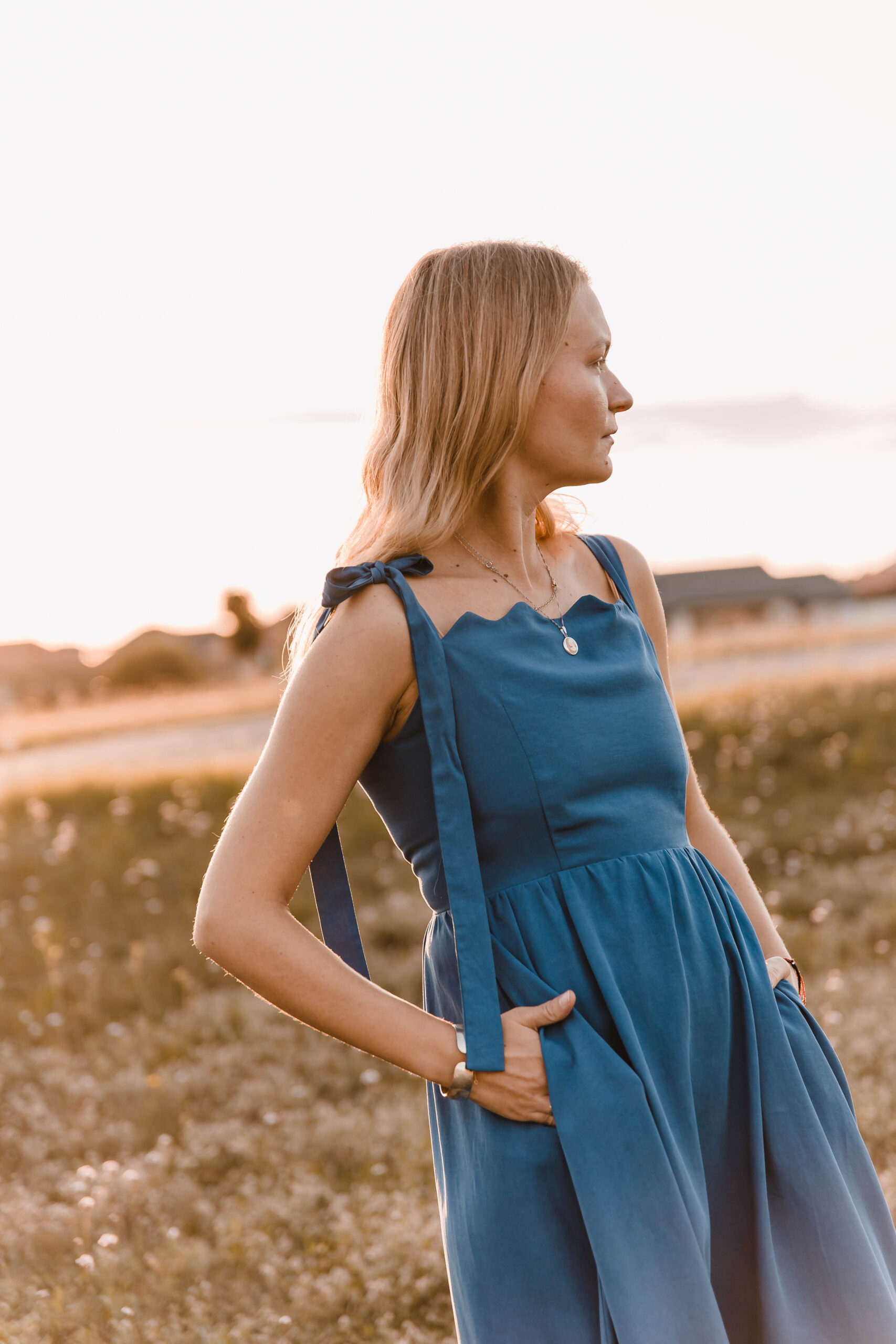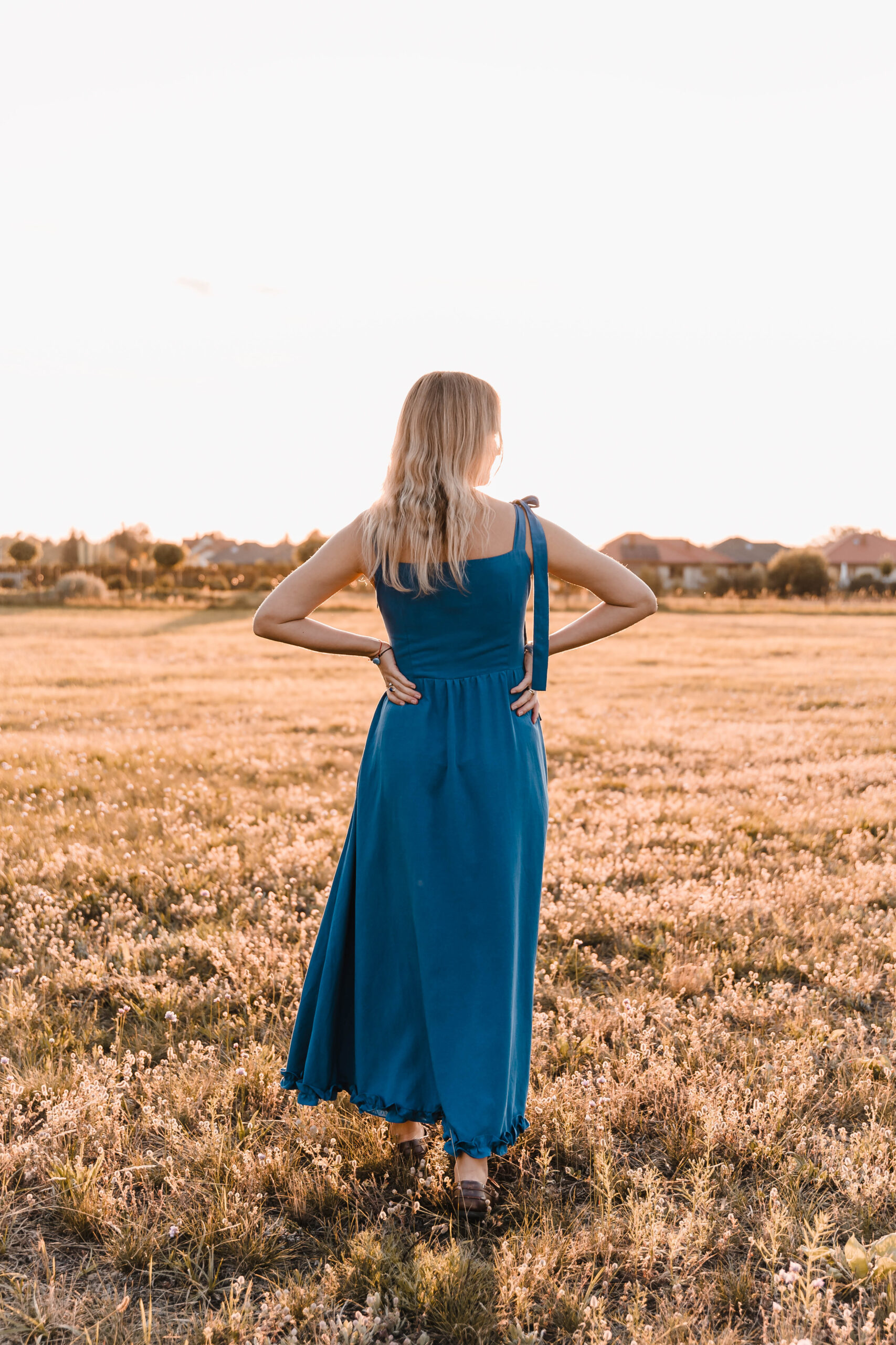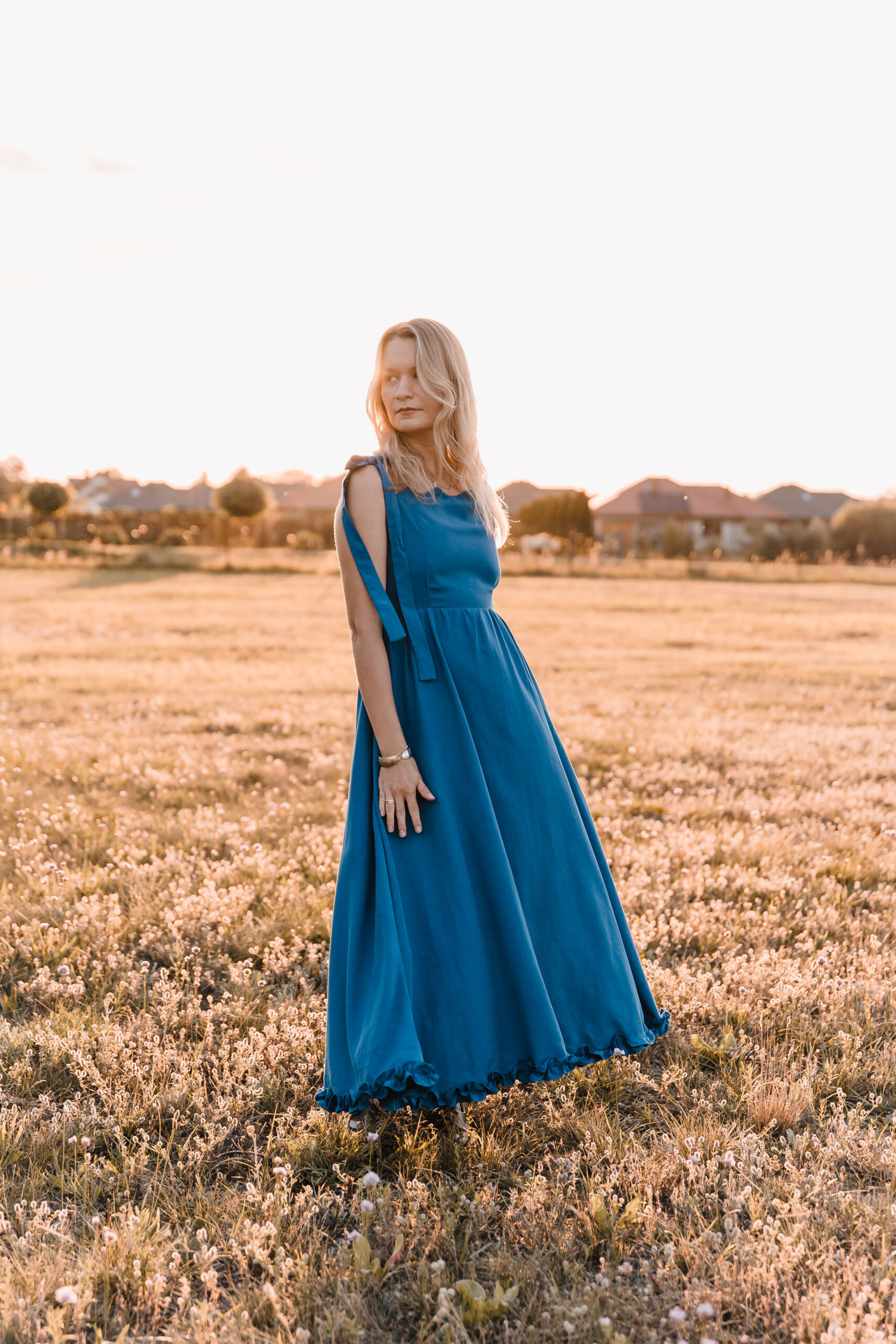 Sukienka, która żyje w rytmie lata. Miękko otula sylwetkę, a falbanka u dołu wiruje przy każdym kroku. Dekolt zdobi delikatna fala, nadając jej romantyczny ton. Jedno ramiączko z ozdobnym wiązaniem dodaje dziewczęcego uroku, drugie – klasyczne – trzyma fason. A w ukrytych kieszeniach zmieścisz wszystko, co chcesz mieć pod ręką. Idealna na nadmorskie spacery, garden party czy spontaniczne letnie wieczory, kiedy liczy się swoboda, wygoda i efekt „wow”.