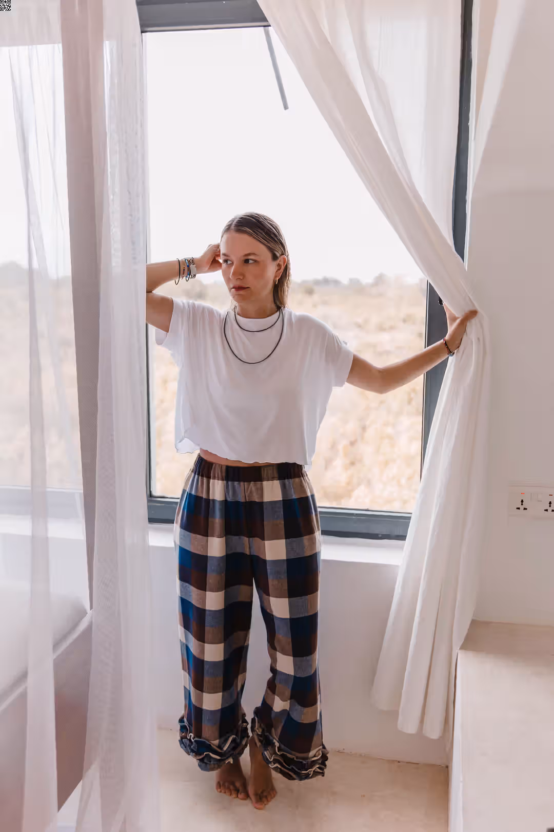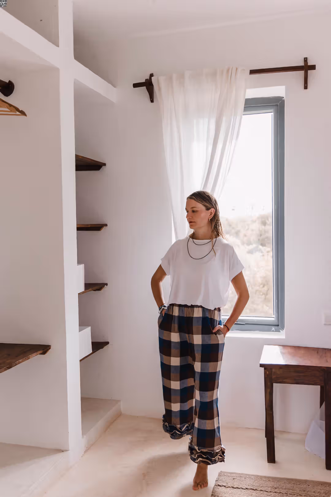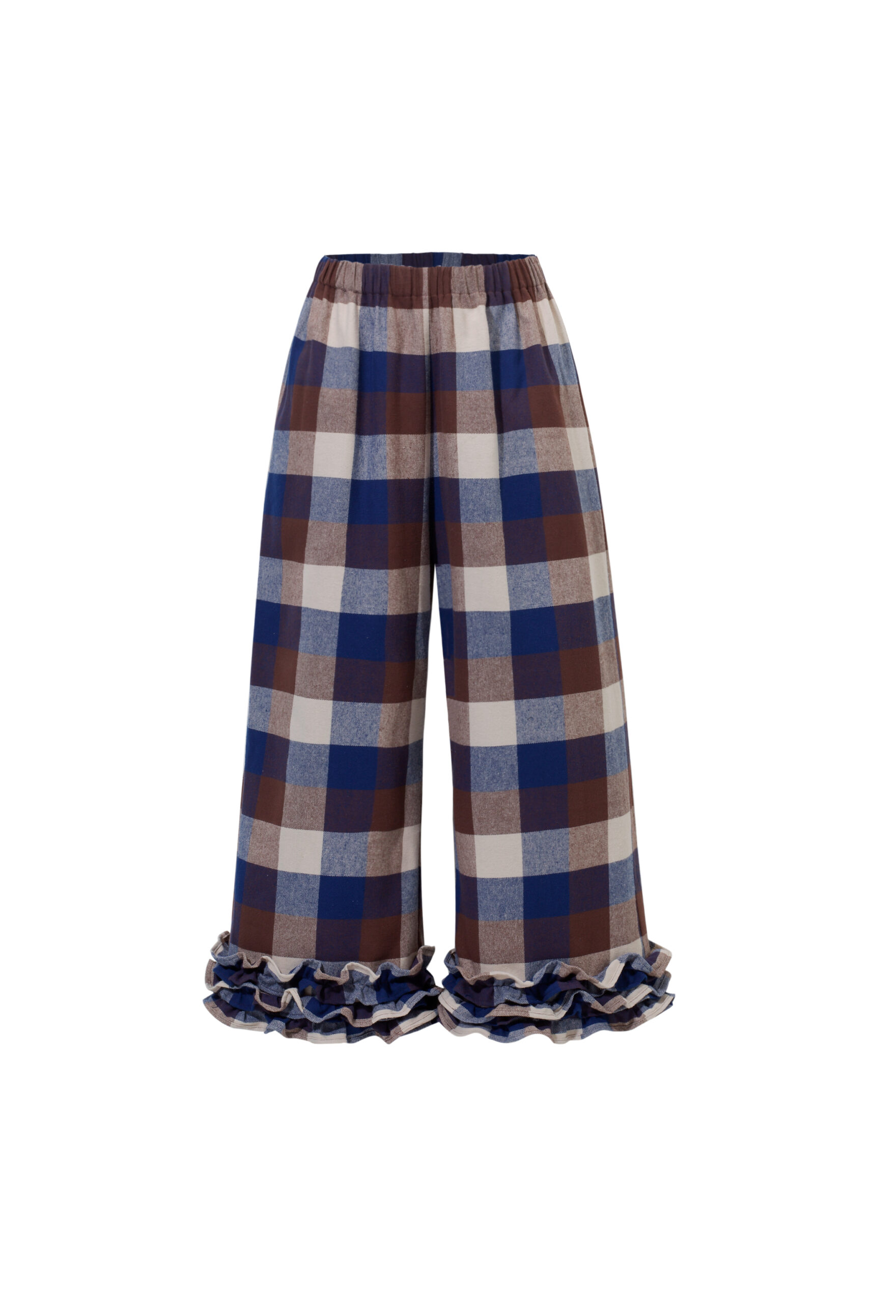 Te spodnie są o swobodzie. O tym, że nic nie uciska, nic nie ciągnie i wszystko układa się tak, jak powinno. Miękka gumka w pasie daje komfort od pierwszego założenia, kieszenie są dokładnie tam, gdzie ich potrzebujesz, a falbanka na dole dodaje lekkości i odrobiny ruchu przy każdym kroku. Dobrze odnajdują się w codziennych zestawach — z prostym t-shirtem, koszulą czy swetrem. Są wystarczająco luźne na co dzień, ale mają detal, który sprawia, że nie są oczywiste. To spodnie na dni, kiedy chcesz czuć się wygodnie, ale nadal „ubrana”.
