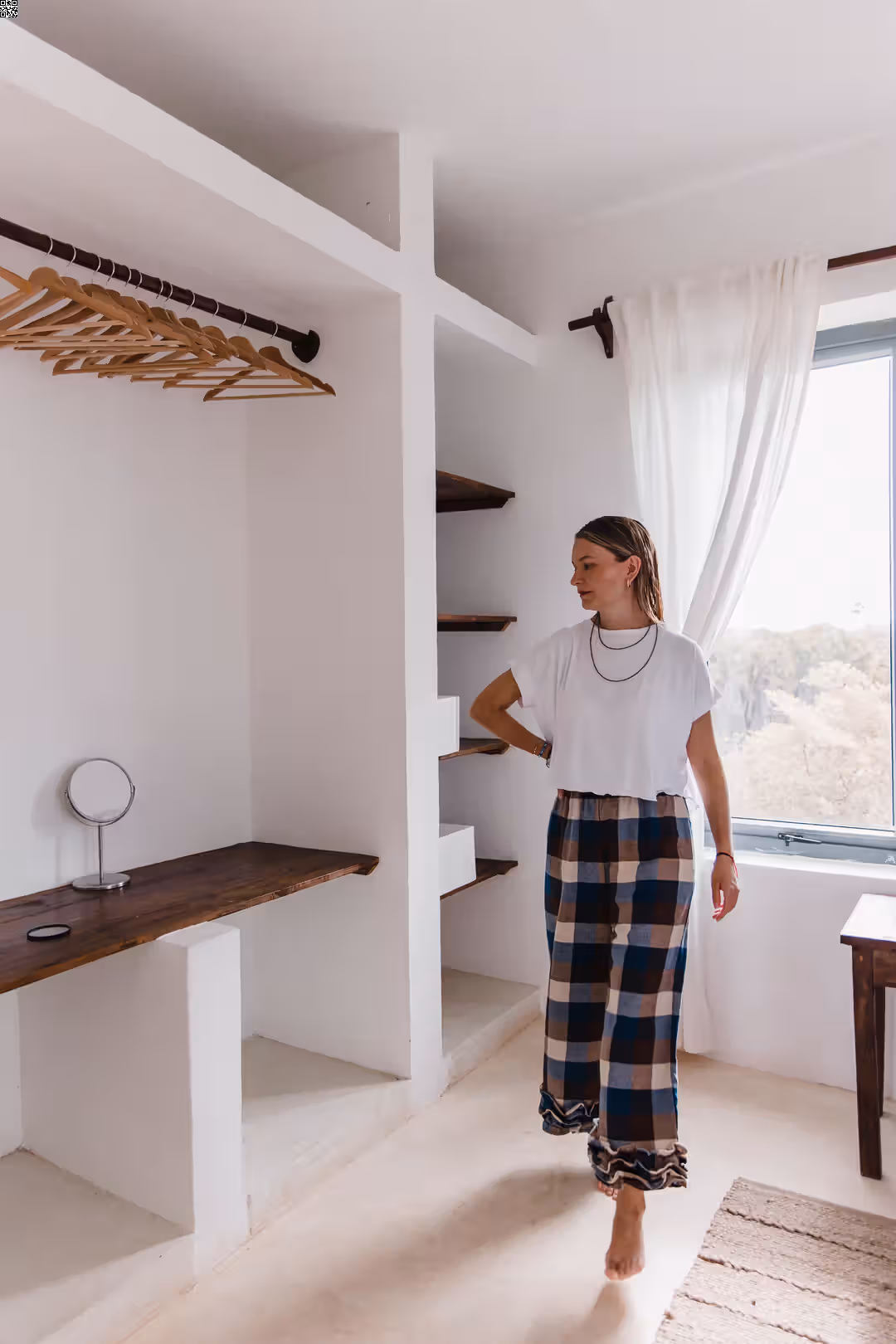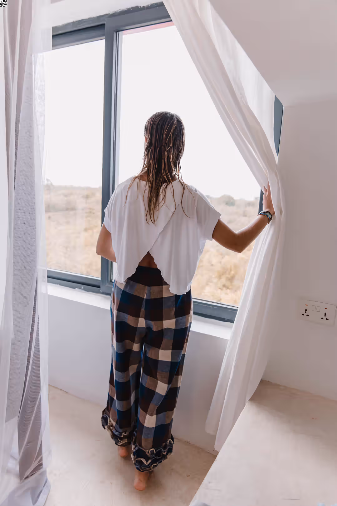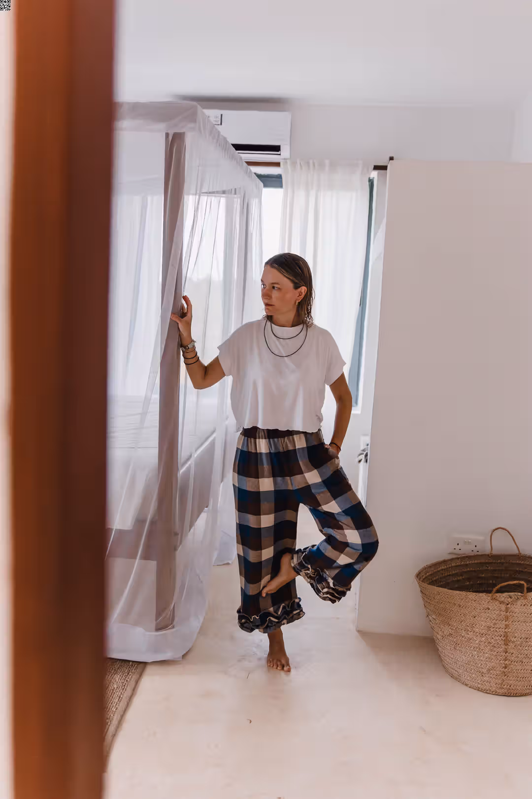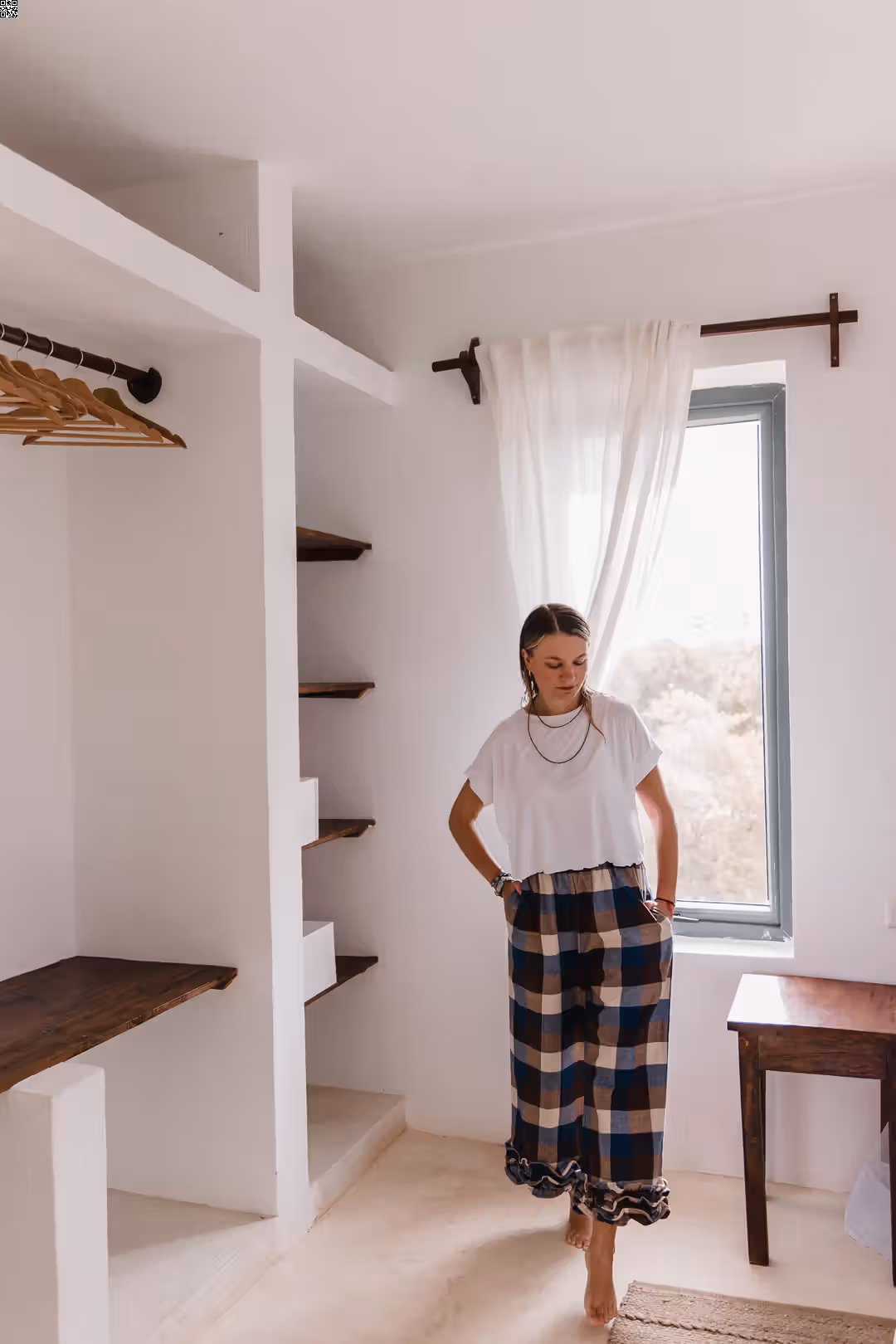 Te spodnie są o swobodzie. O tym, że nic nie uciska, nic nie ciągnie i wszystko układa się tak, jak powinno. Miękka gumka w pasie daje komfort od pierwszego założenia, kieszenie są dokładnie tam, gdzie ich potrzebujesz, a falbanka na dole dodaje lekkości i odrobiny ruchu przy każdym kroku. Dobrze odnajdują się w codziennych zestawach — z prostym t-shirtem, koszulą czy swetrem. Są wystarczająco luźne na co dzień, ale mają detal, który sprawia, że nie są oczywiste. To spodnie na dni, kiedy chcesz czuć się wygodnie, ale nadal „ubrana”.