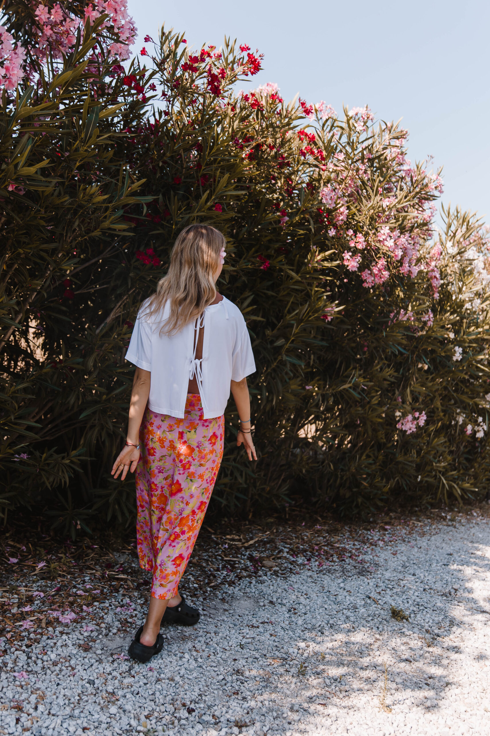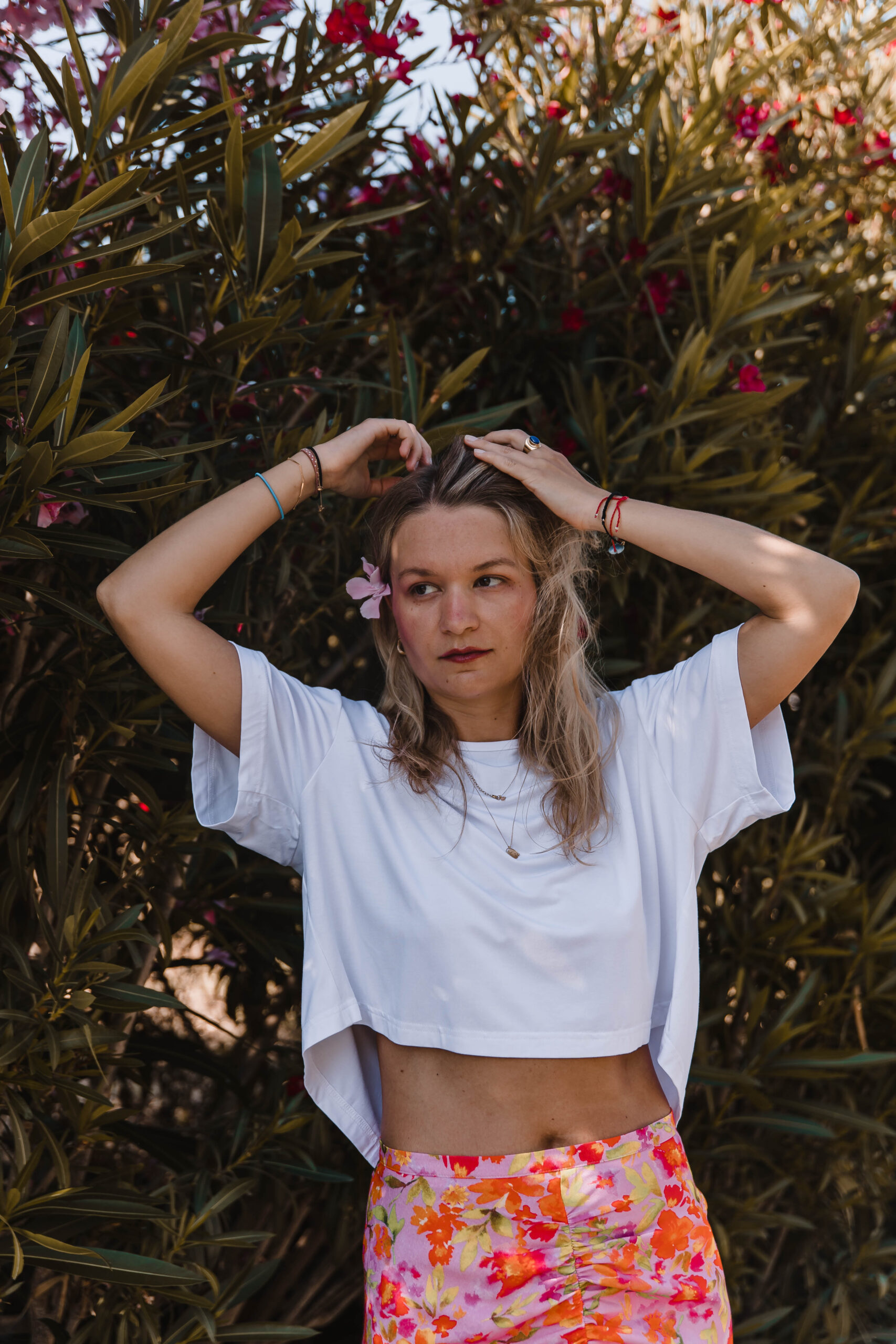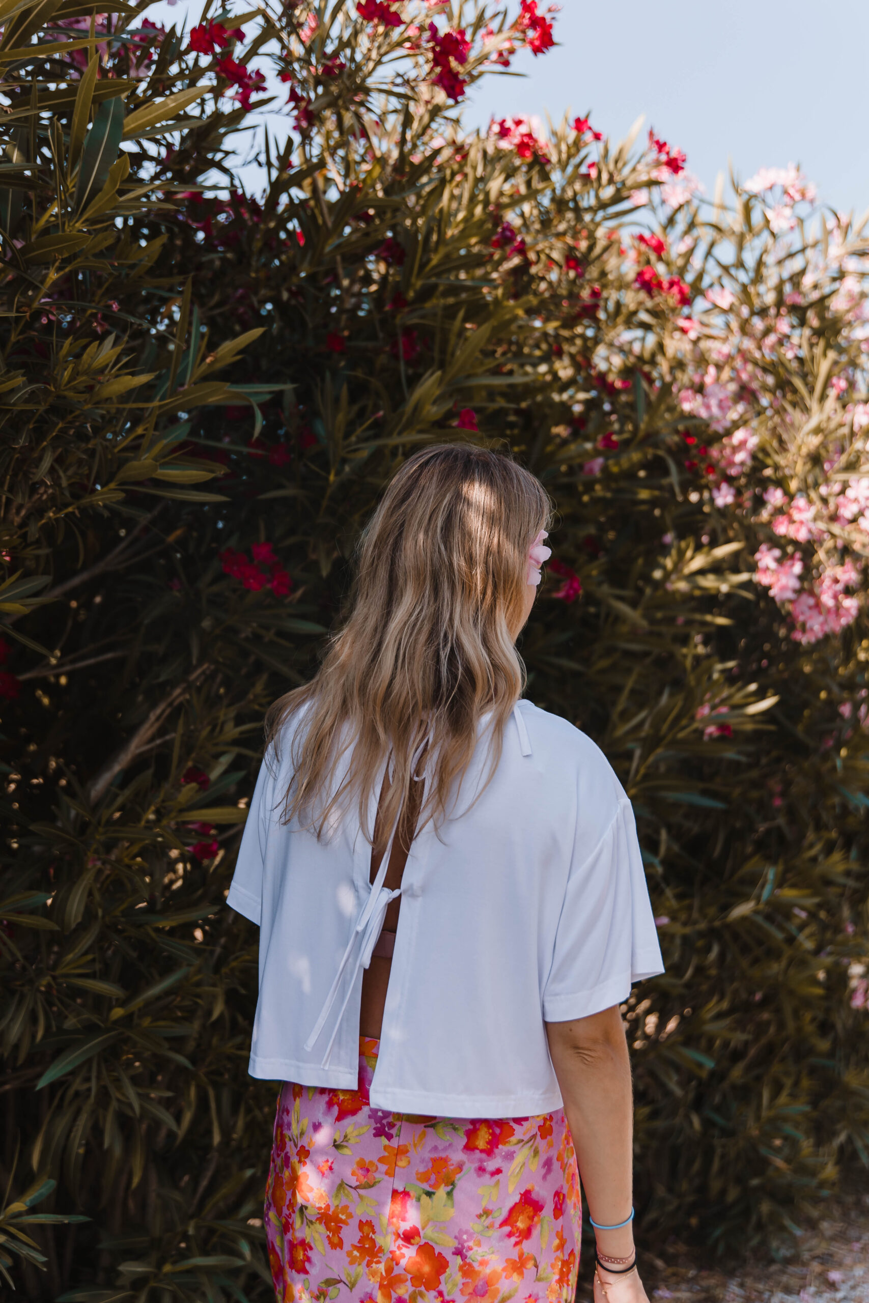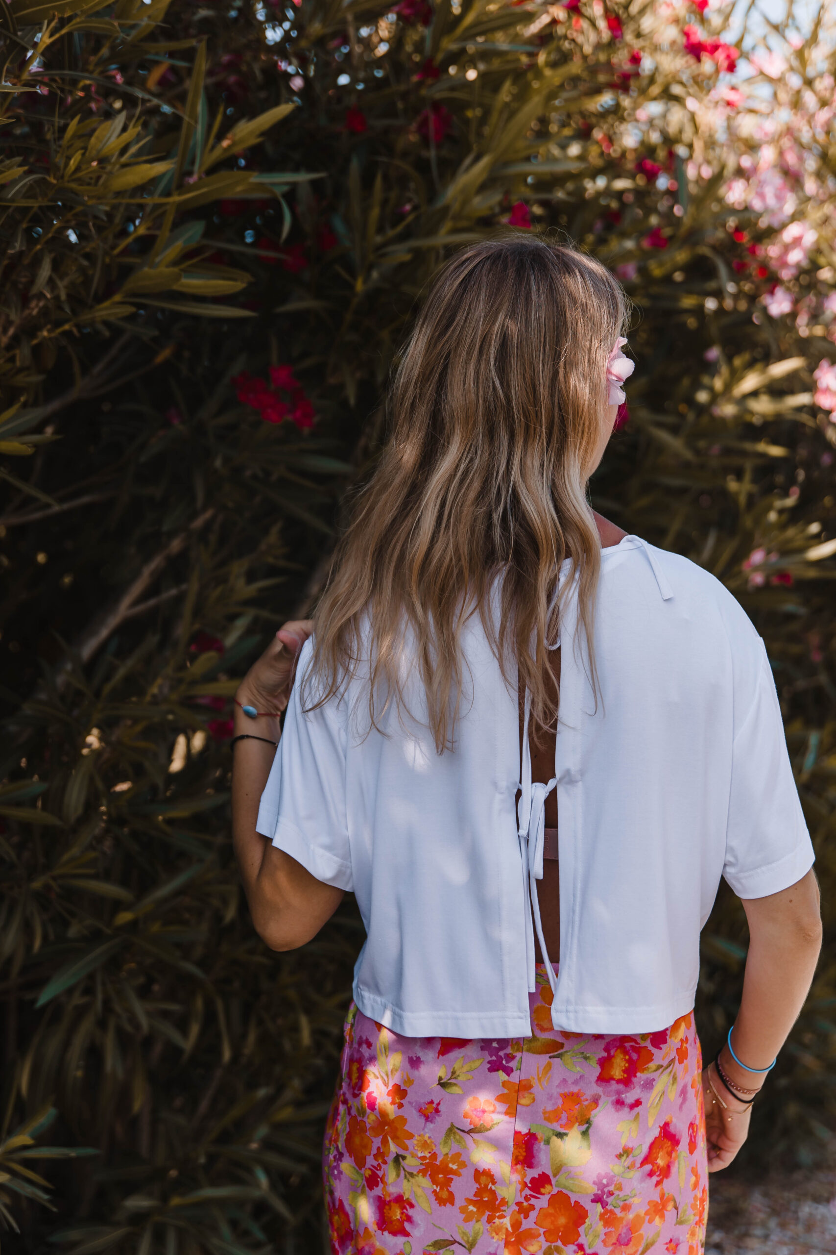 Ten top to definicja letniej beztroski – lekki, przewiewny i z charakterem. Prosty z przodu, zmysłowy z tyłu – dzięki podwójnemu wiązaniu tworzy subtelne wycięcie, które odsłania dokładnie tyle, ile trzeba. Luźny, pudełkowy krój zapewnia pełną swobodę, a delikatna tkanina miękko układa się na ciele, nie przytłaczając sylwetki. Idealny do spódnic, szortów, lnianych spodni – albo zarzucany na kostium kąpielowy po dniu na plaży. To top, który wygląda na niepozorny – ale robi świetne wrażenie, zwłaszcza gdy się odwrócisz.