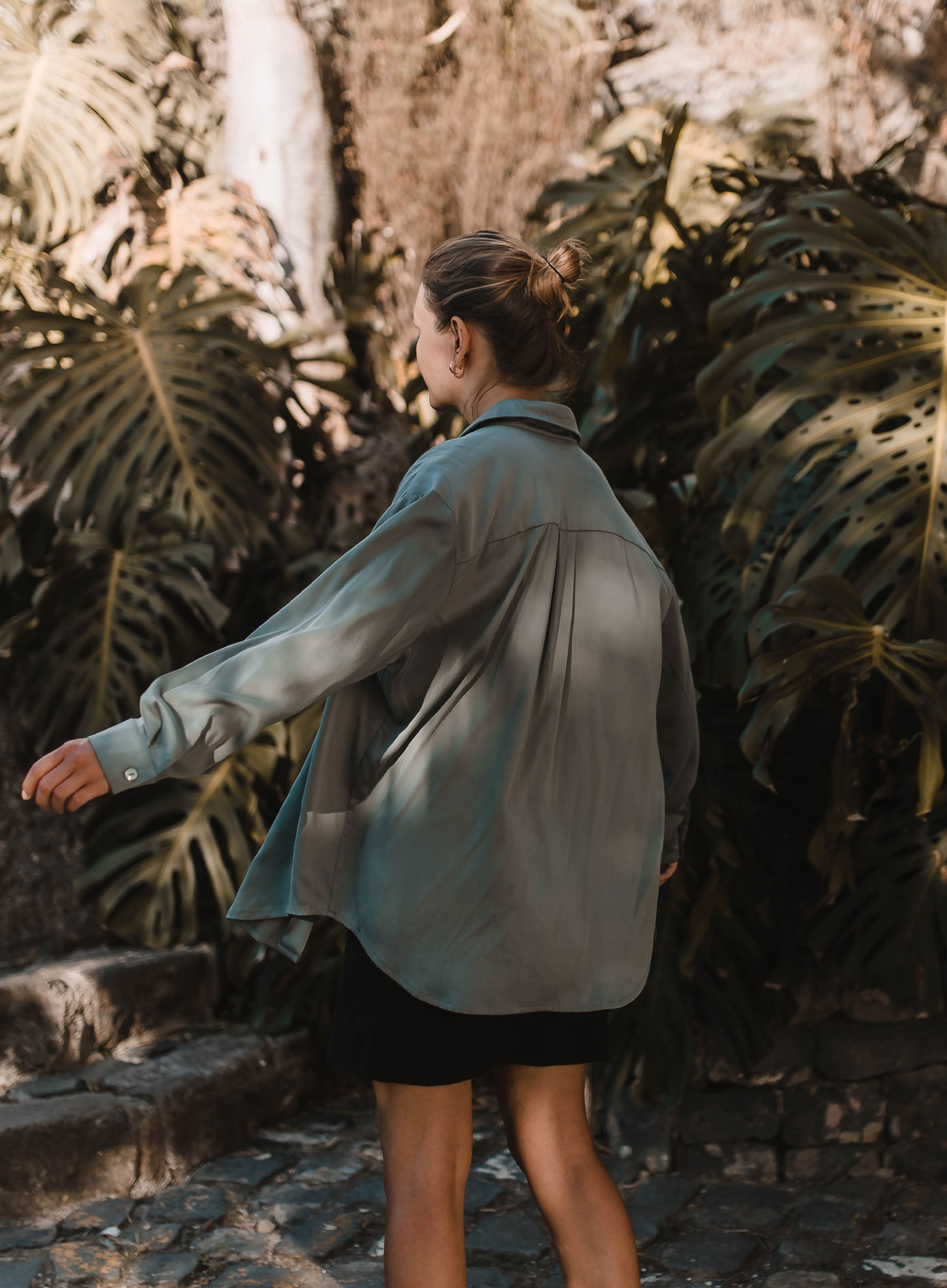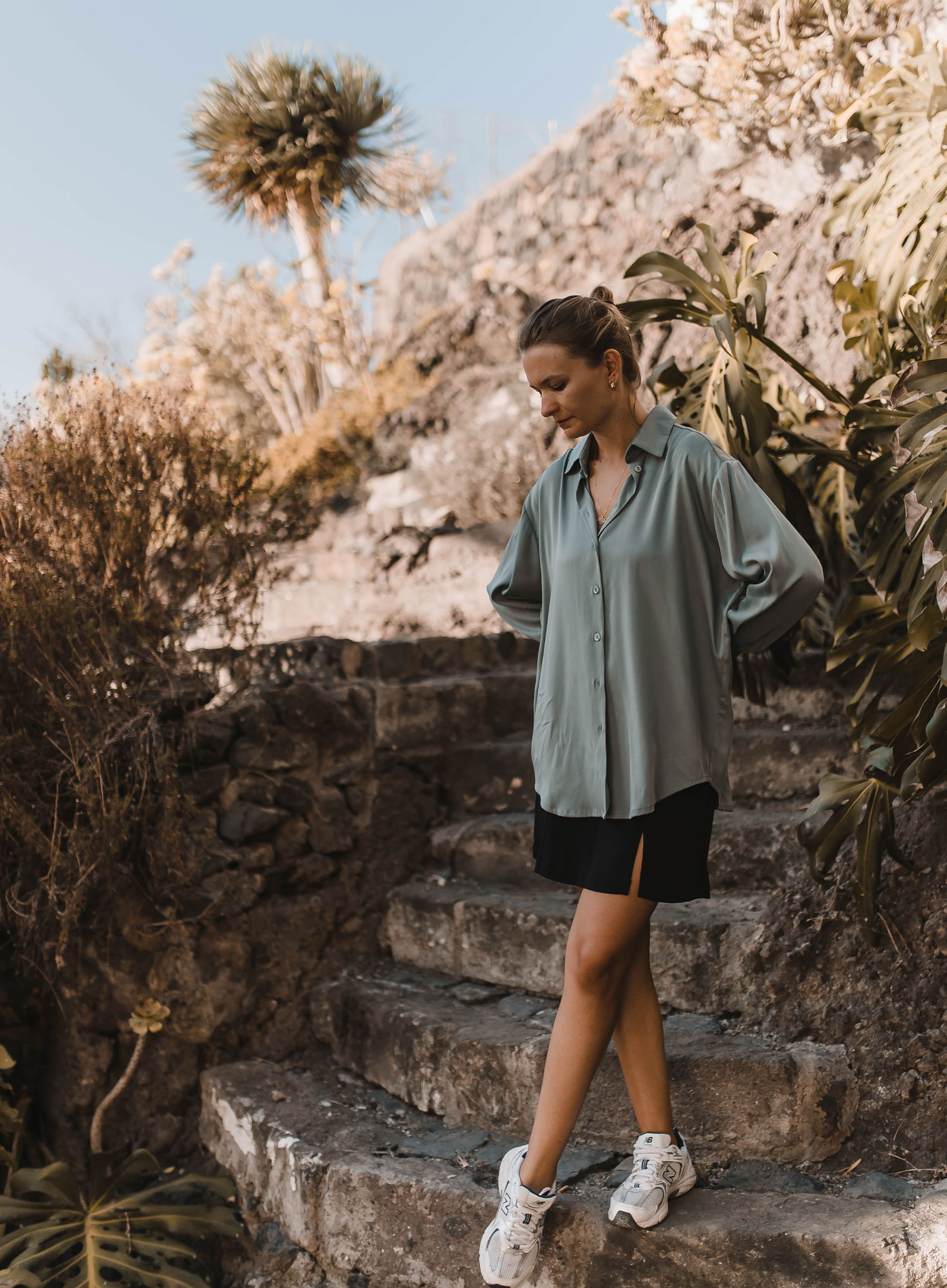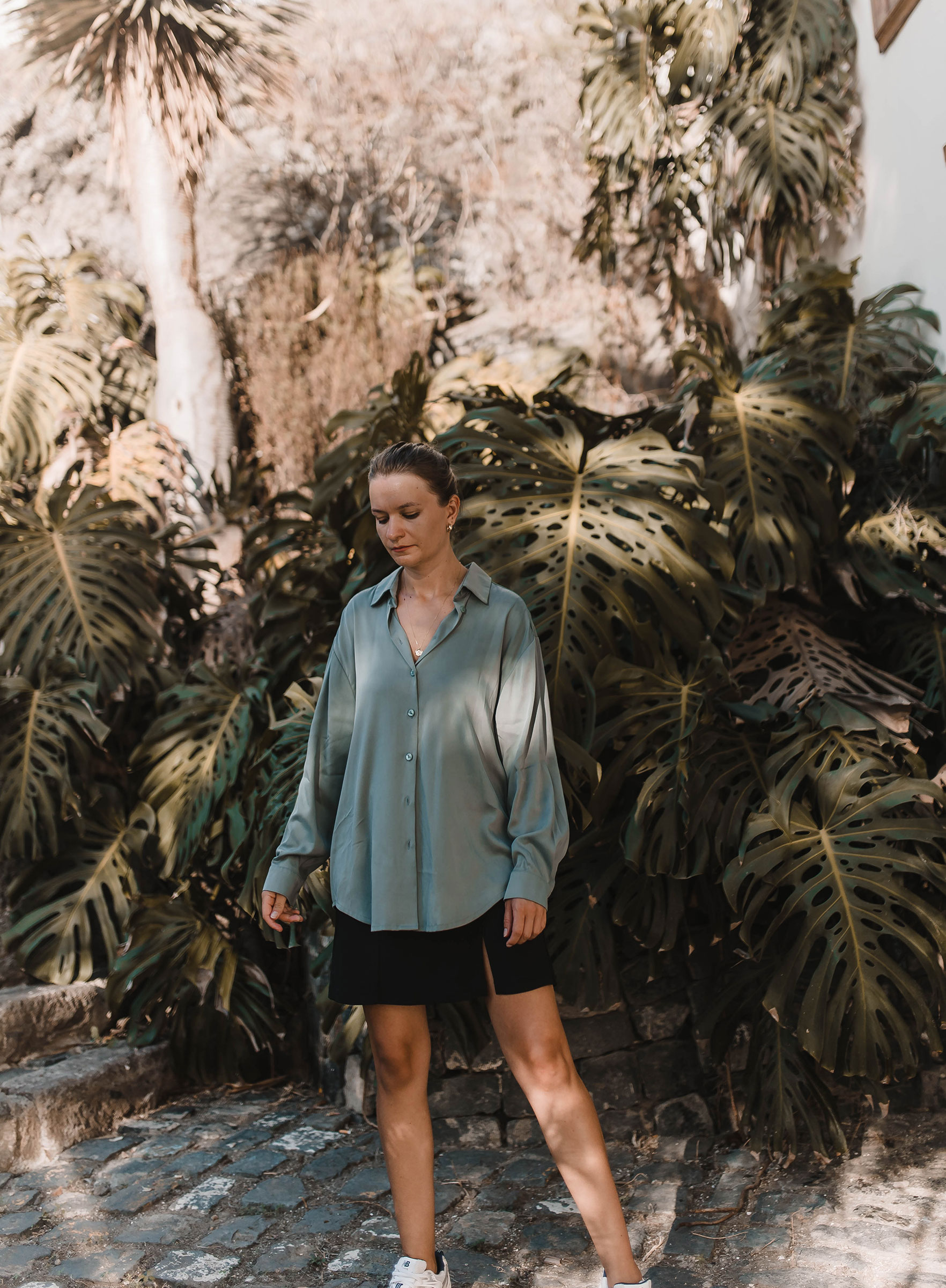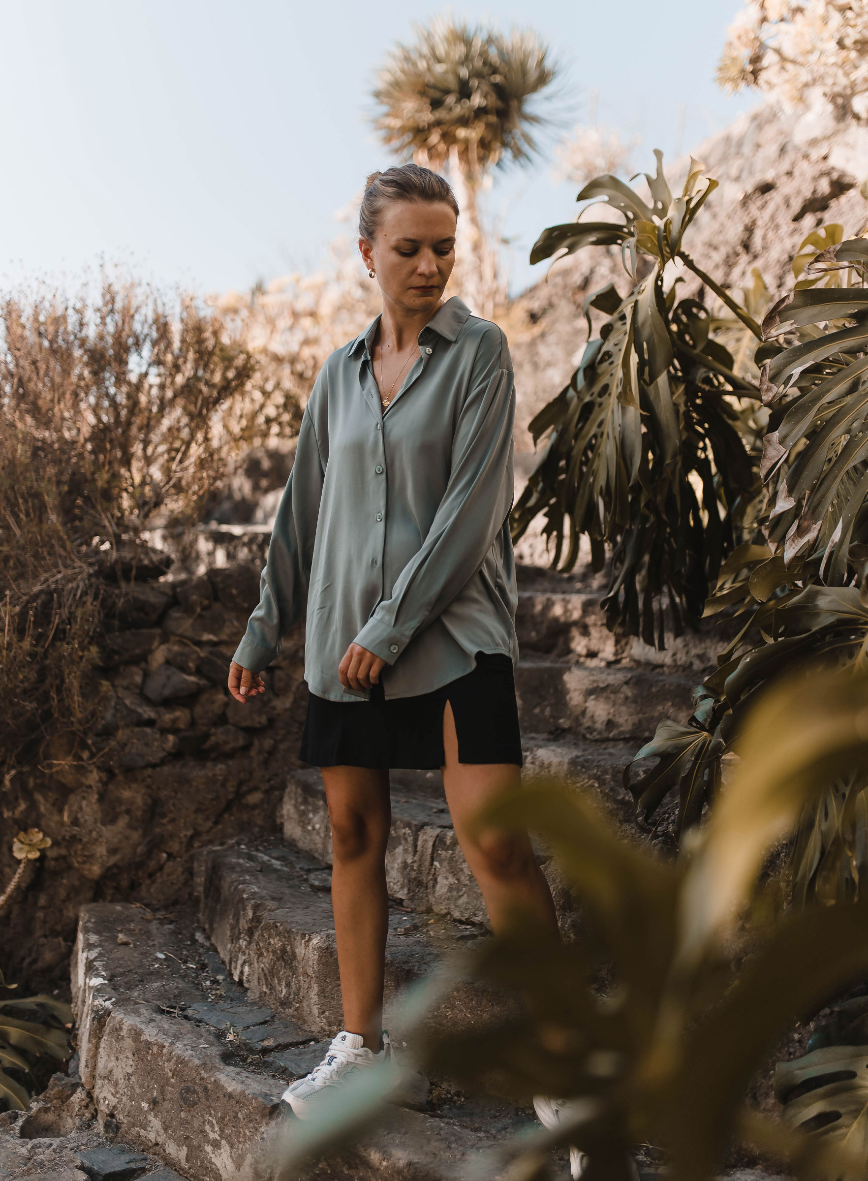 Koszula często gra główną rolę naszych outfitów. Ta tencelowa piękność, choć powstała w duecie ze spodniami, spokojnie odnajdzie się na imprezie solo. Ma oversizowy i nieco dłuższy krój, więc z legginsami będzie grała koncertowo, zaś z bliźniaczymi szwedami bardziej elegancko. Uszyliśmy ją z tencelu, który subtelnie się mieni i pięknie leży na sylwetce. Pssst Koniecznie sprawdź spodnie, które uszyliśmy w komplecie.