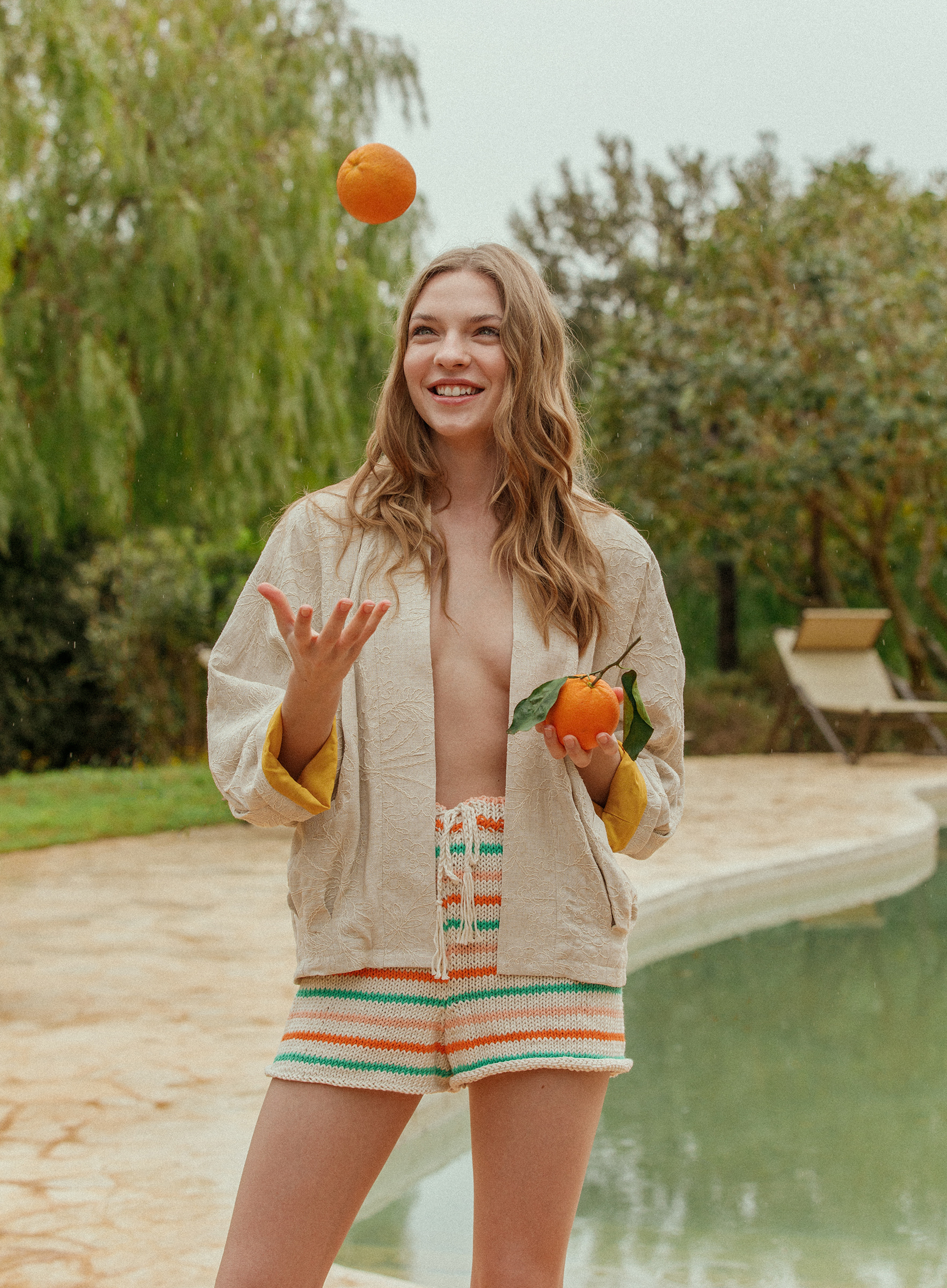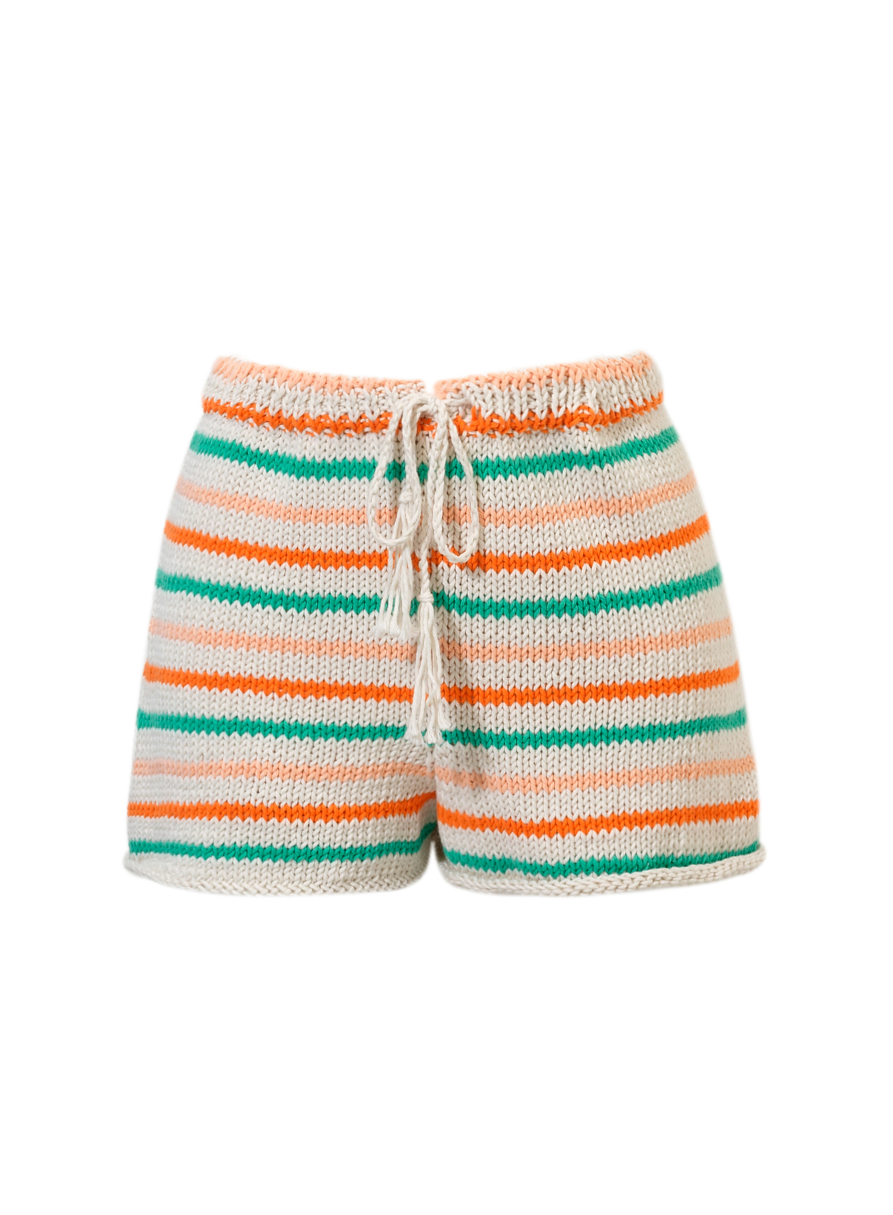 Ręczne dziergane, luźne spodenki w paski. Wiązane w pasie i wykończone ściągaczem. Troczki zakończone chwostami. Na zamówienie dostępne w innych kolorach.