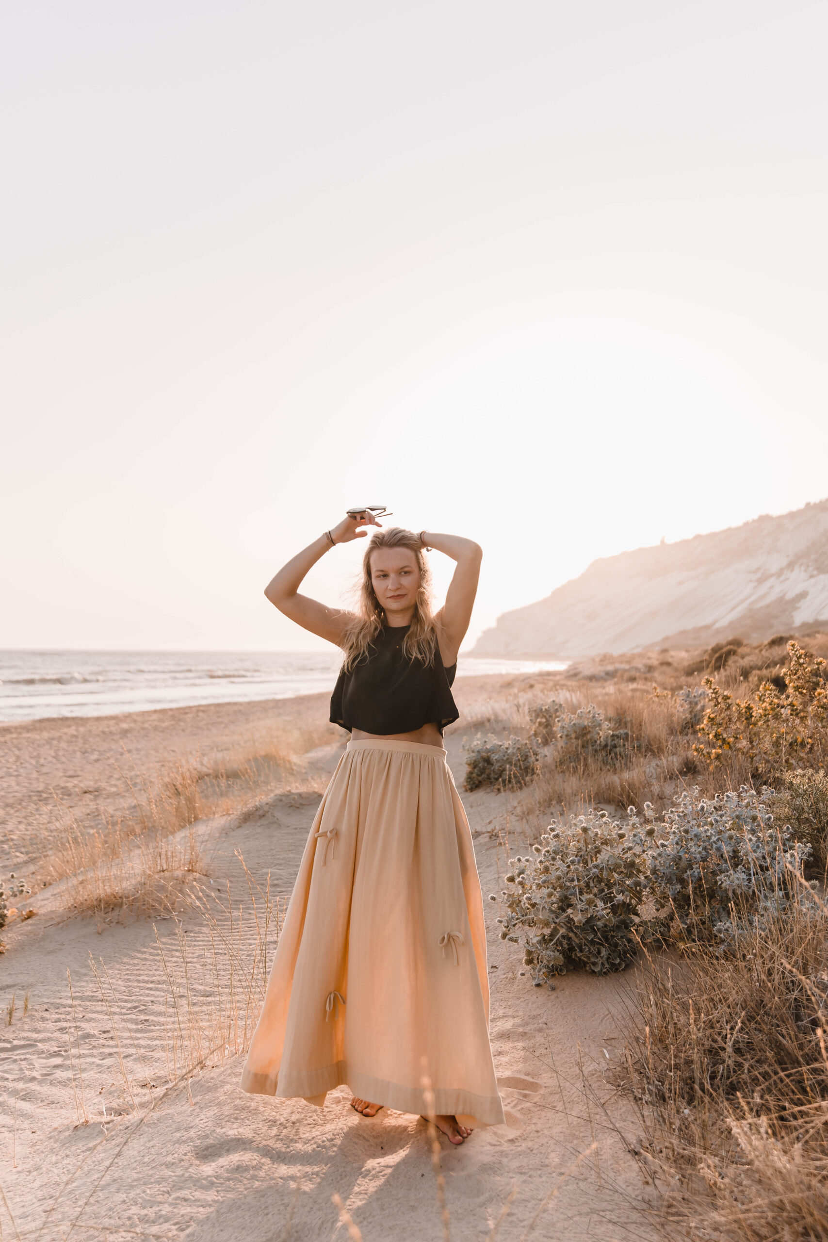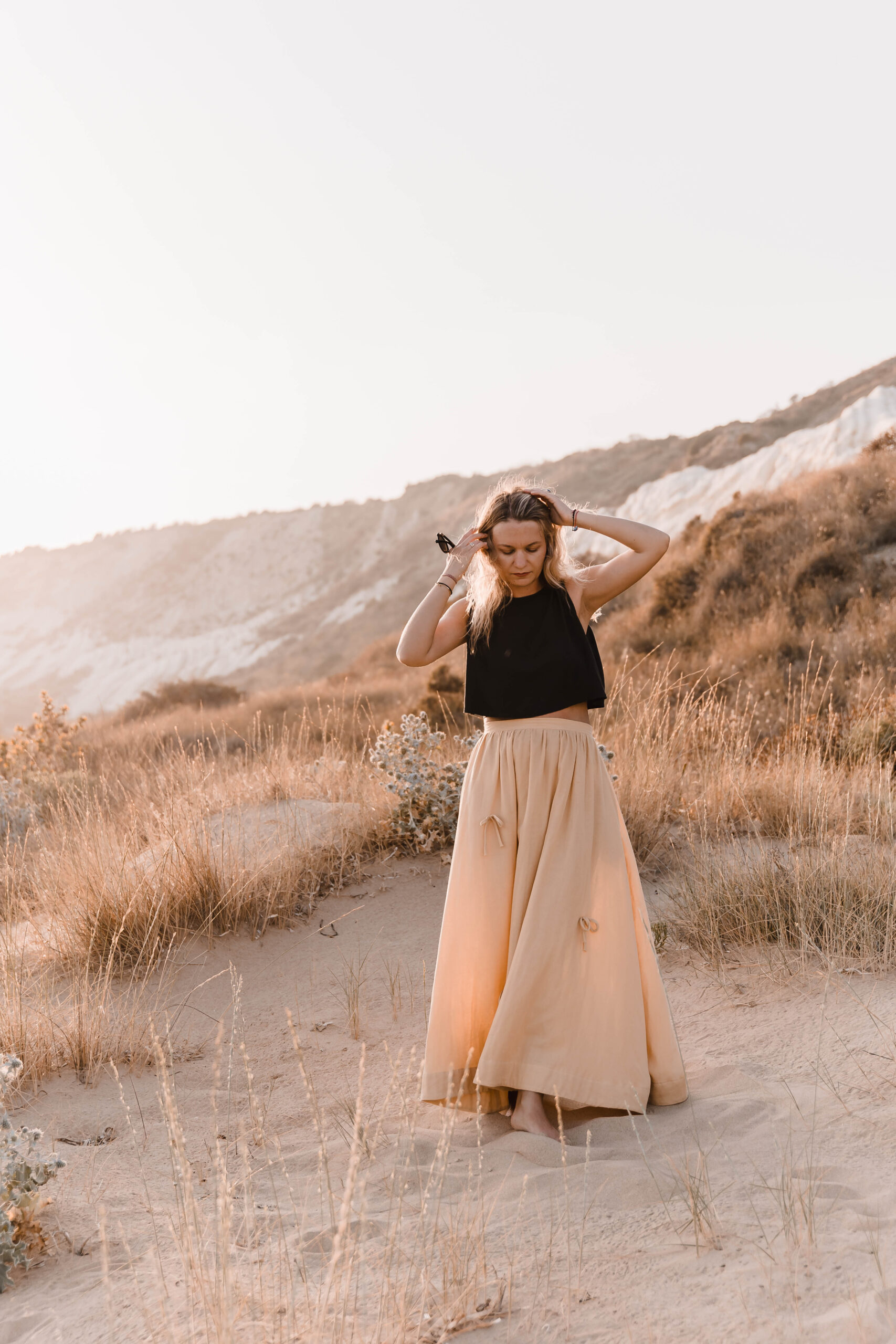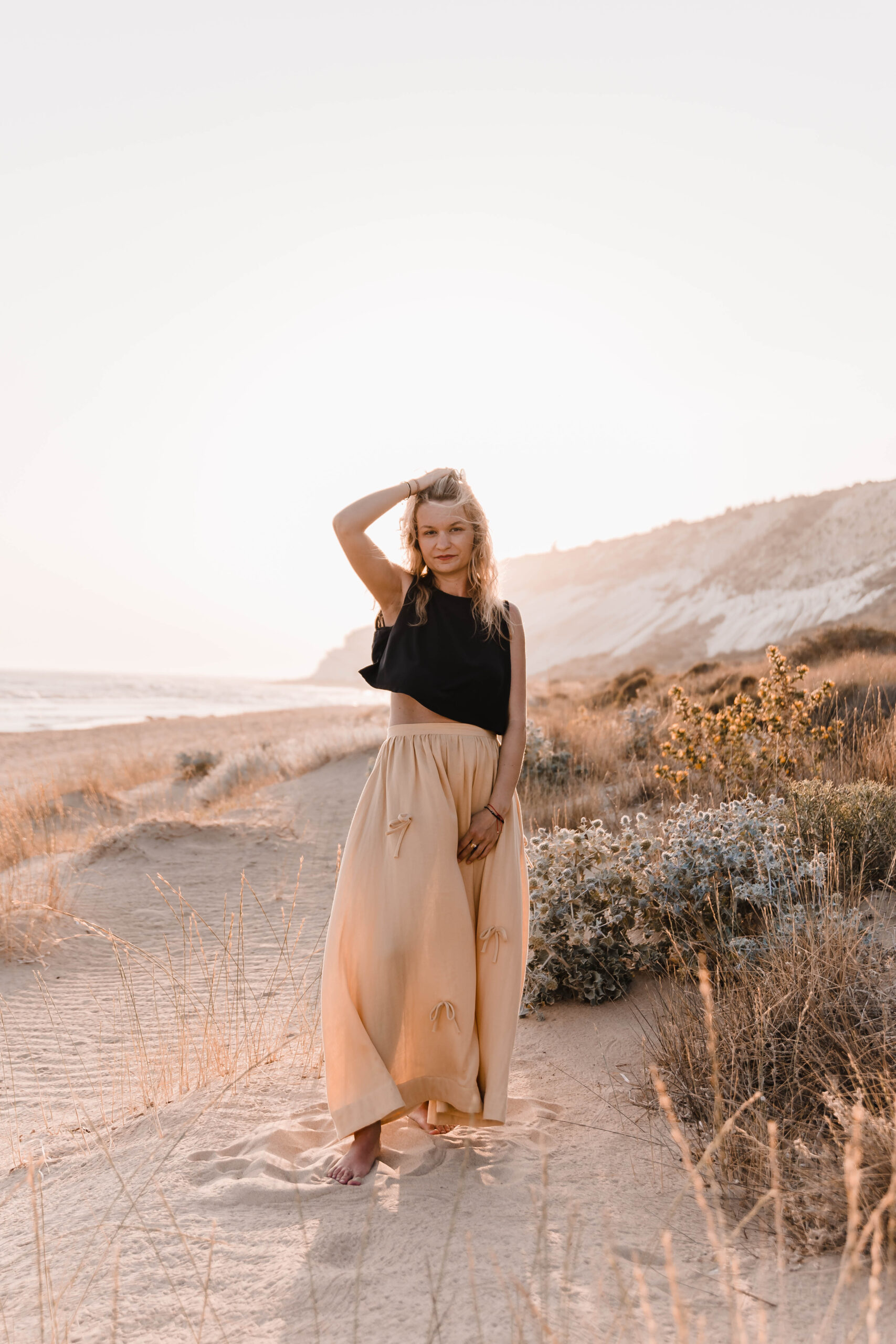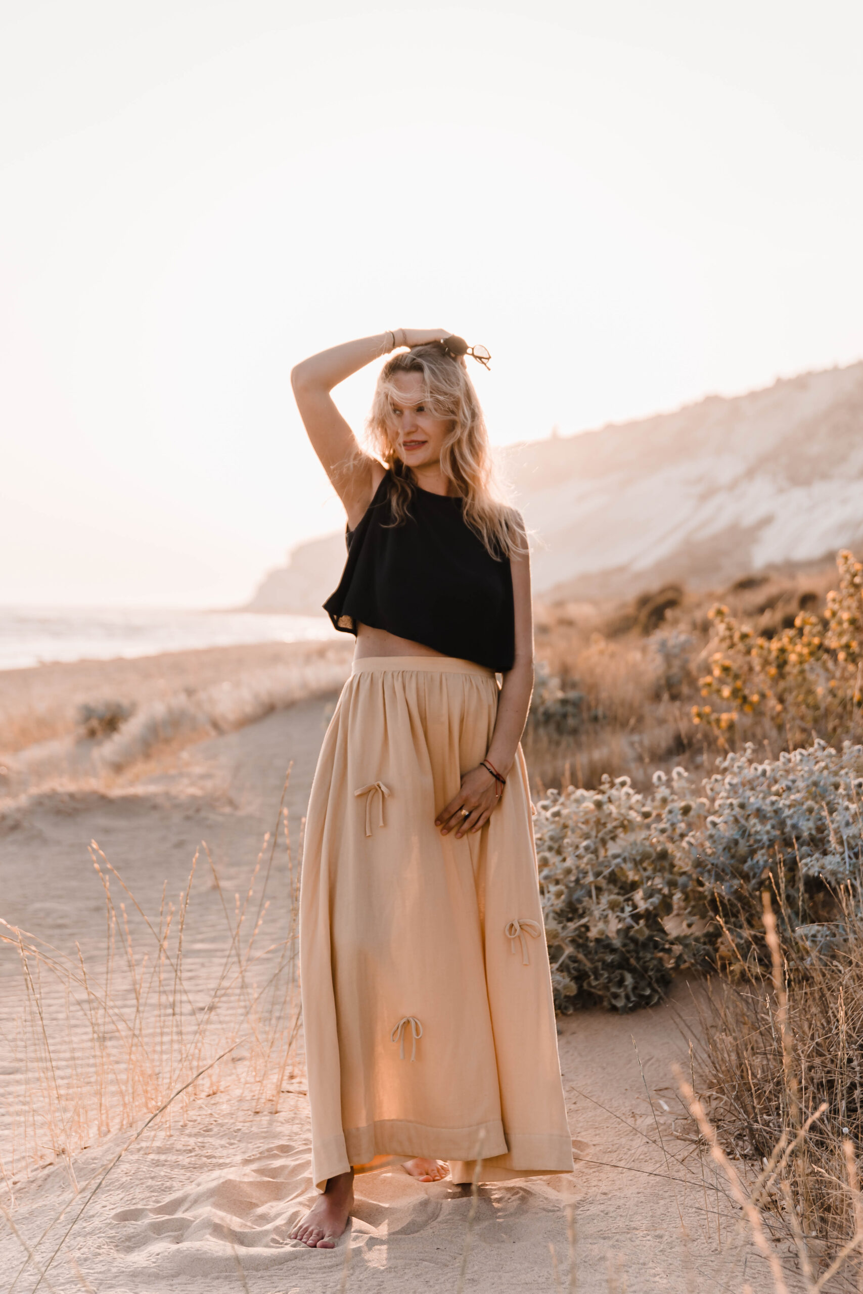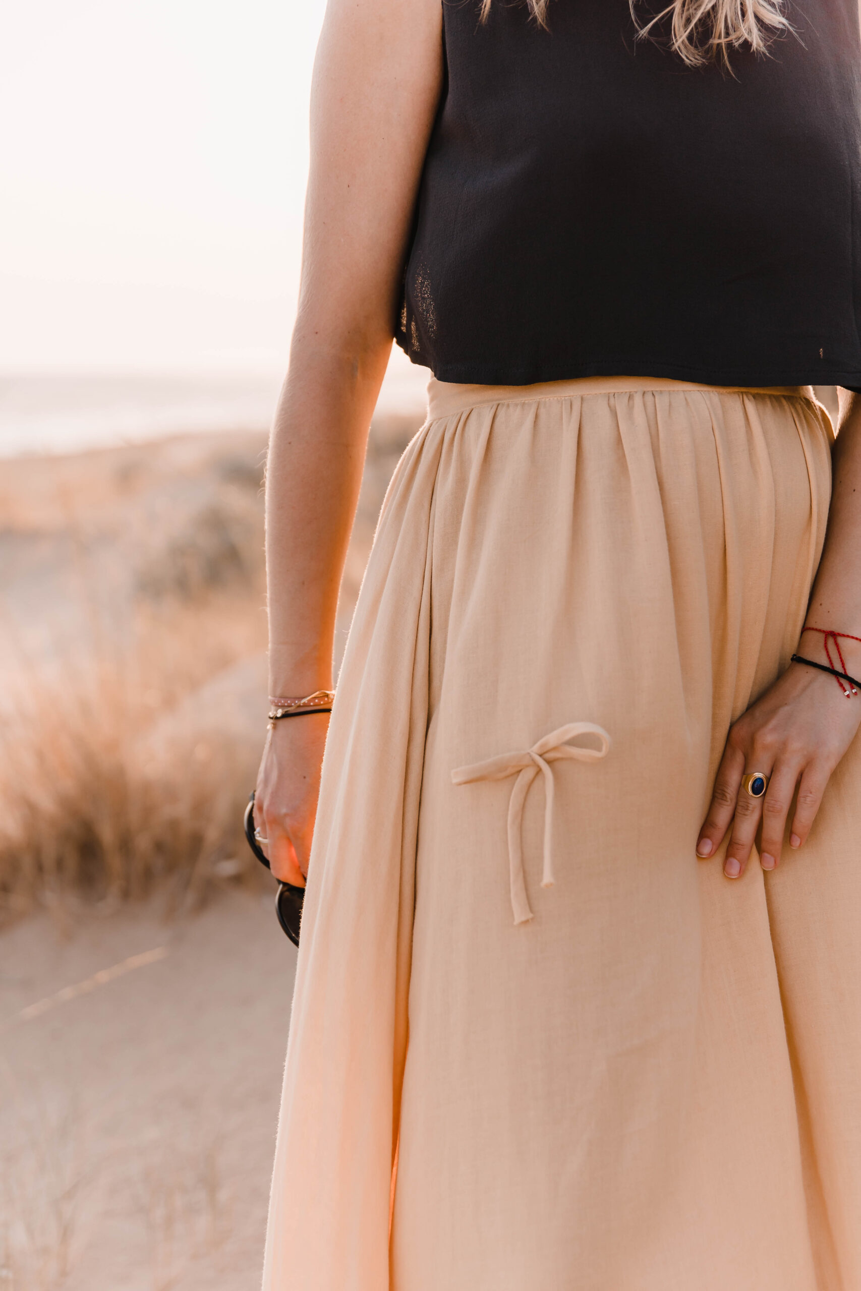 Delikatna, a zarazem pełna charakteru – ta spódnica to ukłon w stronę kunsztu krawiectwa. Uszyta z dbałością o każdy detal, skrywa kieszenie w szwach bocznych oraz wykończenie z podwinięciem u dołu, które nadaje jej eleganckiego sznytu. Na całości rozmieszczone są subtelne, ręcznie doszyte kokardki, dodające całości romantycznego akcentu. Skomplikowany proces szycia sprawia, że każda sztuka jest małym dziełem sztuki – idealnym zarówno na spacer po plaży o zachodzie słońca, jak i na letnie przyjęcie w ogrodzie.