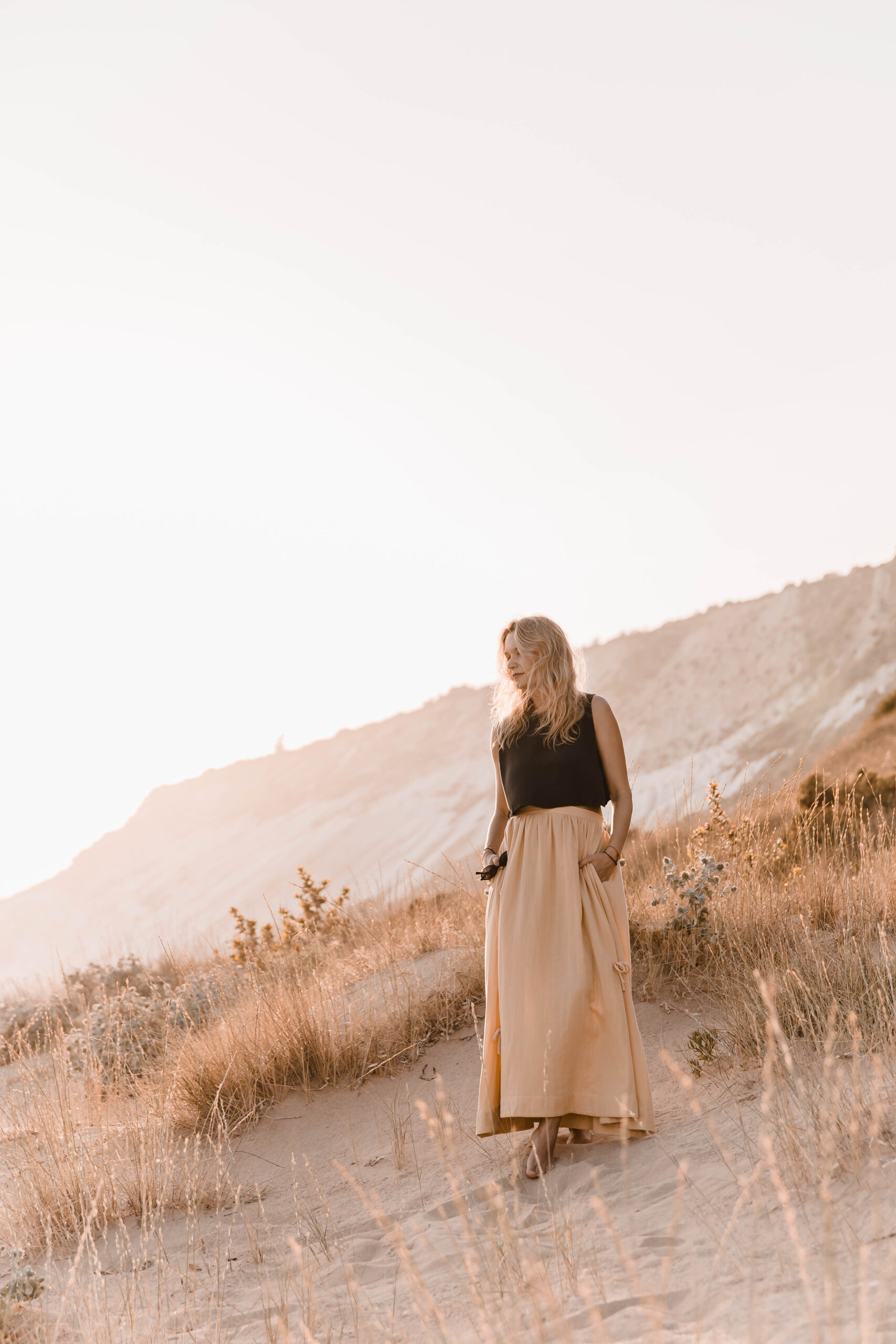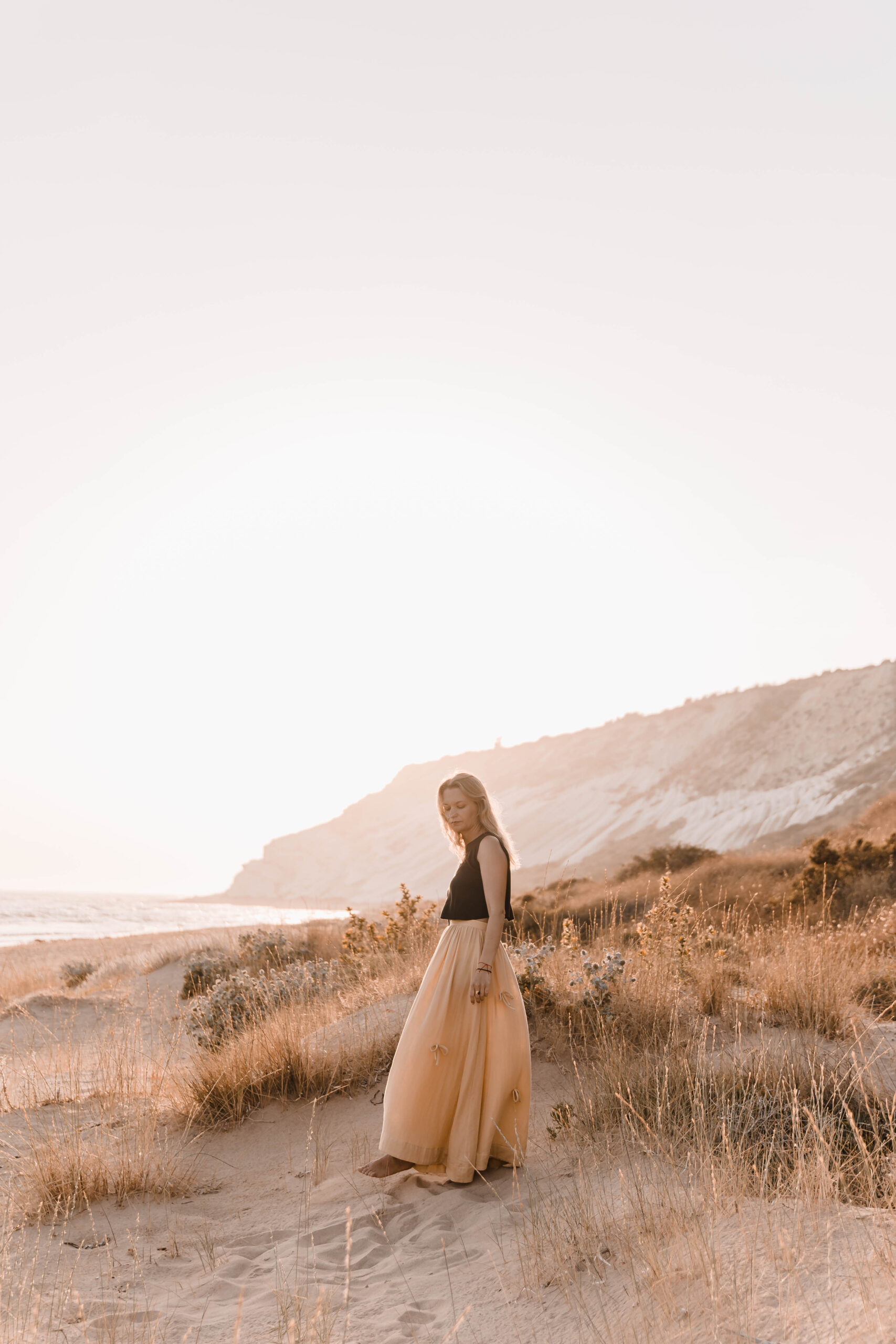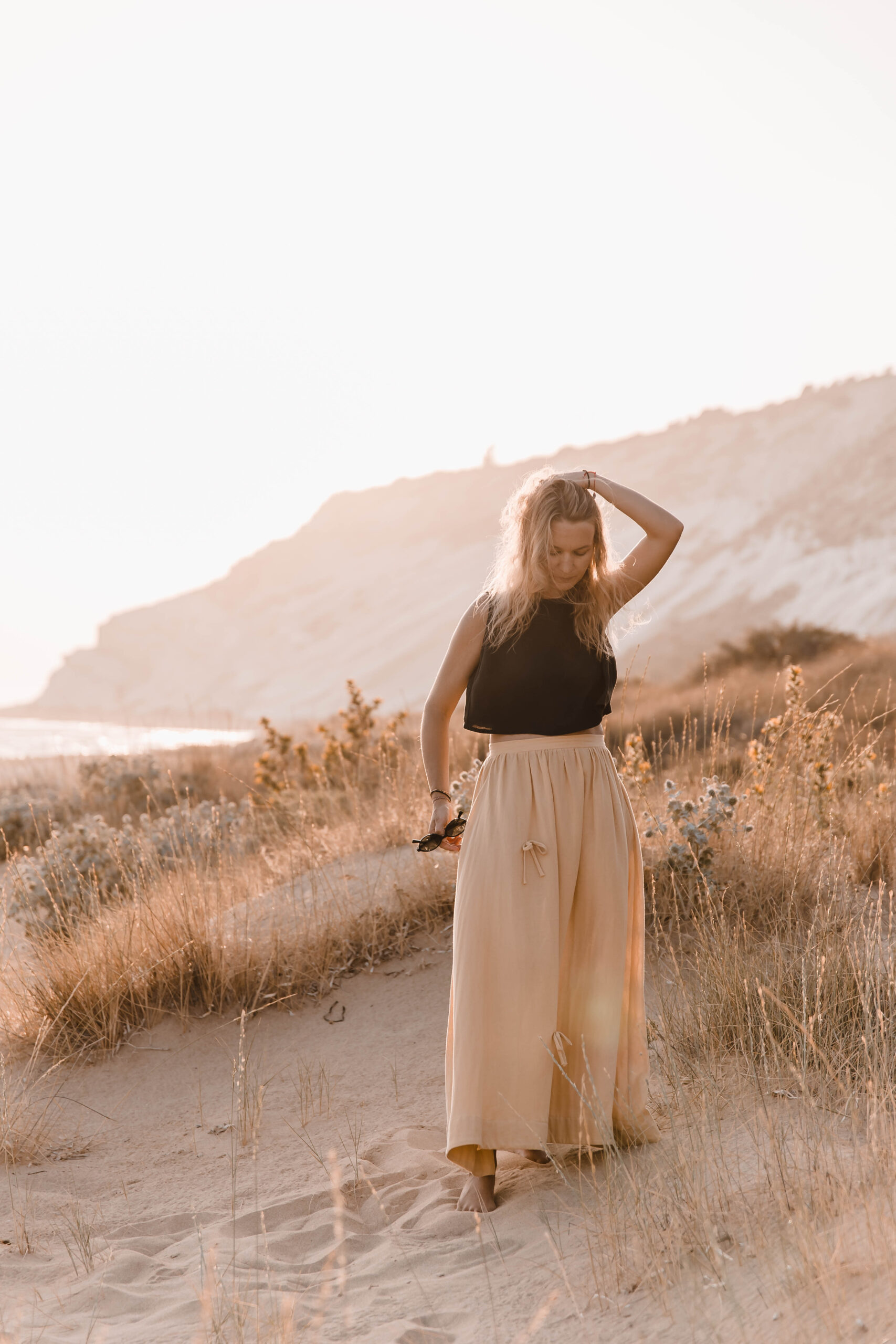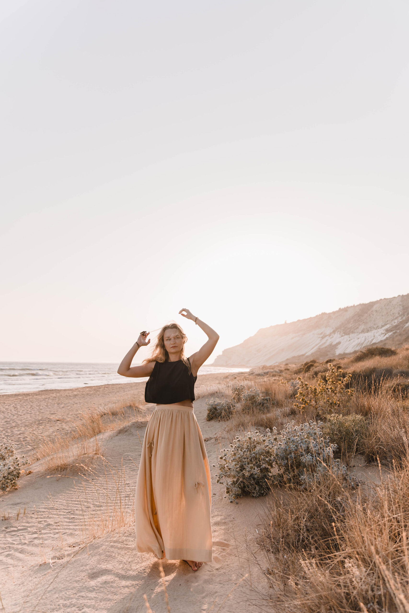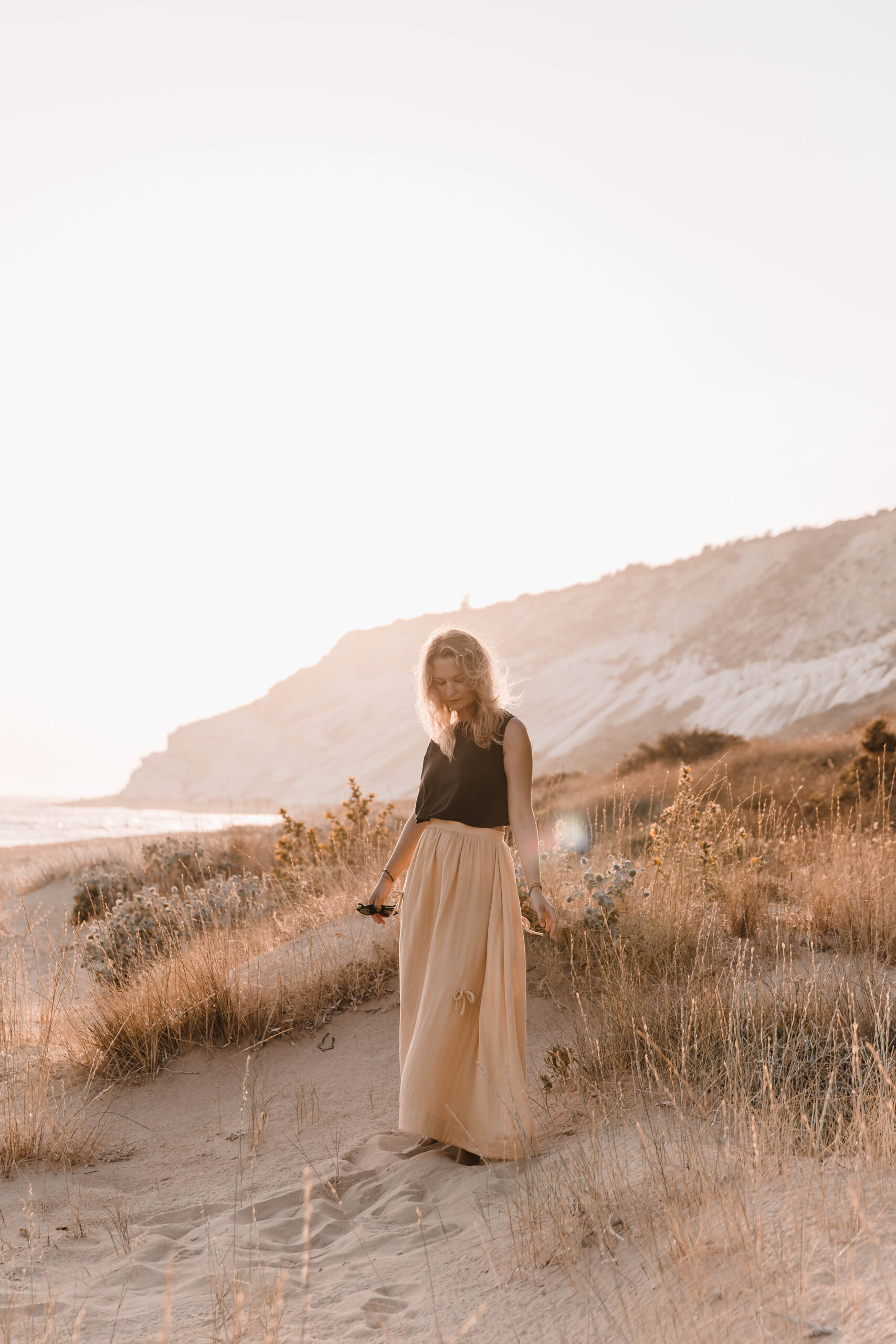 Delikatna, a zarazem pełna charakteru – ta spódnica to ukłon w stronę kunsztu krawiectwa. Uszyta z dbałością o każdy detal, skrywa kieszenie w szwach bocznych oraz wykończenie z podwinięciem u dołu, które nadaje jej eleganckiego sznytu. Na całości rozmieszczone są subtelne, ręcznie doszyte kokardki, dodające całości romantycznego akcentu. Skomplikowany proces szycia sprawia, że każda sztuka jest małym dziełem sztuki – idealnym zarówno na spacer po plaży o zachodzie słońca, jak i na letnie przyjęcie w ogrodzie.