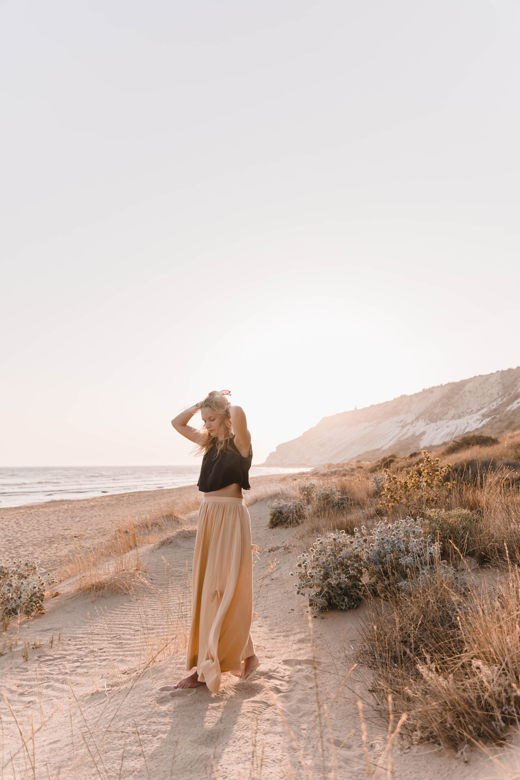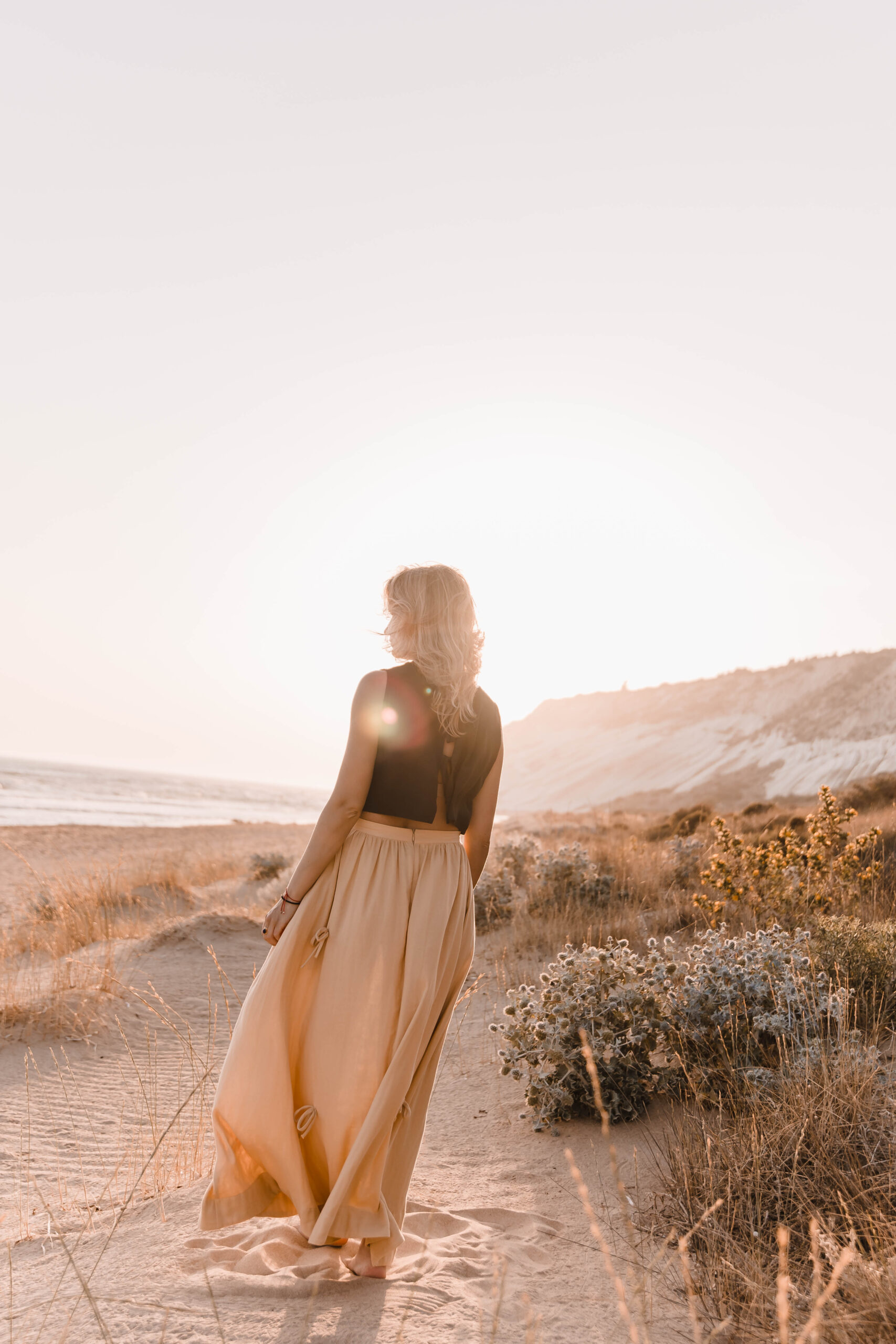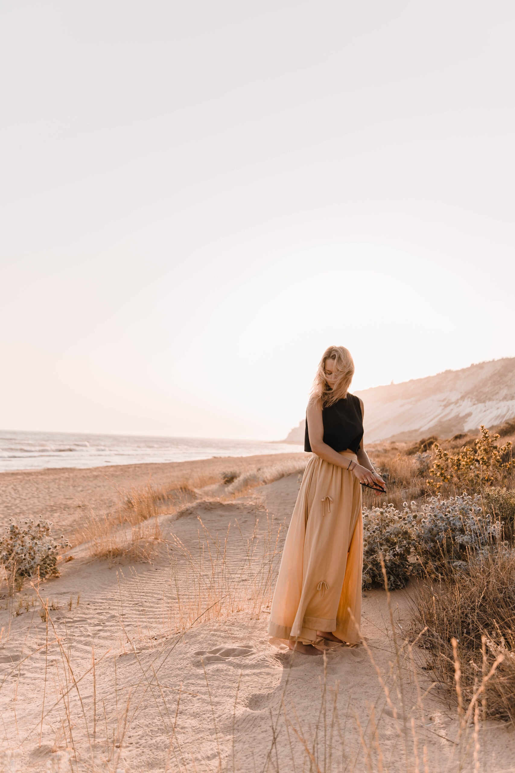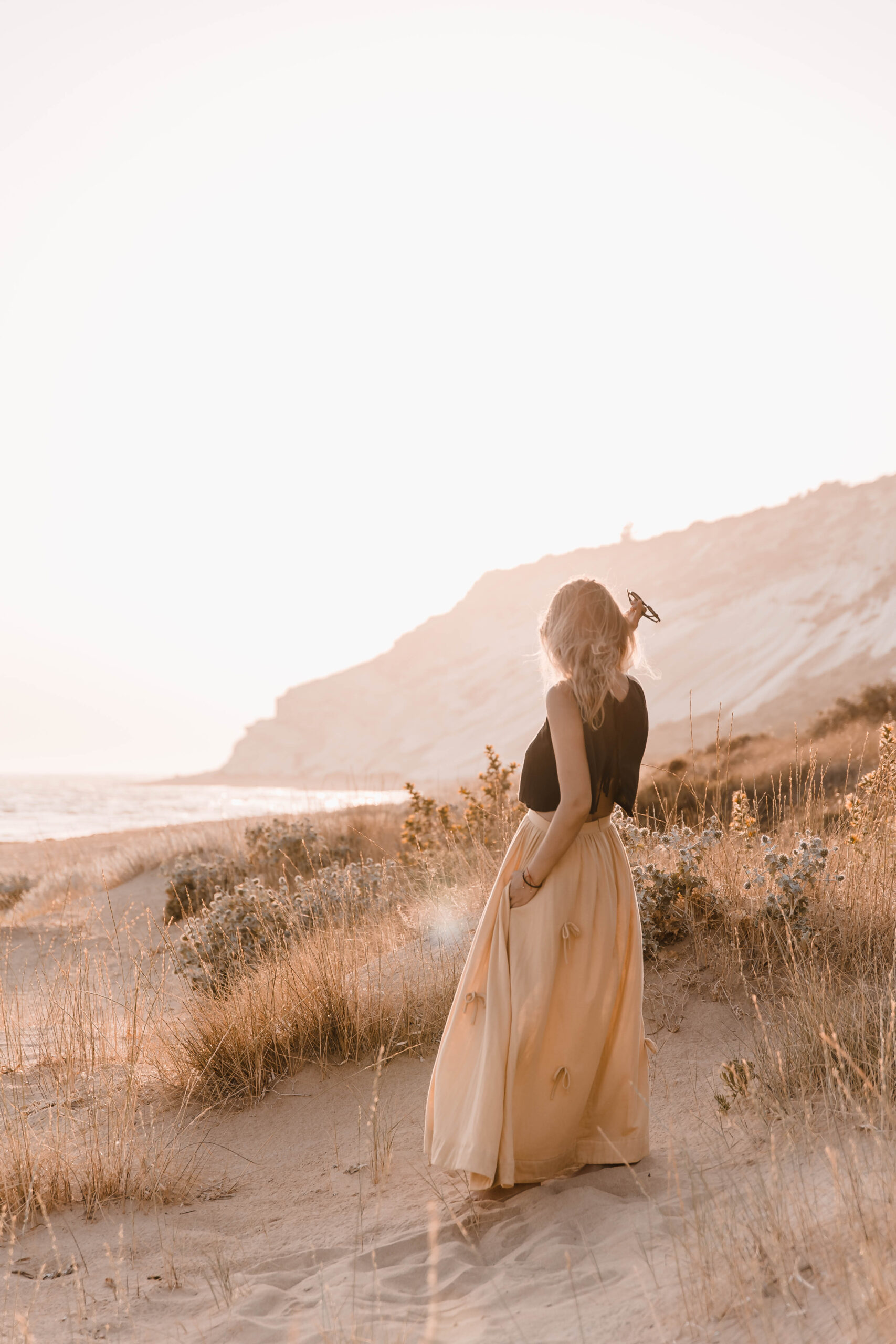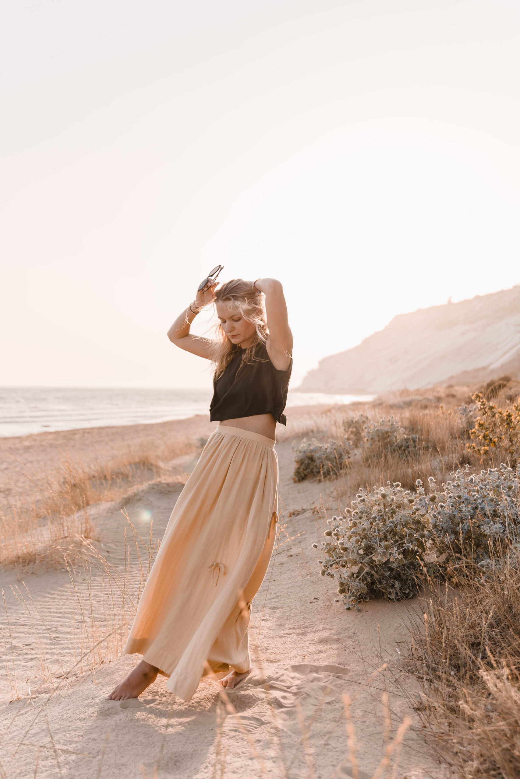 Delikatna, a zarazem pełna charakteru – ta spódnica to ukłon w stronę kunsztu krawiectwa. Uszyta z dbałością o każdy detal, skrywa kieszenie w szwach bocznych oraz wykończenie z podwinięciem u dołu, które nadaje jej eleganckiego sznytu. Na całości rozmieszczone są subtelne, ręcznie doszyte kokardki, dodające całości romantycznego akcentu. Skomplikowany proces szycia sprawia, że każda sztuka jest małym dziełem sztuki – idealnym zarówno na spacer po plaży o zachodzie słońca, jak i na letnie przyjęcie w ogrodzie.