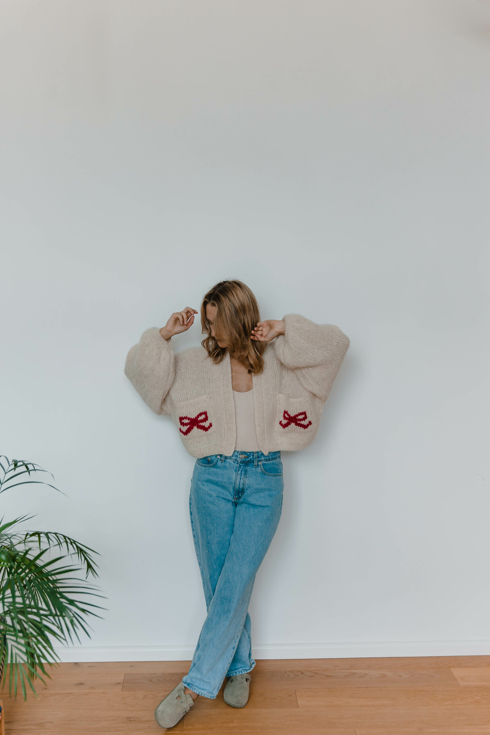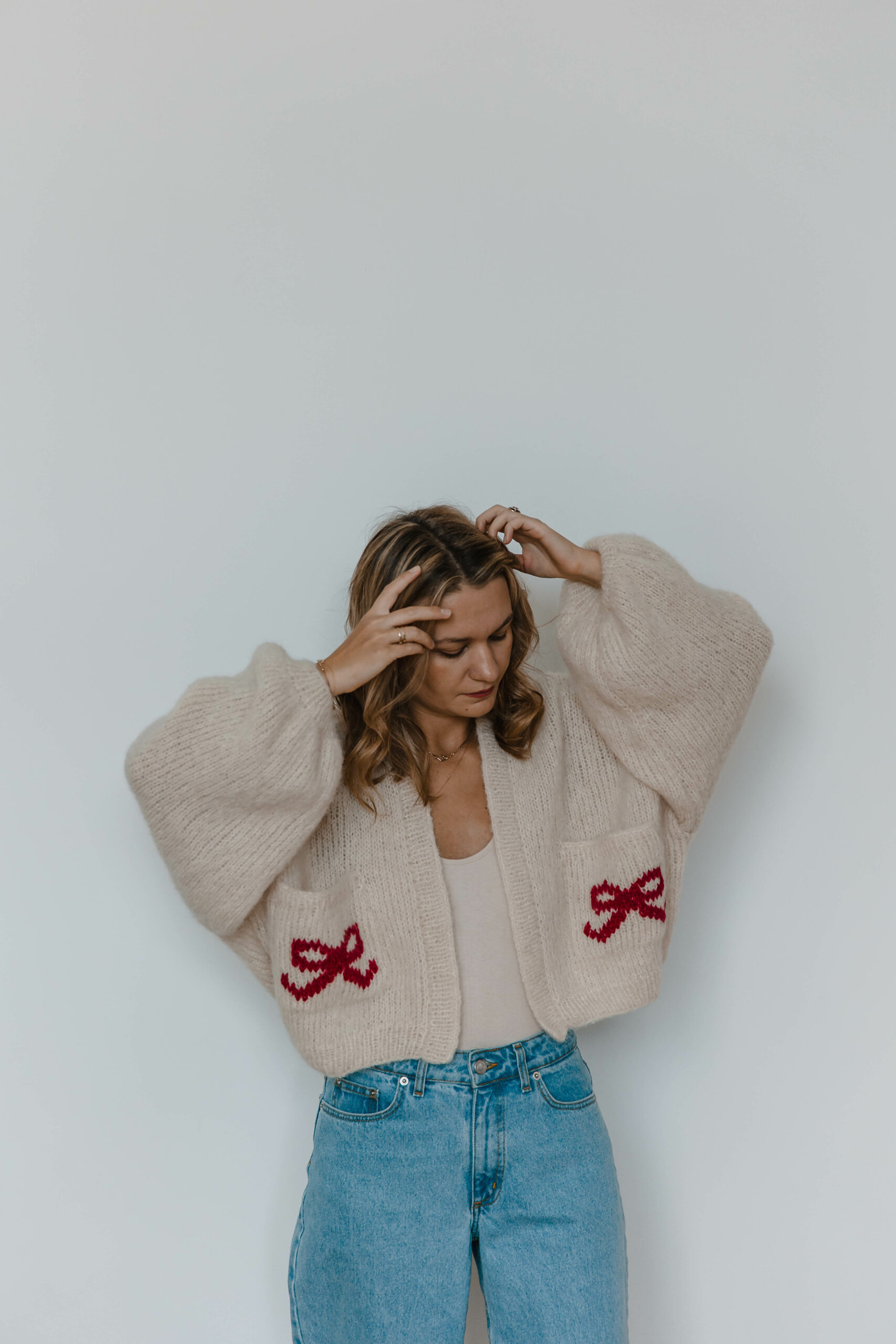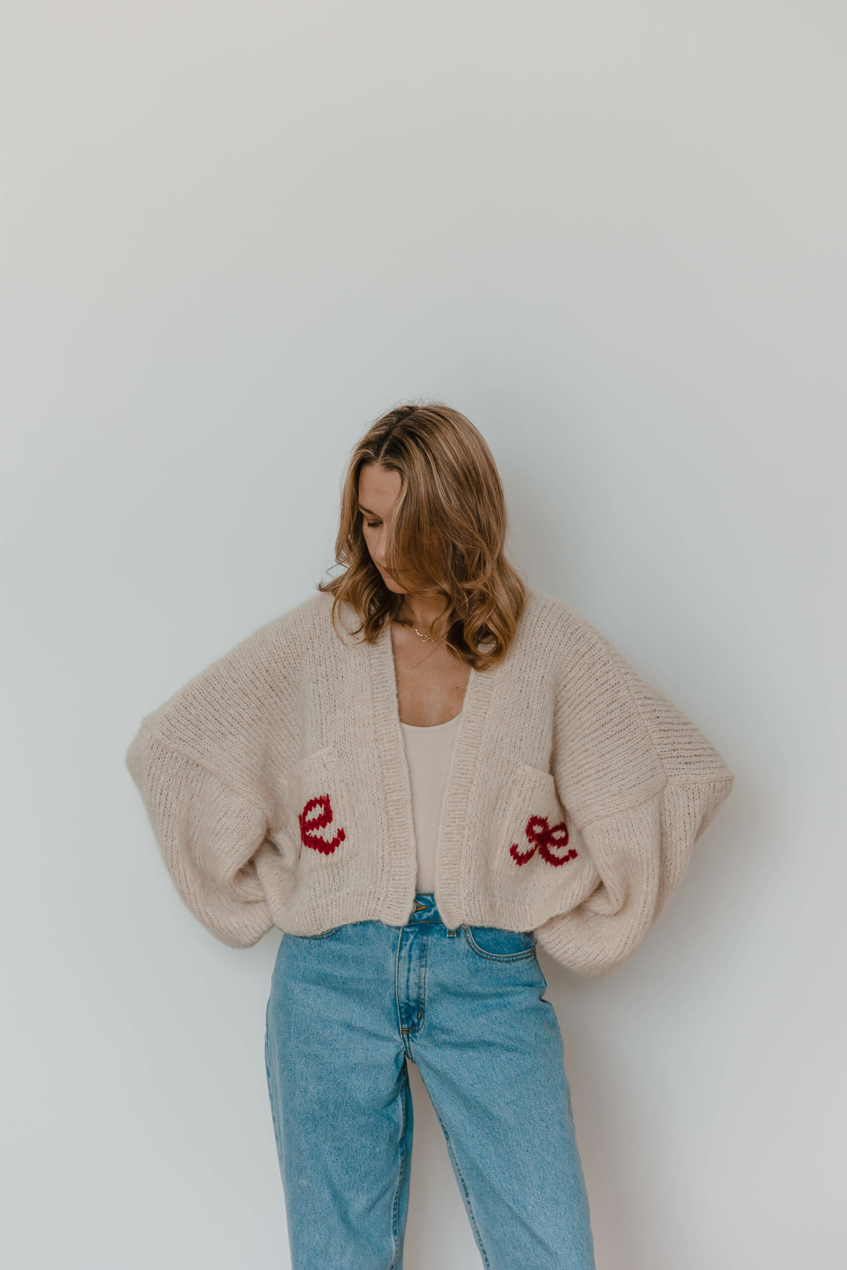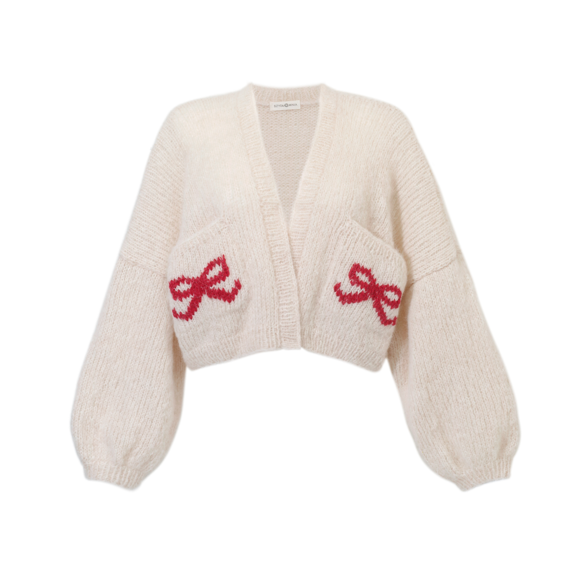 Sweet Bow Cardigan podbije serce każdej romantyczki. Dzięki połączeniu alpaki i jedwabiu uzyskujemy efekt niezwykłej delikatności. Haftowane kokardki są brakującym puzzlem tej dziewczęcej układanki.