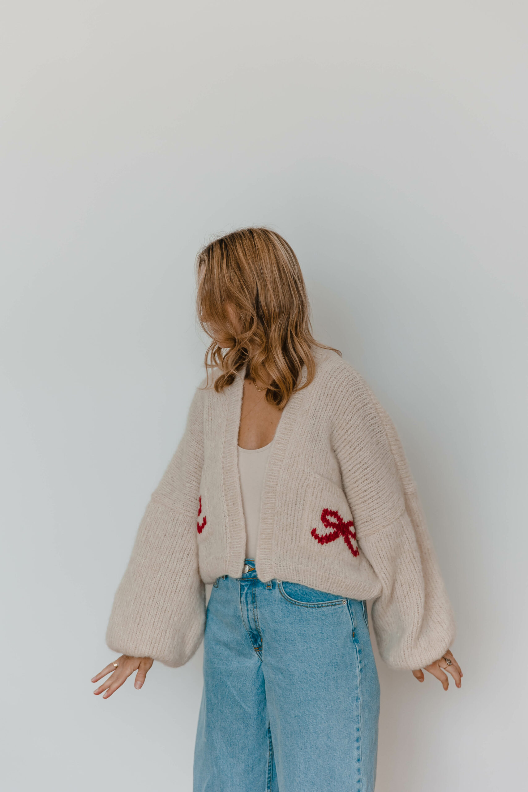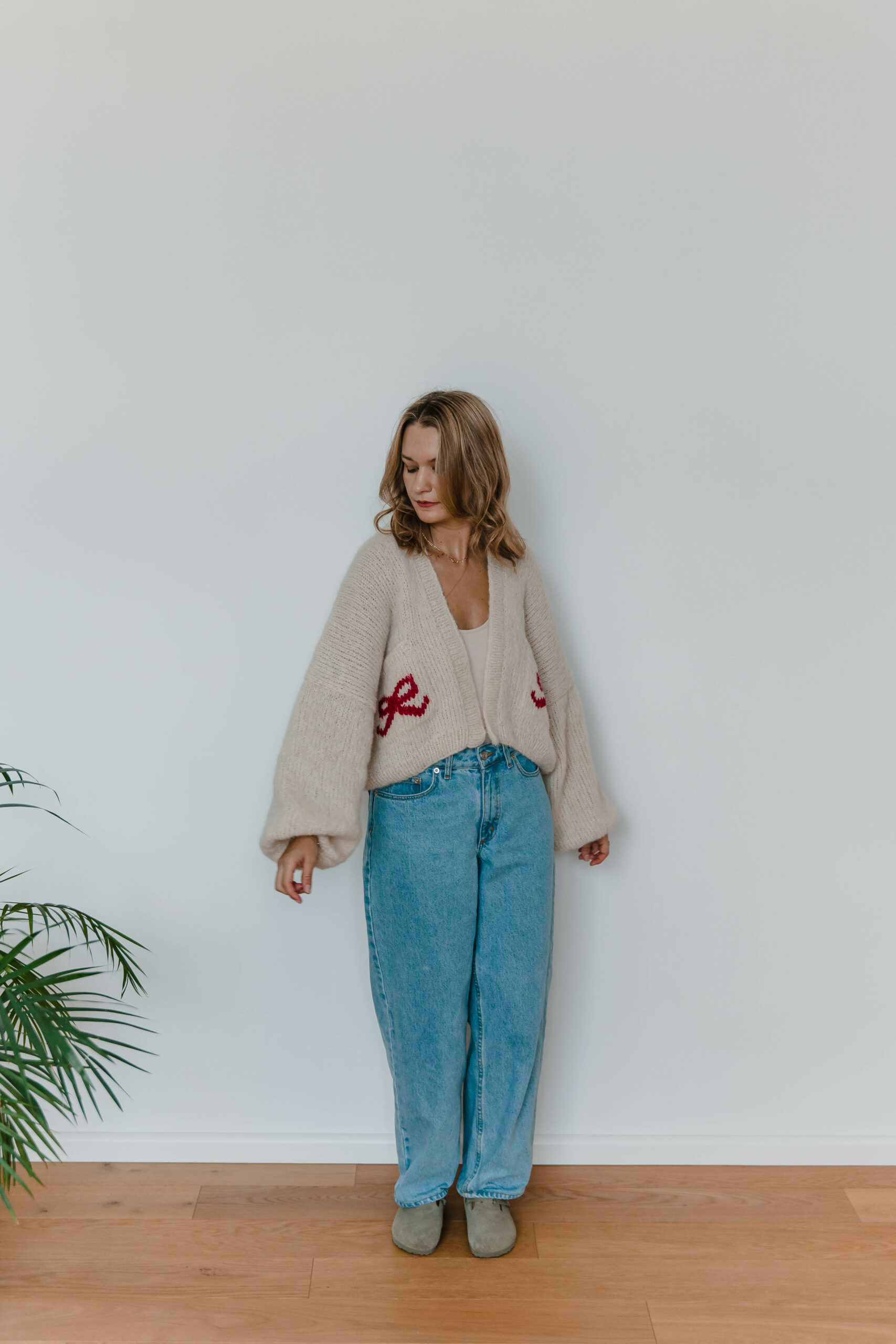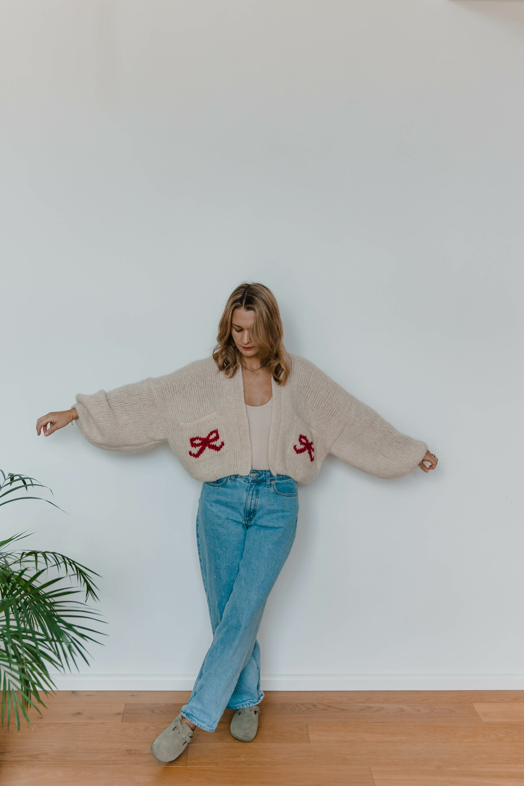 Sweet Bow Cardigan podbije serce każdej romantyczki. Dzięki połączeniu alpaki i jedwabiu uzyskujemy efekt niezwykłej delikatności. Haftowane kokardki są brakującym puzzlem tej dziewczęcej układanki.