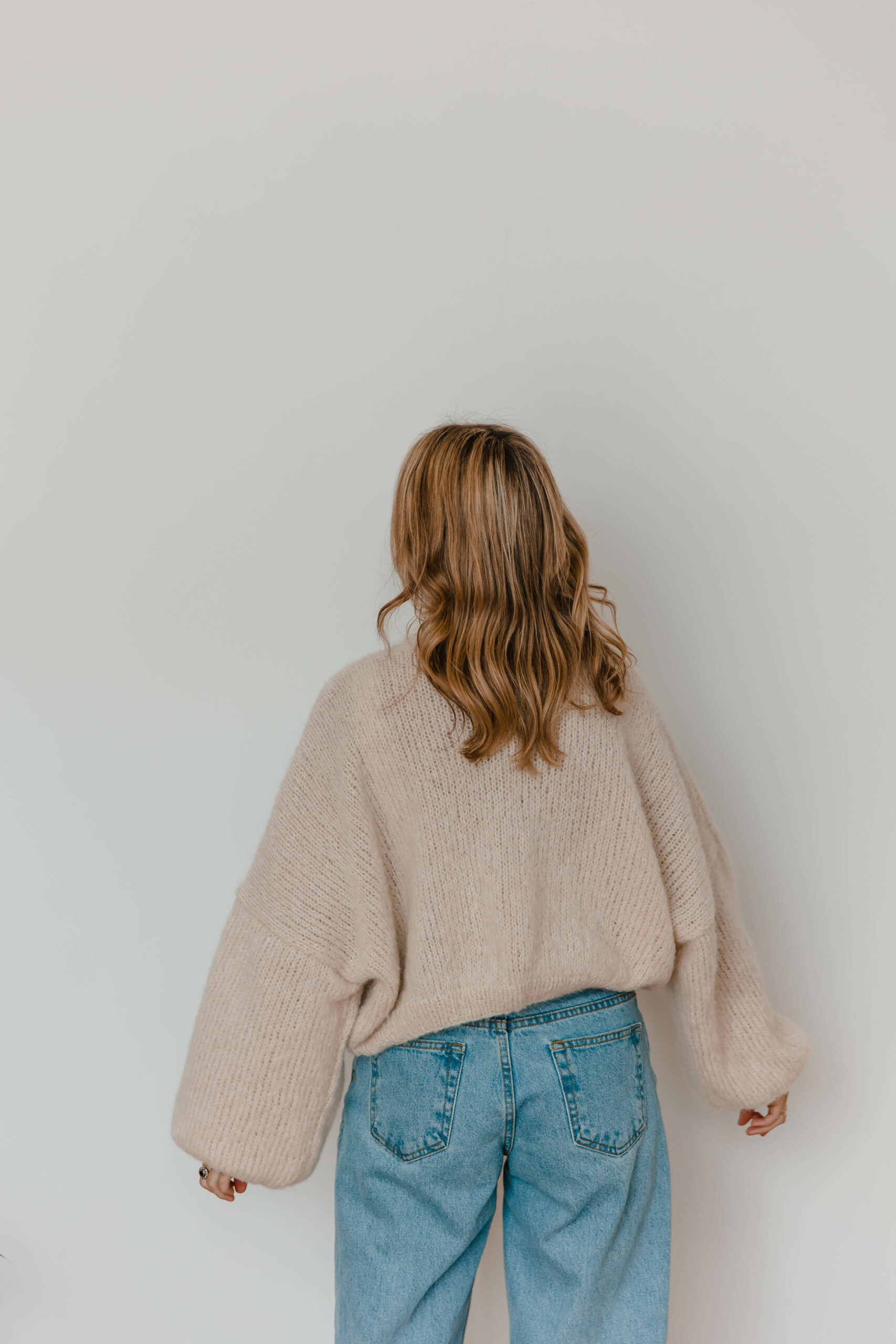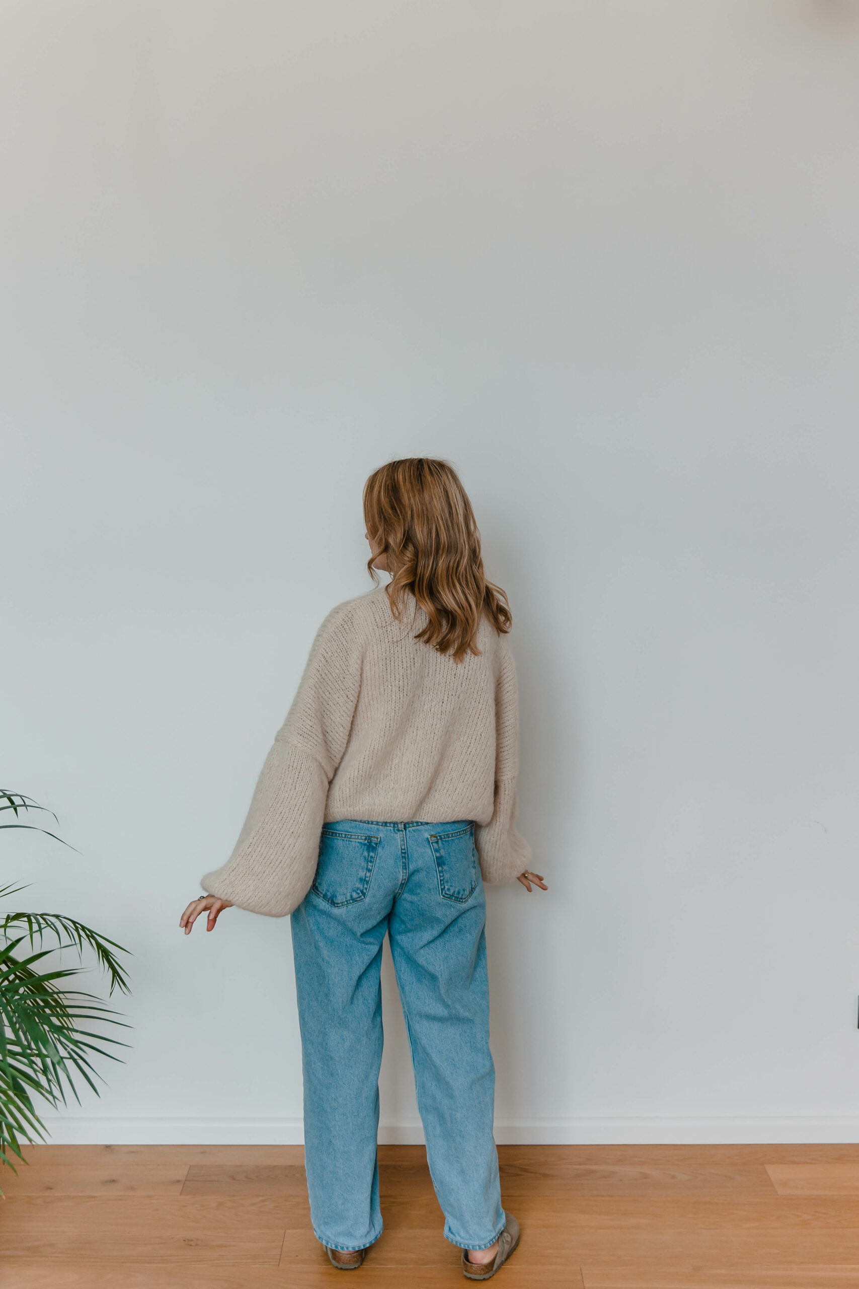 Każdy sweter wykonywany jest ręcznie, dlatego podane wymiary są orientacyjne i mogą się nieznacznie różnić. Należy przyjąć margines +- 3 cm.