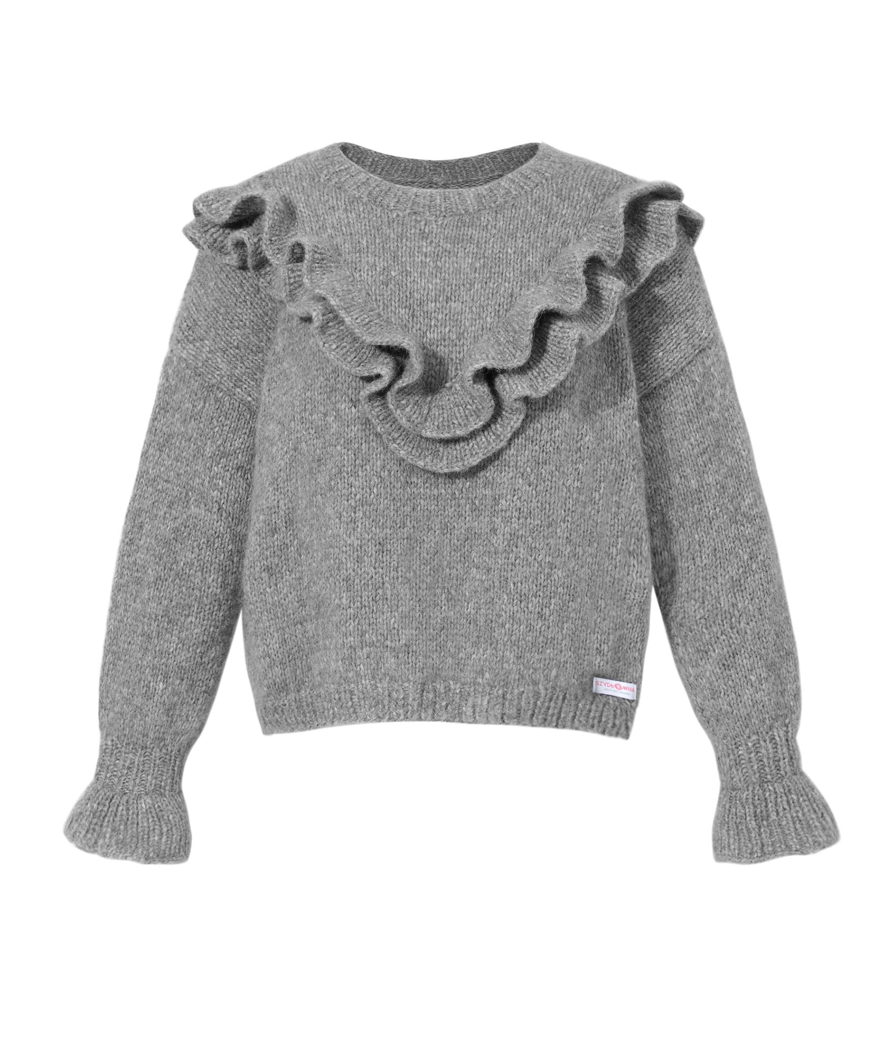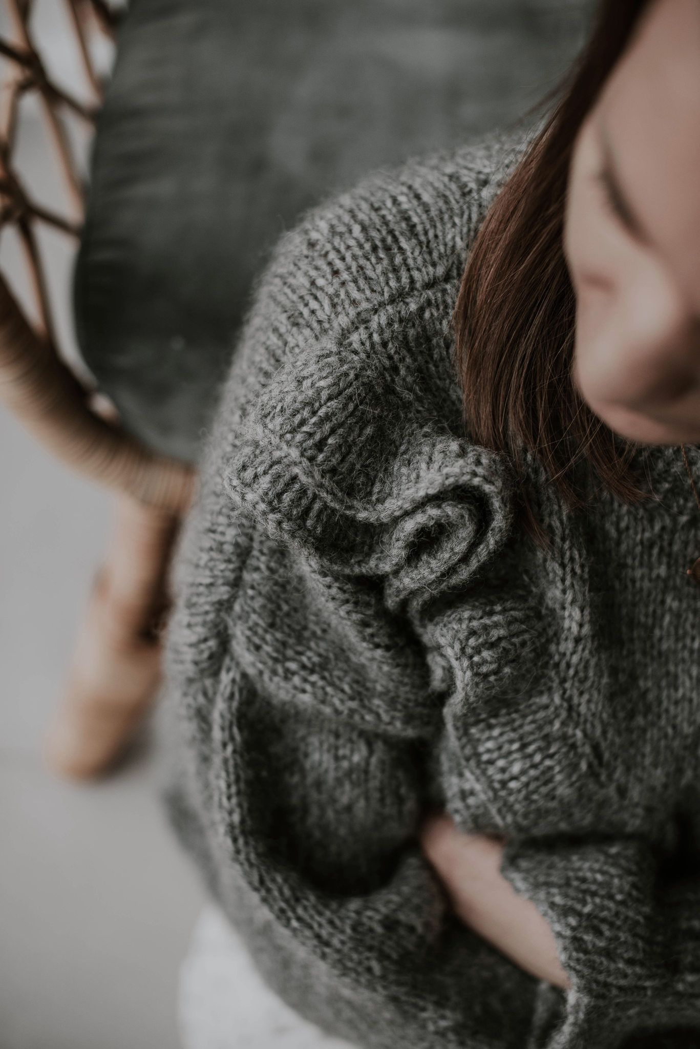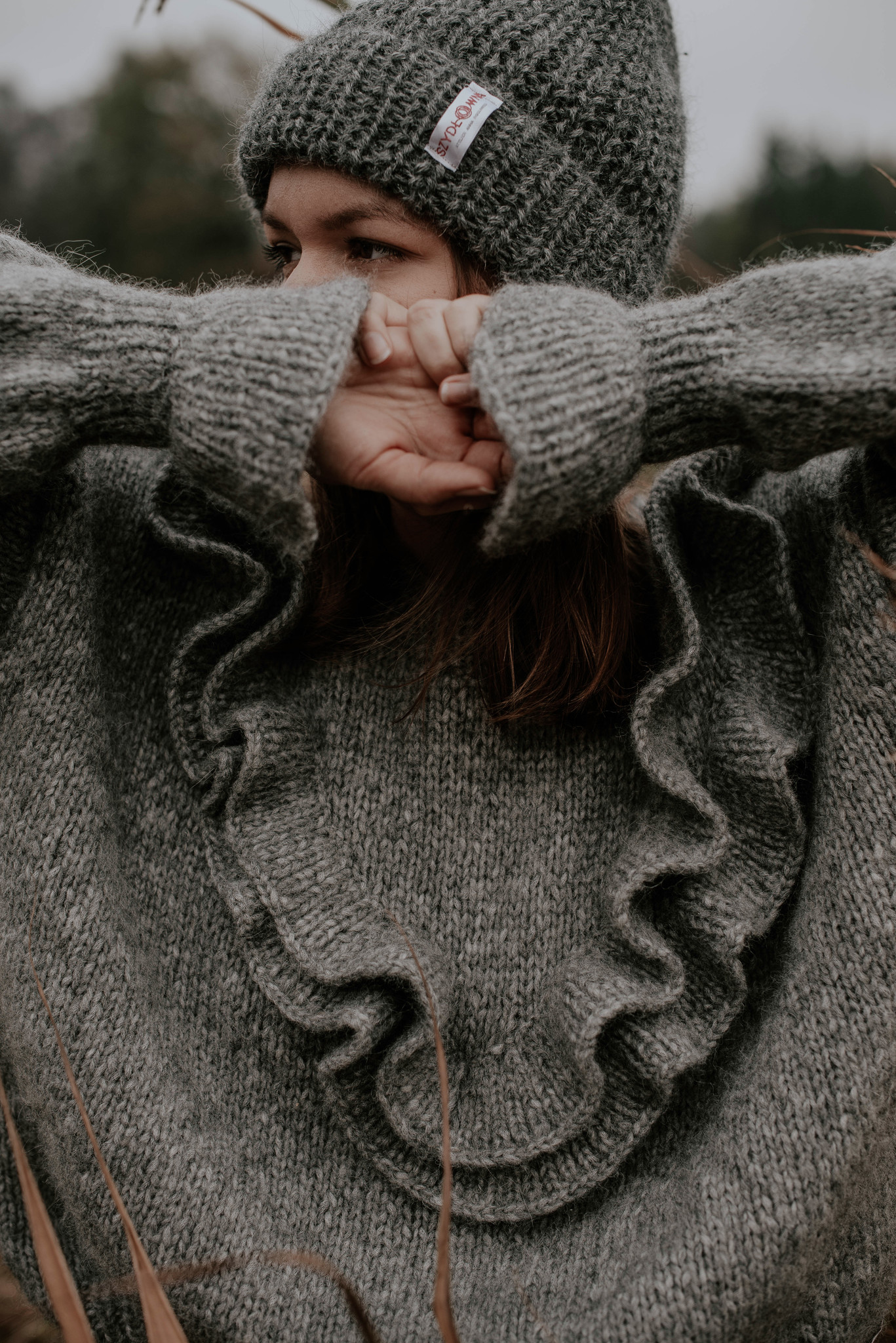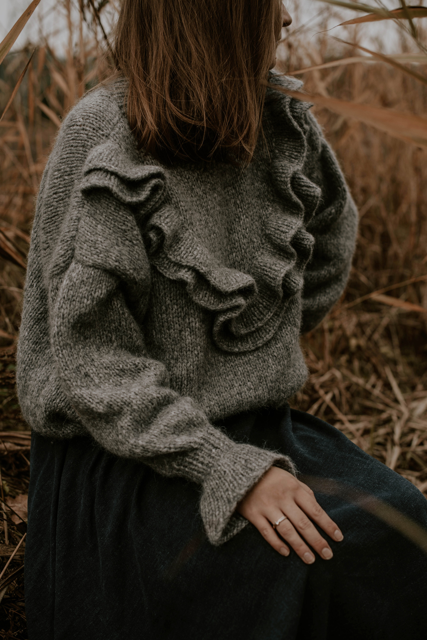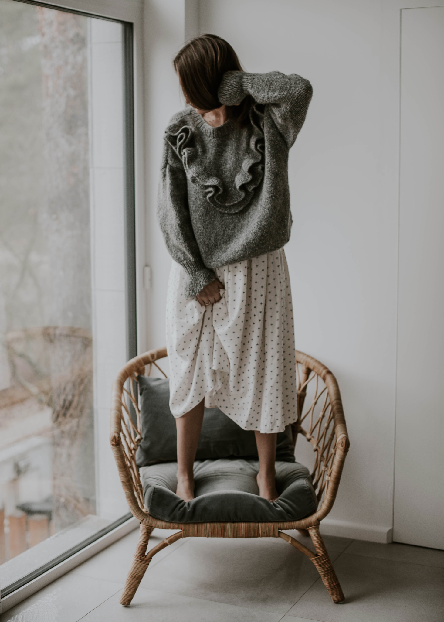 Ręcznie wykonany sweter zdobiony fantazyjnymi falbanami z przodu, wykończony ściągaczem. Szerokie rękawy rozszerzane u dołu. Sweter jest wydziergany z ciepłej i lekkiej wełny, przyjemniej w noszeniu. Na zamówienie dostępny w innych kolorach.