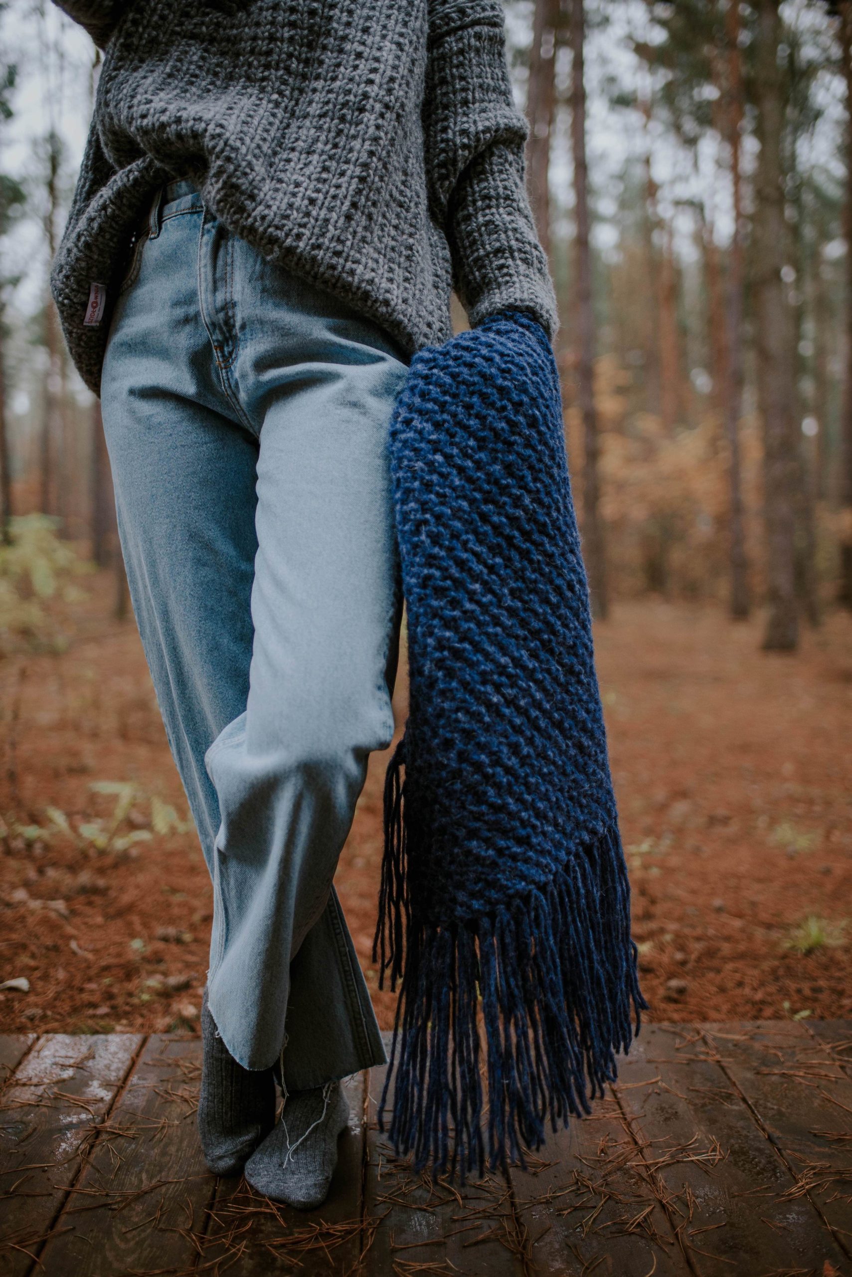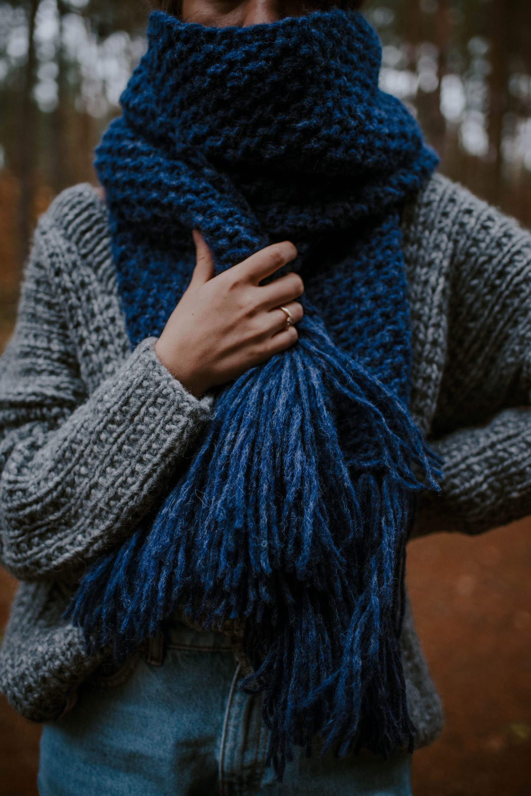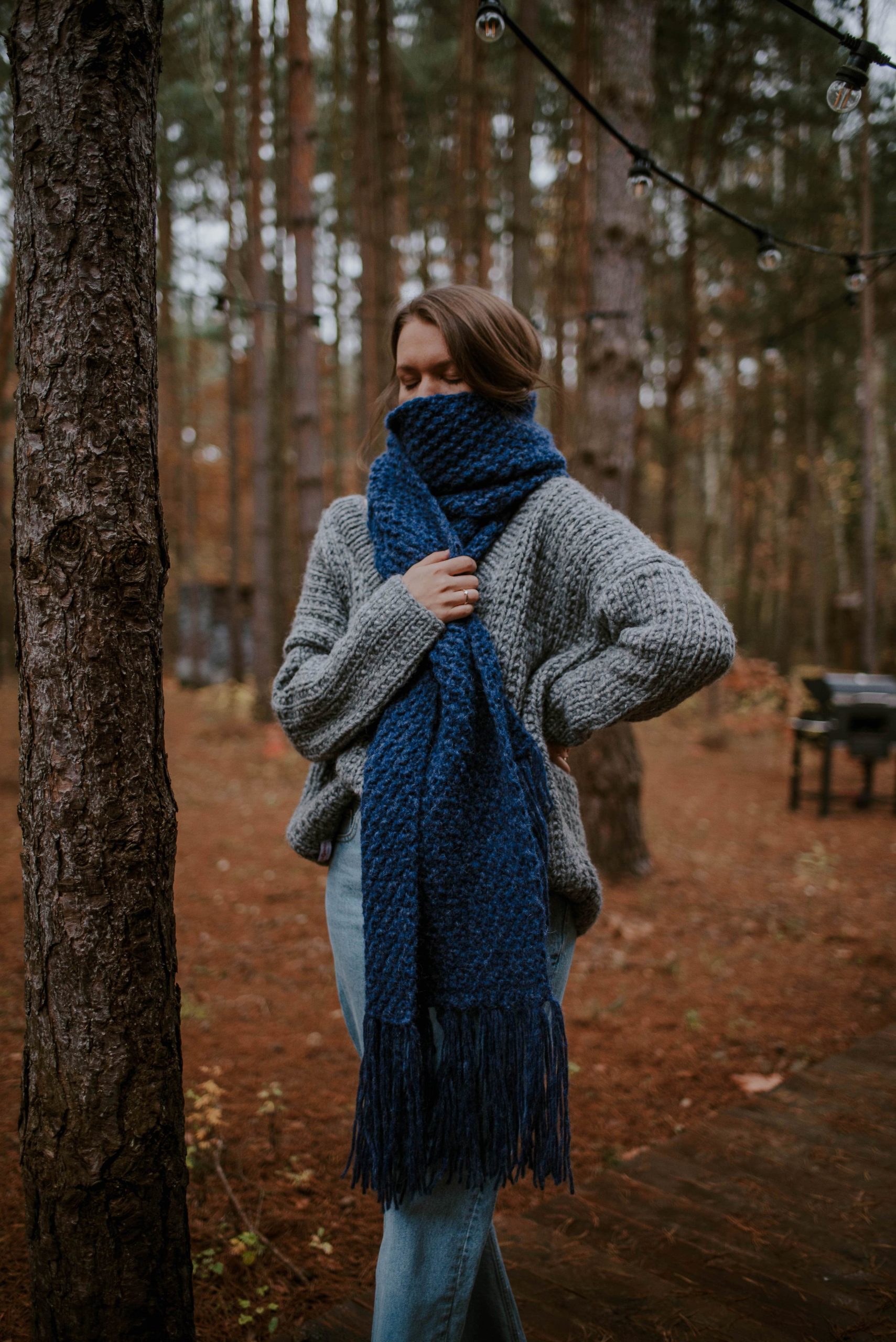 Ręcznie wykonany długi i szeroki szalik, wydziergany ściegiem ryżowym. Fantazyjne frędzle na zakończeniach. Na zamówienie szalik jest dostępny w innych kolorach.