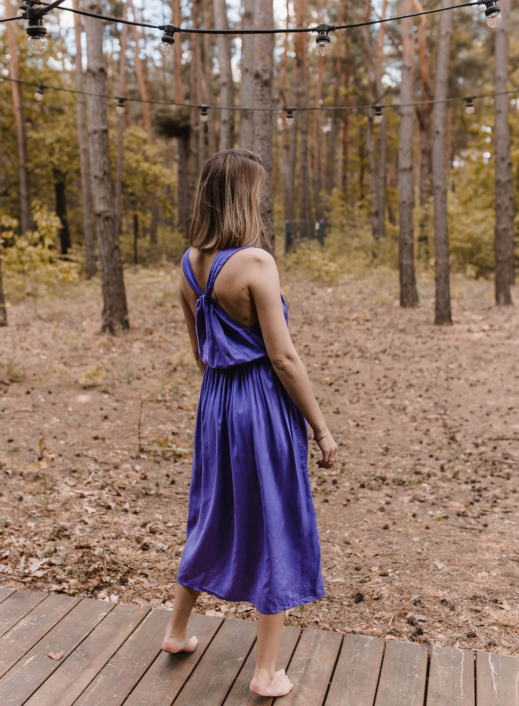 Letnia sukienka midi w głębokim fiolecie. W pasie na gumkę.