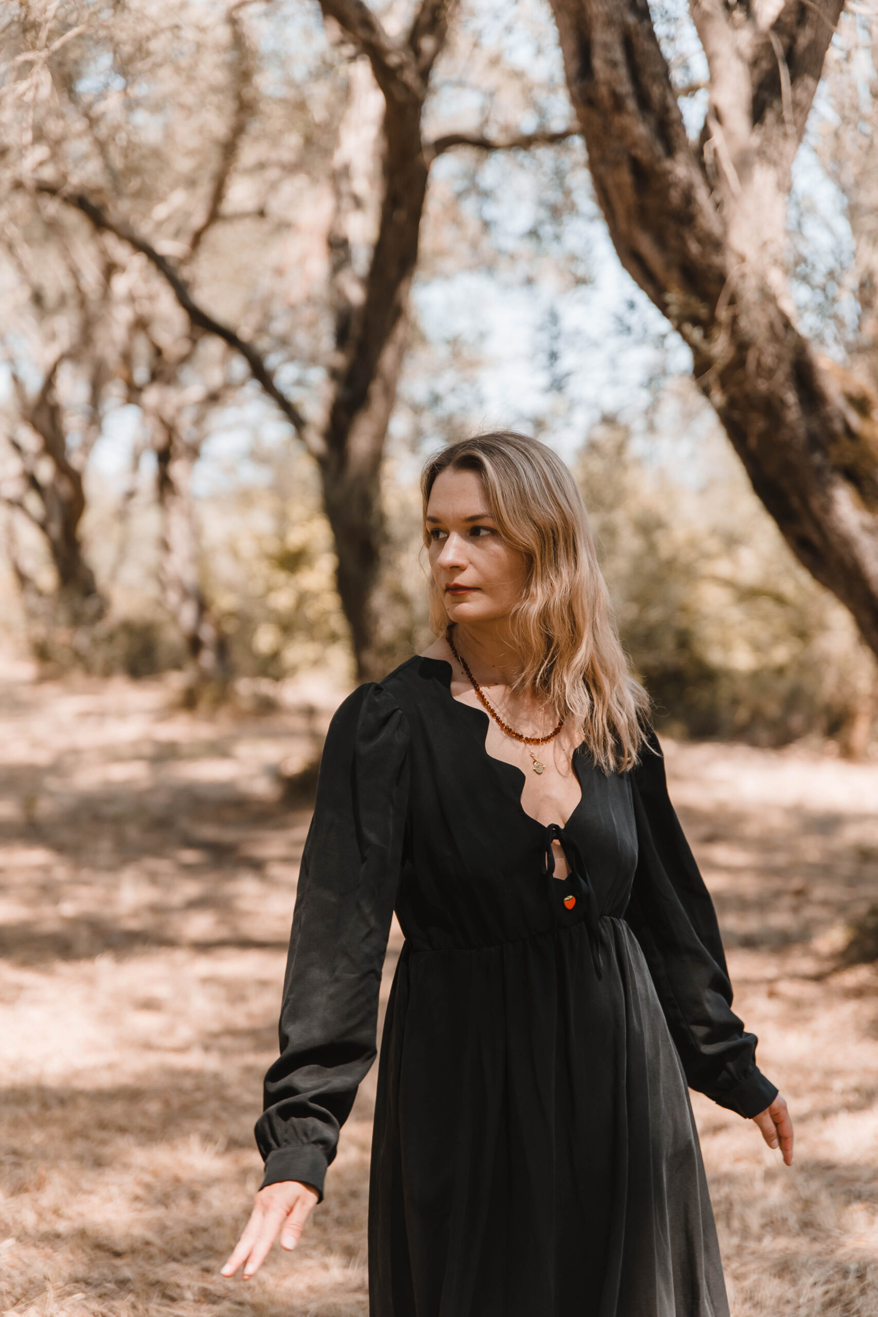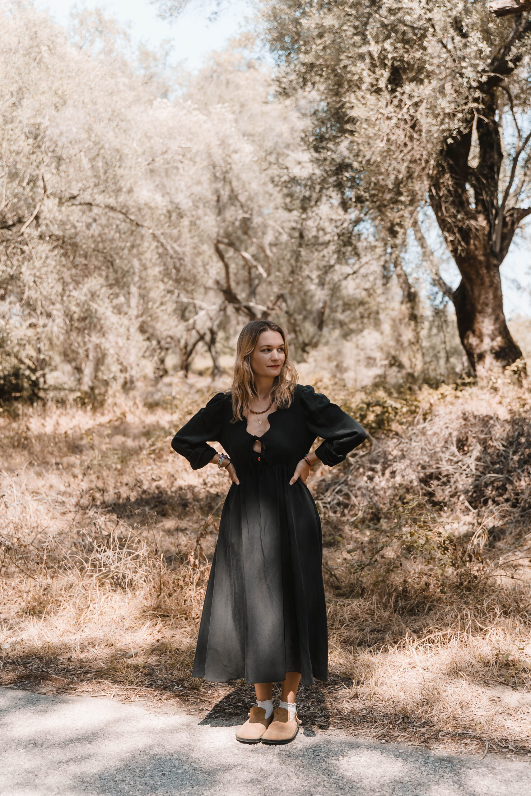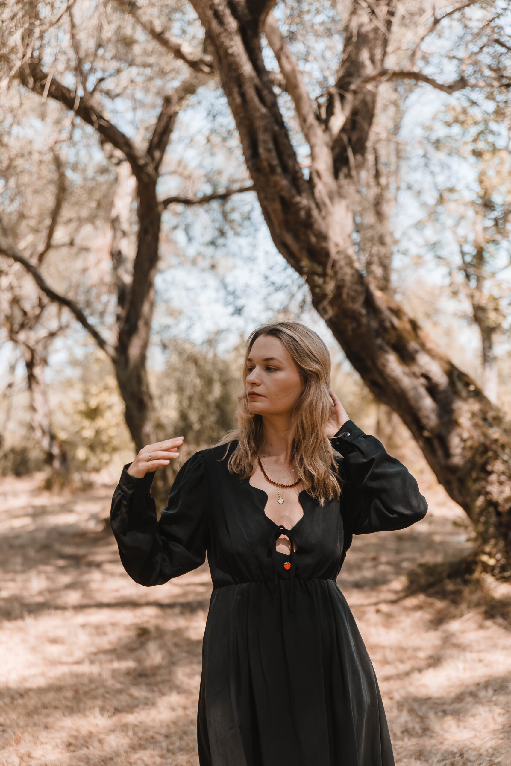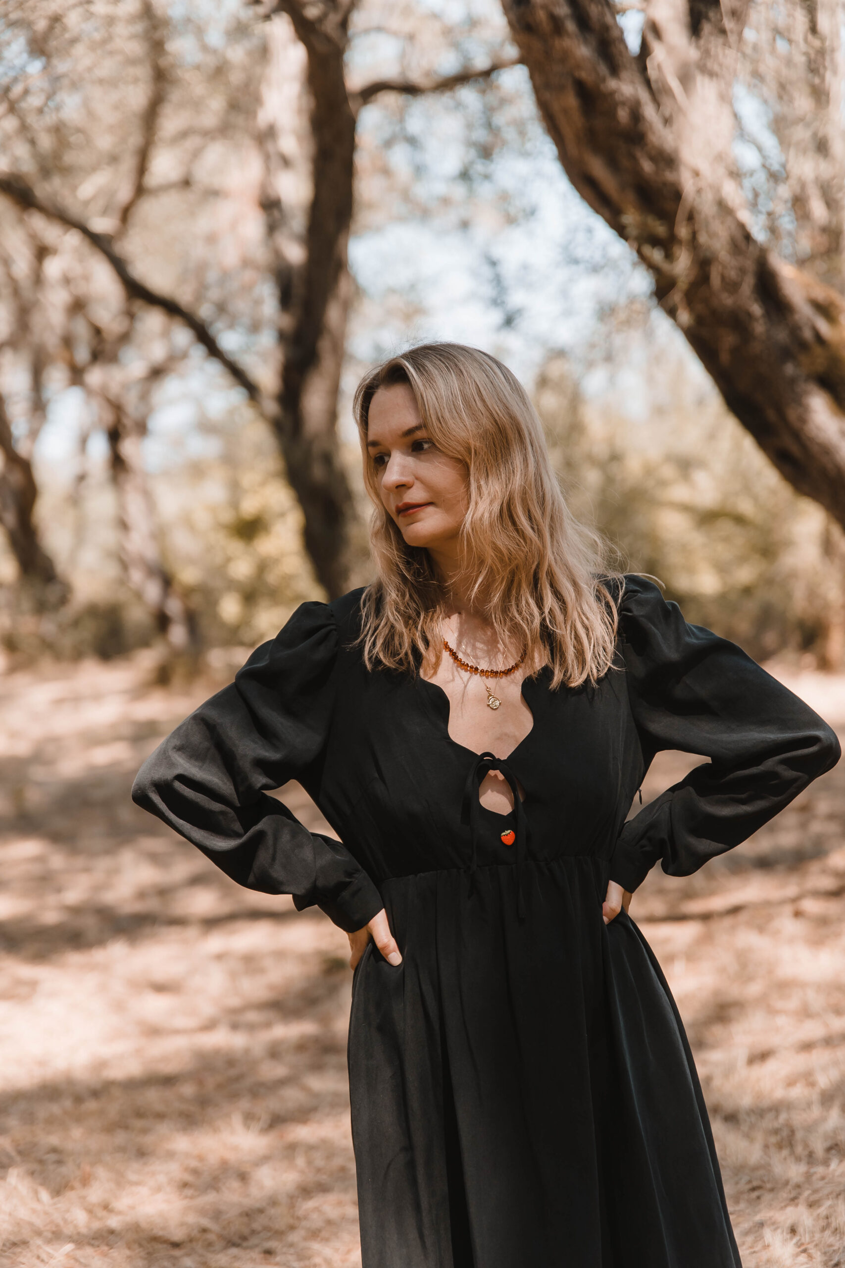 Ta sukienka w klasycznej czerni zachwyca elegancją i nietuzinkowymi detalami. Wykonana z lekkiego, zwiewnego materiału, zapewnia swobodę ruchu, a długość midi nadaje jej ponadczasowego stylu. Falujący dekolt przyciąga wzrok i dodaje romantyzmu, a uroczy guzik w kształcie truskawki nadaje całości niepowtarzalnego charakteru. Sukienka jest wygodna dzięki elastycznej gumce w pasie, która subtelnie podkreśla talię, oraz praktycznemu suwakowi z boku, ułatwiającemu zakładanie. Dodatkowym atutem są kieszenie, które wprowadzają odrobinę casualowego stylu, czyniąc tę sukienkę idealną zarówno na codzienne wyjścia, jak i wyjątkowe okazje.