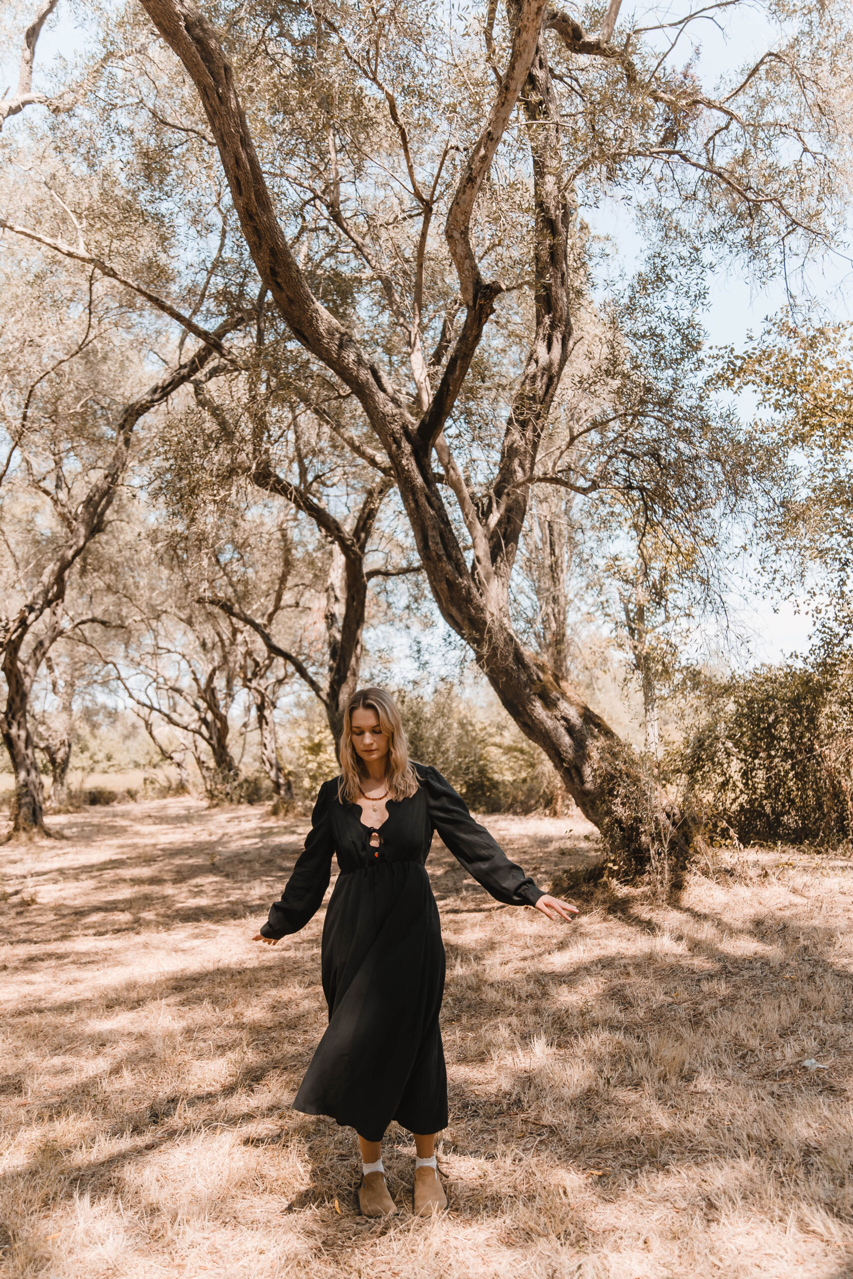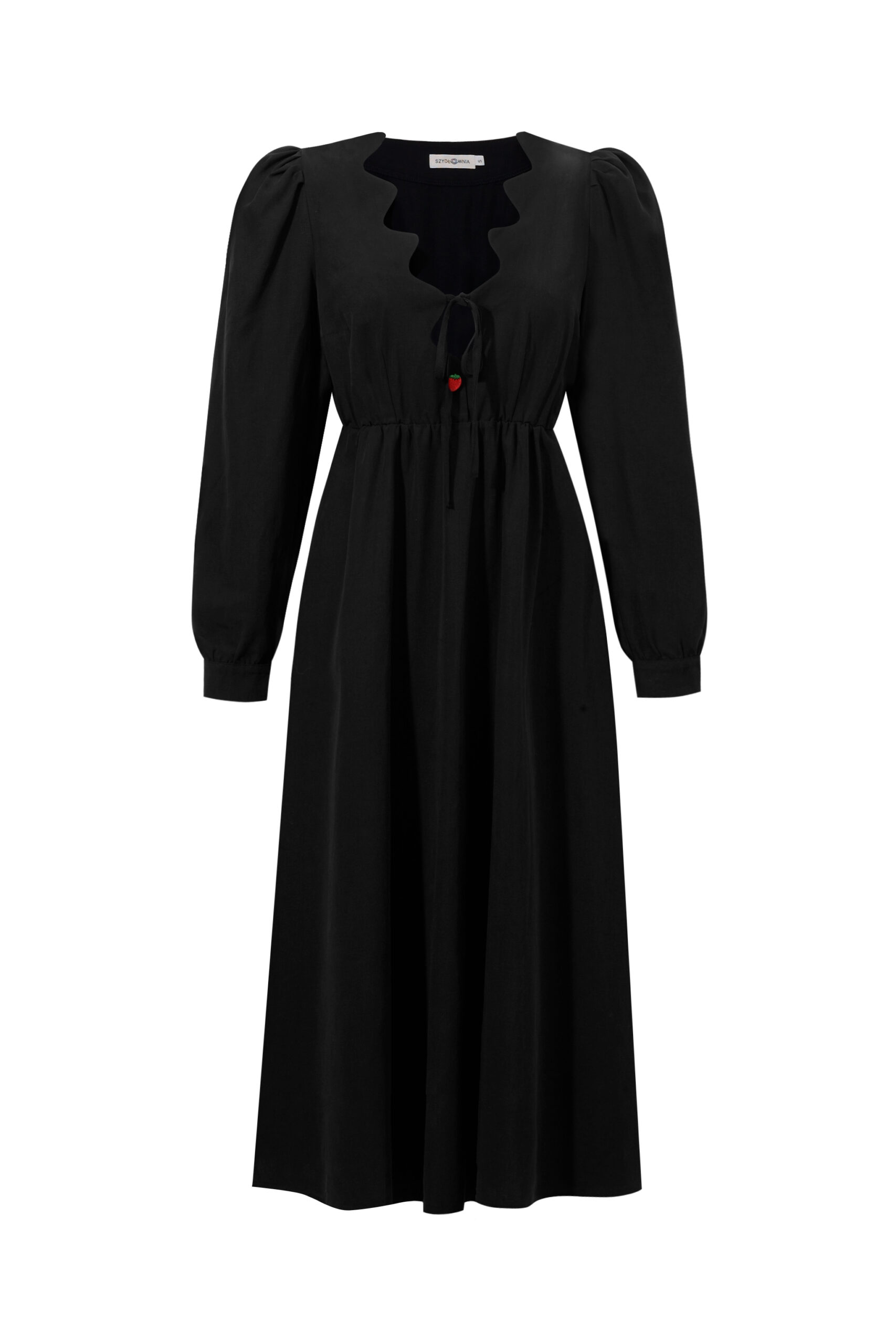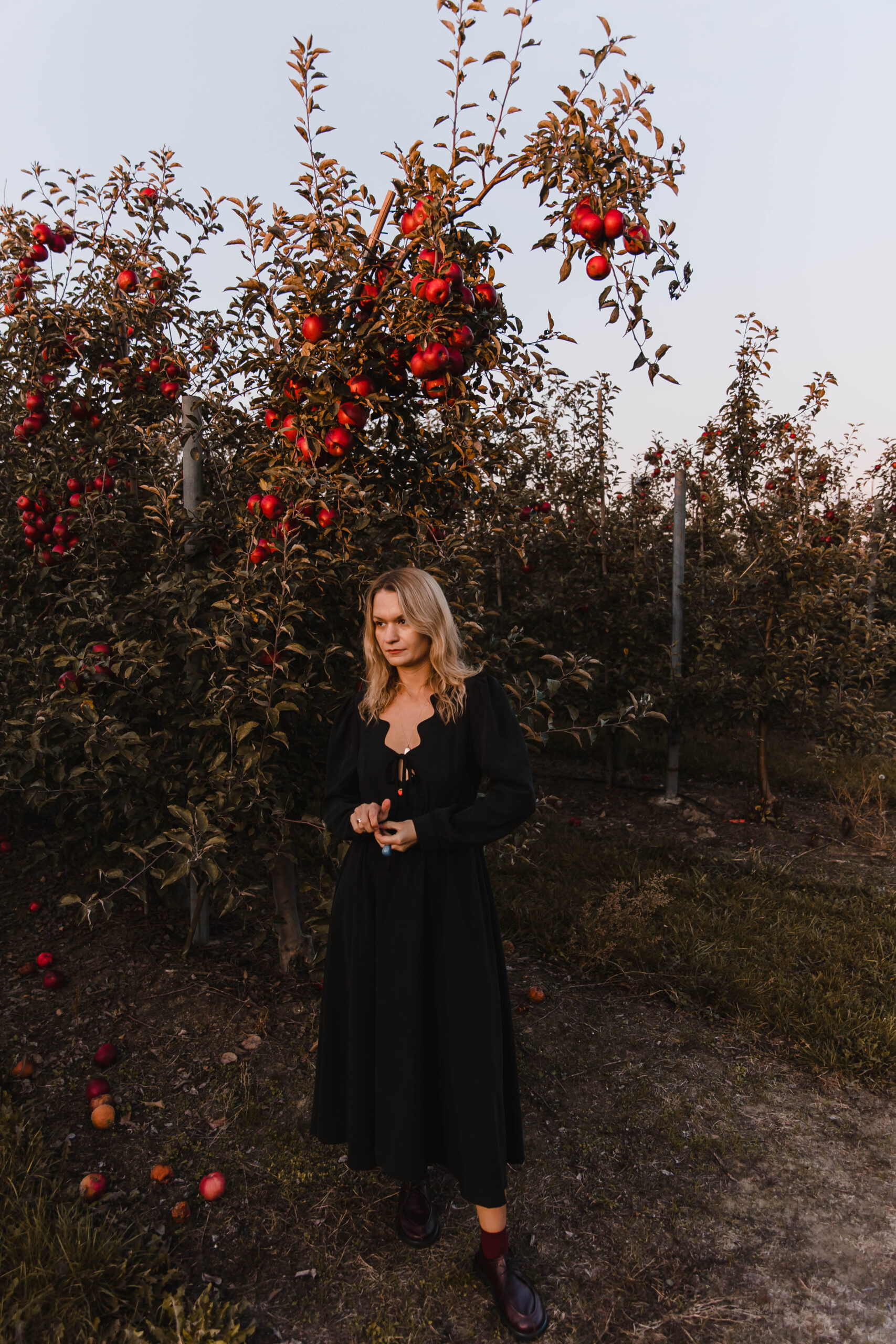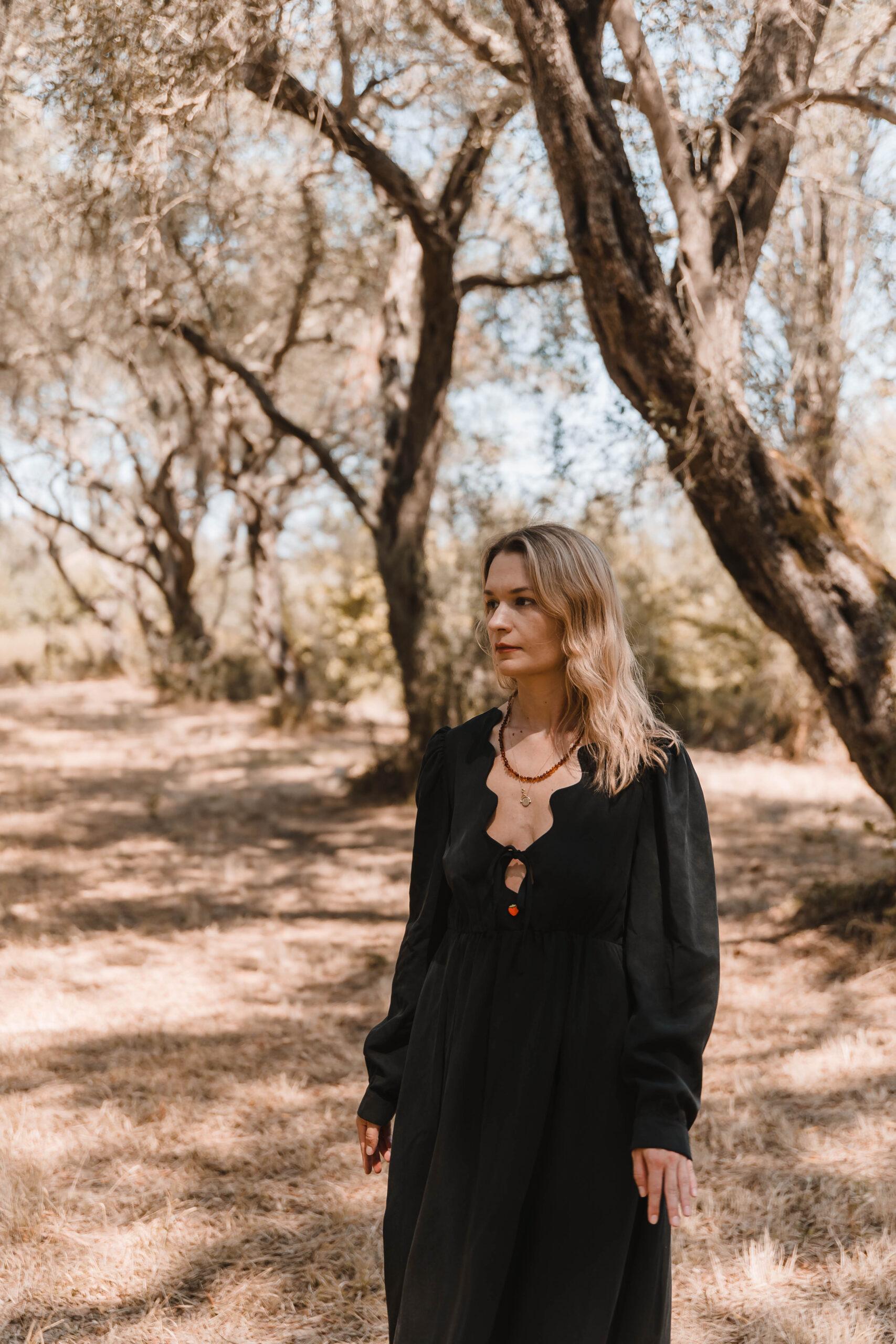 Ta sukienka w klasycznej czerni zachwyca elegancją i nietuzinkowymi detalami. Wykonana z lekkiego, zwiewnego materiału, zapewnia swobodę ruchu, a długość midi nadaje jej ponadczasowego stylu. Falujący dekolt przyciąga wzrok i dodaje romantyzmu, a uroczy guzik w kształcie truskawki nadaje całości niepowtarzalnego charakteru. Sukienka jest wygodna dzięki elastycznej gumce w pasie, która subtelnie podkreśla talię, oraz praktycznemu suwakowi z boku, ułatwiającemu zakładanie. Dodatkowym atutem są kieszenie, które wprowadzają odrobinę casualowego stylu, czyniąc tę sukienkę idealną zarówno na codzienne wyjścia, jak i wyjątkowe okazje.