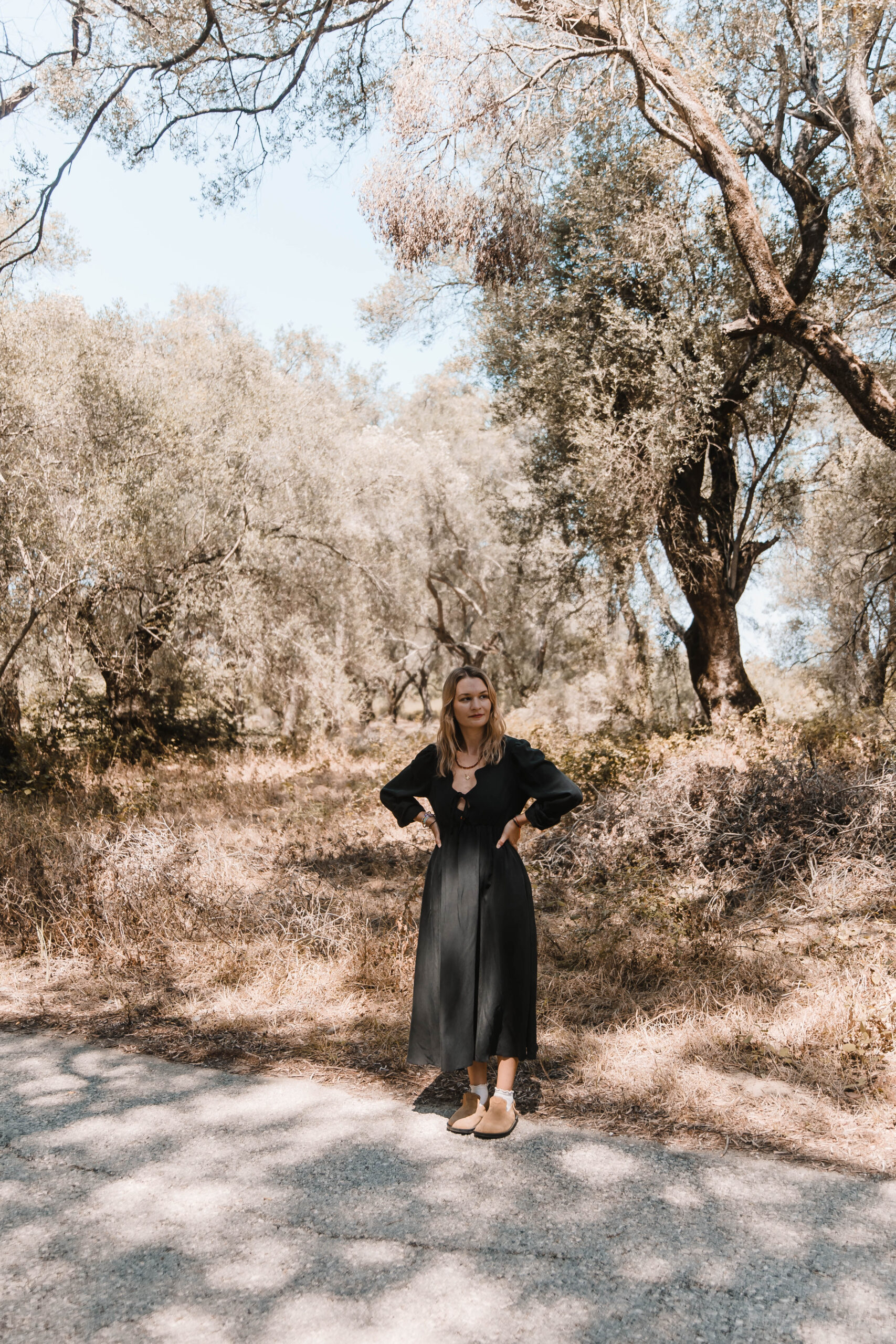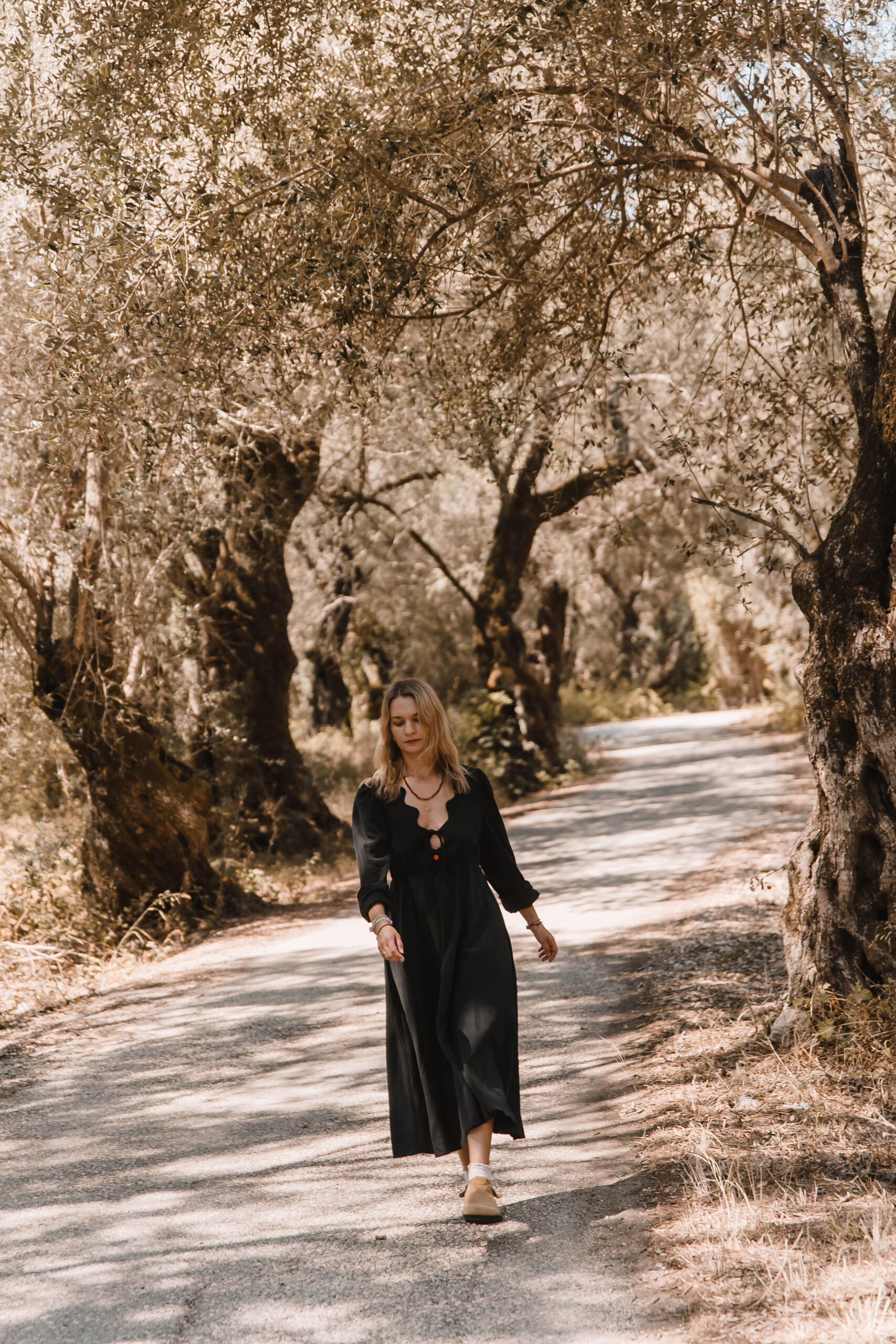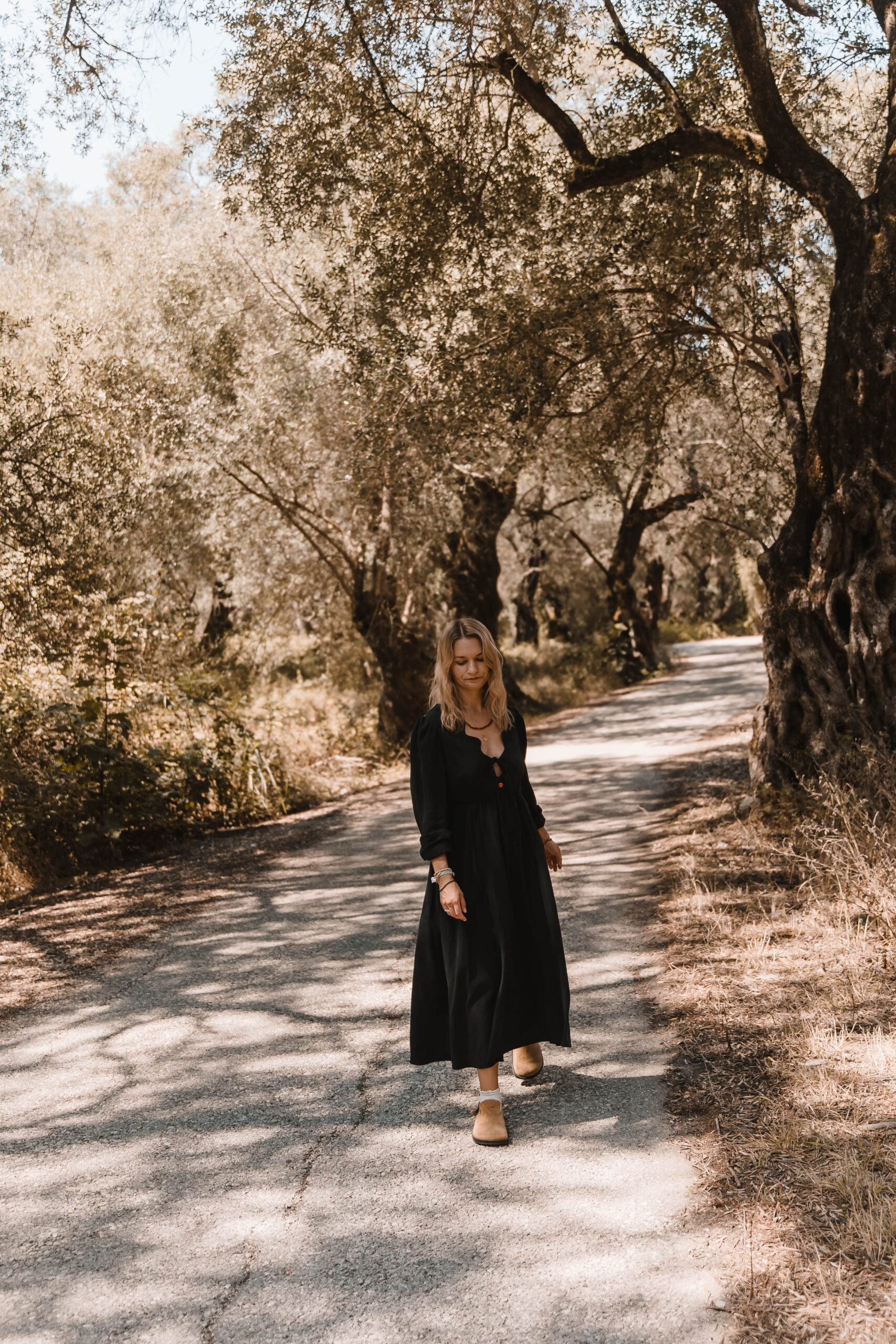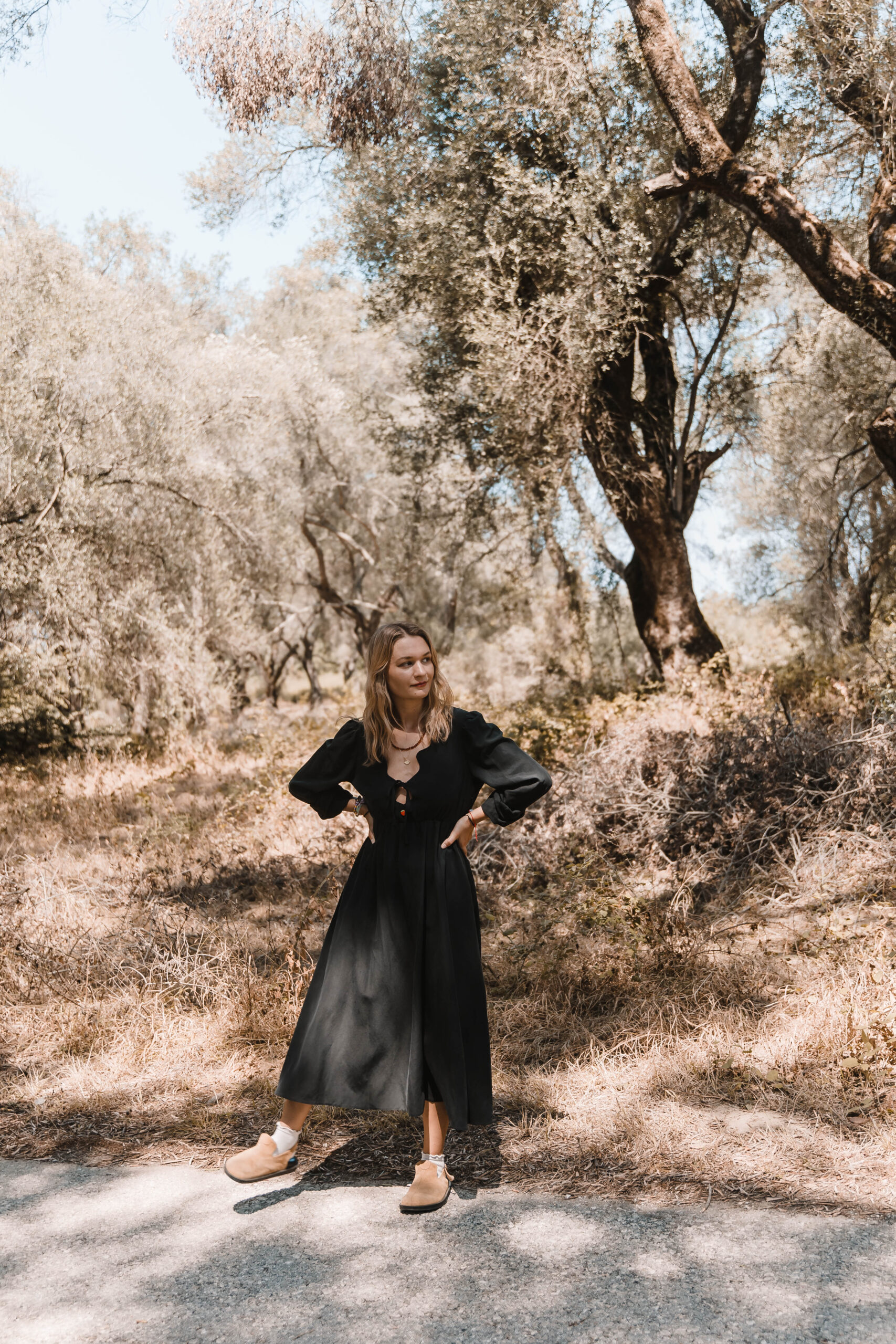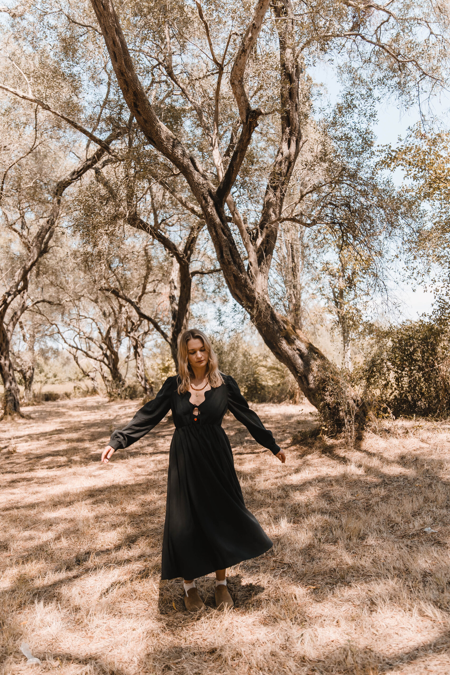 Ta sukienka w klasycznej czerni zachwyca elegancją i nietuzinkowymi detalami. Wykonana z lekkiego, zwiewnego materiału, zapewnia swobodę ruchu, a długość midi nadaje jej ponadczasowego stylu. Falujący dekolt przyciąga wzrok i dodaje romantyzmu, a uroczy guzik w kształcie truskawki nadaje całości niepowtarzalnego charakteru. Sukienka jest wygodna dzięki elastycznej gumce w pasie, która subtelnie podkreśla talię, oraz praktycznemu suwakowi z boku, ułatwiającemu zakładanie. Dodatkowym atutem są kieszenie, które wprowadzają odrobinę casualowego stylu, czyniąc tę sukienkę idealną zarówno na codzienne wyjścia, jak i wyjątkowe okazje.