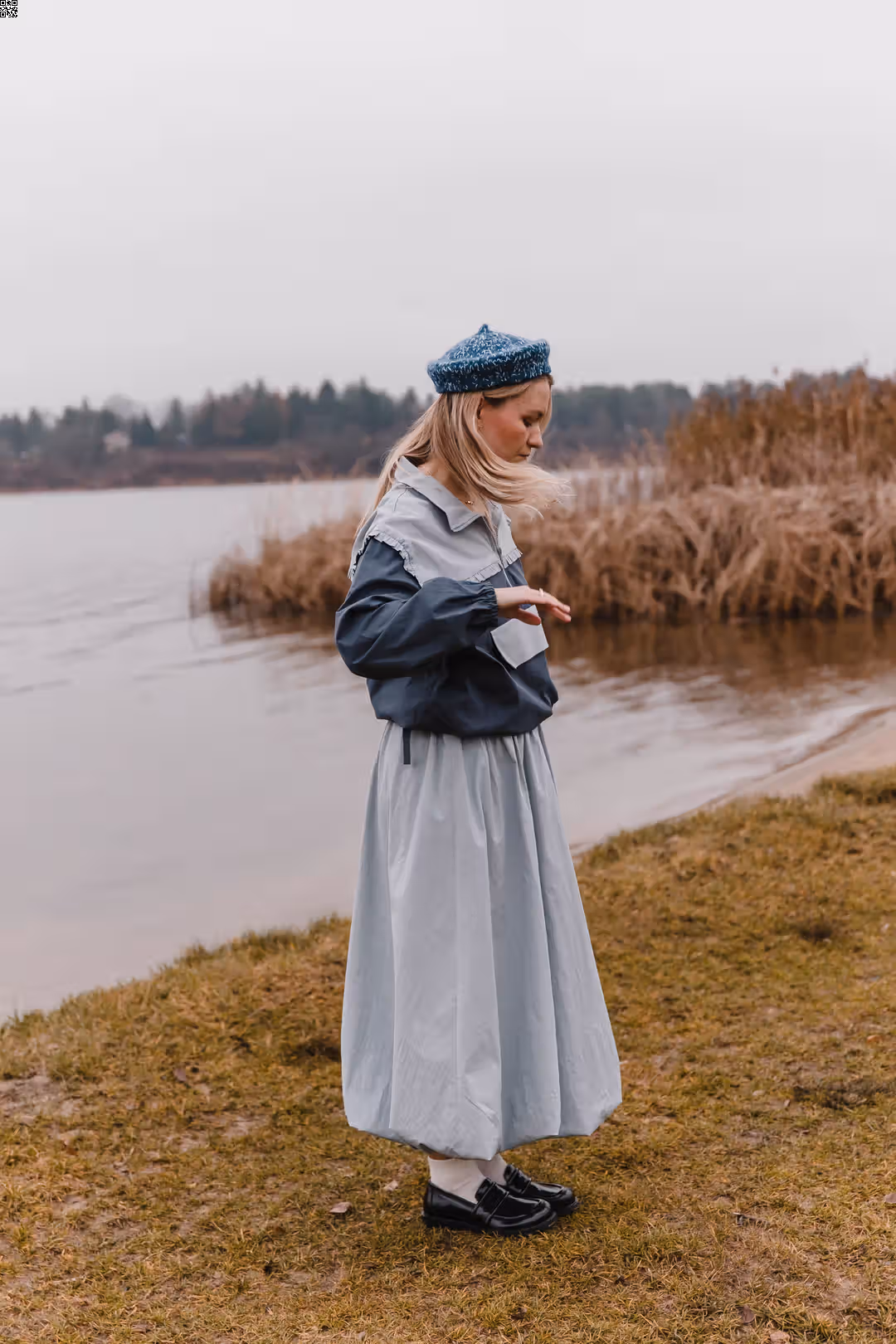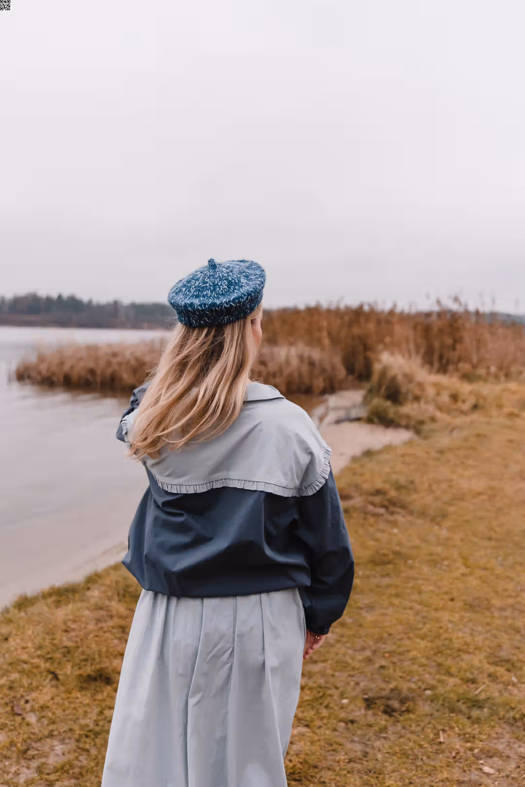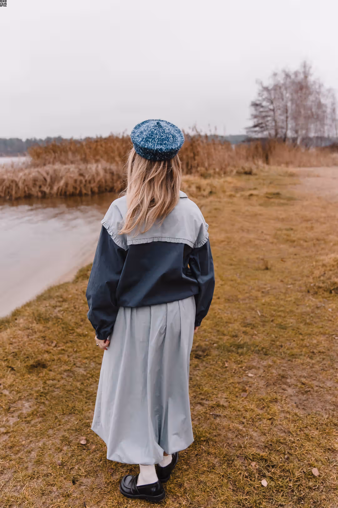Ten dzianinowy beret to mały detal, który potrafi całkowicie odmienić całą stylizację. Utrzymany w chłodnym, niebieskim odcieniu, pięknie stapia się z zimowym i jesiennym krajobrazem, dodając lookowi miękkości i przytulności. Beret świetnie dopasowuje się do głowy, nie uciska i można go układać na kilka sposobów — bardziej klasycznie, na bok albo lekko uniesiony. To idealny dodatek na chłodniejsze dni, kiedy chcesz dodać sobie odrobiny paryskiego klimatu, ale w bardzo swobodnym, codziennym wydaniu.