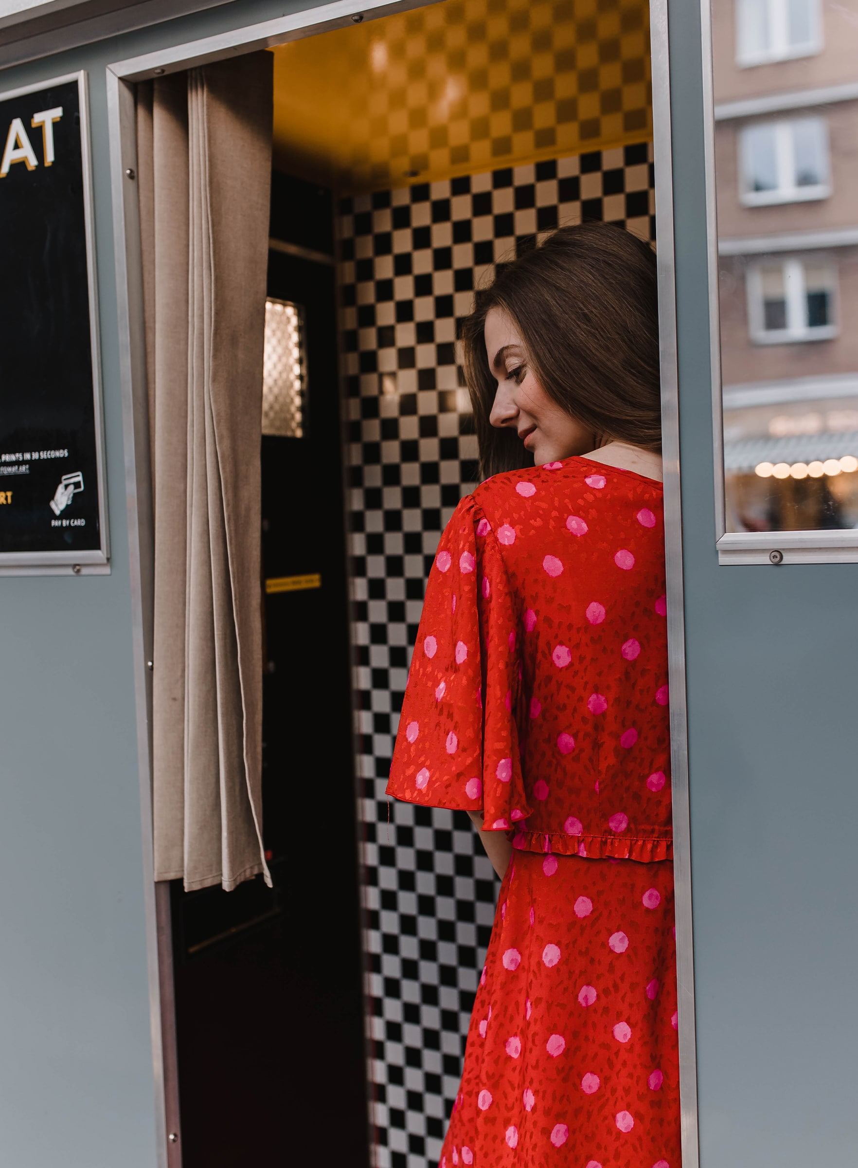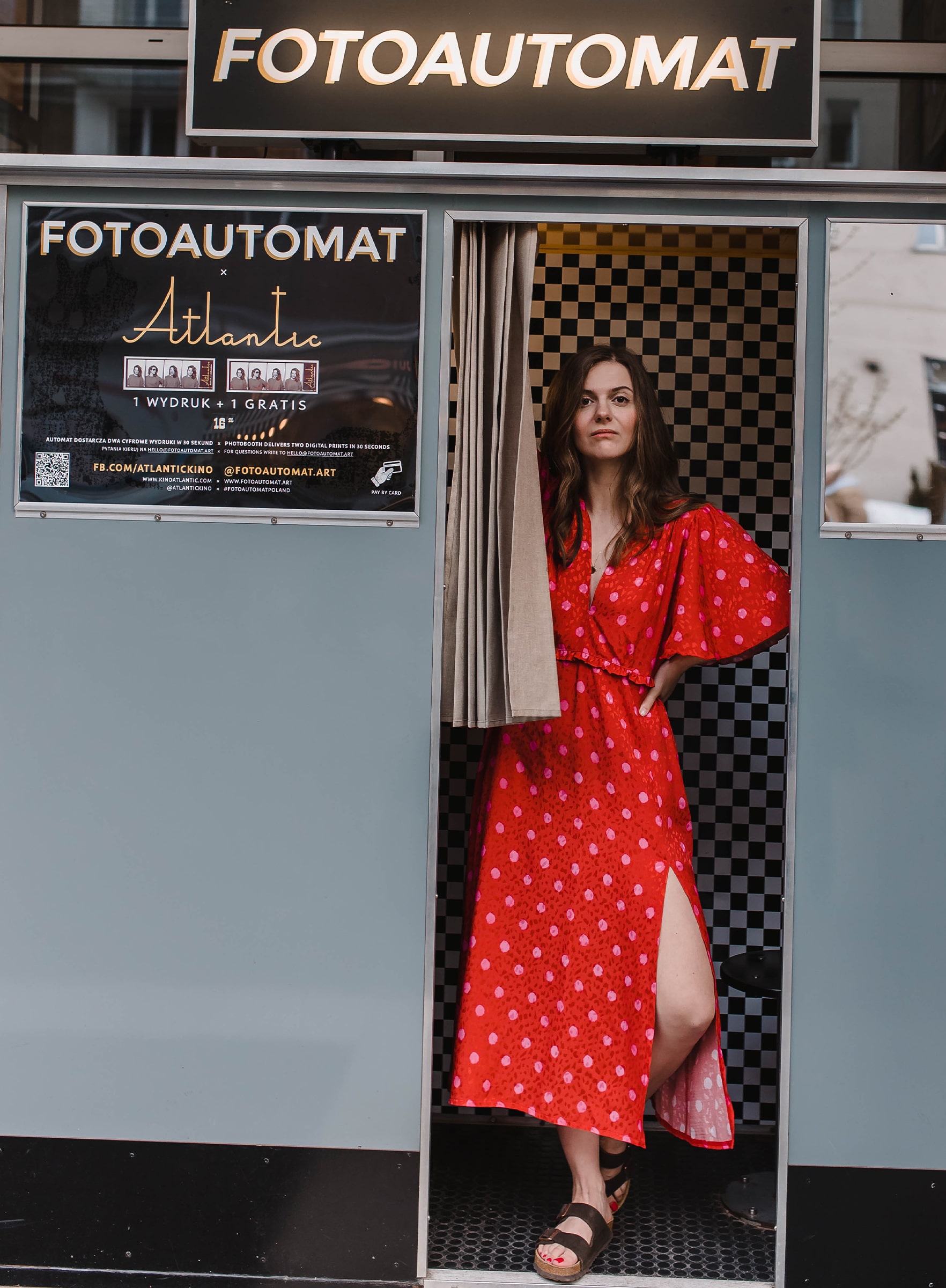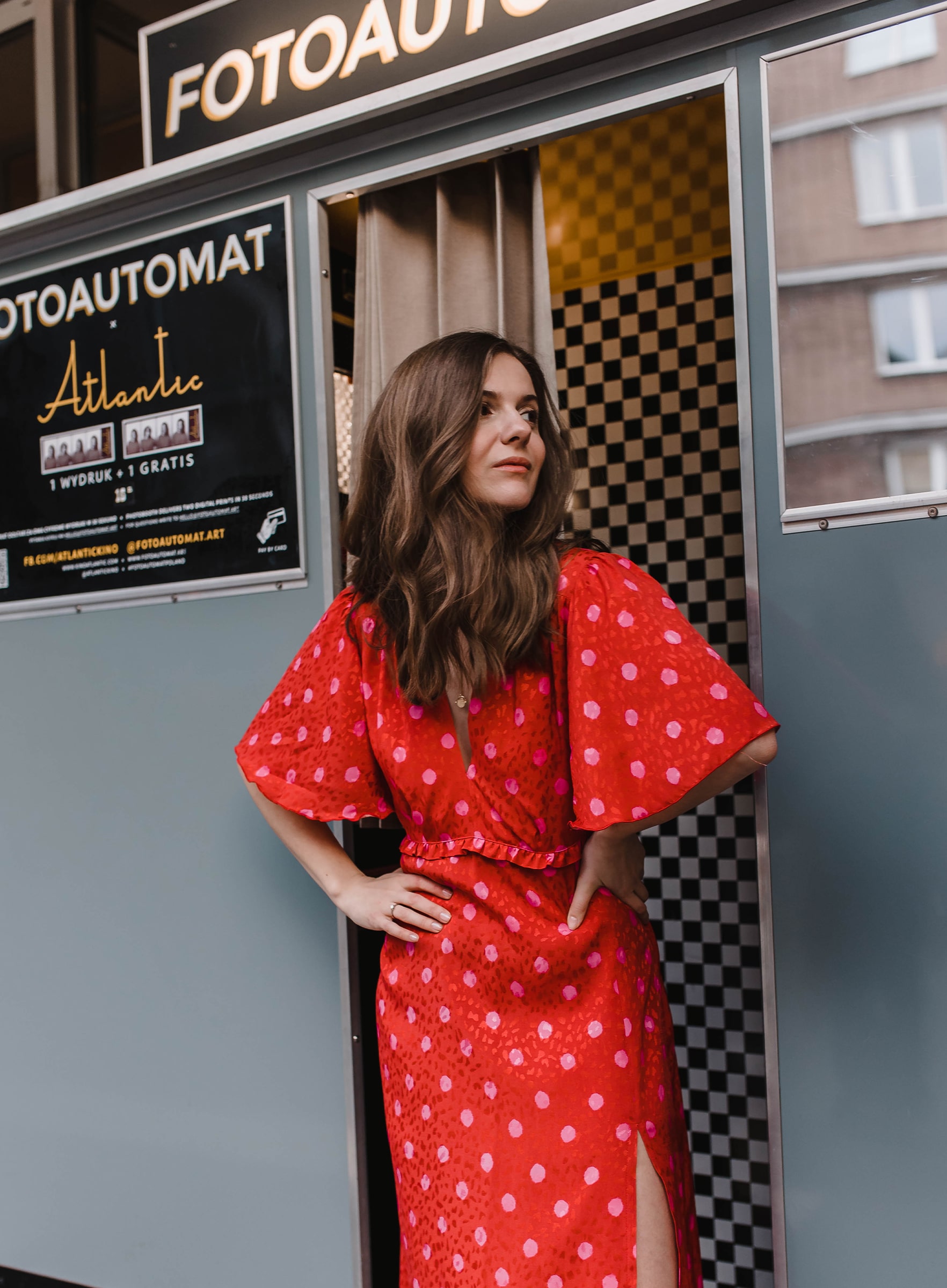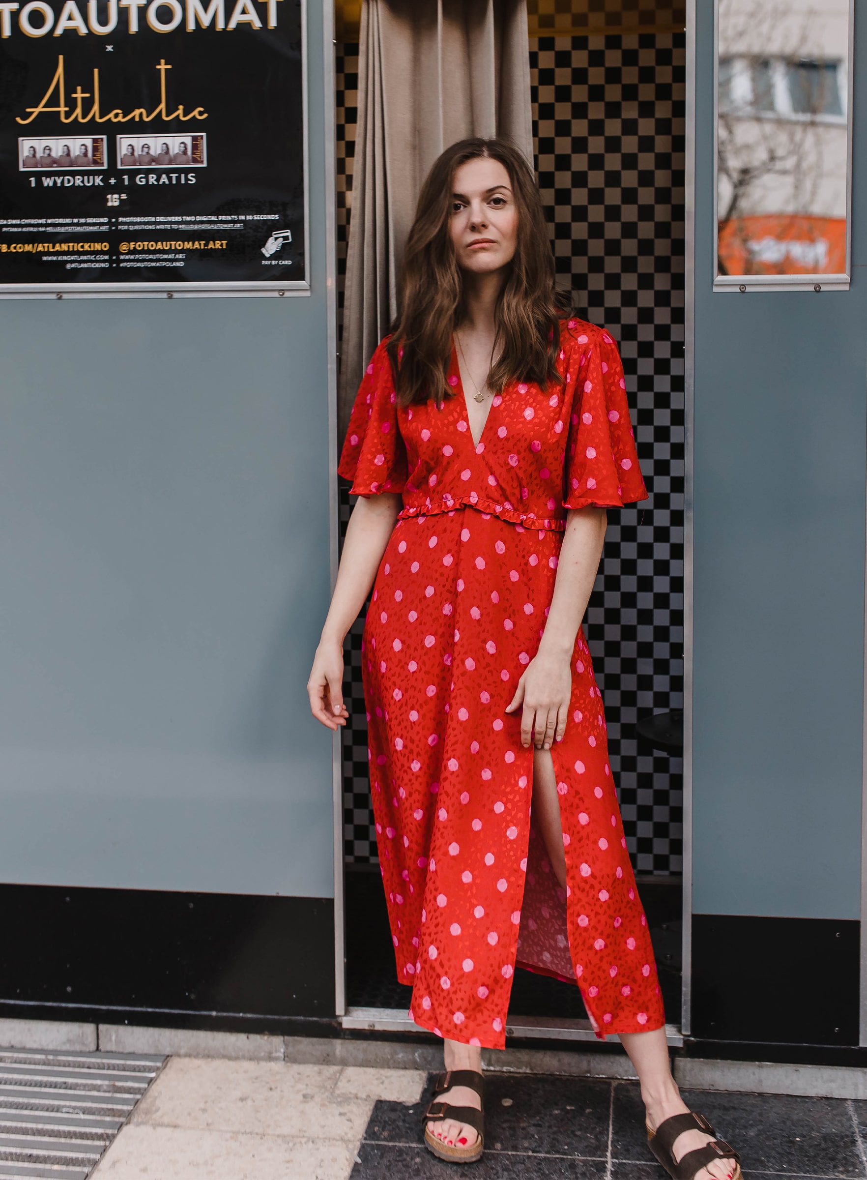 Romantyczna sukienka w różowe grochy, z tyłu zapinana na suwak. Wyrazista i dziewczęca jednocześnie. Możesz ją nosić z klapkami, ze sportowymi butami albo sandałkami.