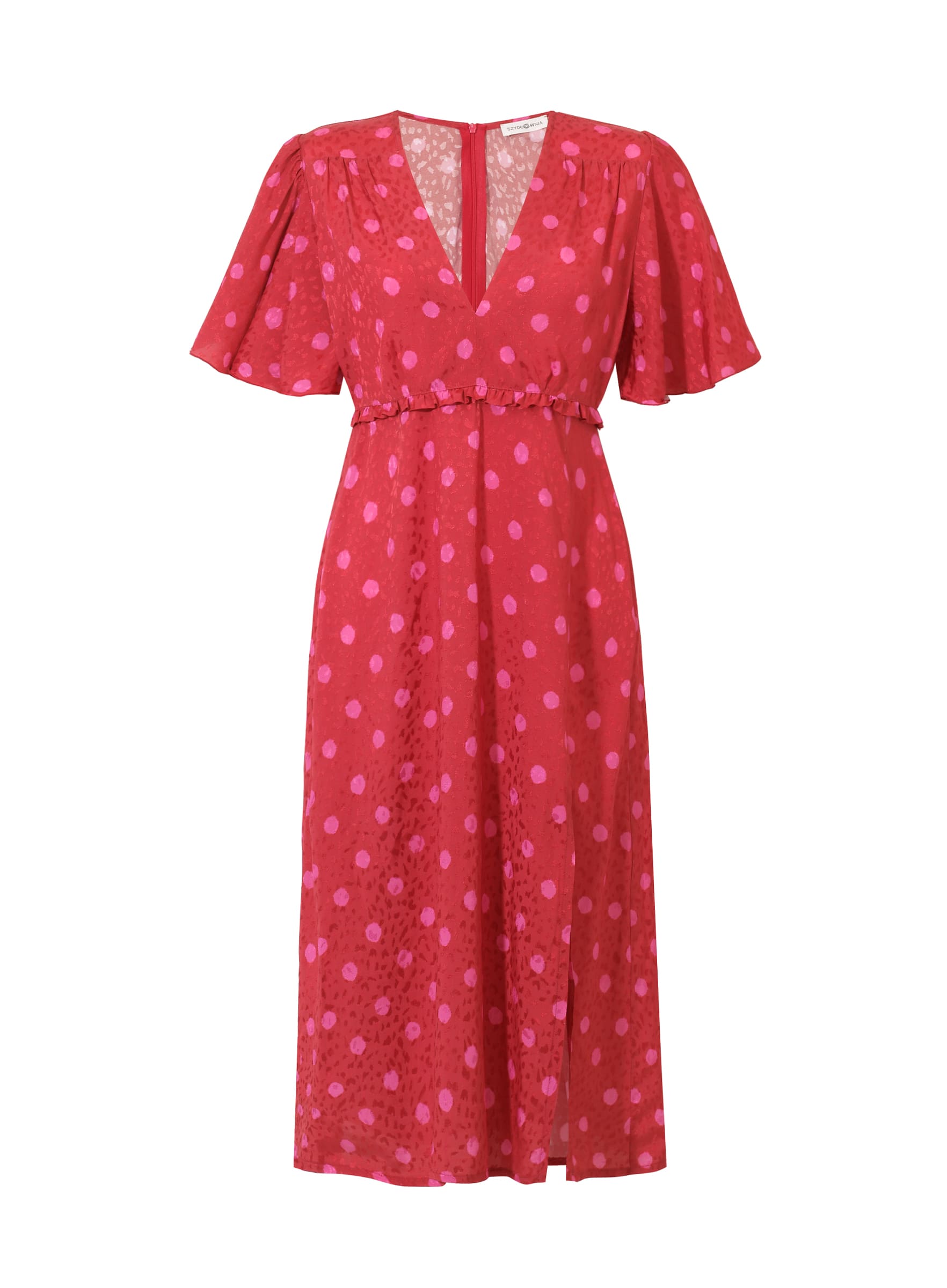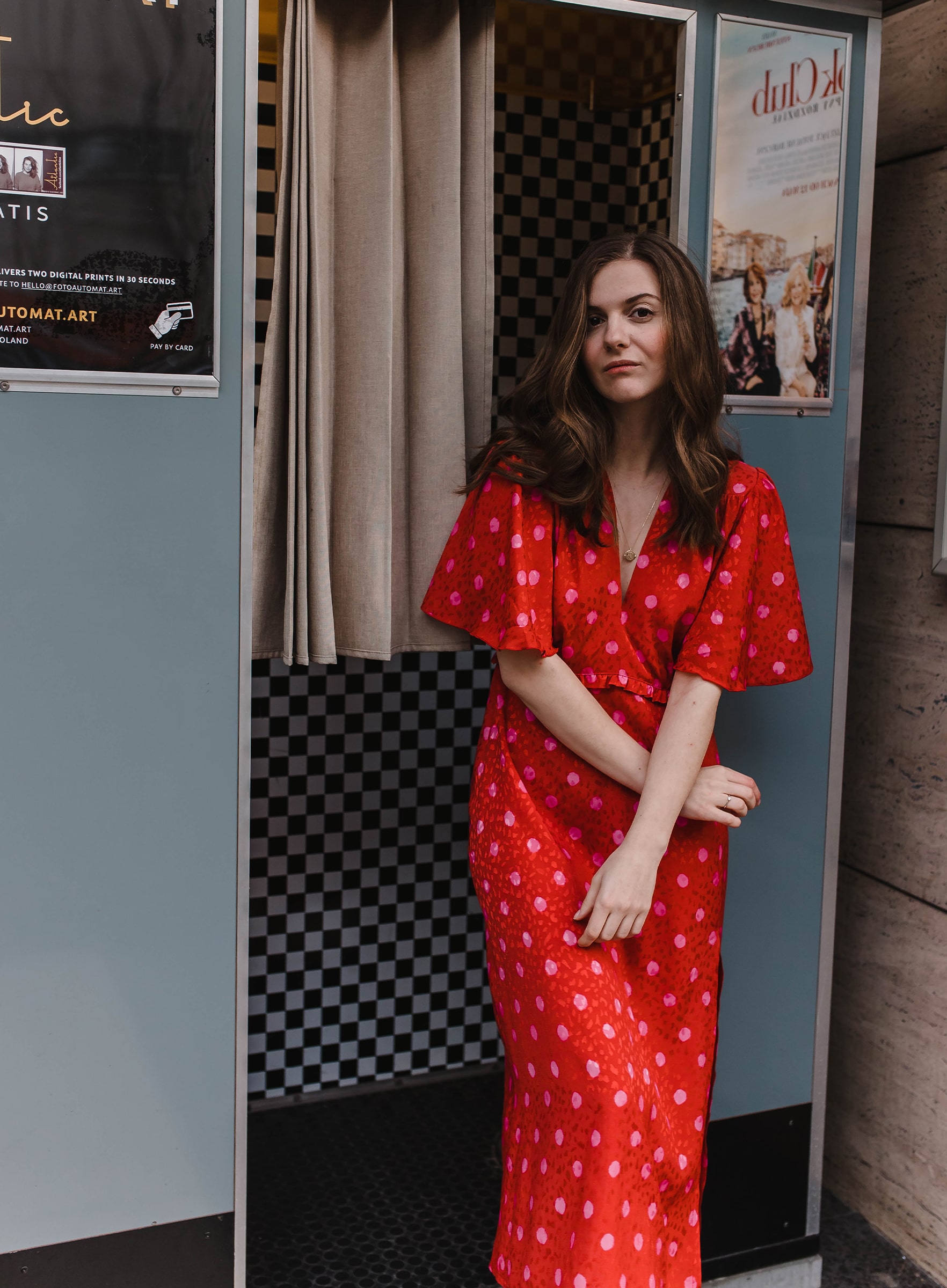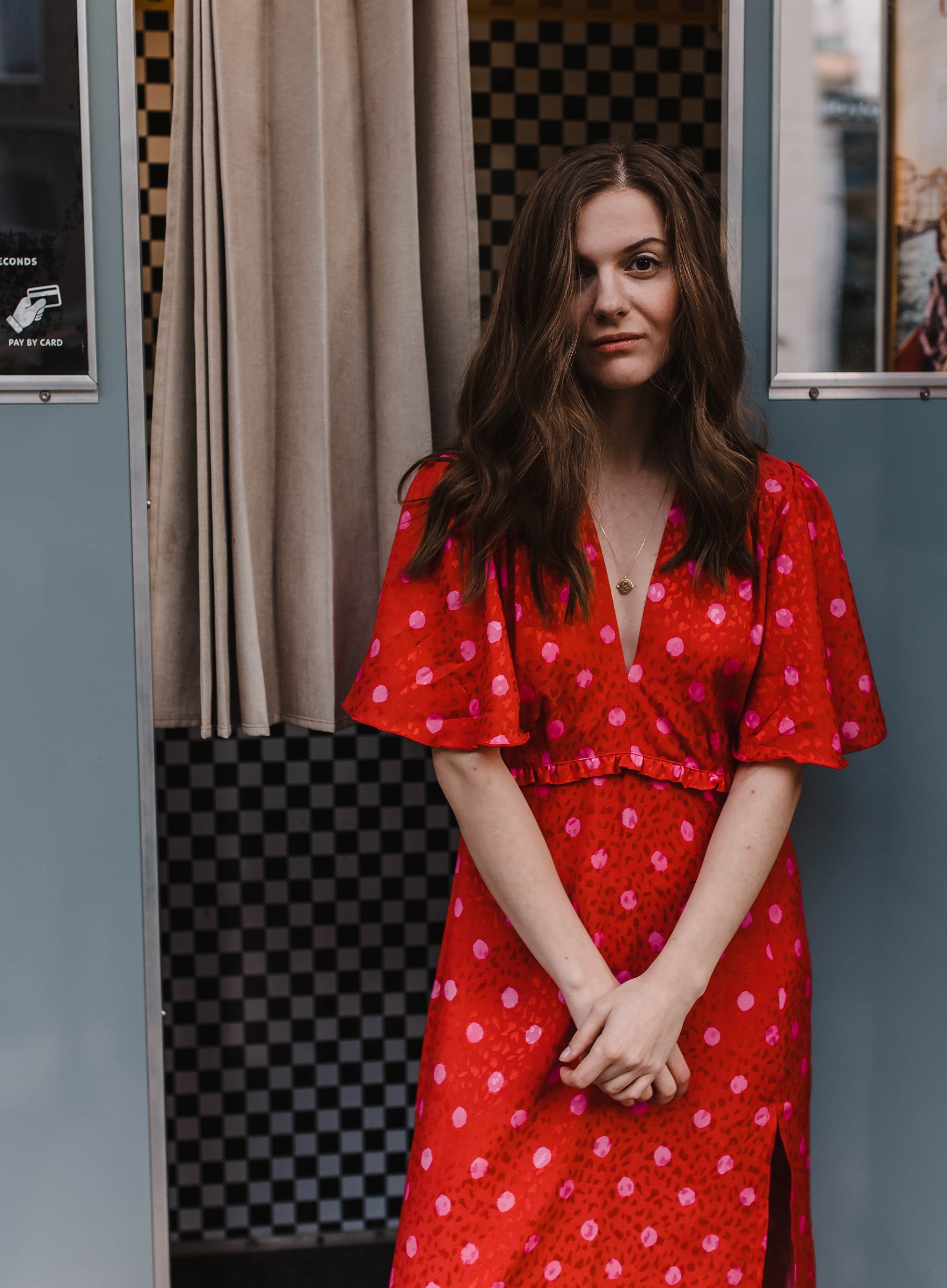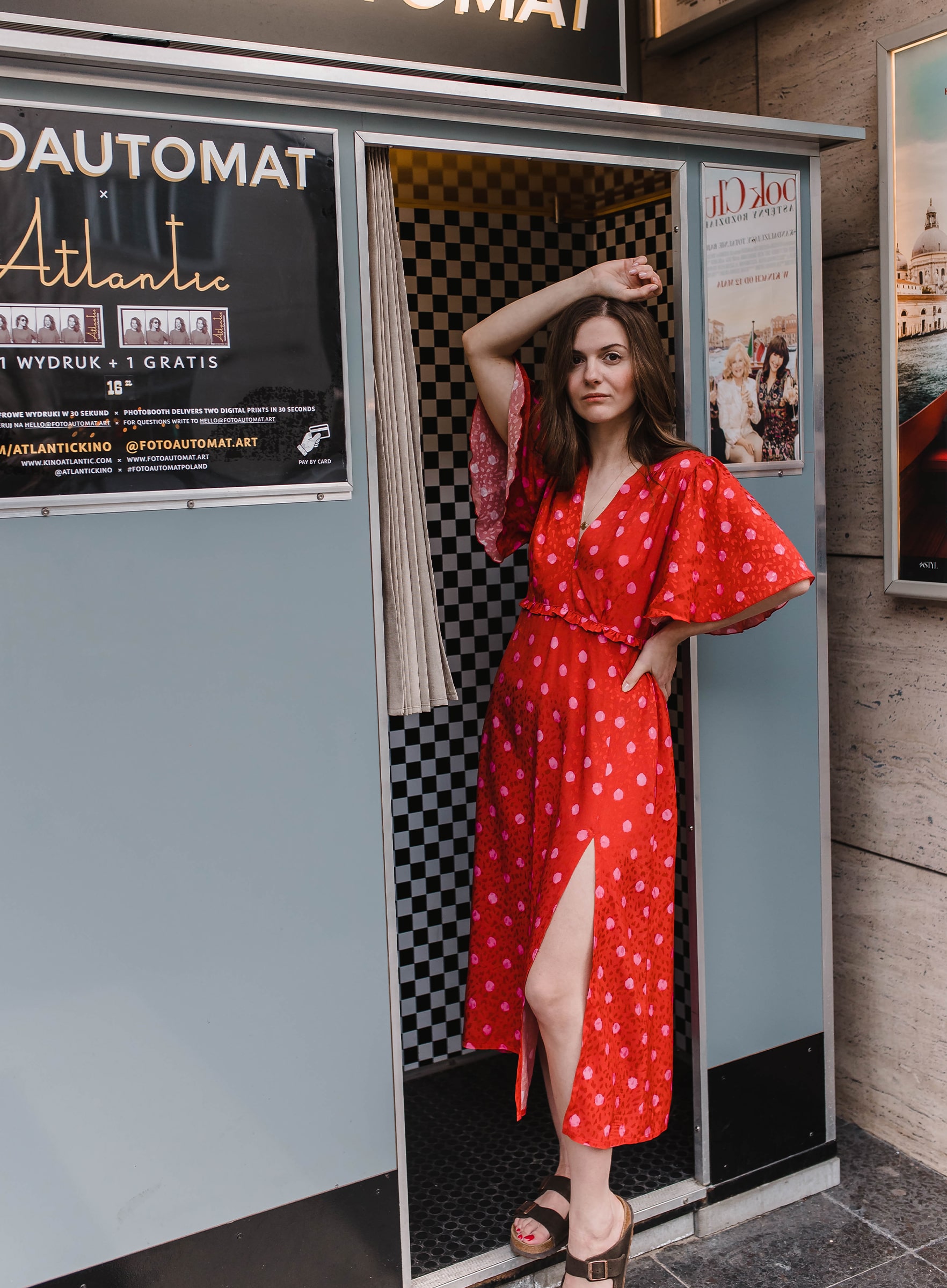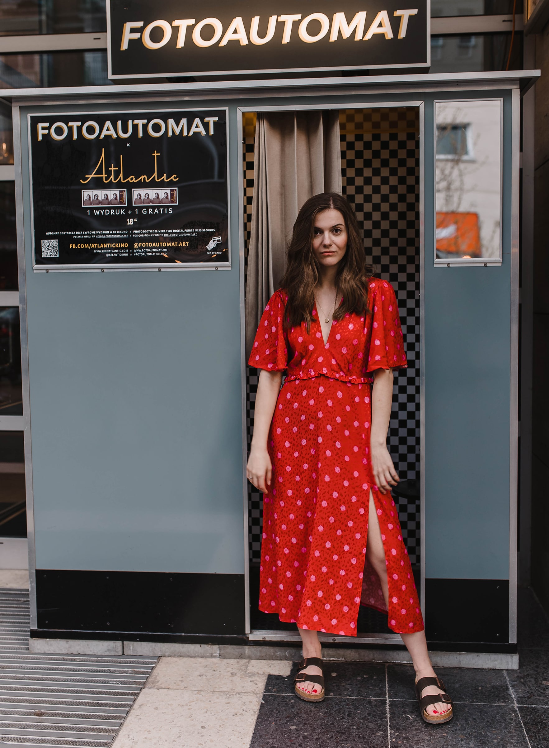 Romantyczna sukienka w różowe grochy, z tyłu zapinana na suwak. Wyrazista i dziewczęca jednocześnie. Możesz ją nosić z klapkami, ze sportowymi butami albo sandałkami.