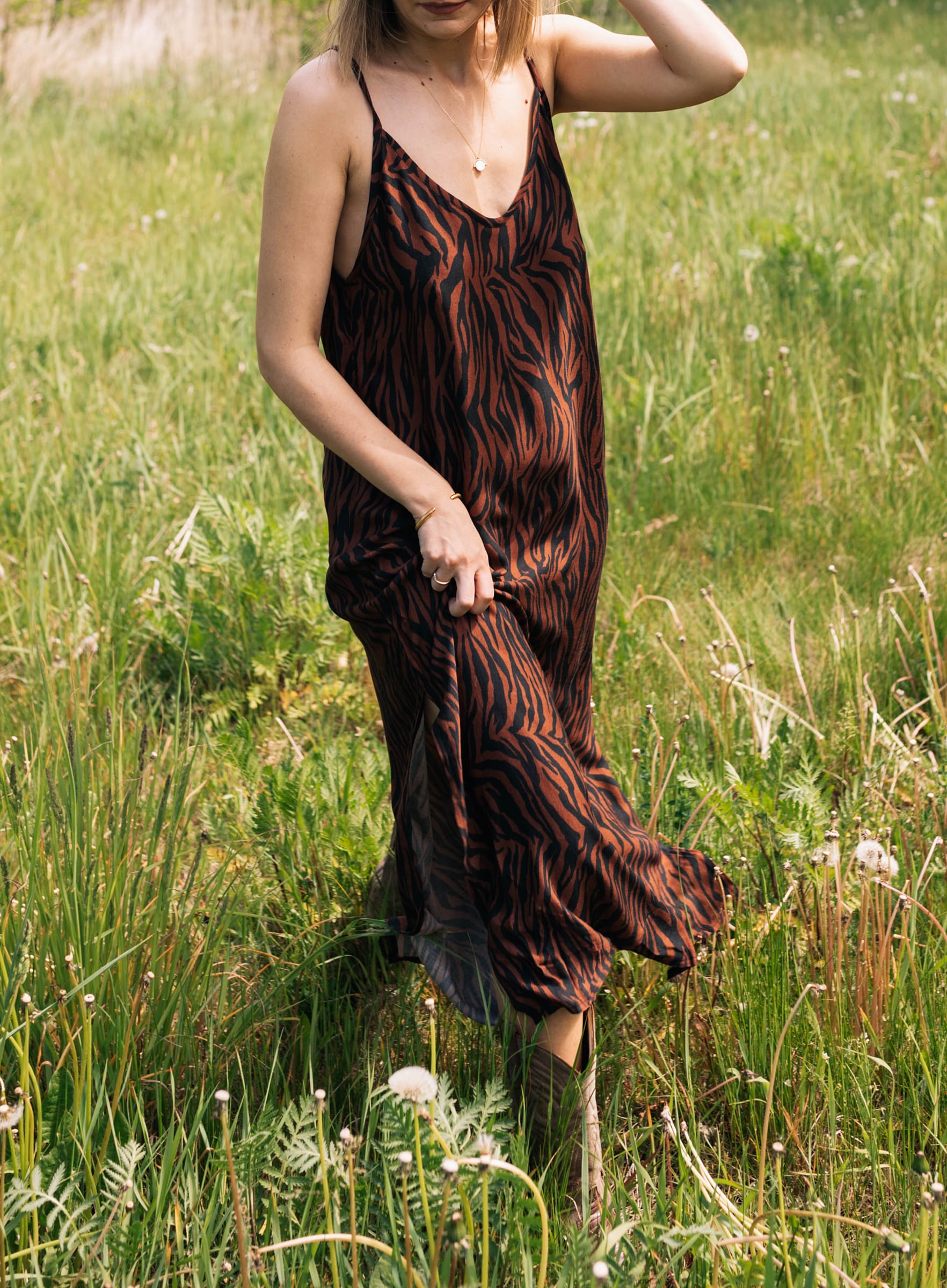 Sukienka, która za Was odpowie na pytanie: What is your spirit animal? Kiecka super dzienna i super wieczorowa zarazem. Uszyliśmy ją z lekko połyskującej tkaniny w zeberkę i mamy dla Was dwie, gotowe opcje noszenia: w wersji dziennej z klapkami, w wersji wieczorowej z rzemykowymi sandałami.
